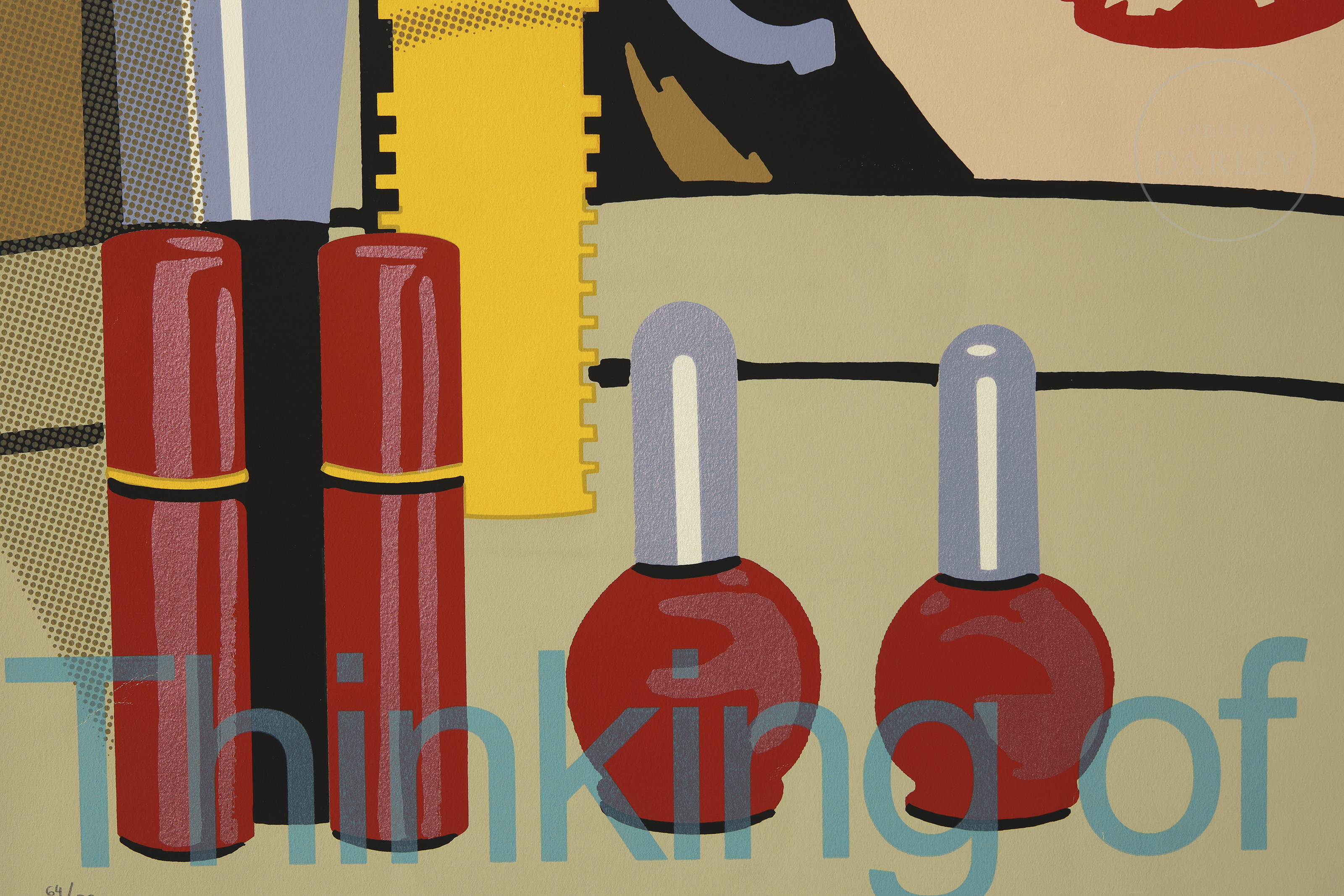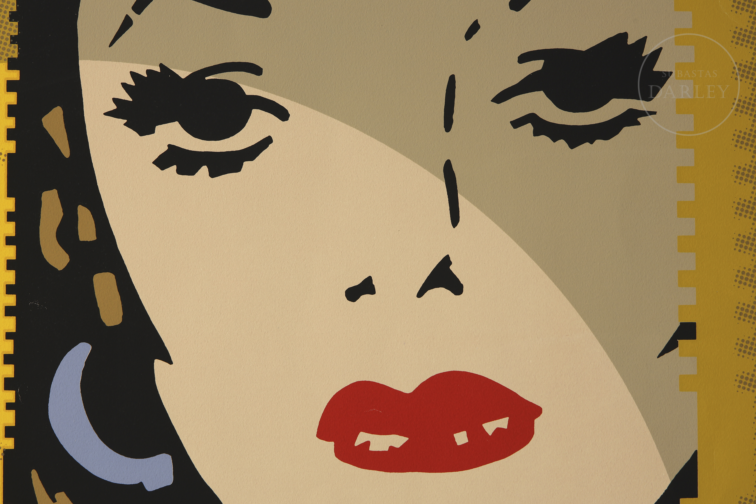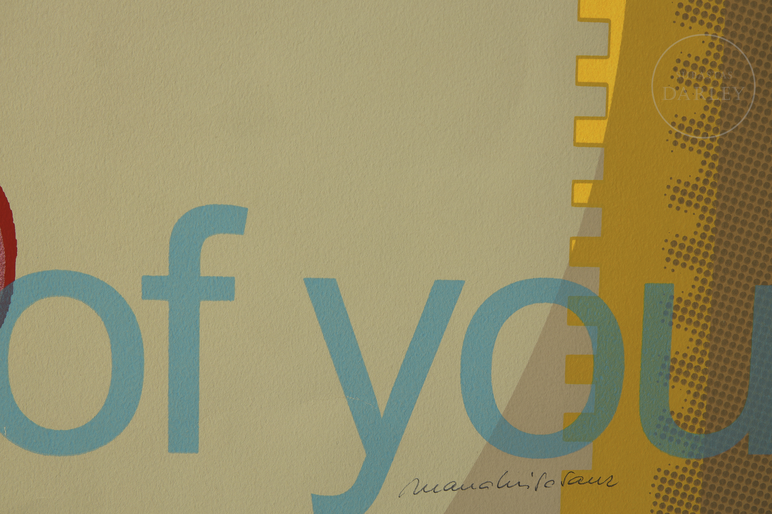 丝网印刷于纸上。作品底部题有标题,呈现流行艺术风格。右下角签名“Maria Luisa Sanz”,左下角铅笔编号“69/99”。出自埃里克·基尔克塞瑟工作室。