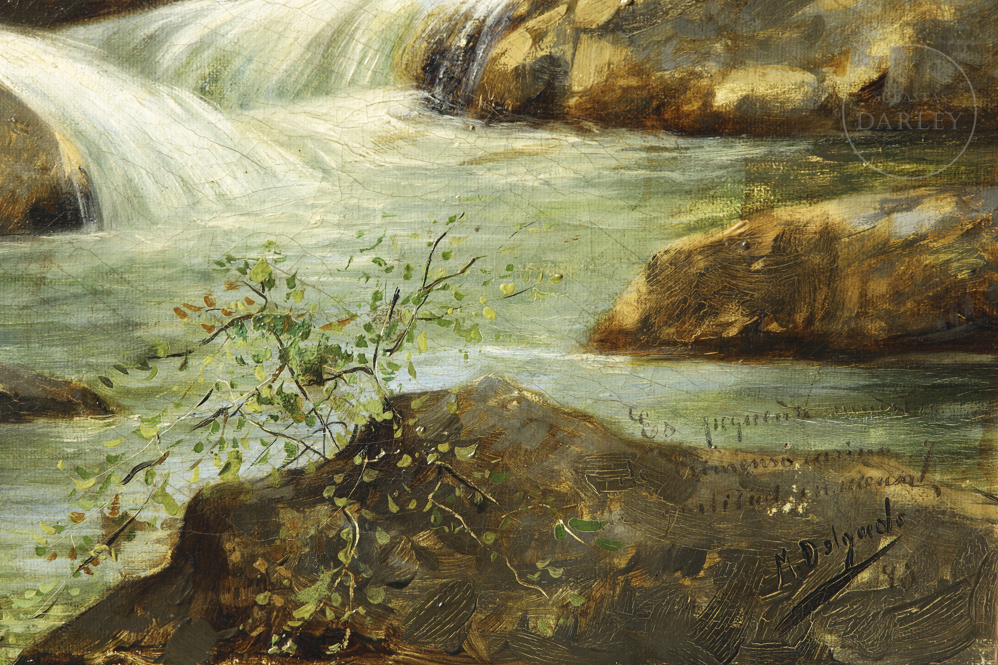 Oil on canvas. It depicts a peaceful natural setting, where a clear stream flows between rocks and lush vegetation, with a mountain in the background dominating the scene. Signed and dated “M. Delgado/98” in the lower right corner.