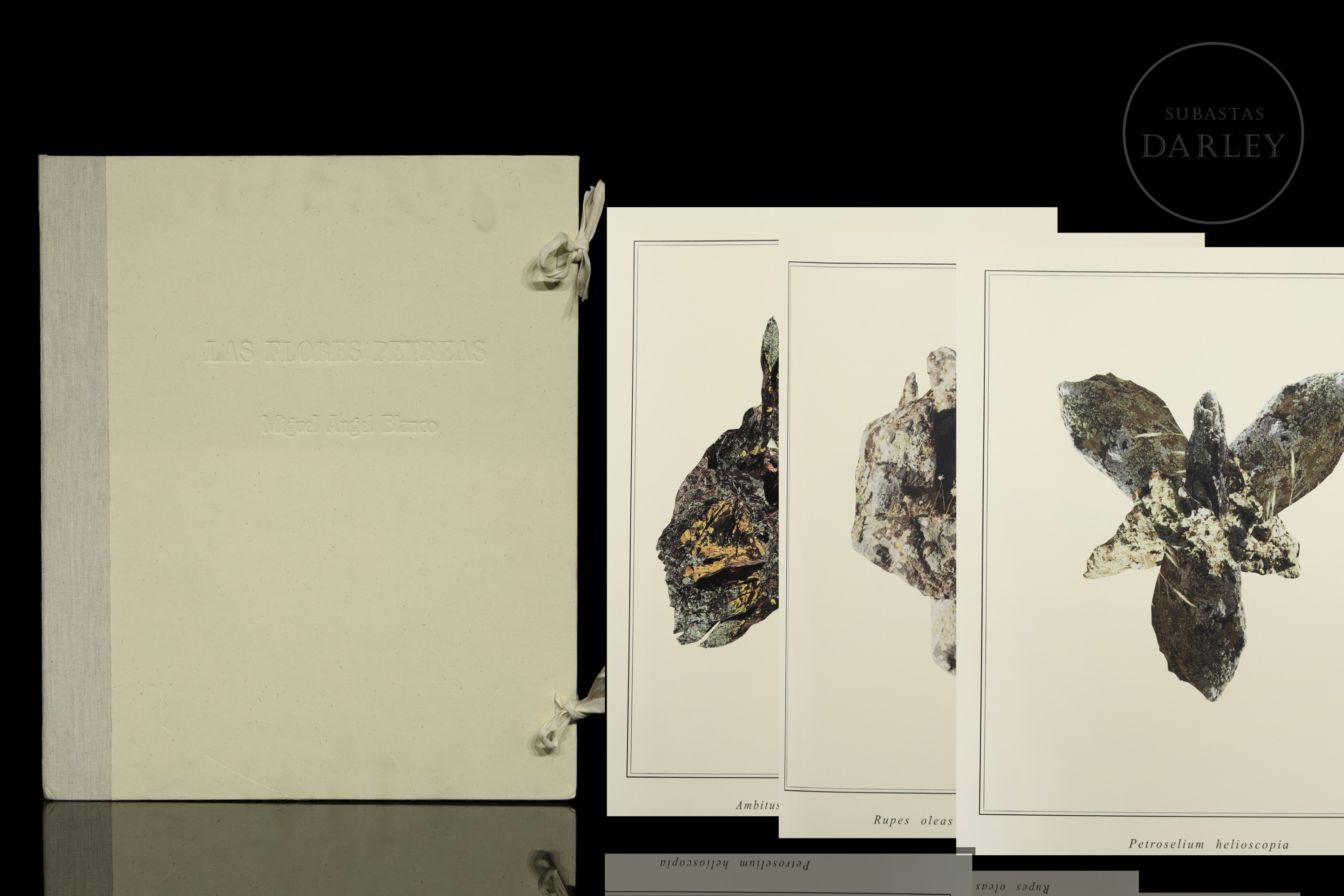 文件夹内含六幅采用数字印刷、丝网印刷及凸版印刷工艺制作的纸质版画。作品以石块构图排列成花卉形态,右下角附有签名,并随附真品证书。