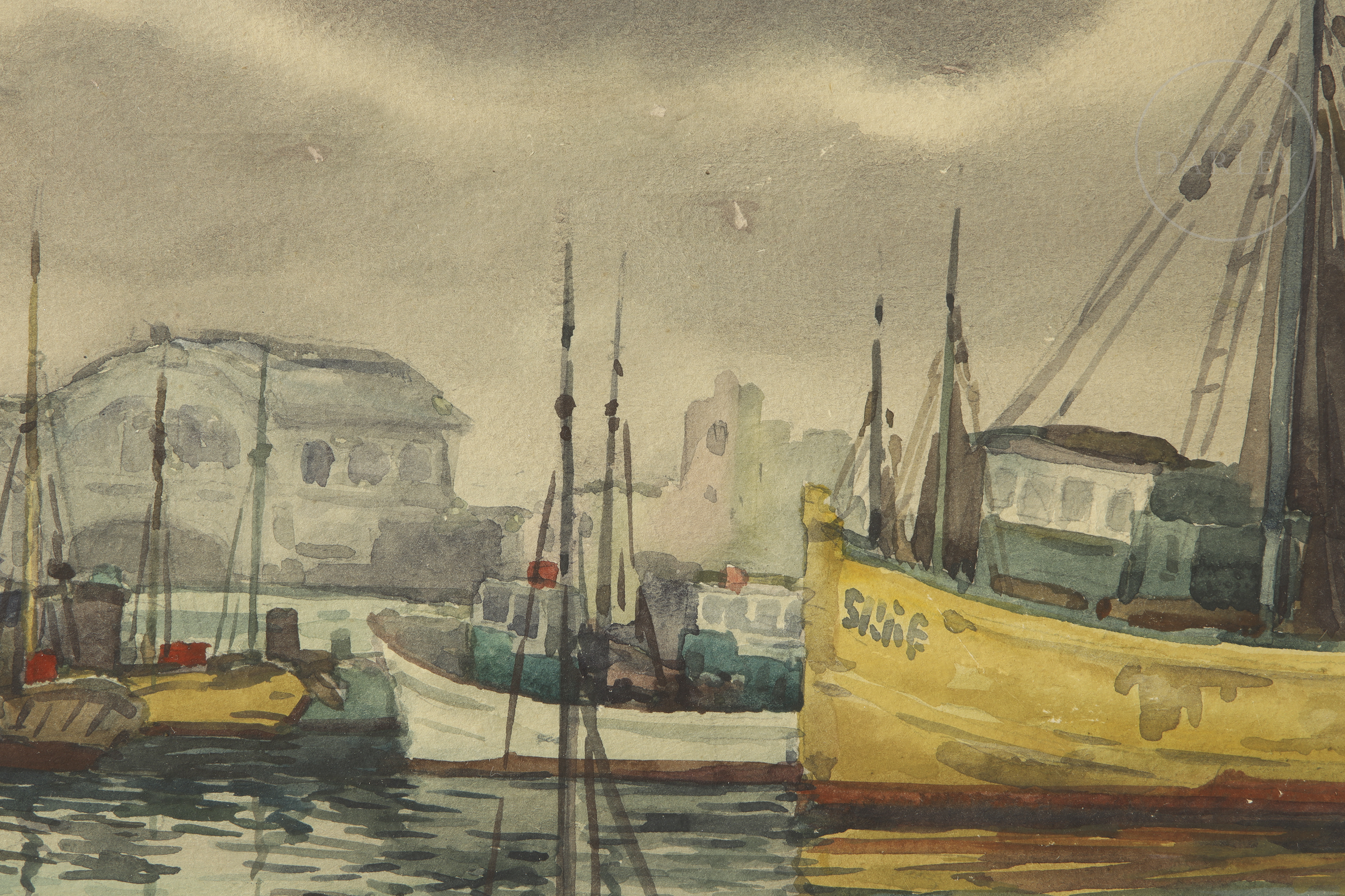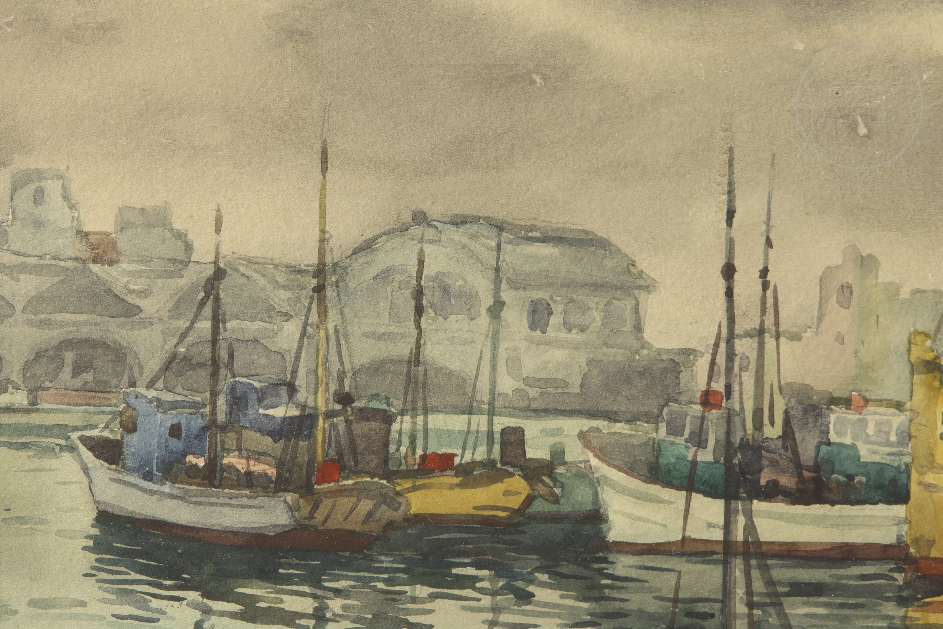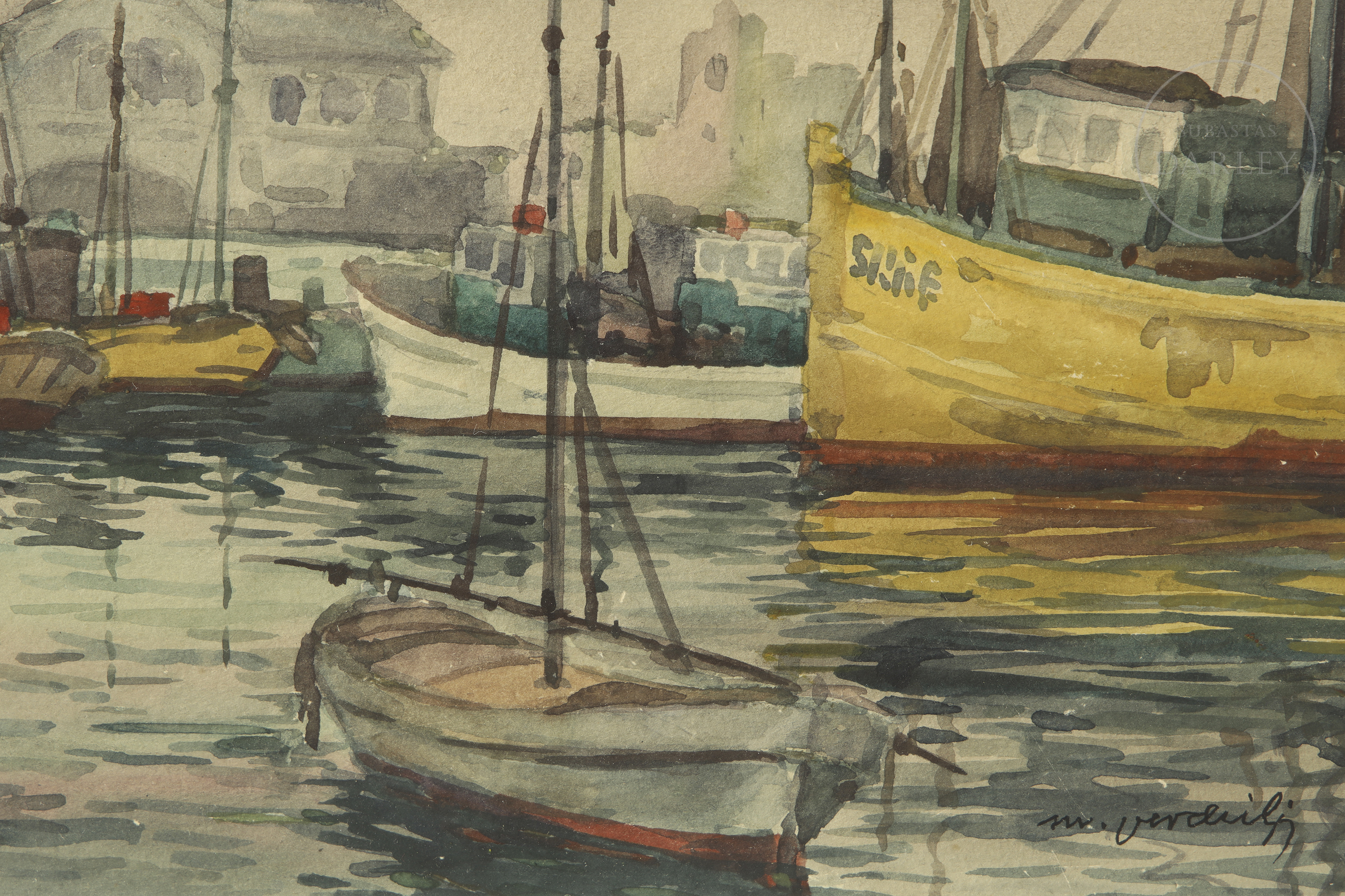 水彩纸本。描绘渔港海景,画面中数艘渔船停泊,渔民身影点缀其间。作品右下角签名“M. Verchili”。