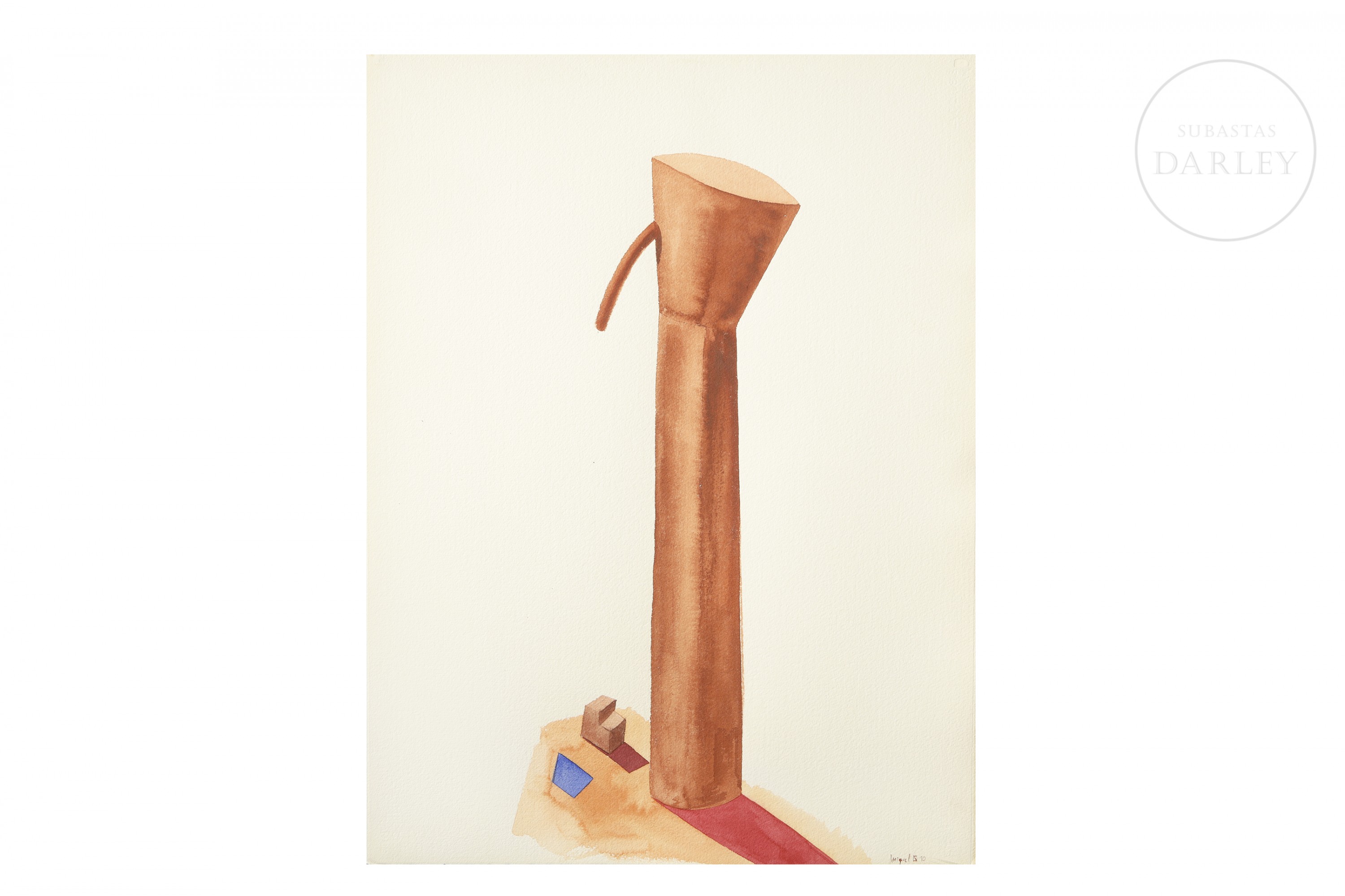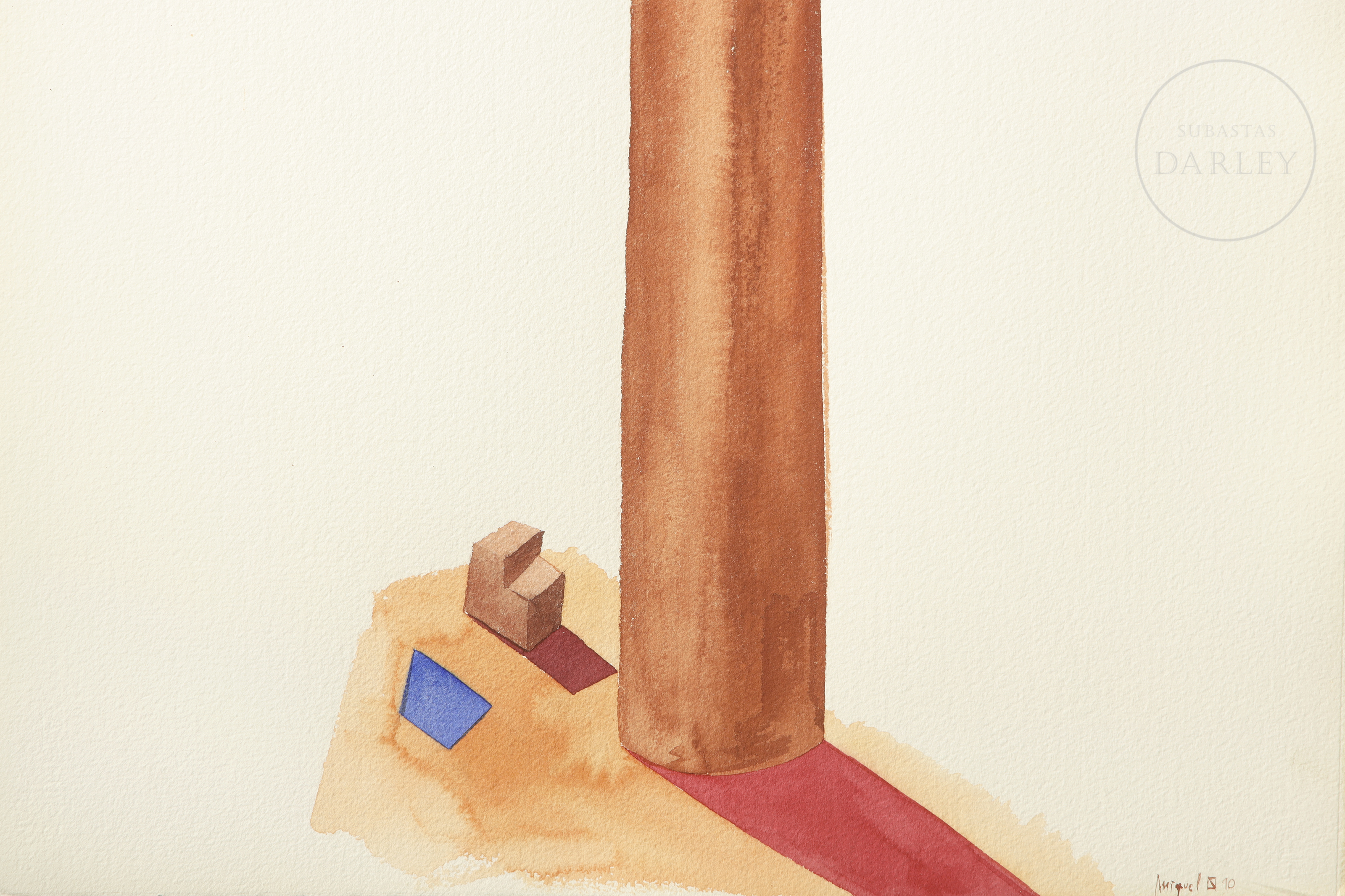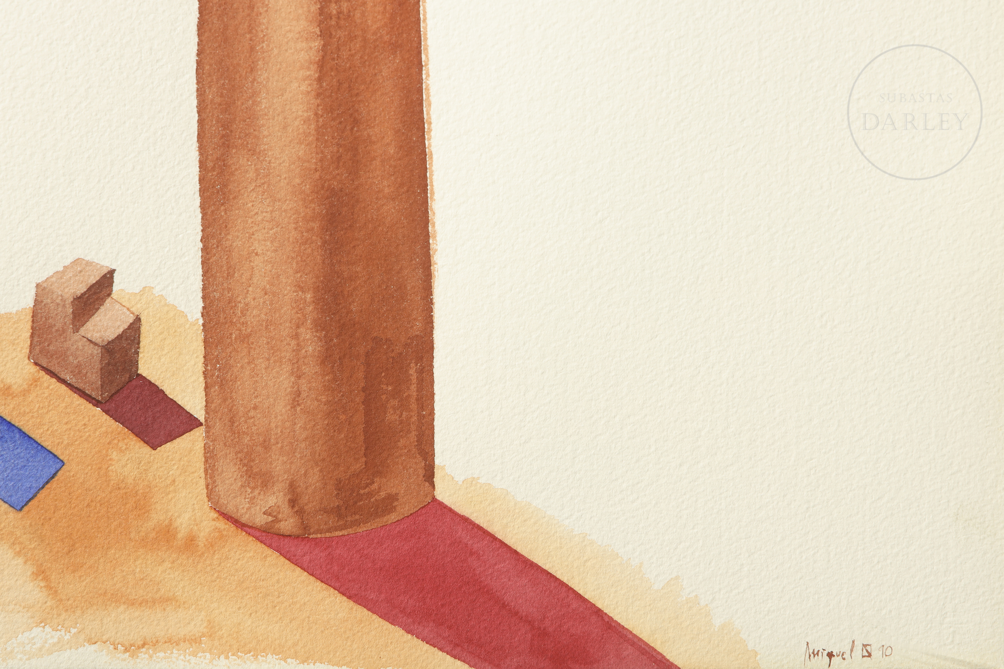 Watercolour on paper. In creating this work, the Valencian sculptor resorts on several of his recurring themes, while maintaining his usual aesthetic inspired by architectural elements. Signed and dated in the lower right corner of the work ‘Miquel/90’.