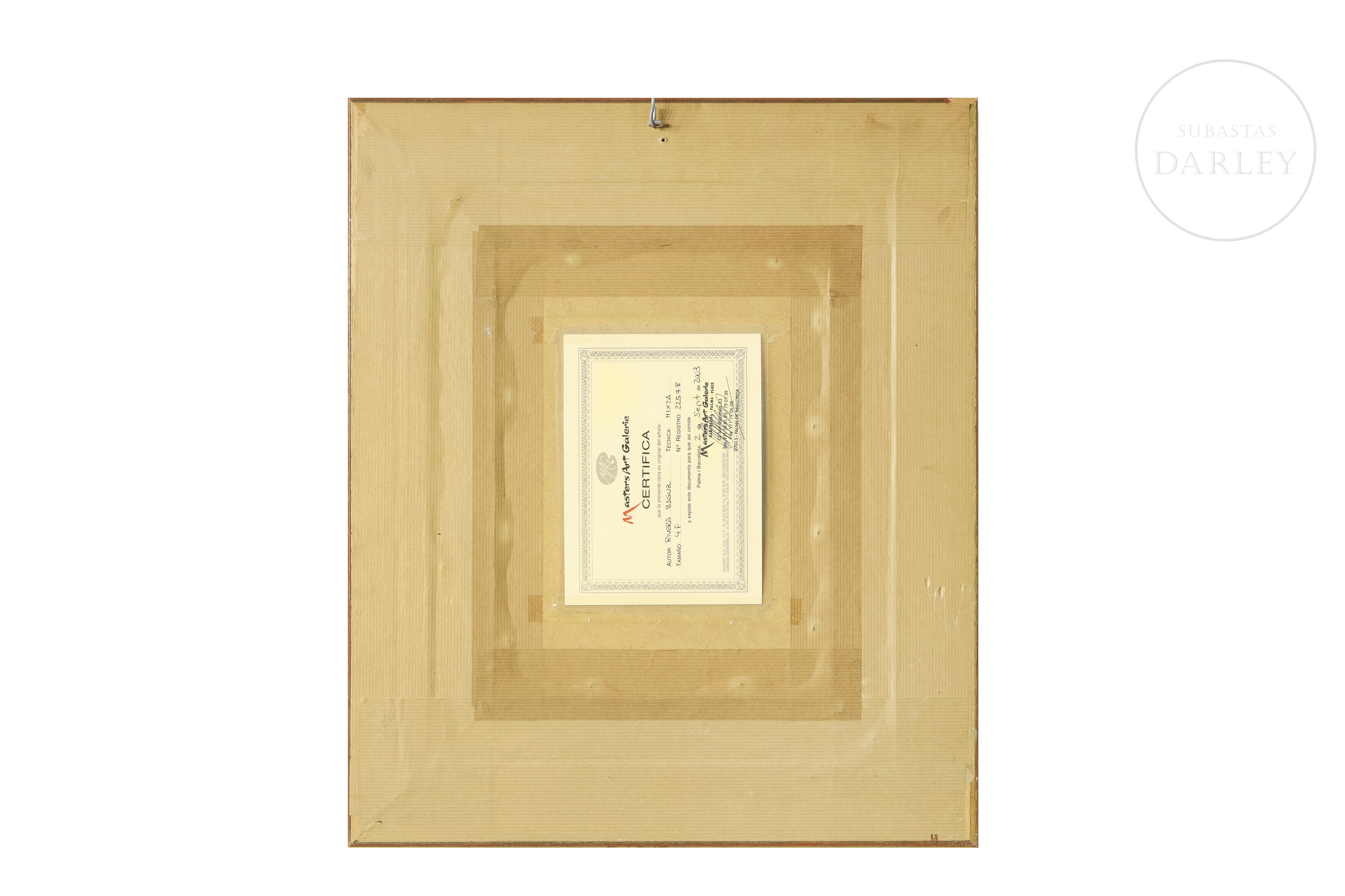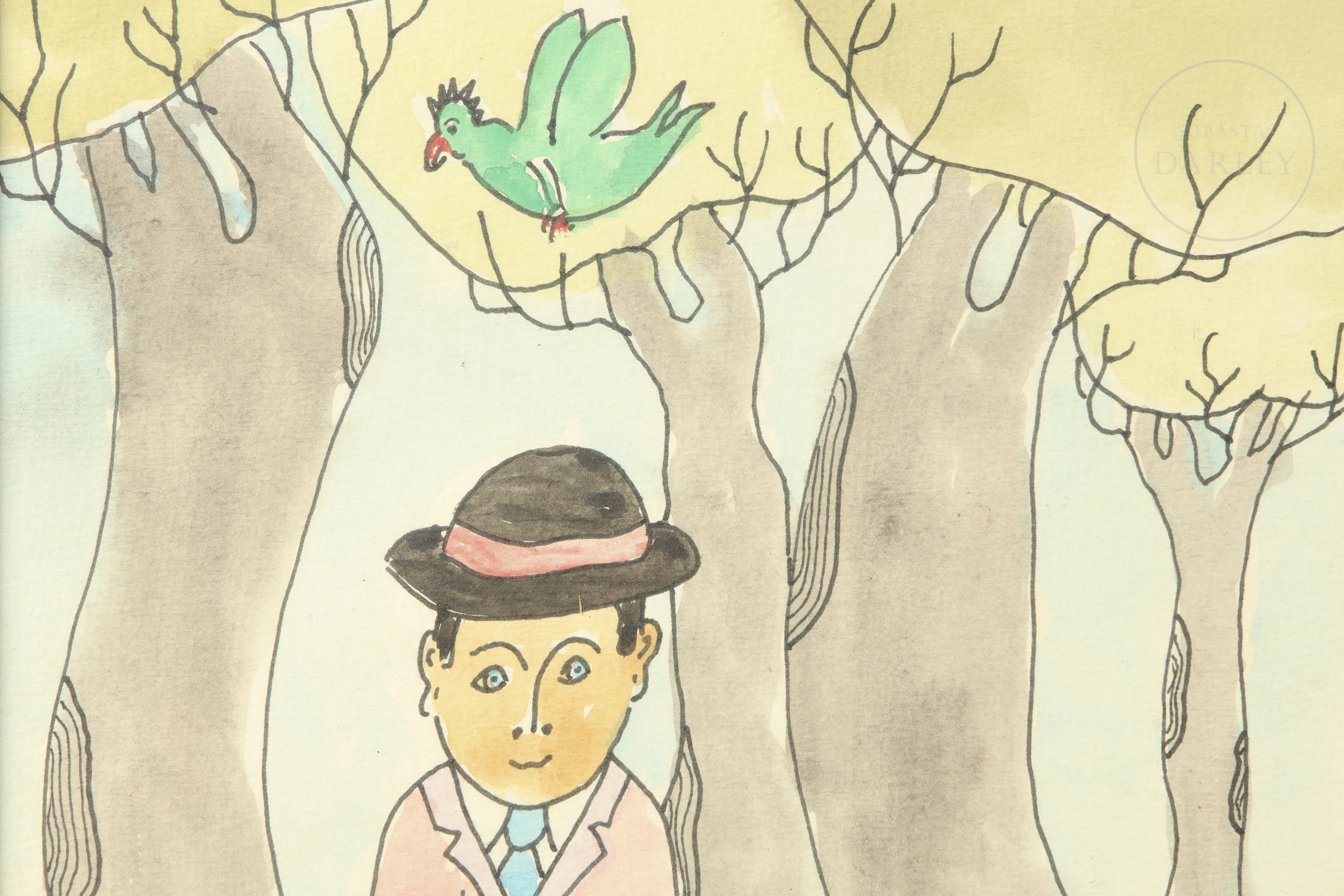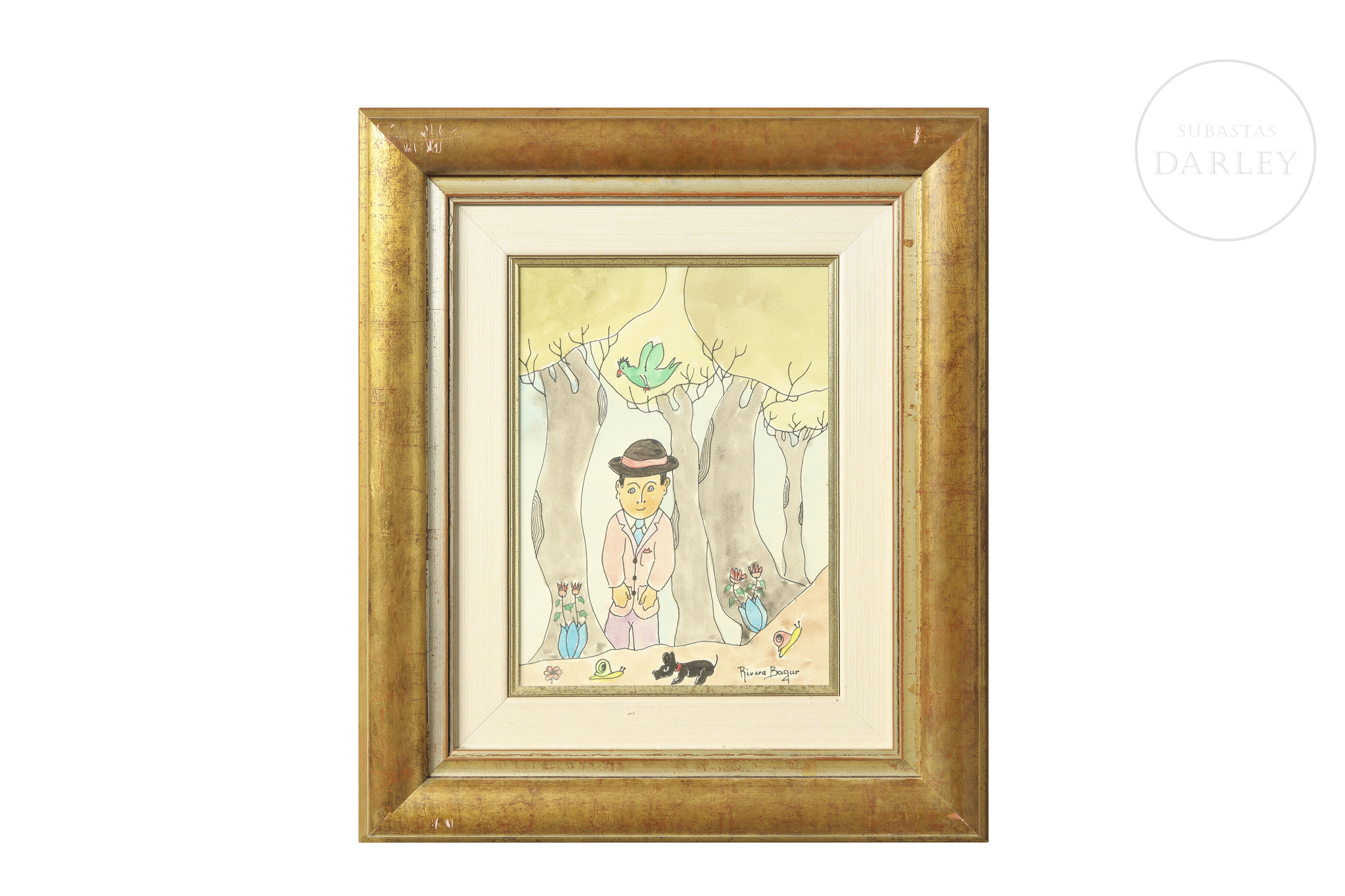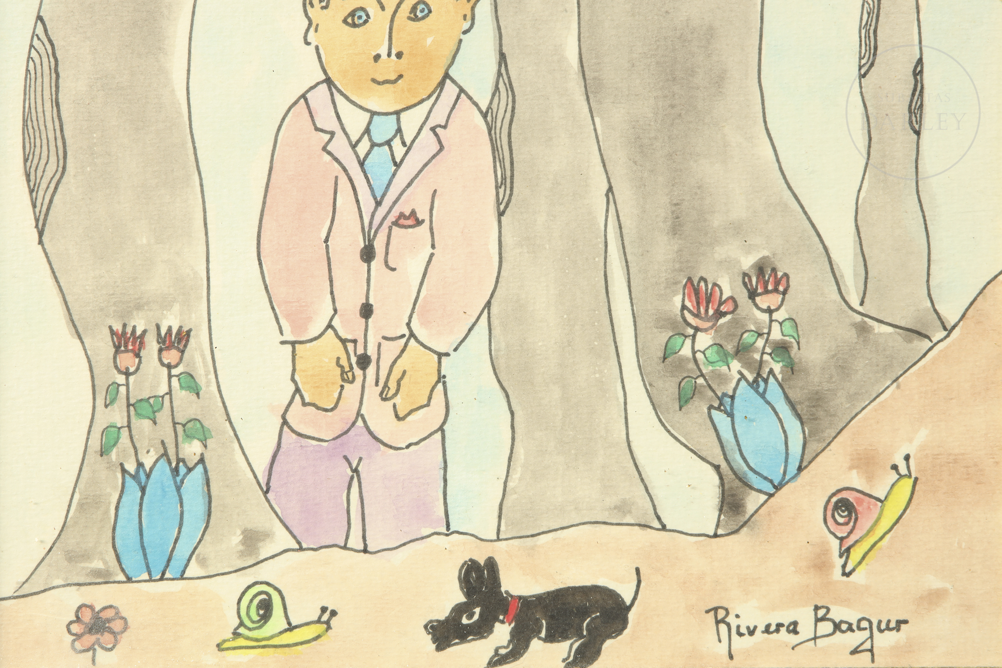 Watercolor and marker on paper. Naïve-style scene depicting a character in a forest, accompanied by animals and flowers. Signed “Rivera Bagur” in the lower right corner. Certificate on the reverse.