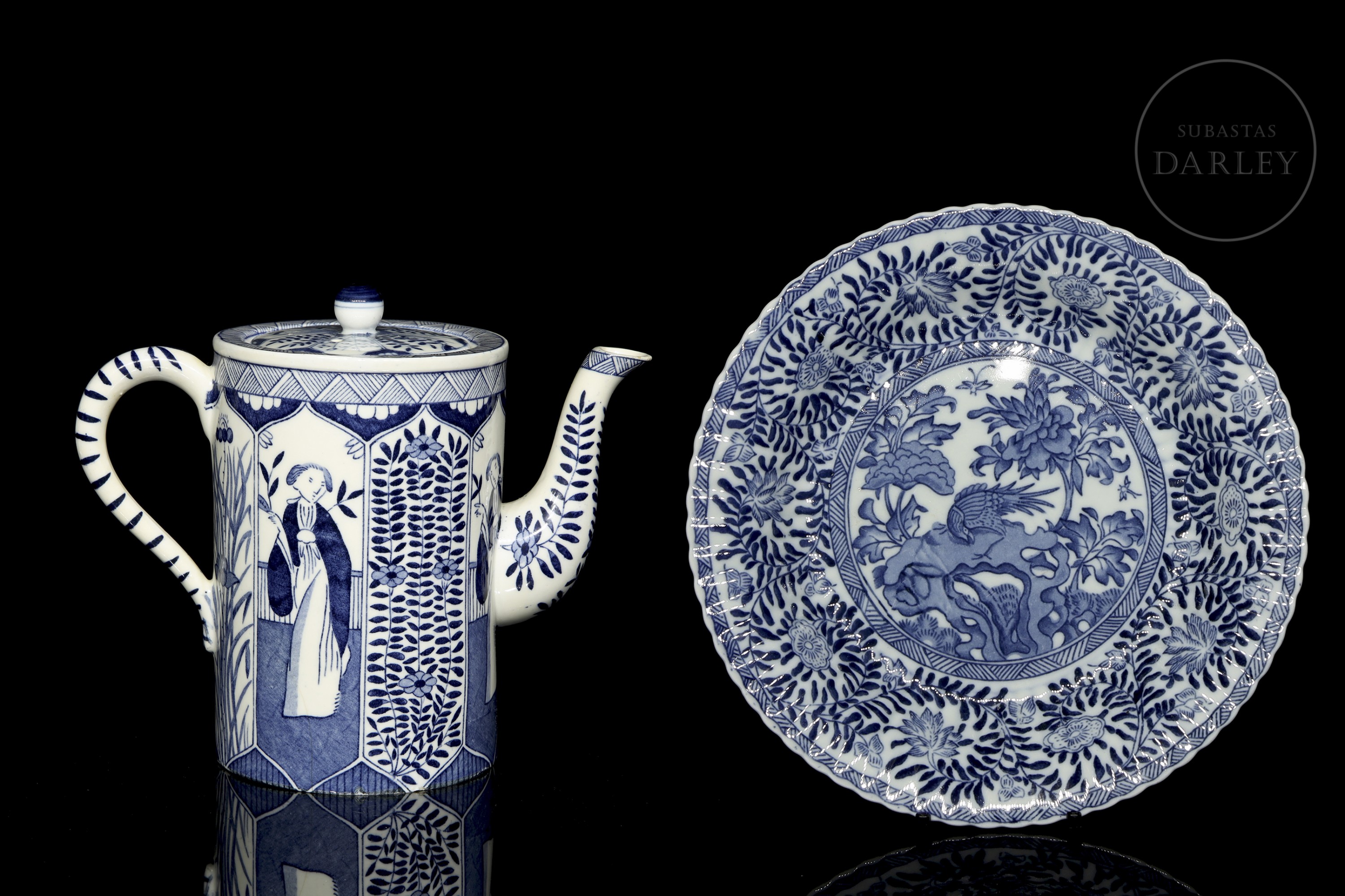 两件马斯特里赫特莫萨瓷器,饰有著名的“Lange Lijs”图案,英文亦称“长身伊丽莎”。该设计是荷兰流行的中式风格图案,灵感源自康熙时期的中国瓷器。