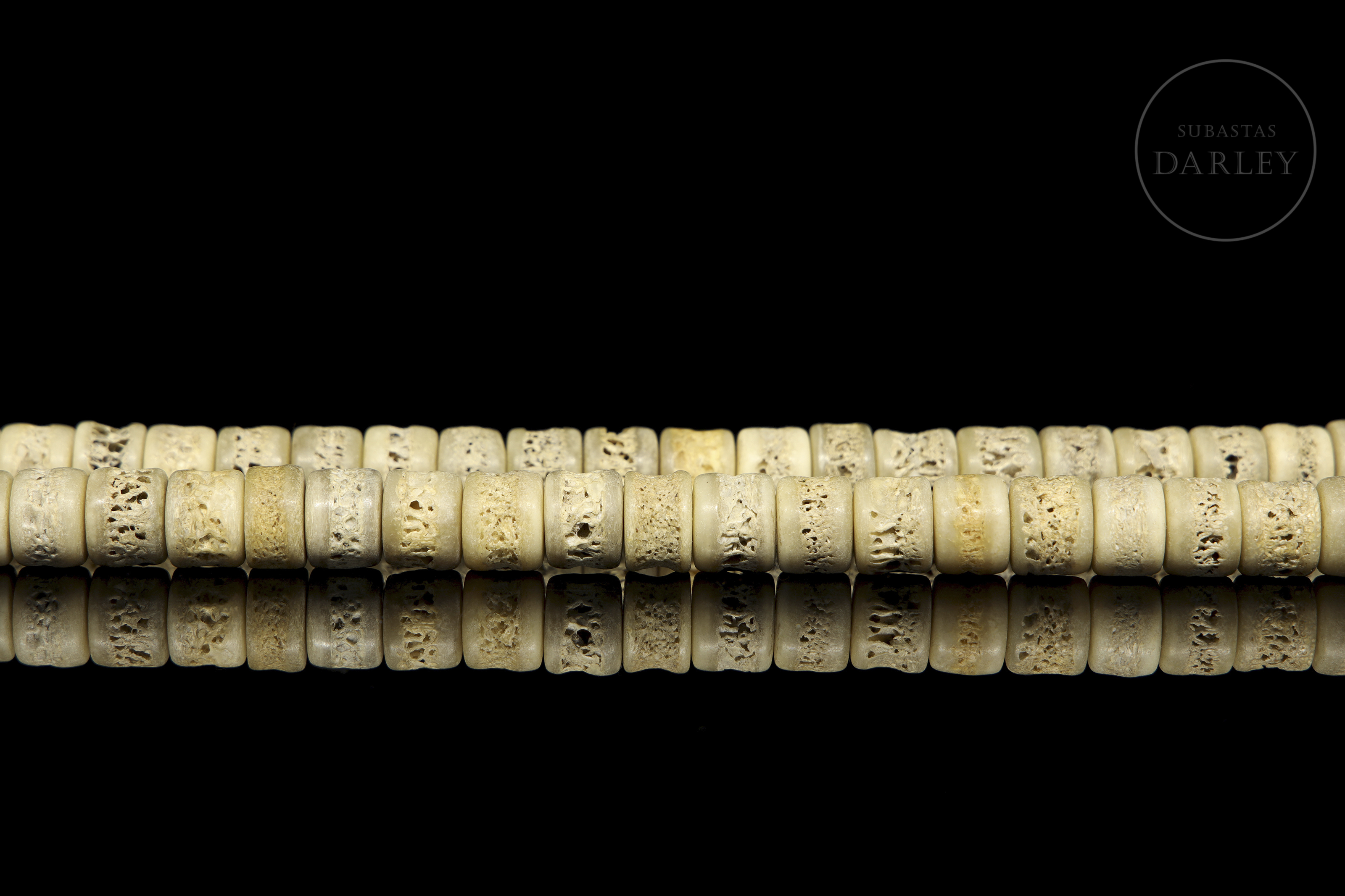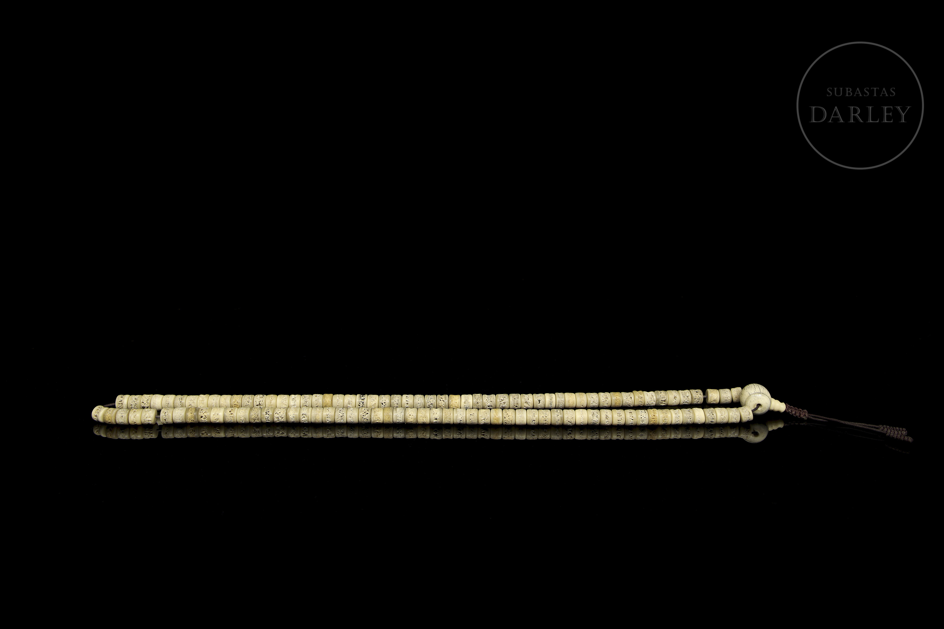 Composition consisting of one hundred and eight cylindrical beads carved from bone, accompanied by two additional beads and a larger central finial, from which two tassels braided in brown cord hang. The surface has a patina and grain characteristic of the material.