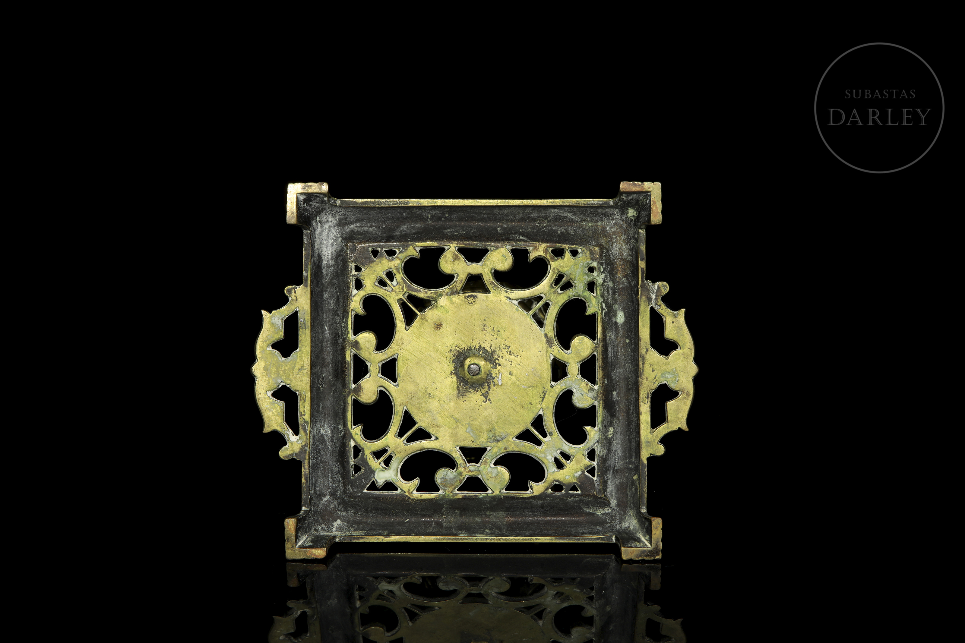 青铜(或黄铜)书桌,历史主义或新巴洛克风格,杯状造型配以窄底座,饰有浮雕卷草纹与植物纹样,置于方形基座之上。