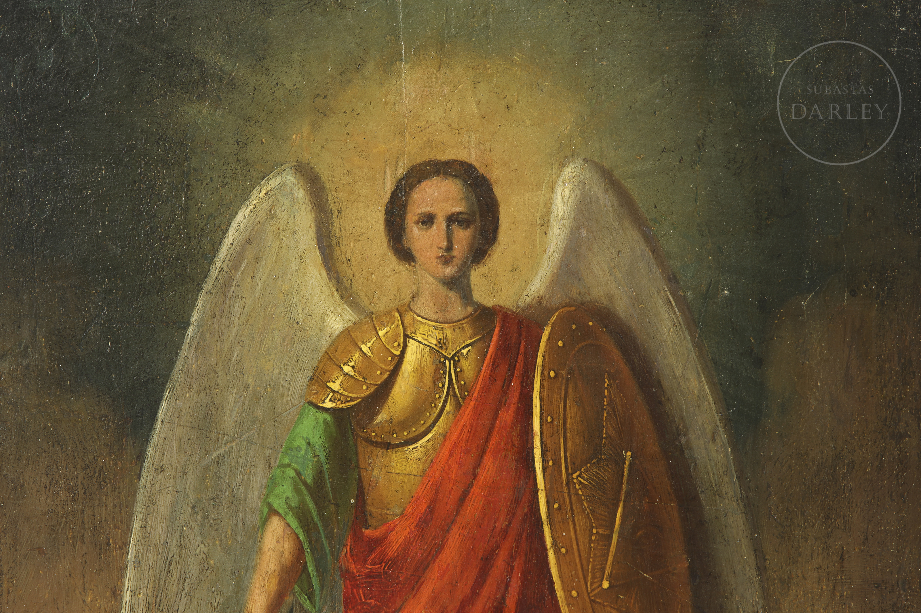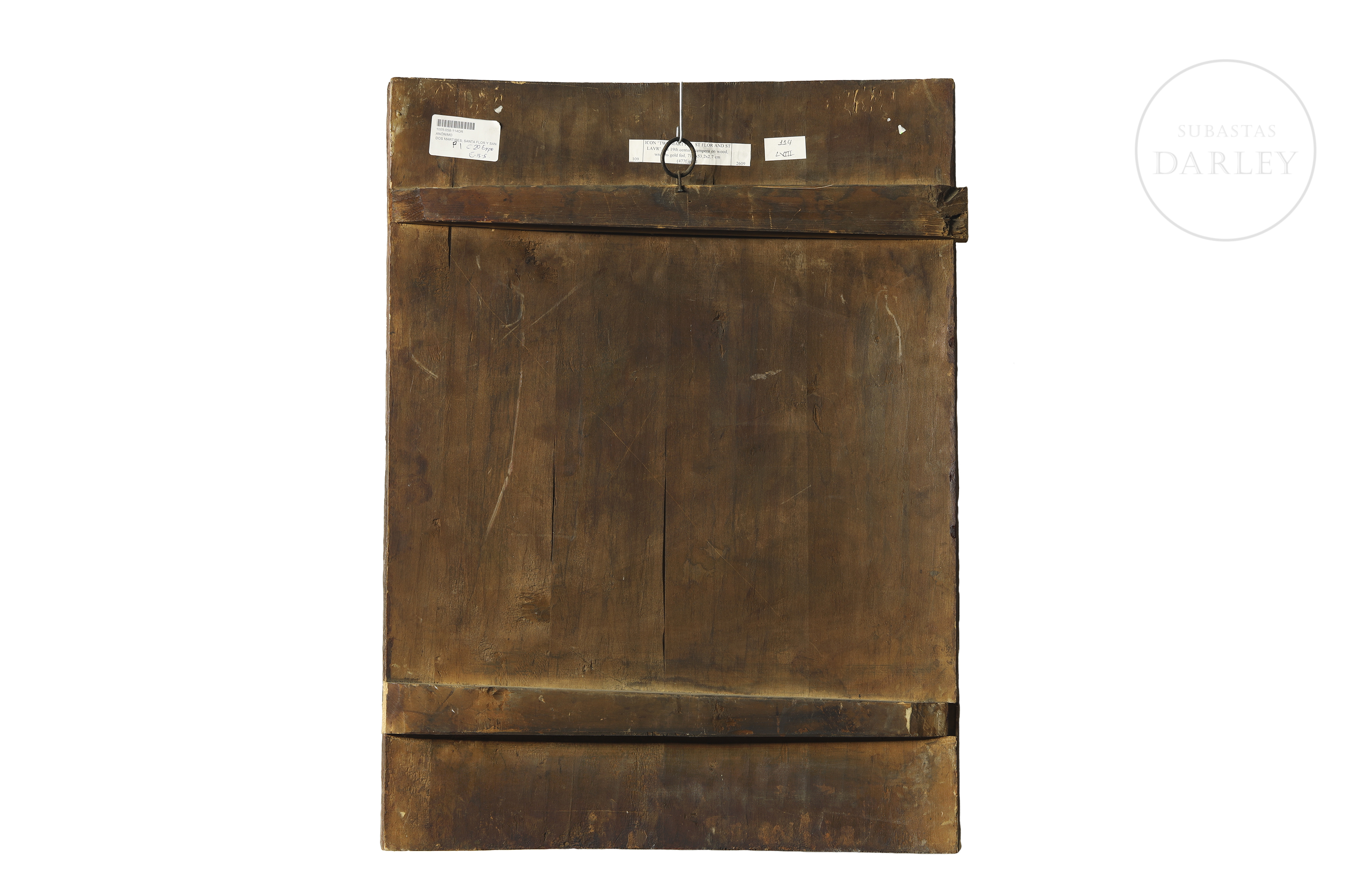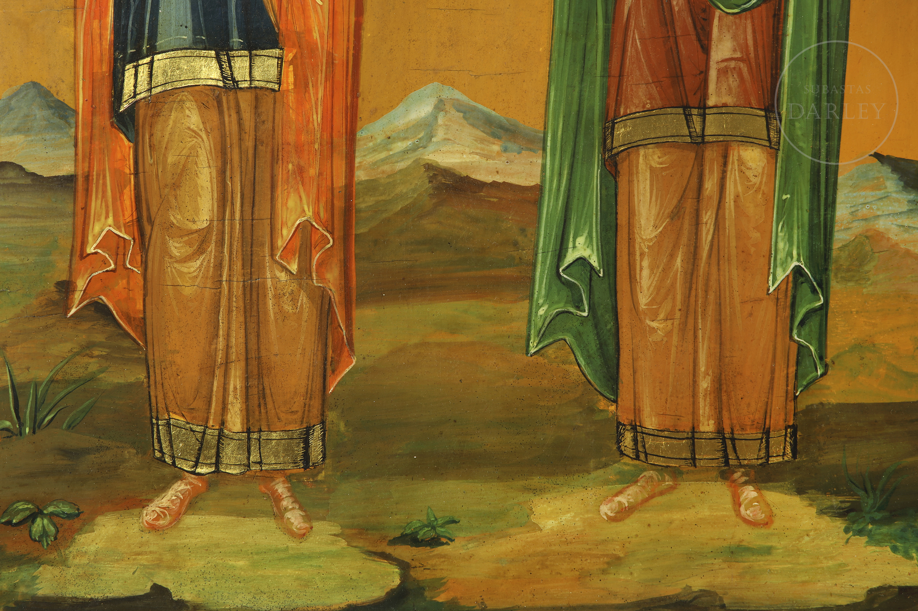 Tempera painting on wood panel depicting the martyred saints Flor and Laur of Illyria, standing in traditional dress with golden halos, under the blessing of Christ at the top.