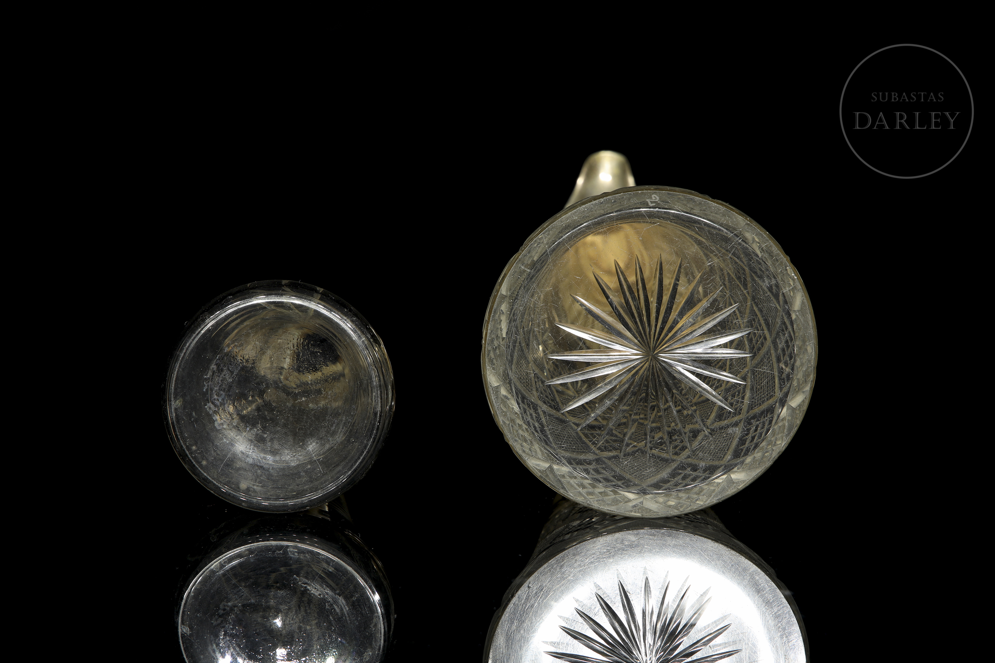 两只饰有雕刻几何纹样的玻璃壶。两件器物均配有专属壶塞:小壶的壶塞为玻璃材质,大壶的壶塞则由软木制成并带有金属饰面。软木塞已断为两截,其中半截残留在壶口处。