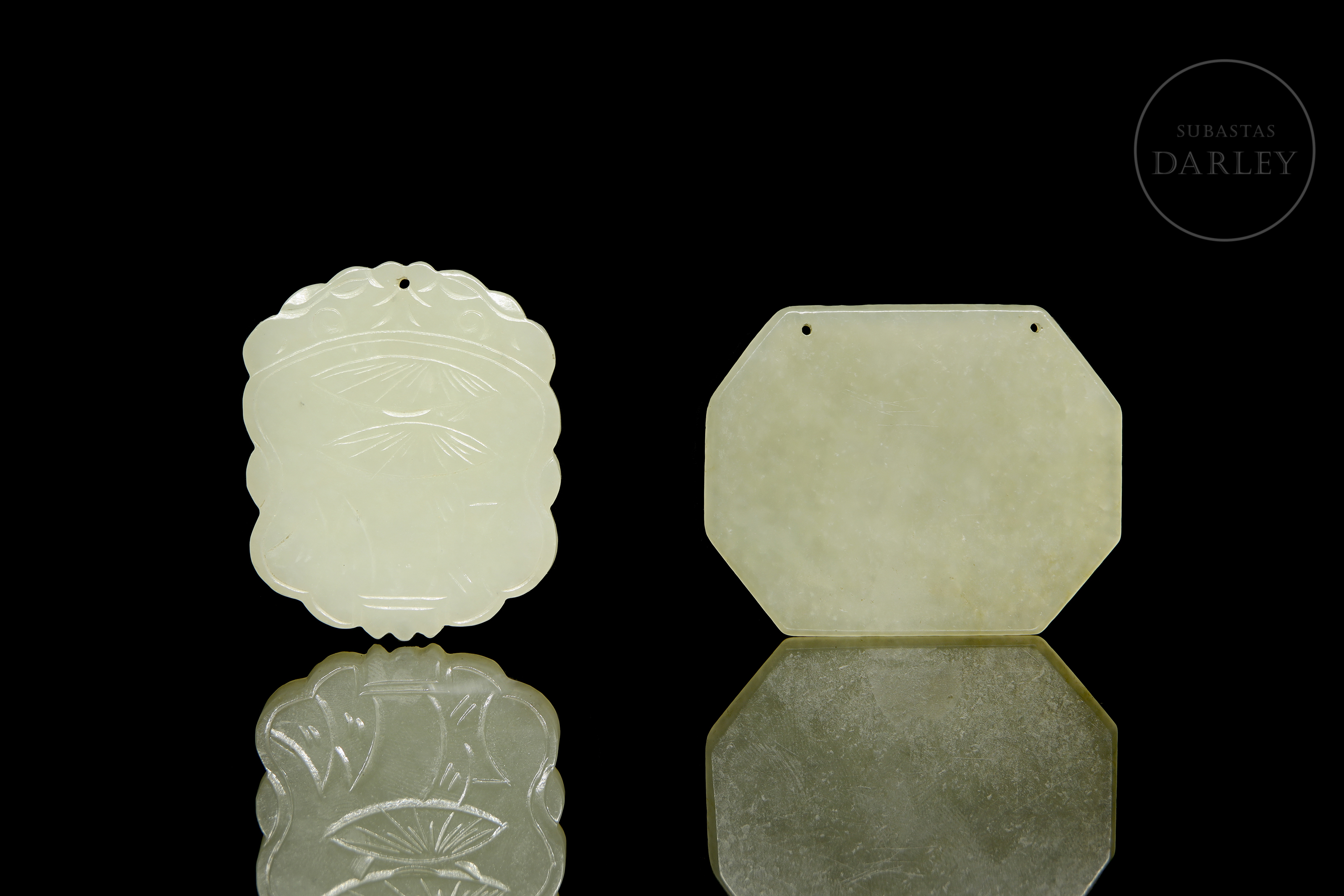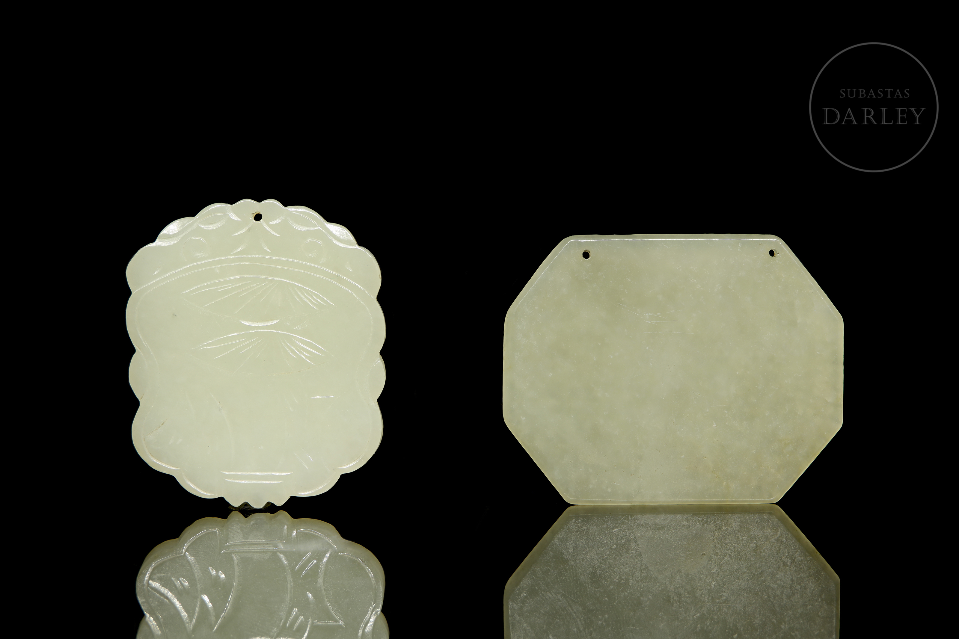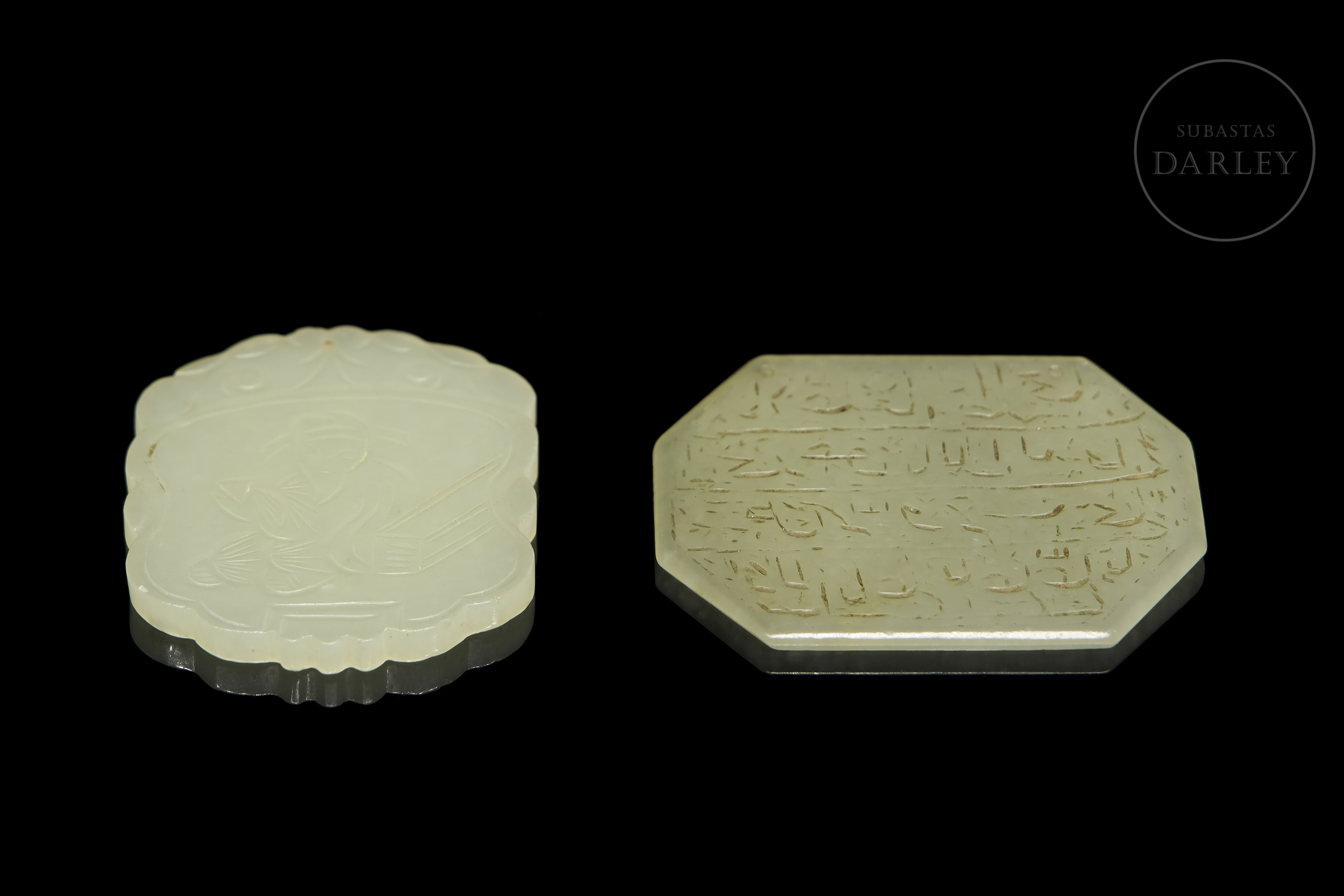 Two finely carved jade plaques. One of them, lobed in shape, depicts the figure of an elderly man accompanied by plant motifs; the other, octagonal in profile, features calligraphy on both sides. Both pieces have perforations on the upper edge for possible use as pendants. Qing Dynasty (1644–1912).