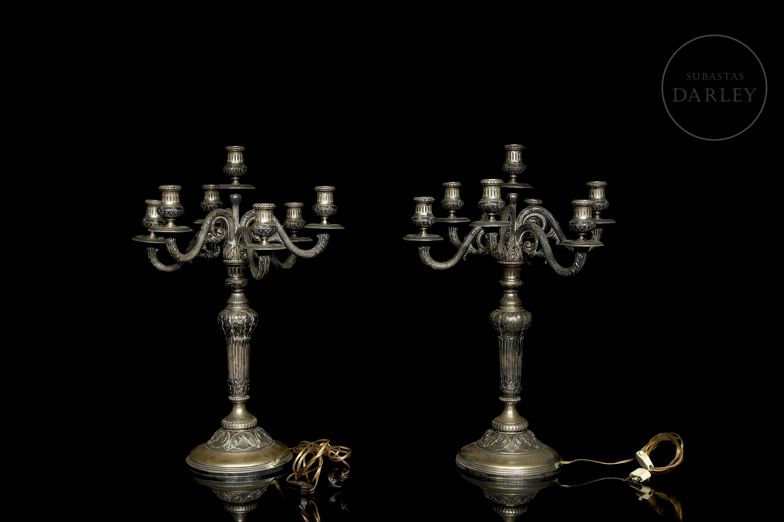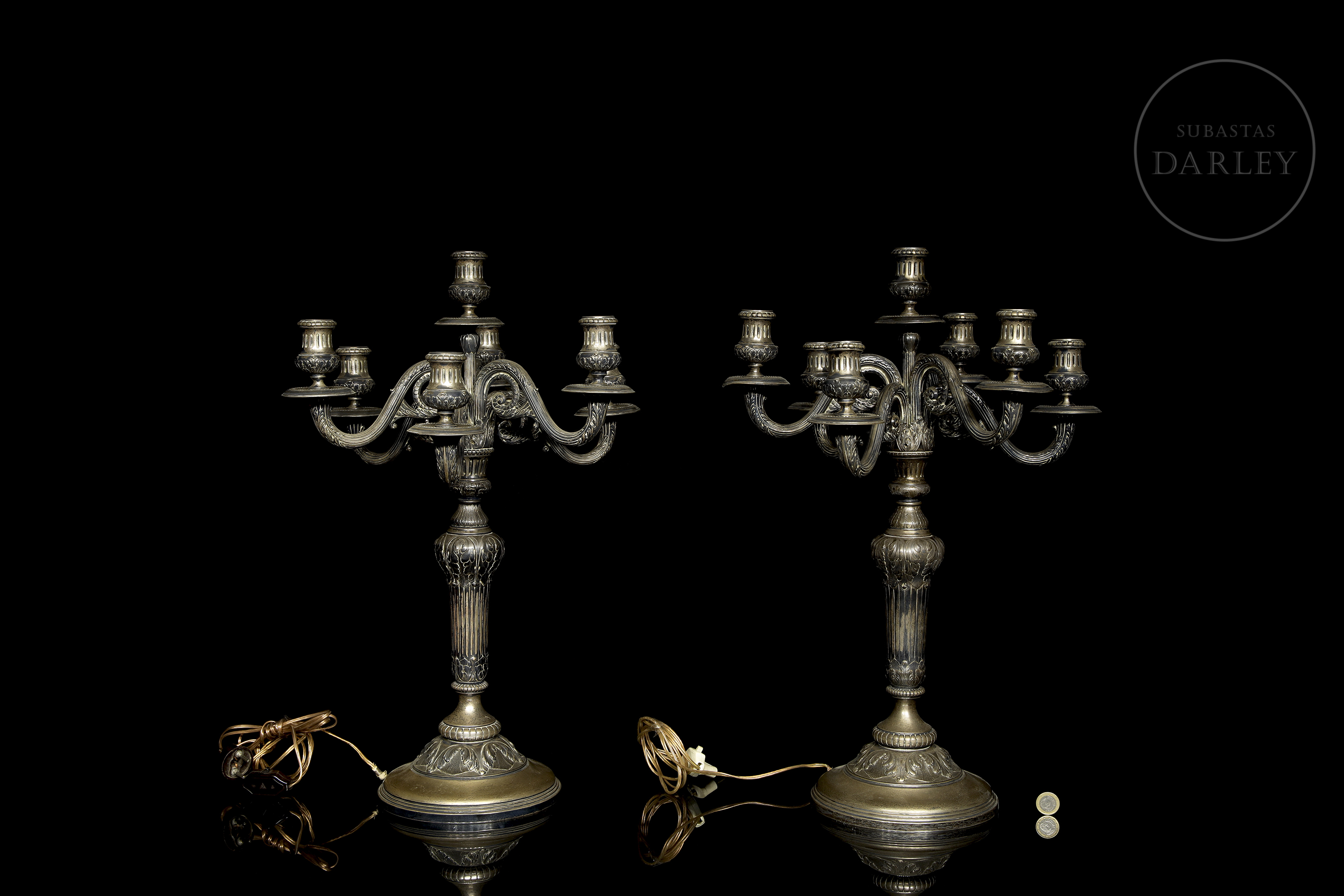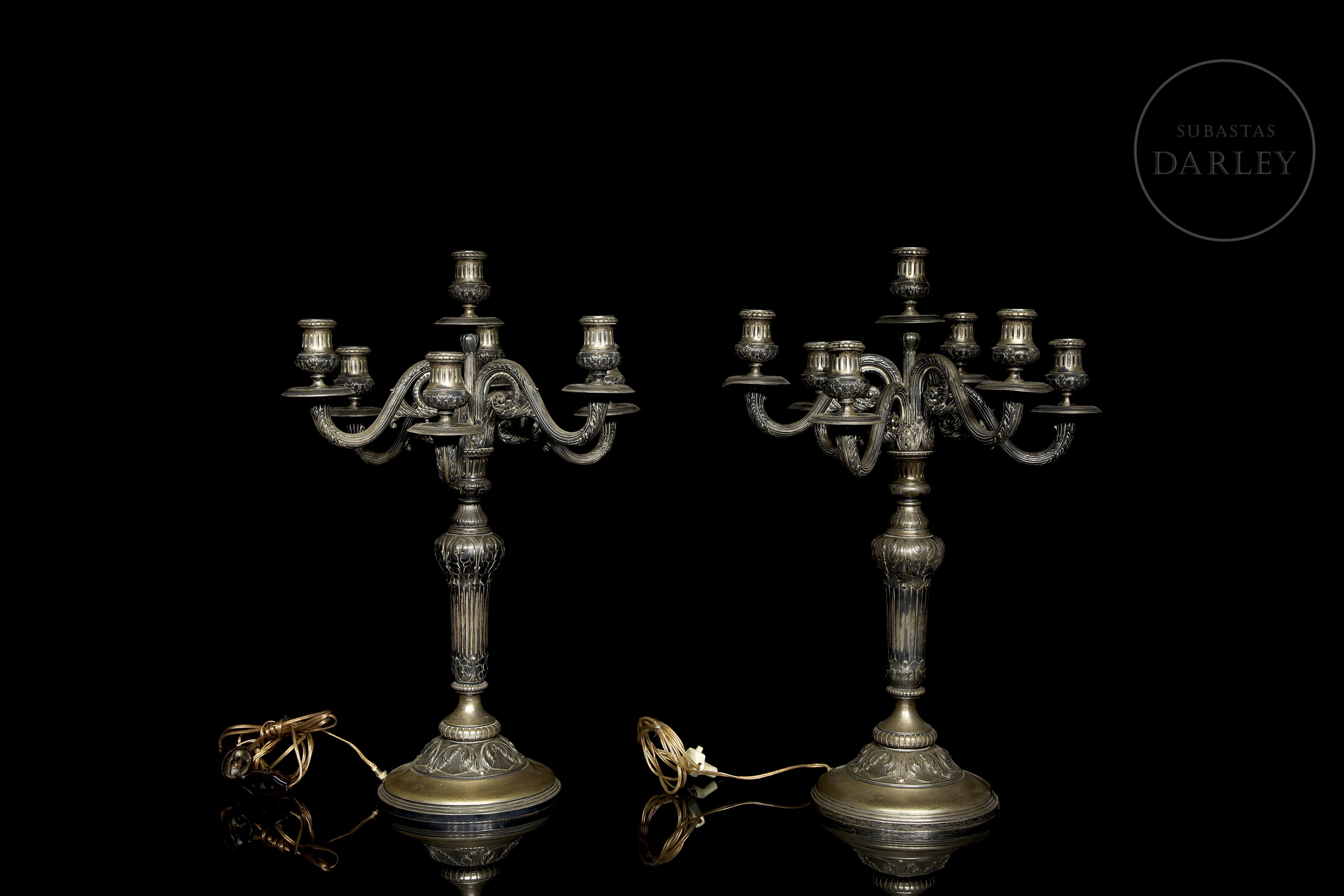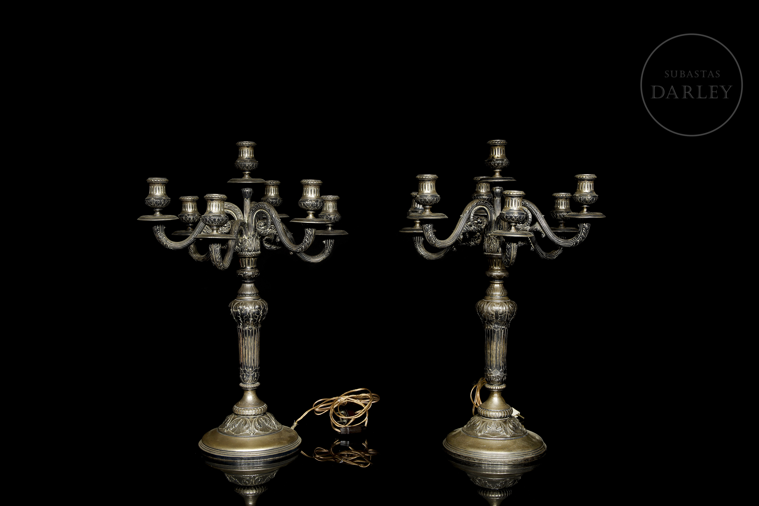 Elegant pair of six-arm candelabra, made of silver-plated metal with acanthus leaf decoration, garlands, and vertical grooves. The circular base features plant relief on its upper part. Both pieces were later adapted for electrical use.