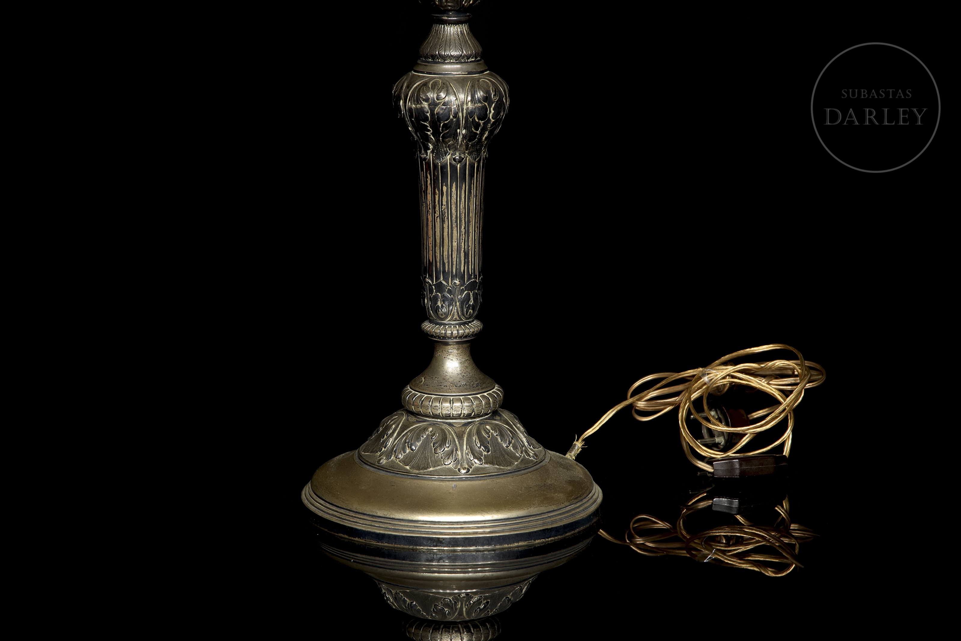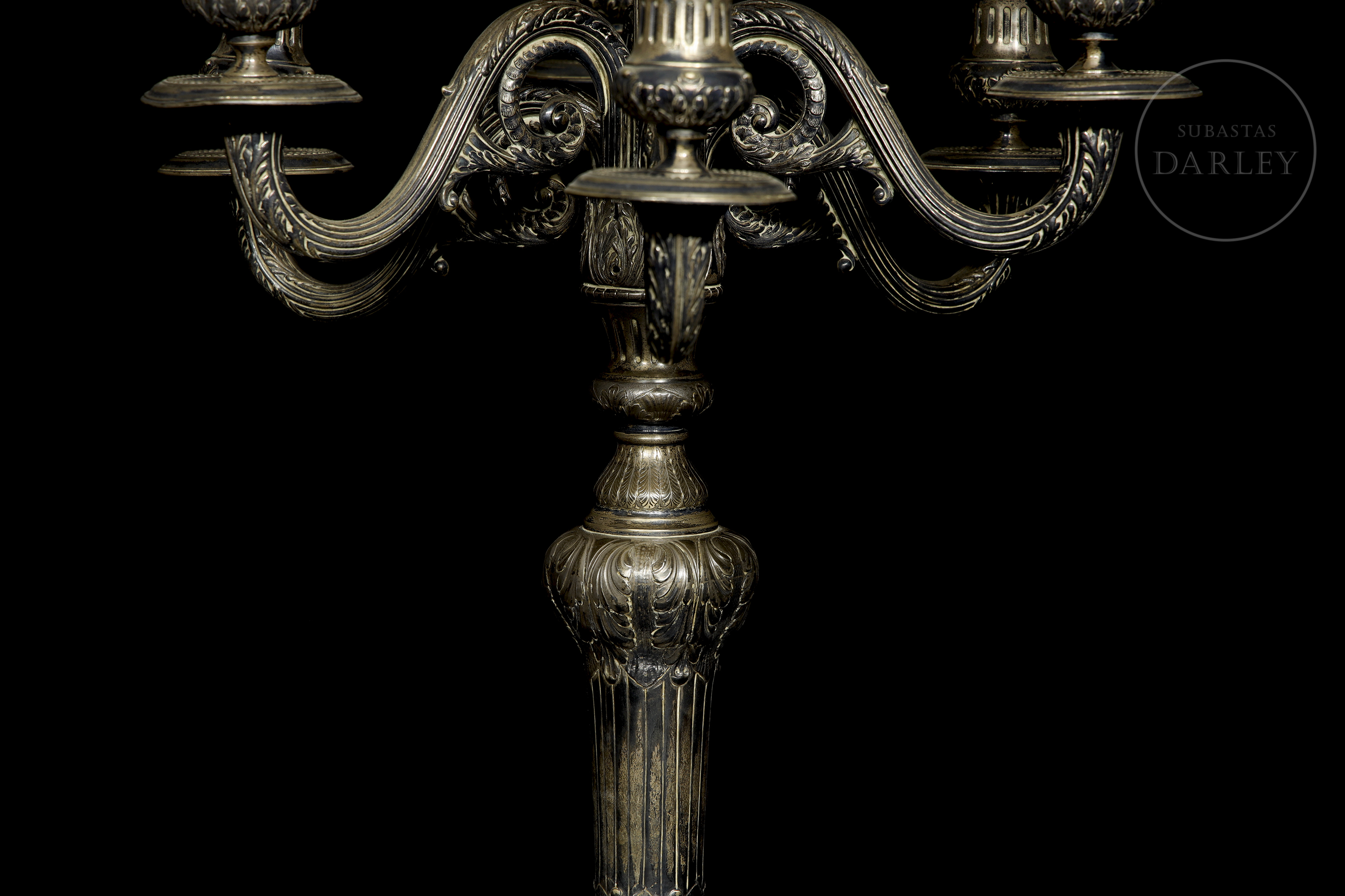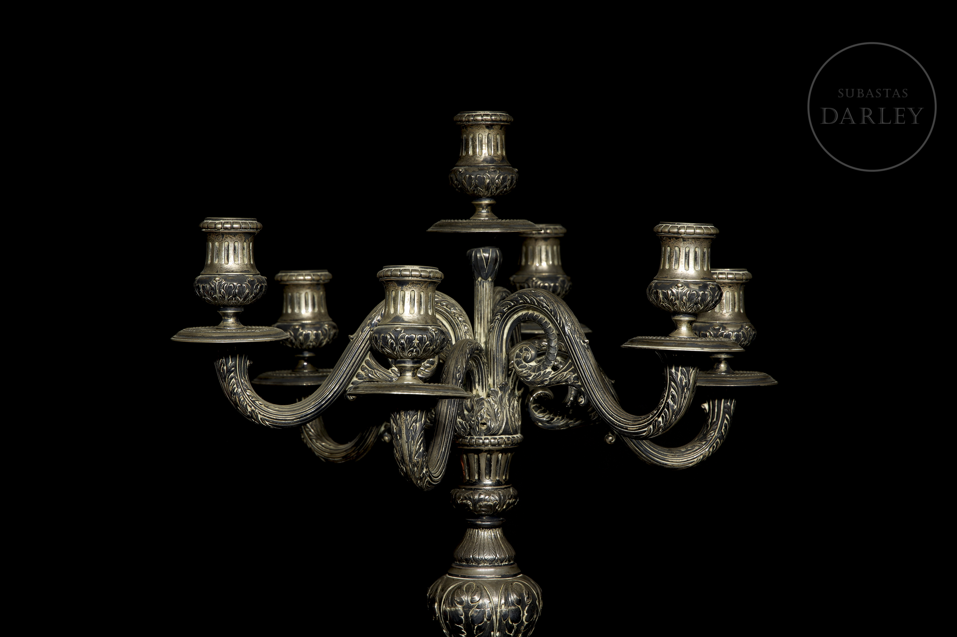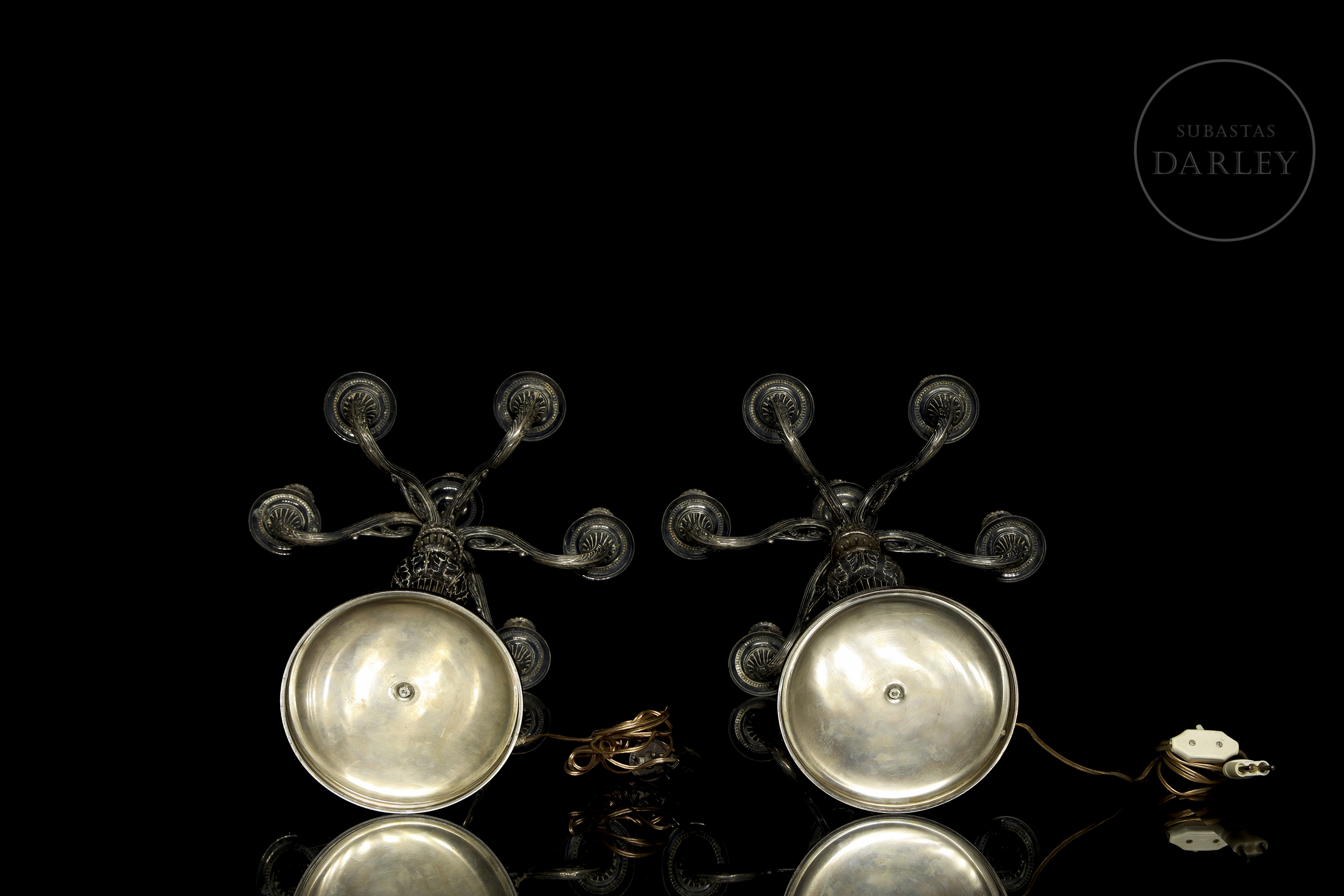 Elegant pair of six-arm candelabra, made of silver-plated metal with acanthus leaf decoration, garlands, and vertical grooves. The circular base features plant relief on its upper part. Both pieces were later adapted for electrical use.