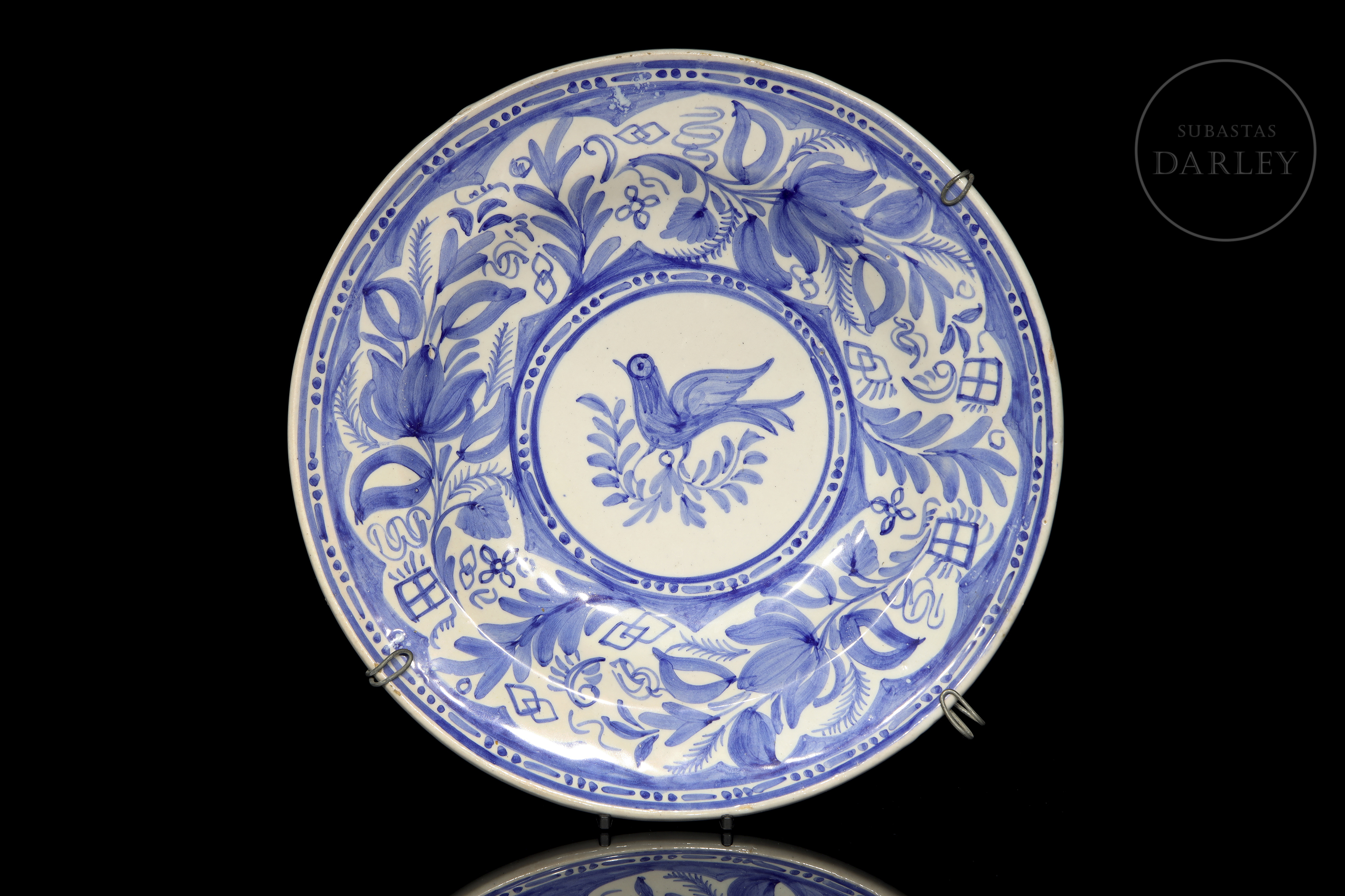 釉面陶瓷(马约利卡瓷)。两只装饰盘采用传统瓦伦西亚风格,以钴蓝与绿色装饰于白色底上。其一饰有风车与花卉纹样,其二中央绘鸟,背景为植物纹饰。底面标有“G. M.”字样。