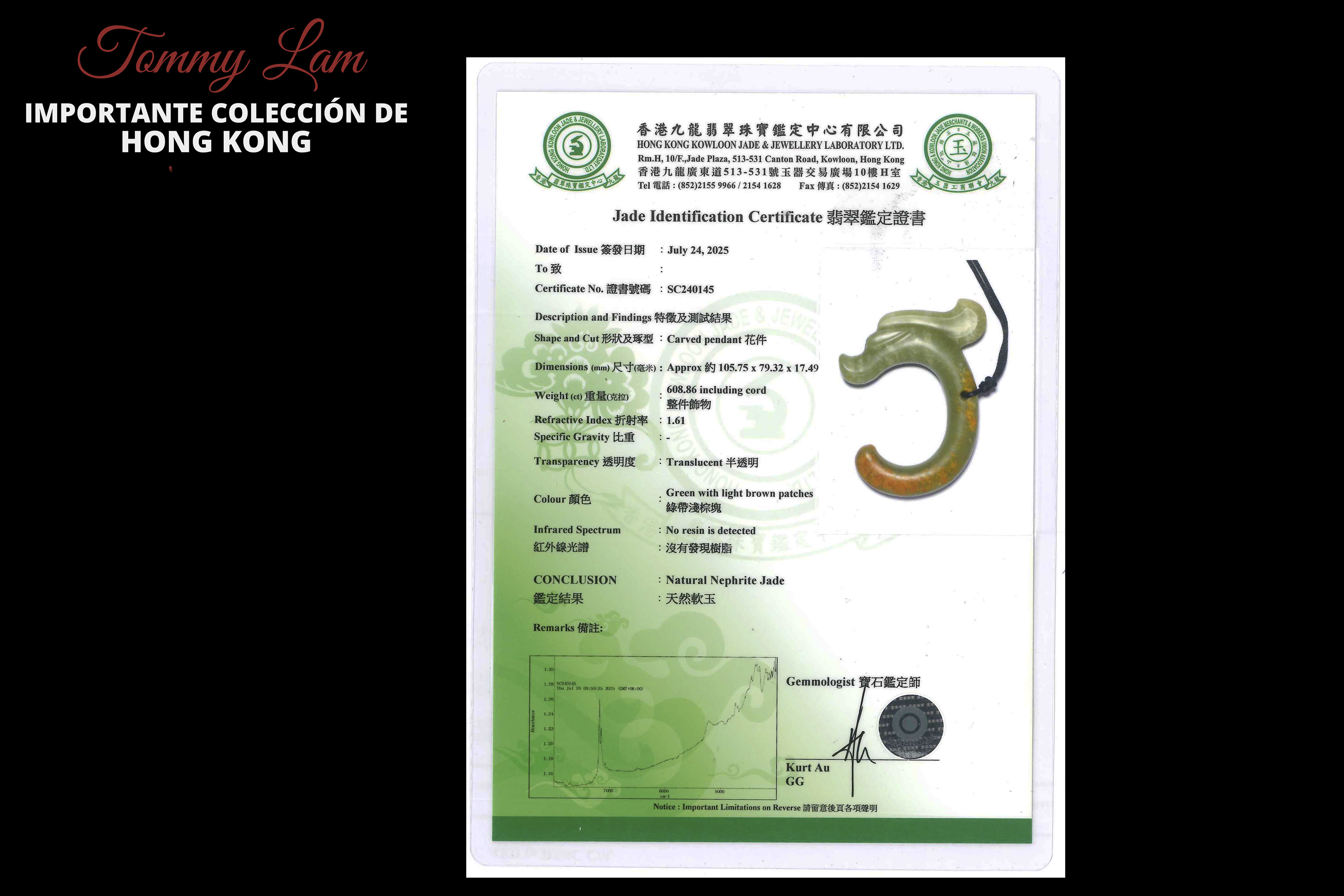 The piece is accompanied by a gemological certificate issued by Hong Kong Kowloon Jade & Jewellery Laboratory LTD in 2025. SC240145.