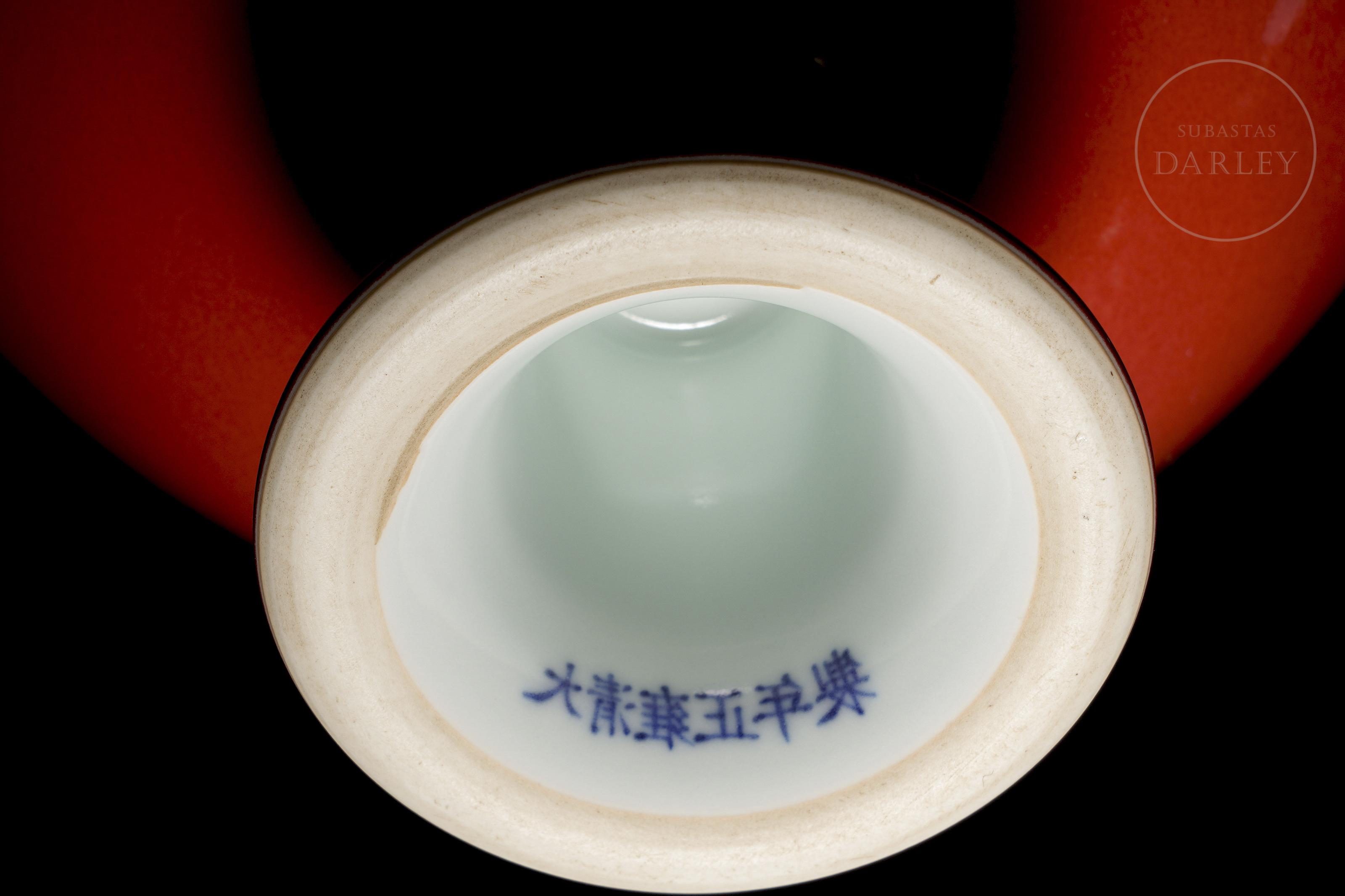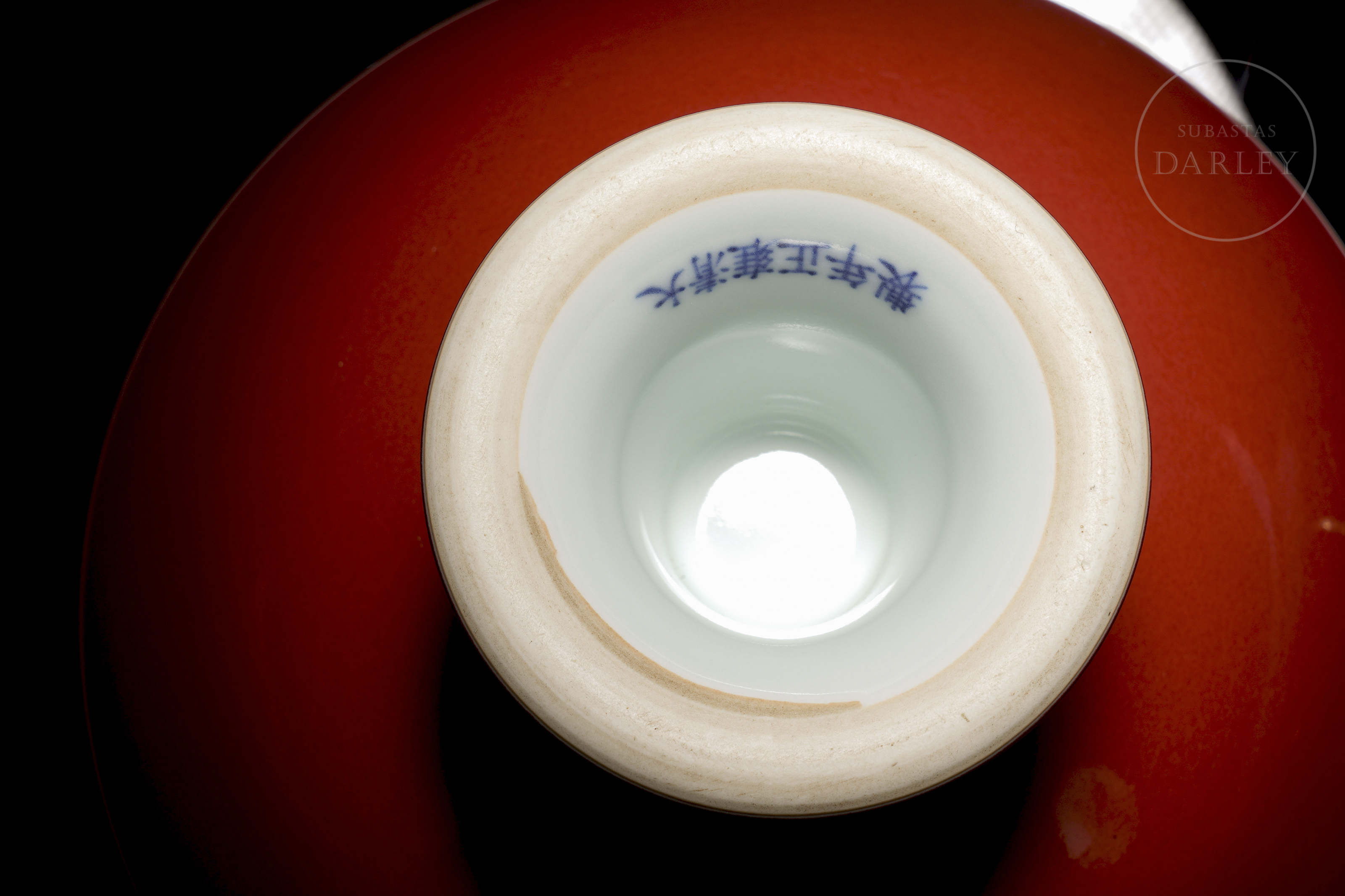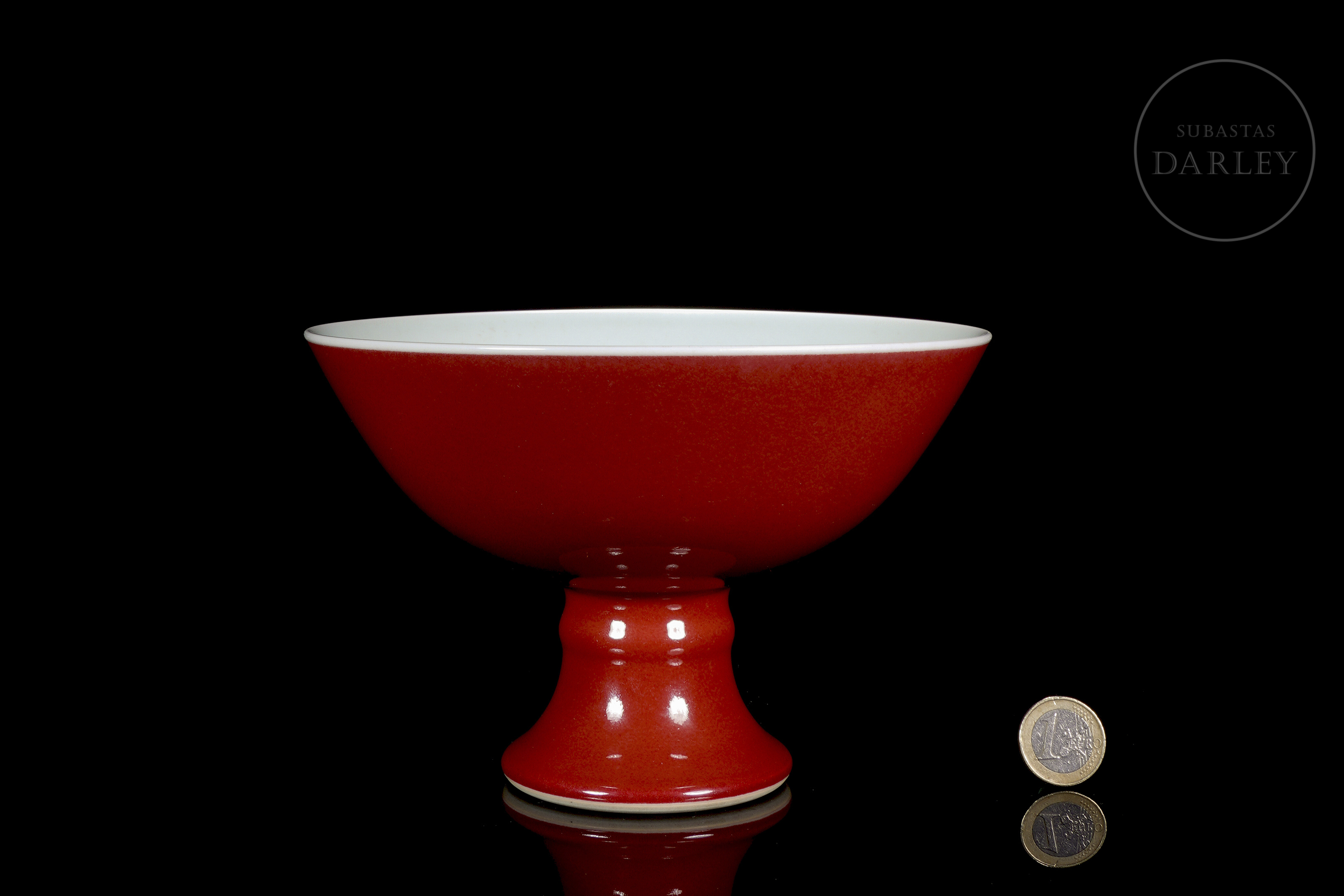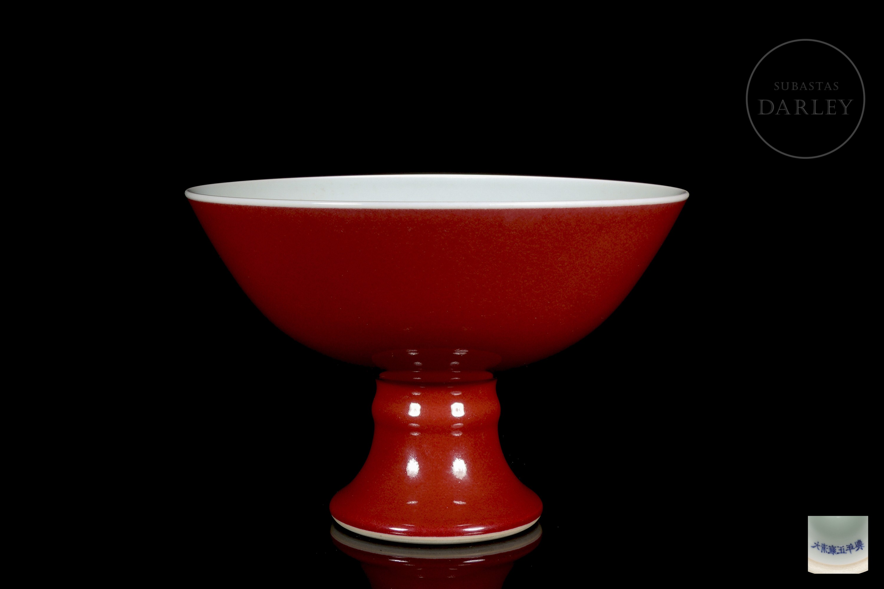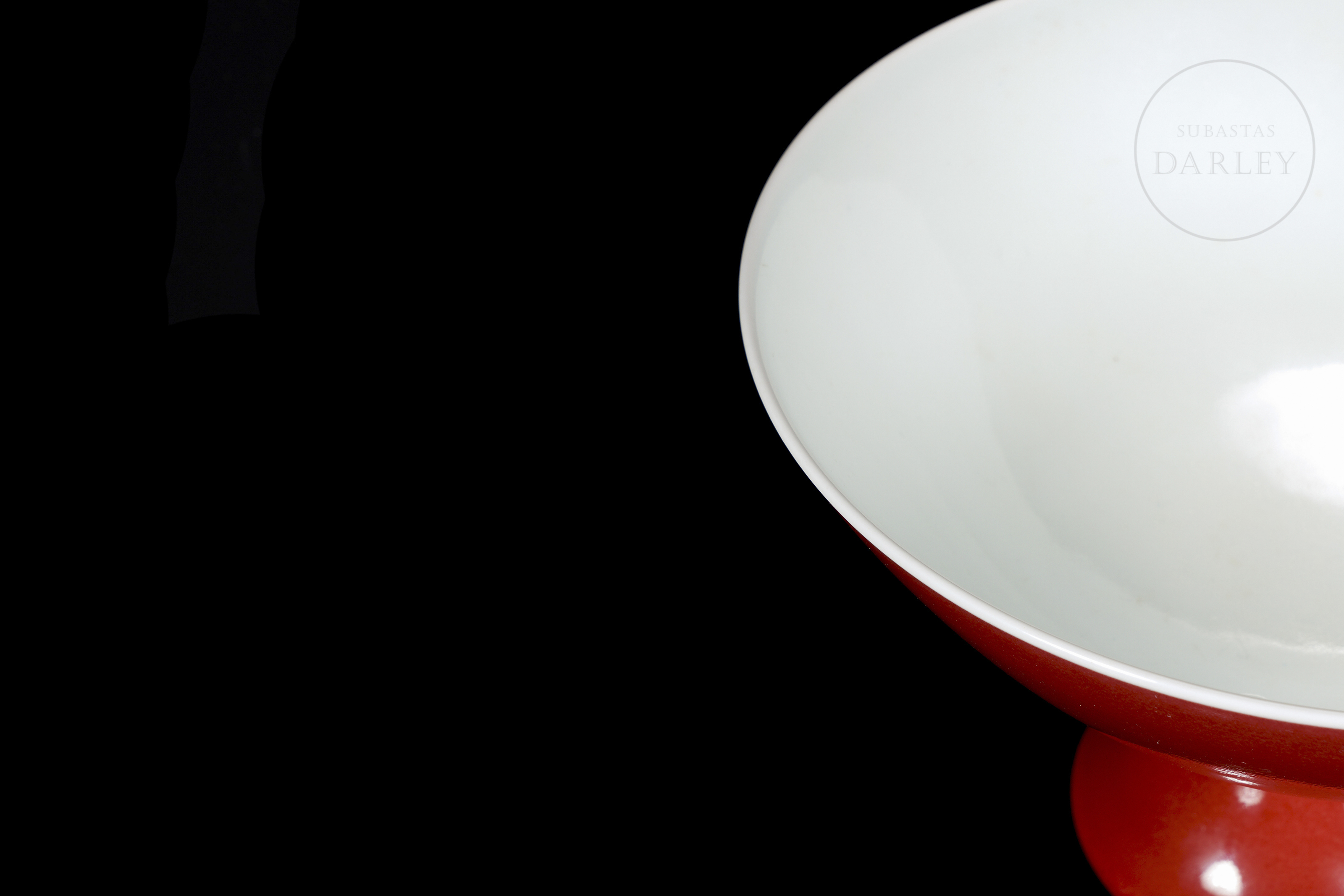Porcelain bowl with a high foot, the exterior coated with a monochrome coral red glaze. The interior of the bowl and foot are white. Inside the hollow foot is a six-character mark ‘大清雍正年制’ in underglaze cobalt blue.