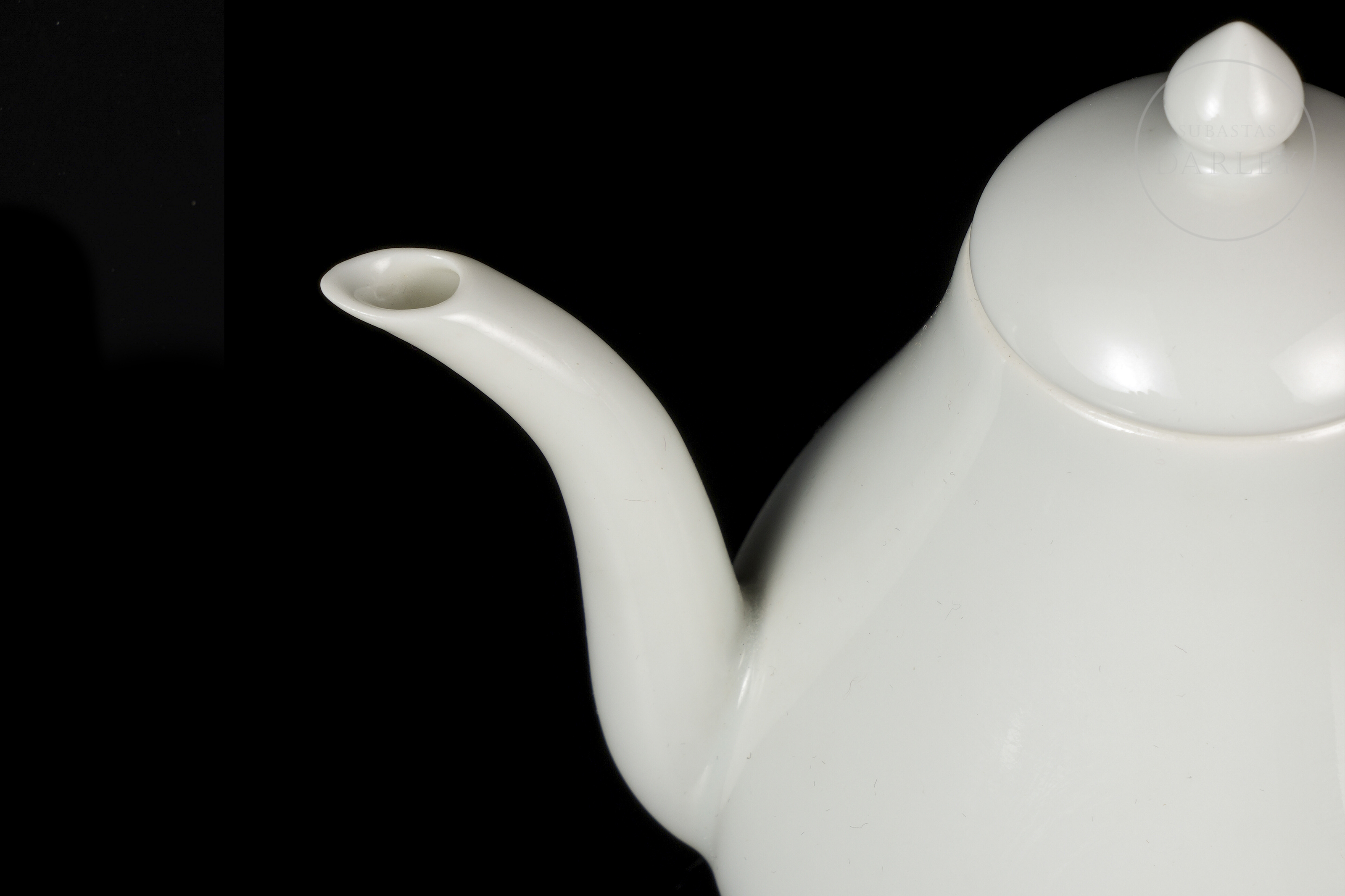 It has a pear-shaped body rising from a circular foot, a curved spout and an ear handle. The lid, topped with a button-like finial, and the shoulder of the piece feature small rings for fastening. The entire surface is covered with a delicate smooth white enamel, without decoration.
