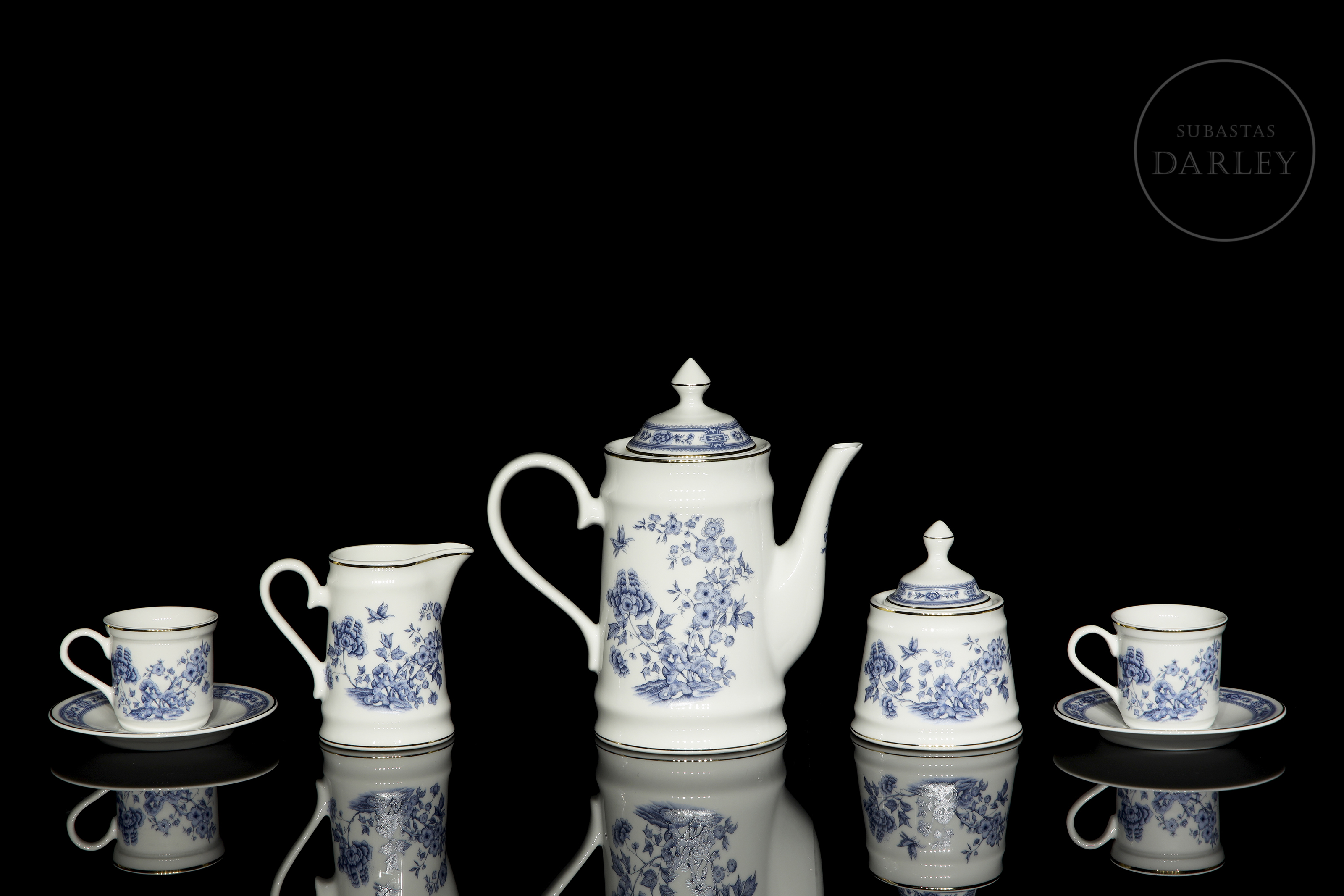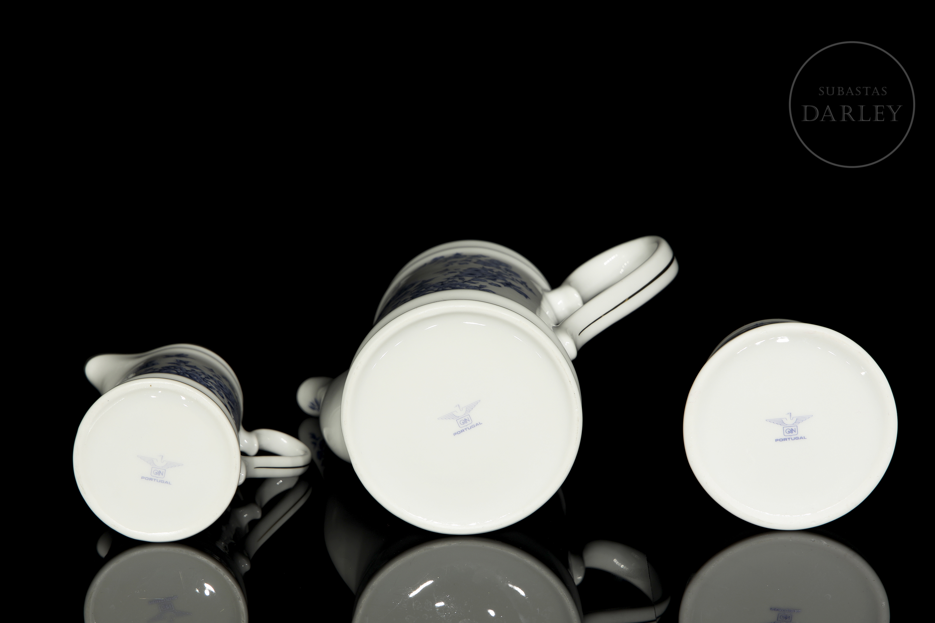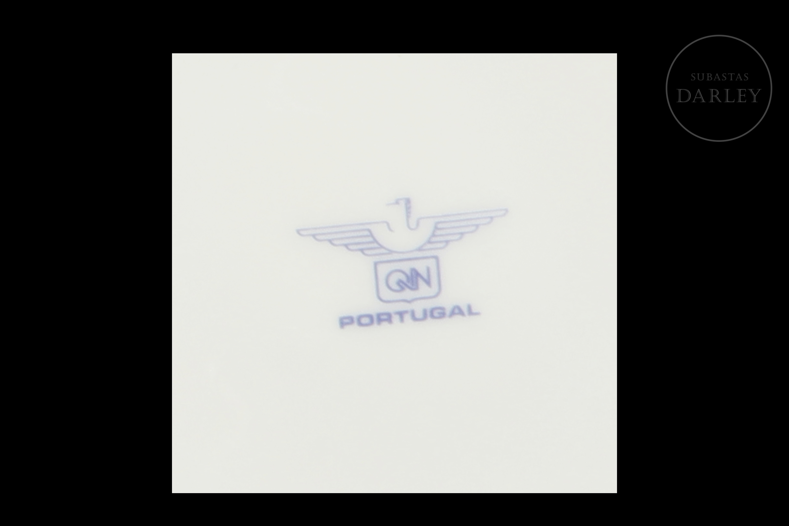 一套葡萄牙瓷器,包括咖啡壶、奶罐、糖罐、十二个杯子和十二个碟子。饰以钴蓝色花卉图案,边缘饰以金色滚边。每件瓷器的底部均有“QN Portugal”标记。