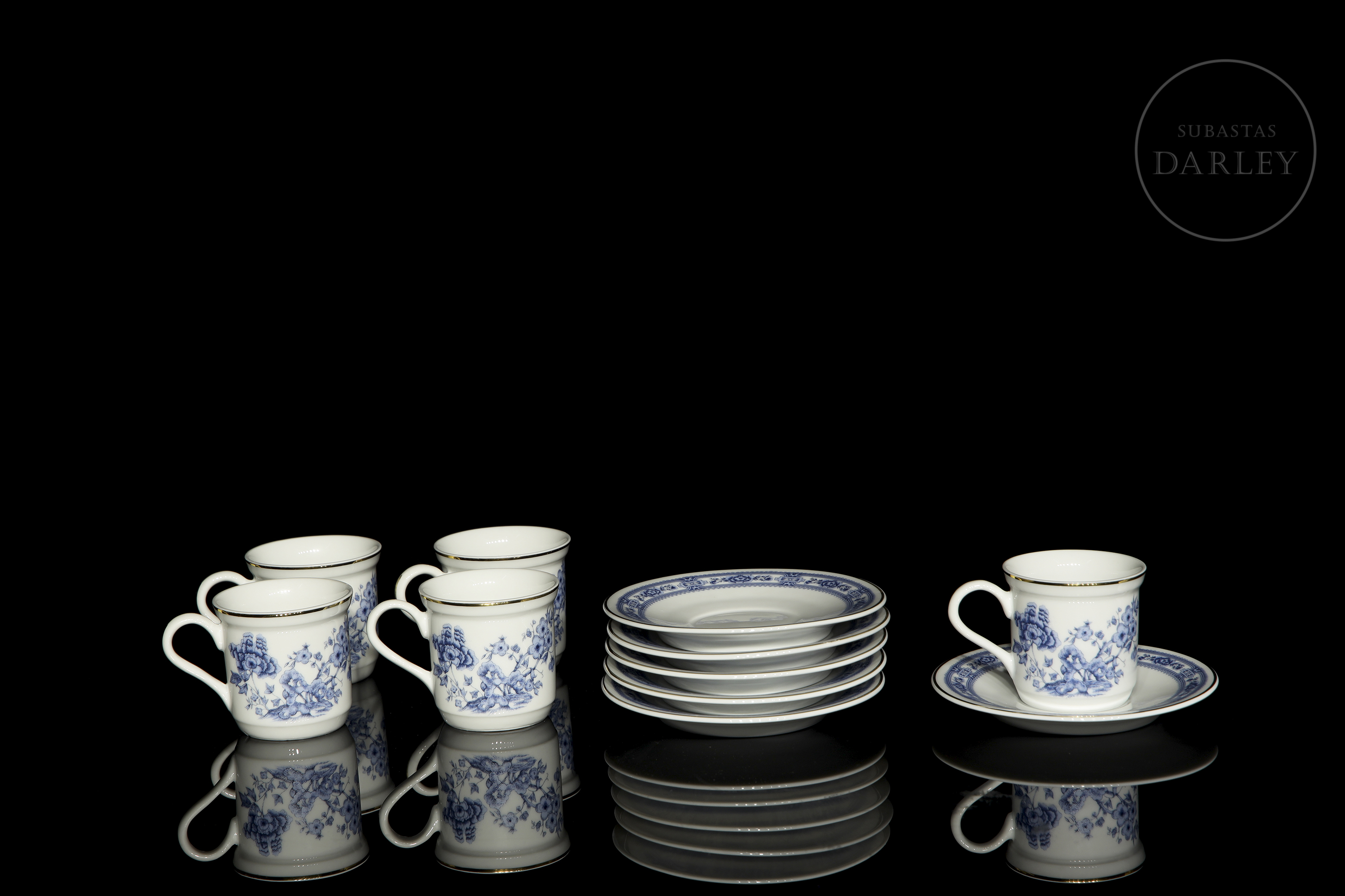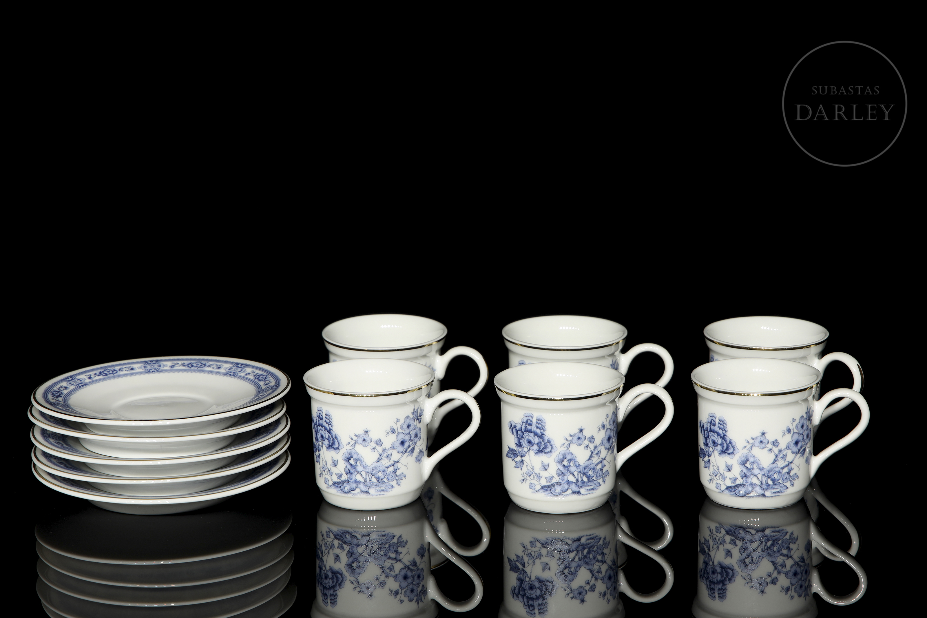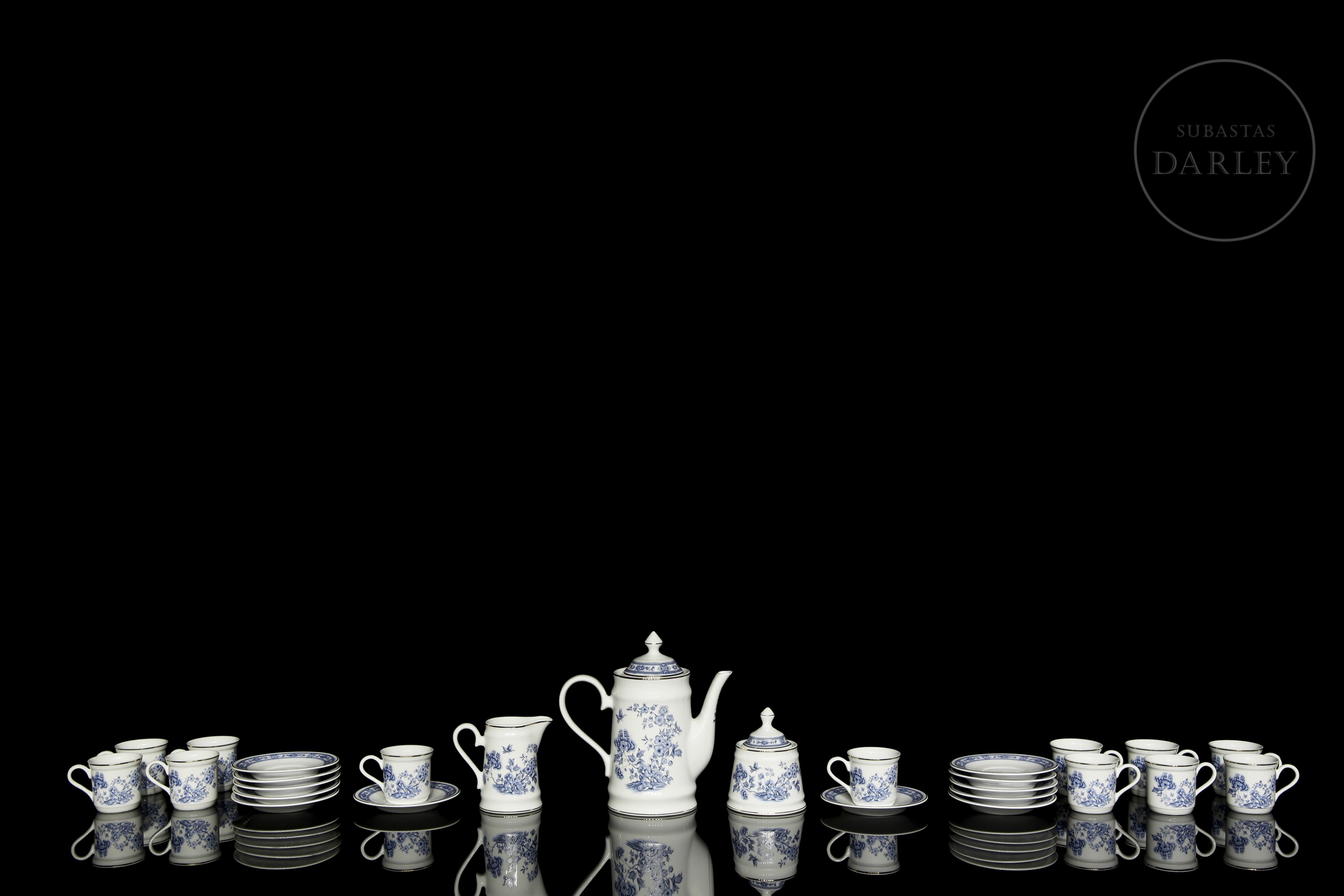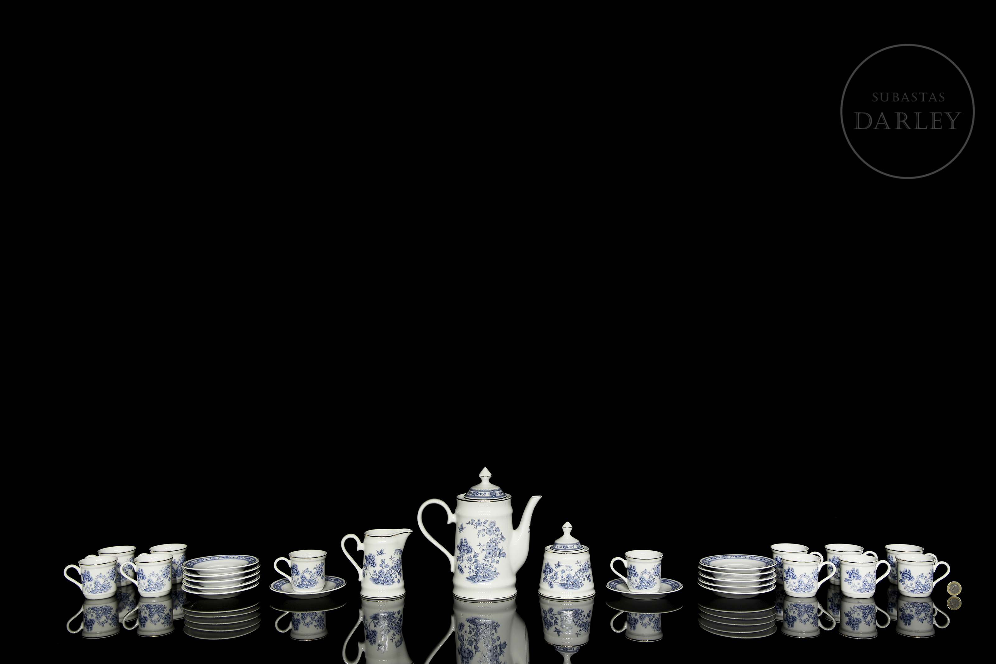 一套葡萄牙瓷器,包括咖啡壶、奶罐、糖罐、十二个杯子和十二个碟子。饰以钴蓝色花卉图案,边缘饰以金色滚边。每件瓷器的底部均有“QN Portugal”标记。
