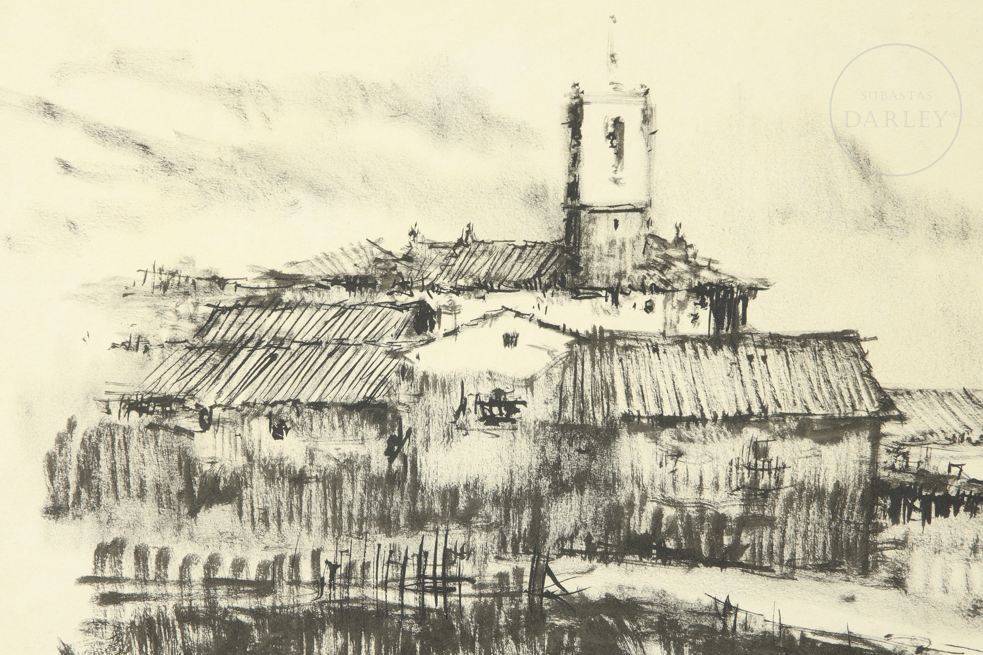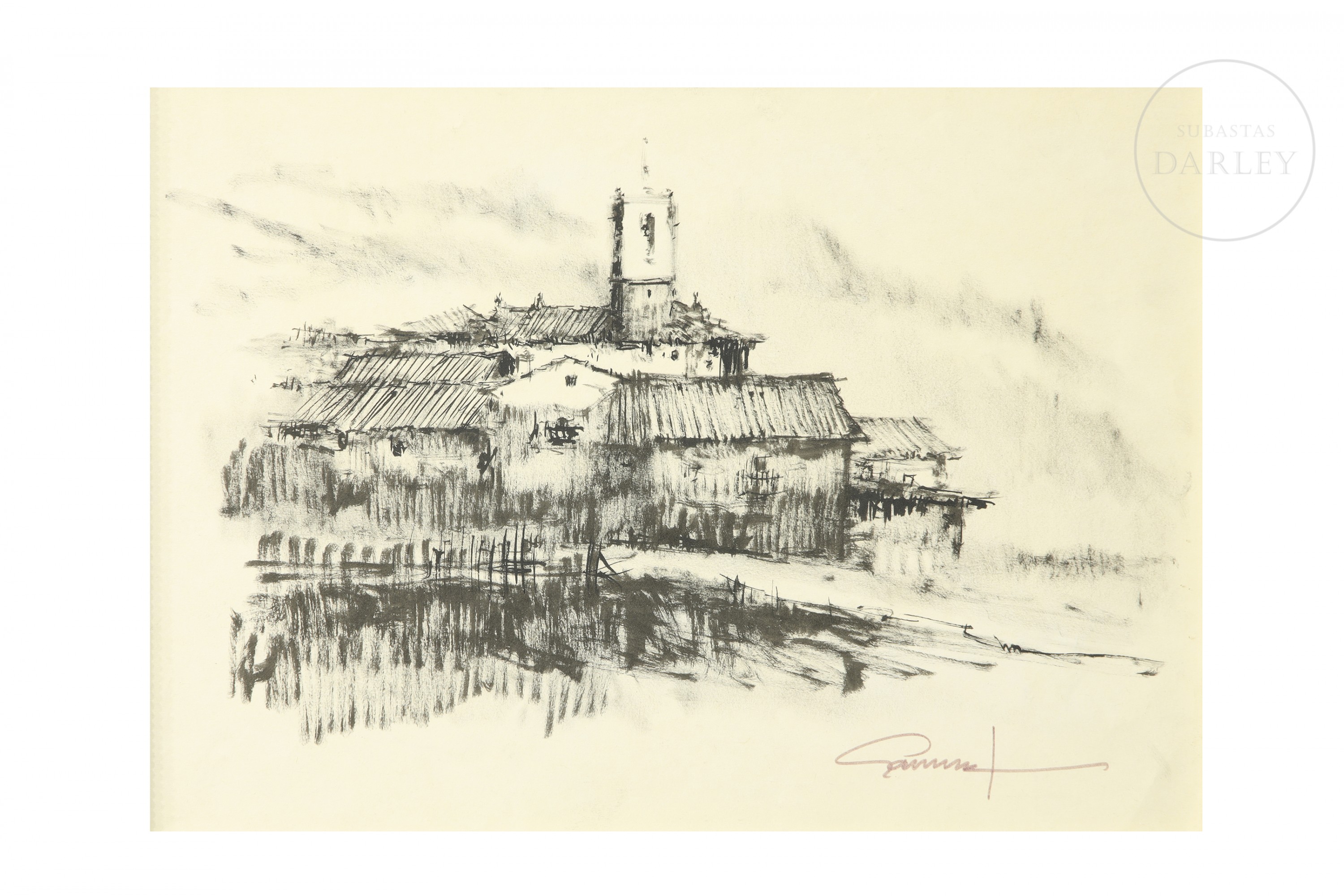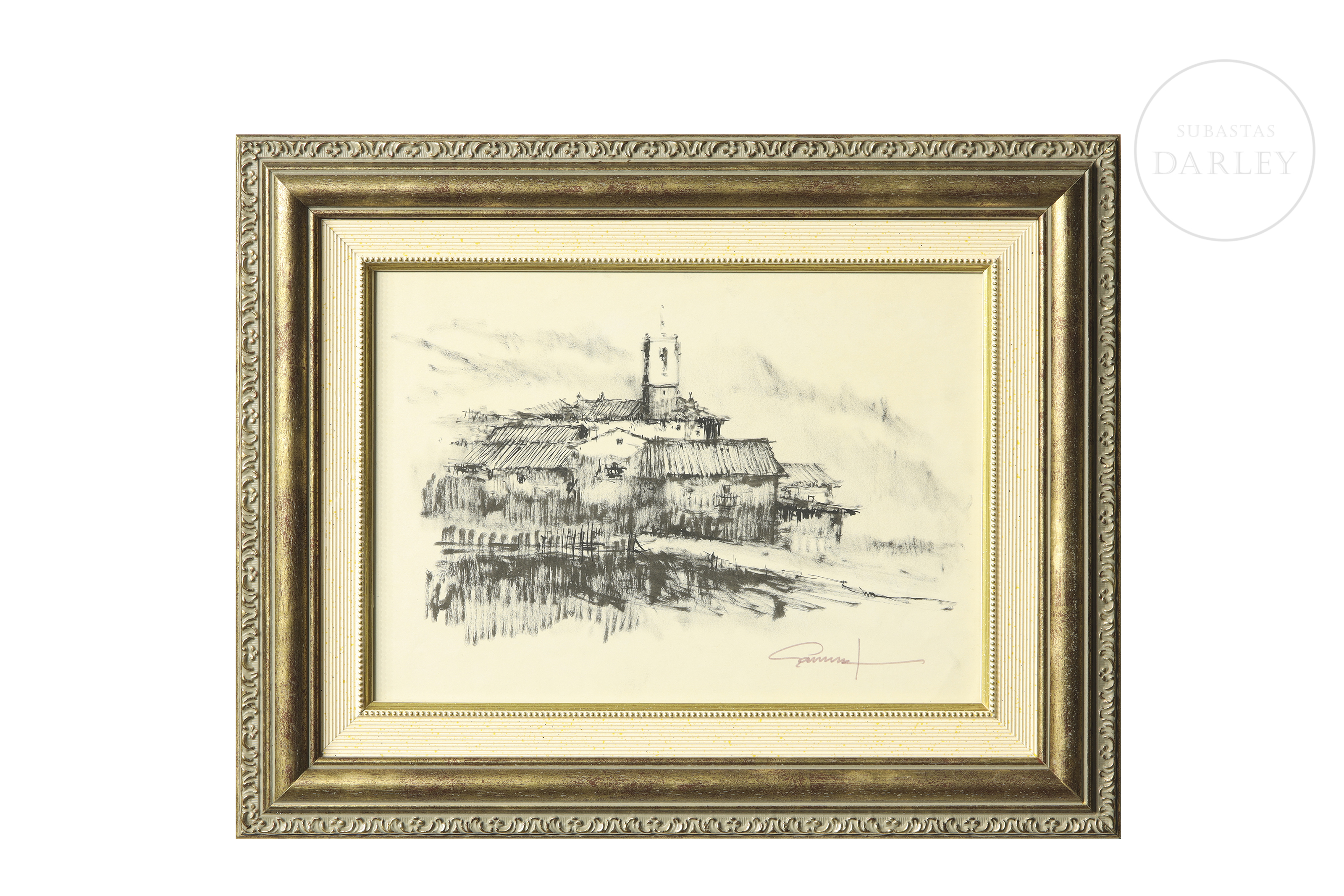 纸本综合材料。描绘一座乡村聚落,低矮屋顶环绕,中央矗立钟楼。右下角签名“Garrich”。