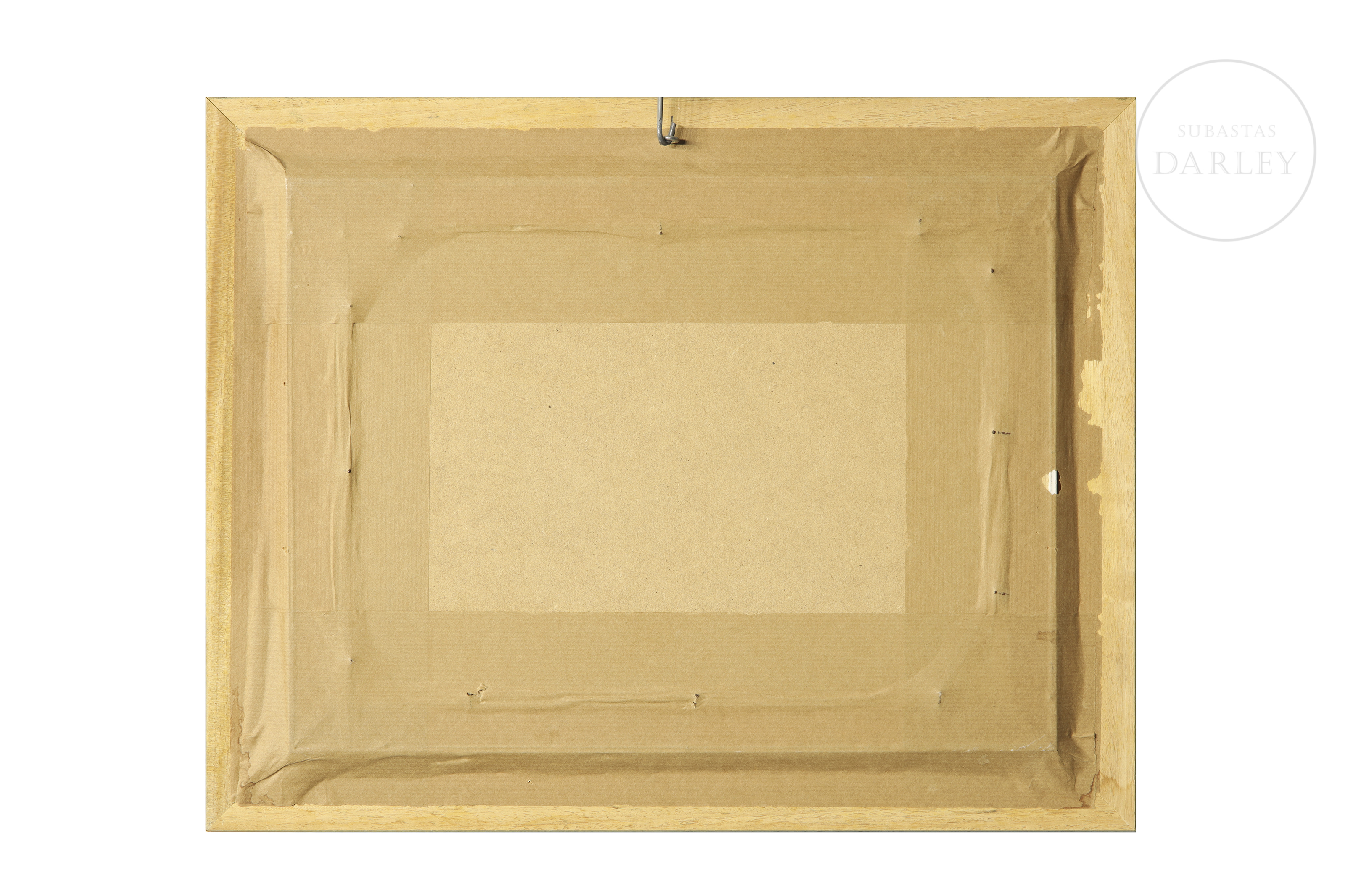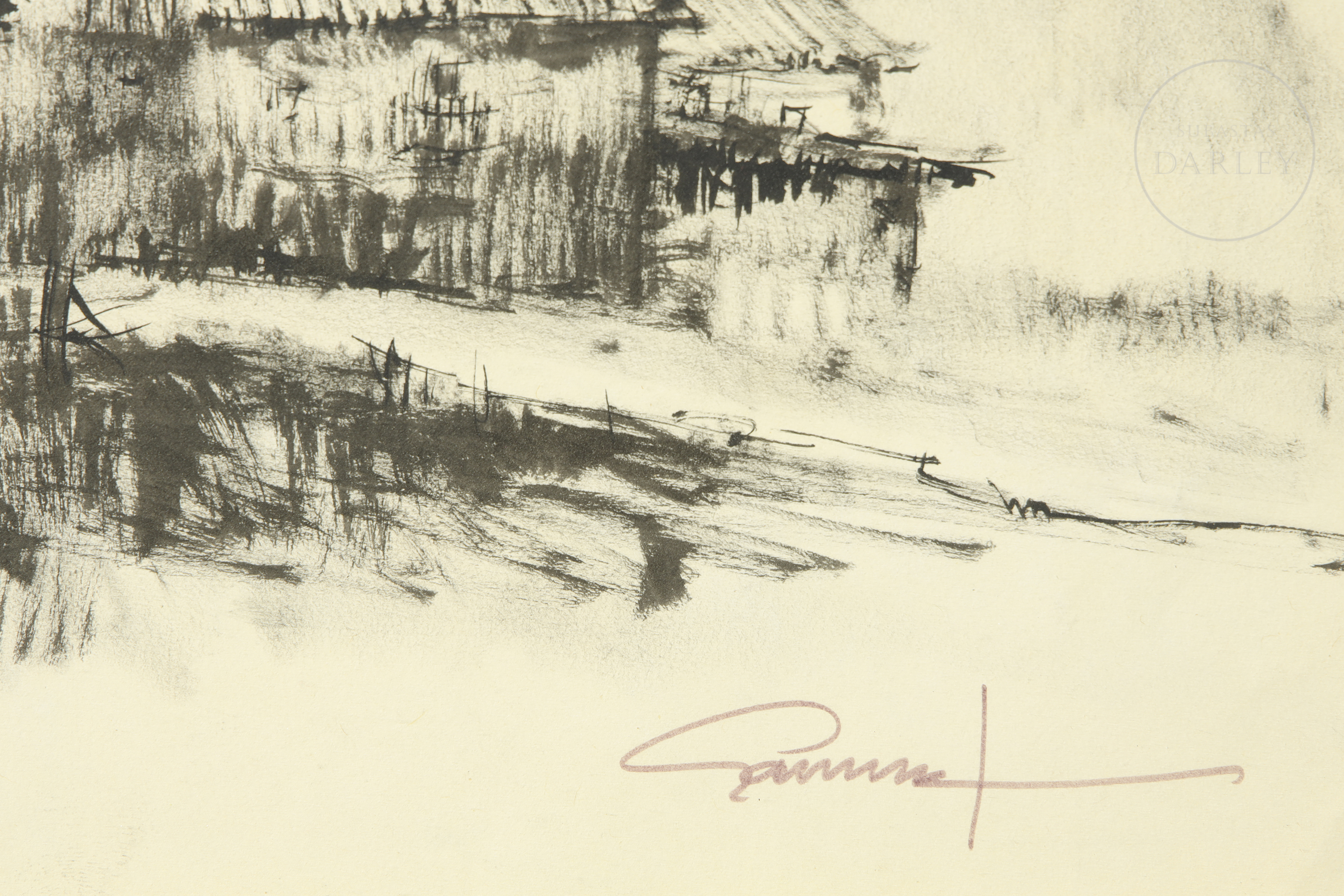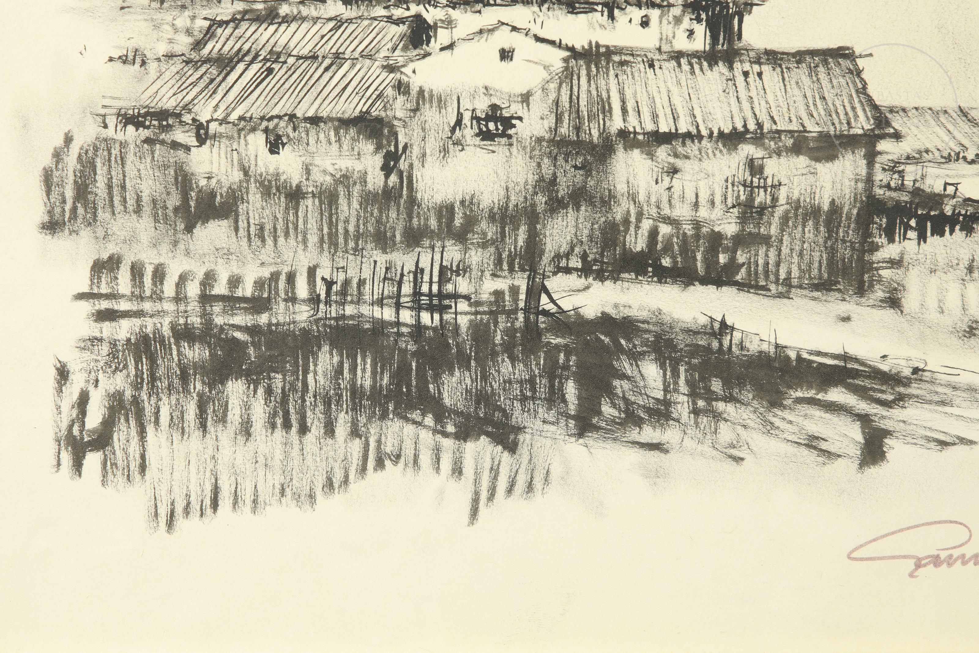 纸本综合材料。描绘一座乡村聚落,低矮屋顶环绕,中央矗立钟楼。右下角签名“Garrich”。