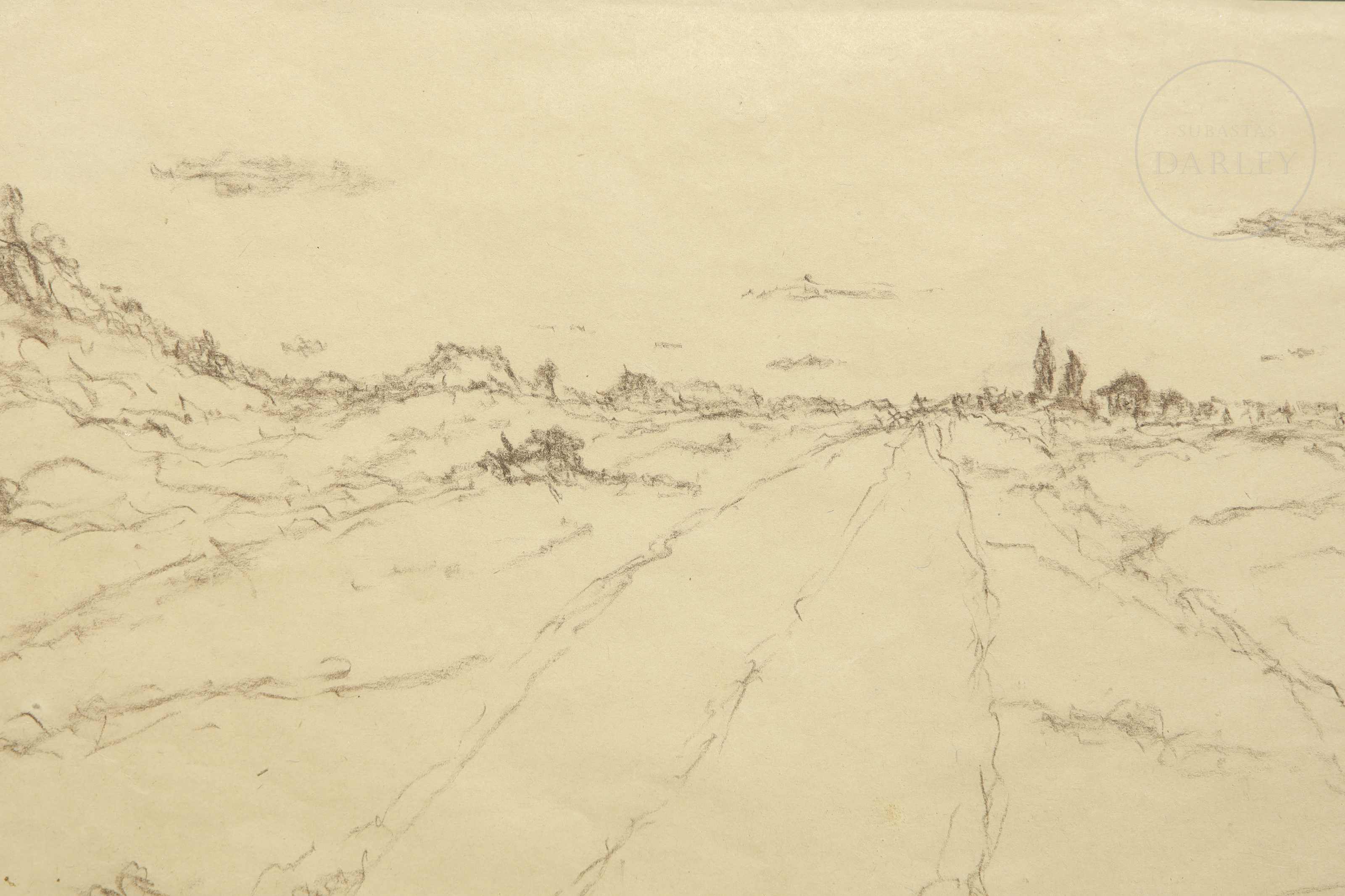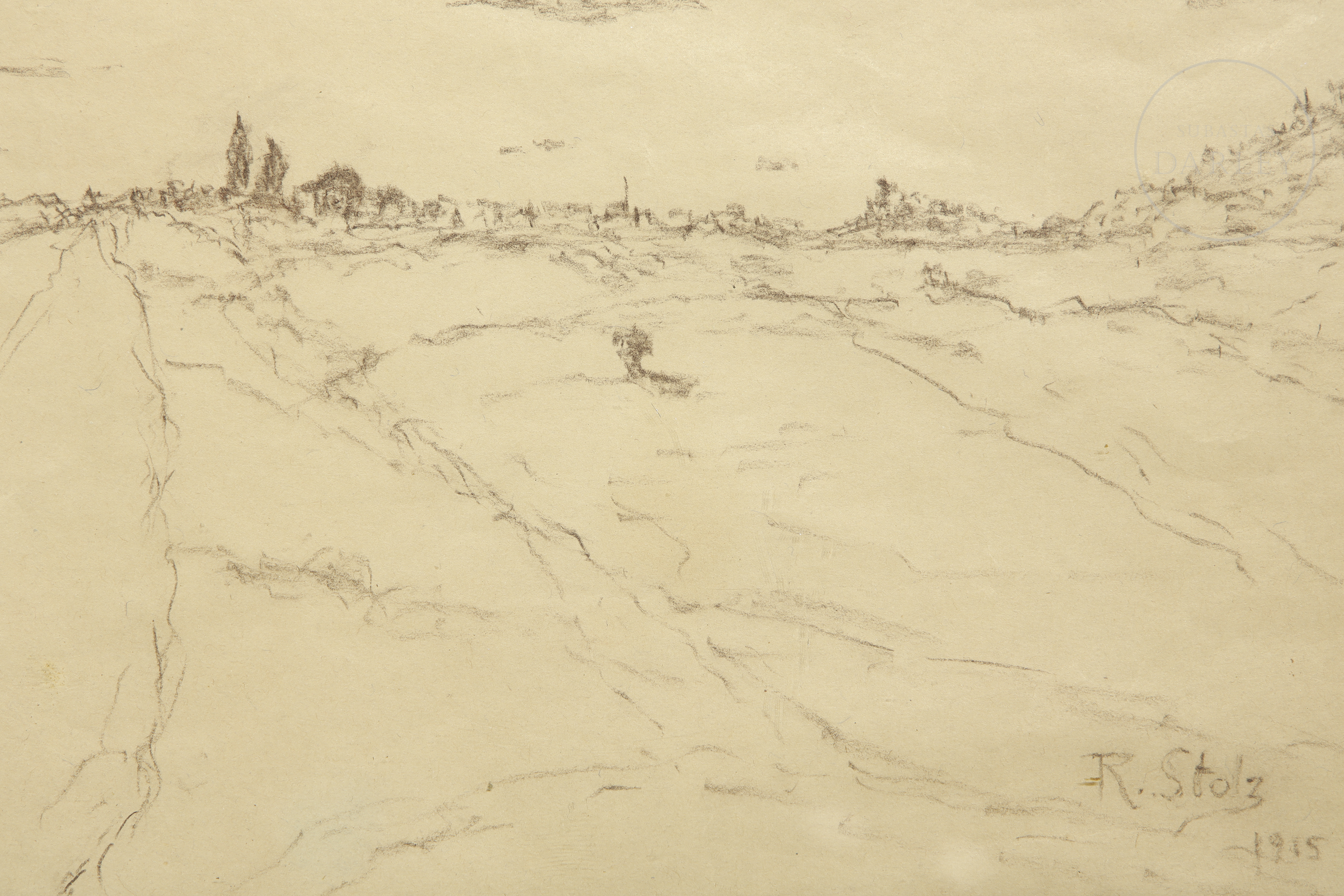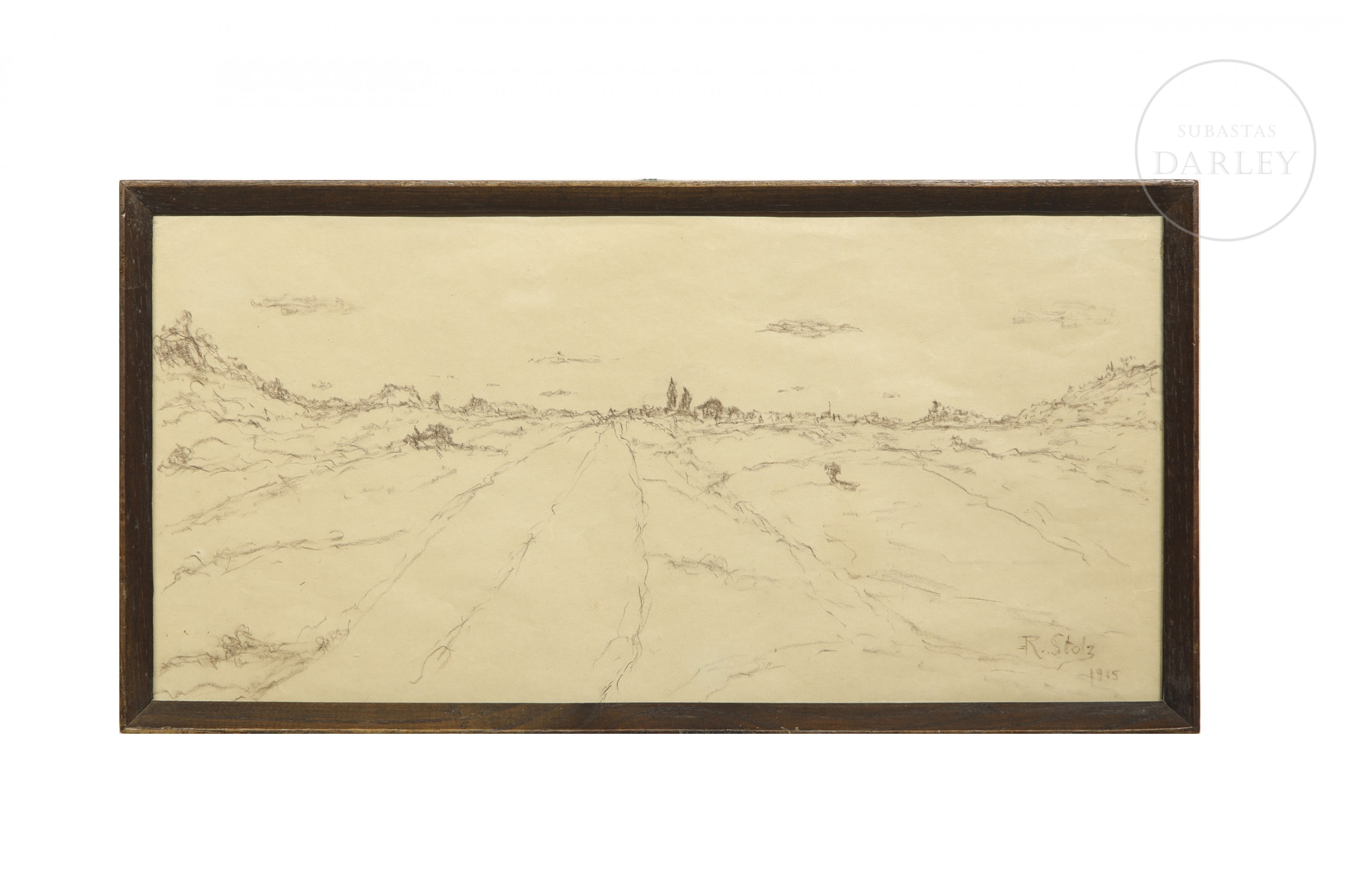 纸上铅笔画。描绘一条延伸至远方的乡间小路,地平线上点缀着零星树丛。右下角签名并注明日期“R. Stolz 1915”。