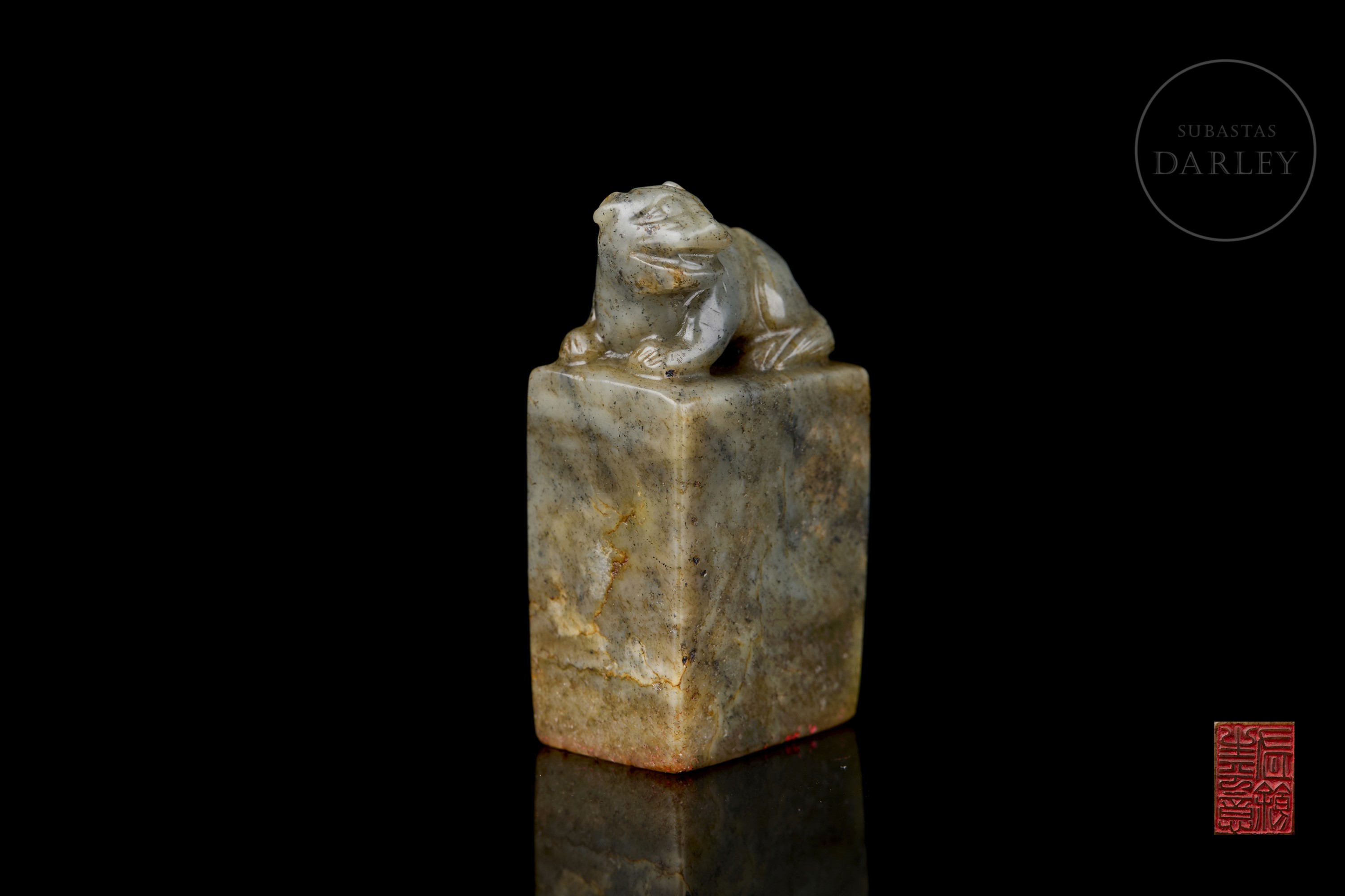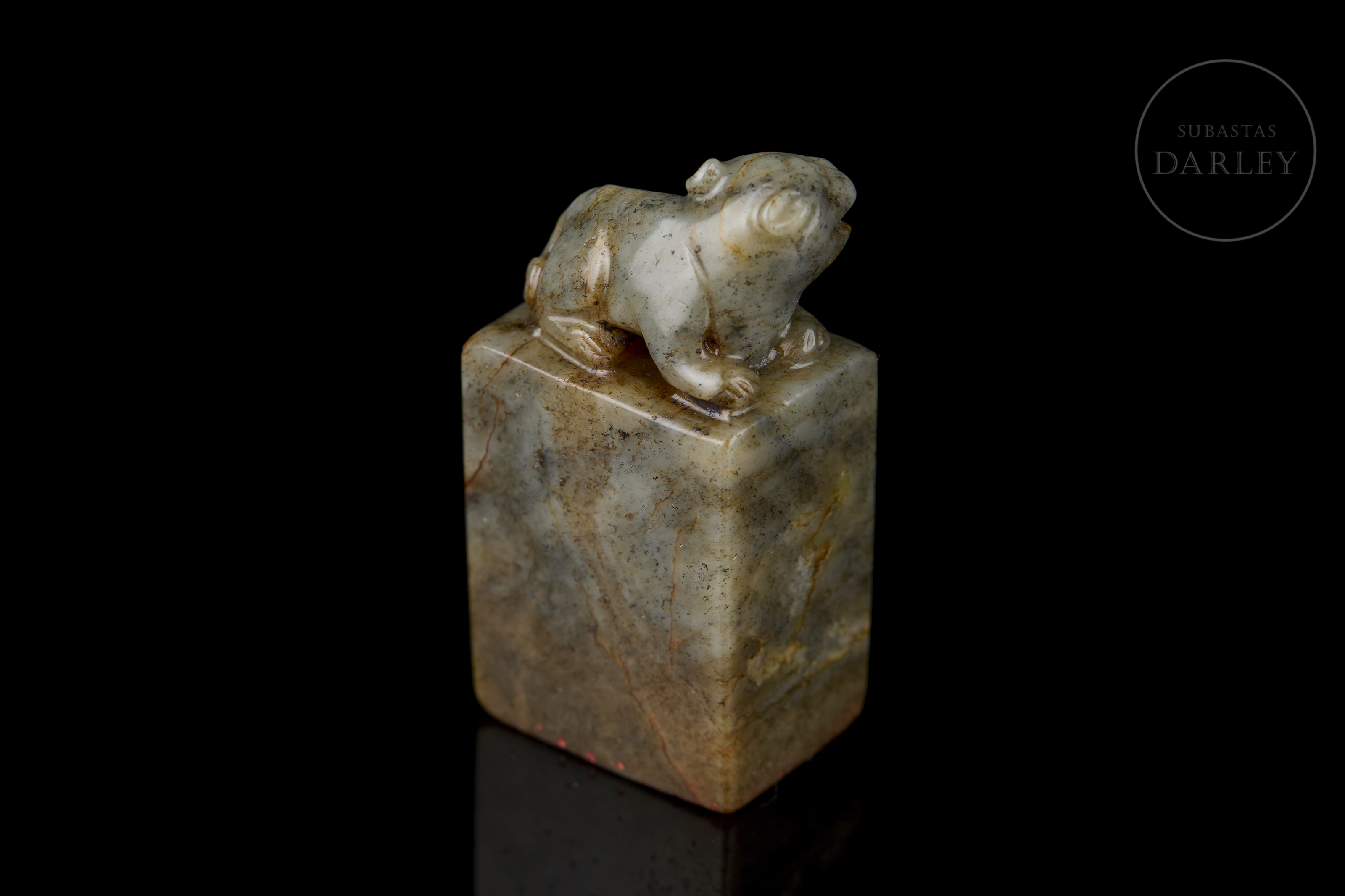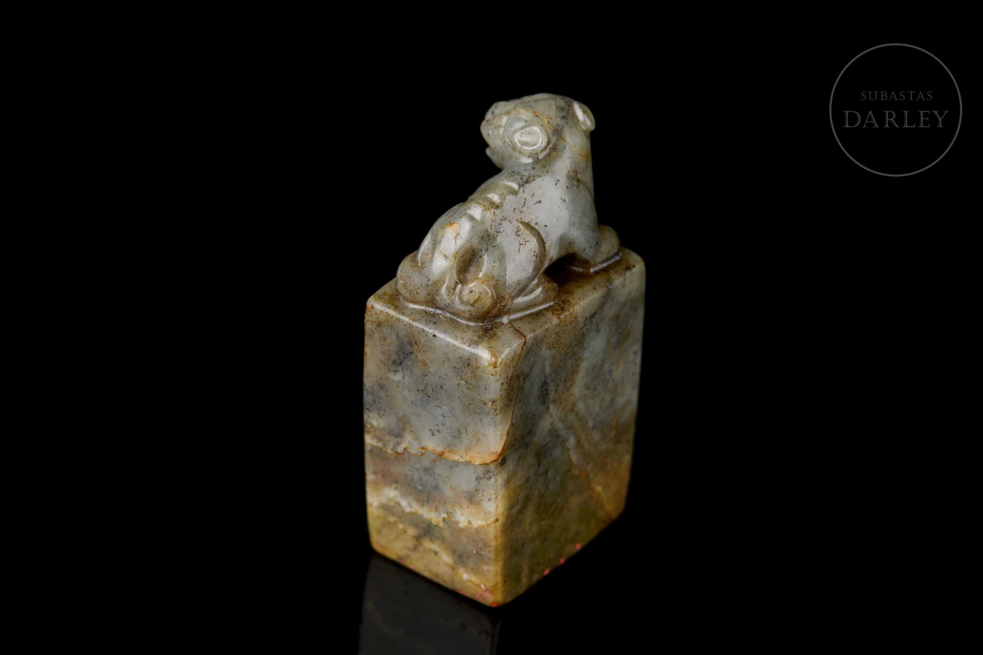 Rectangular jade seal, crowned by the carving of a seated dog with a compact body, erect ears and a serene expression. The stone has a natural patina with greyish and ochre-coloured veins. The base retains the incised seal with the characters ‘生平意有余’.