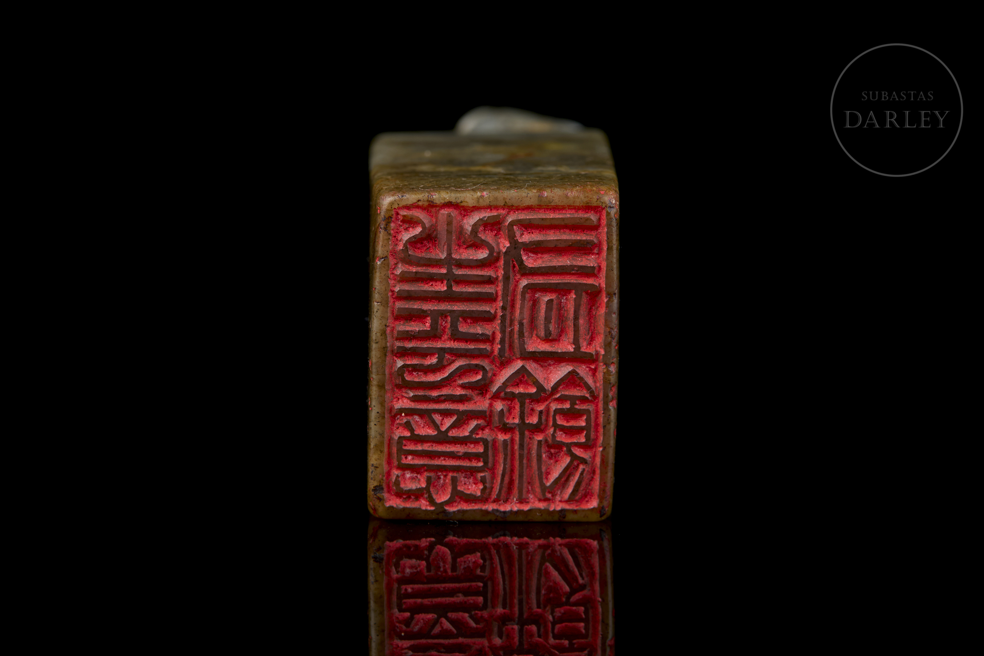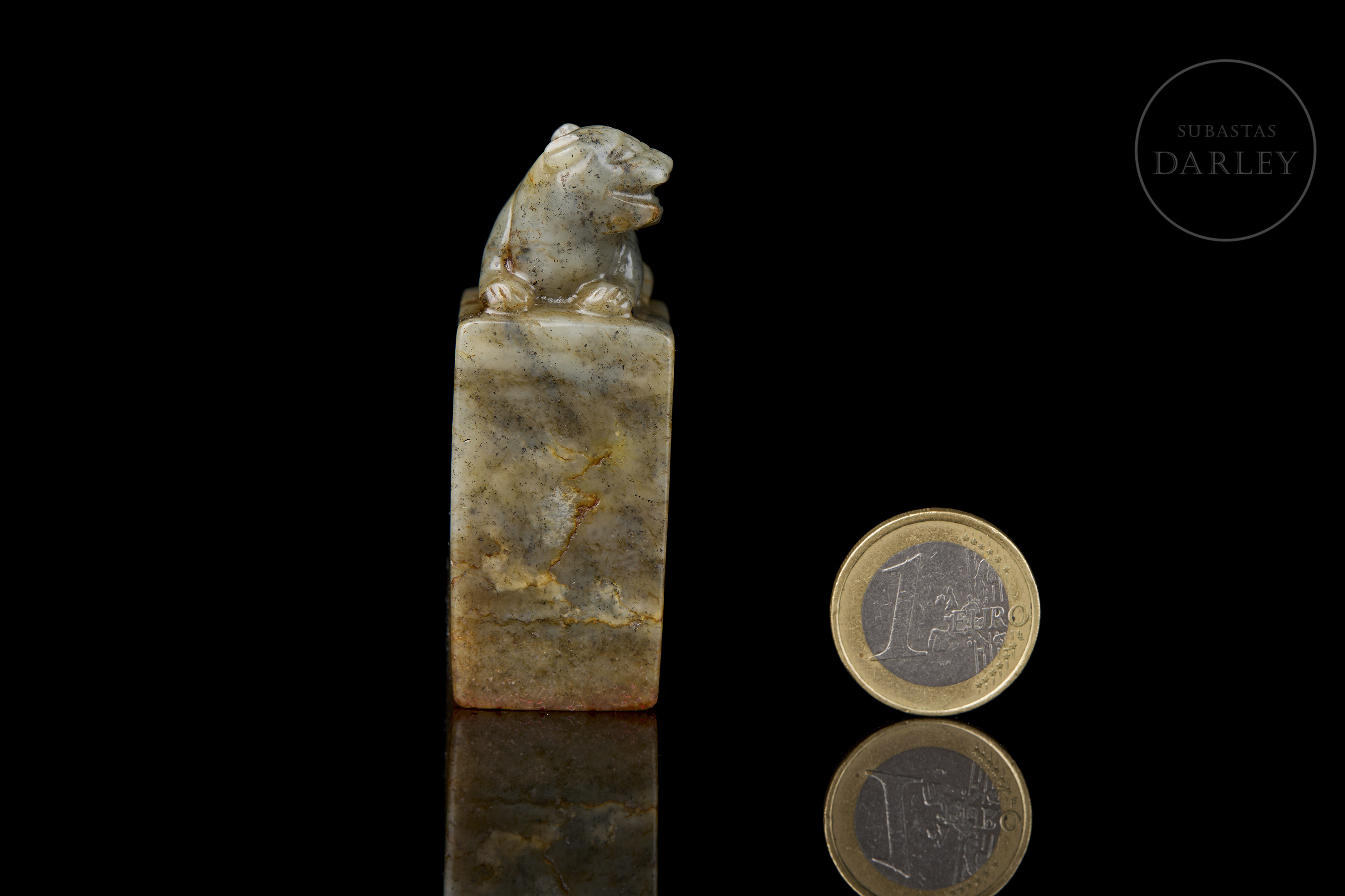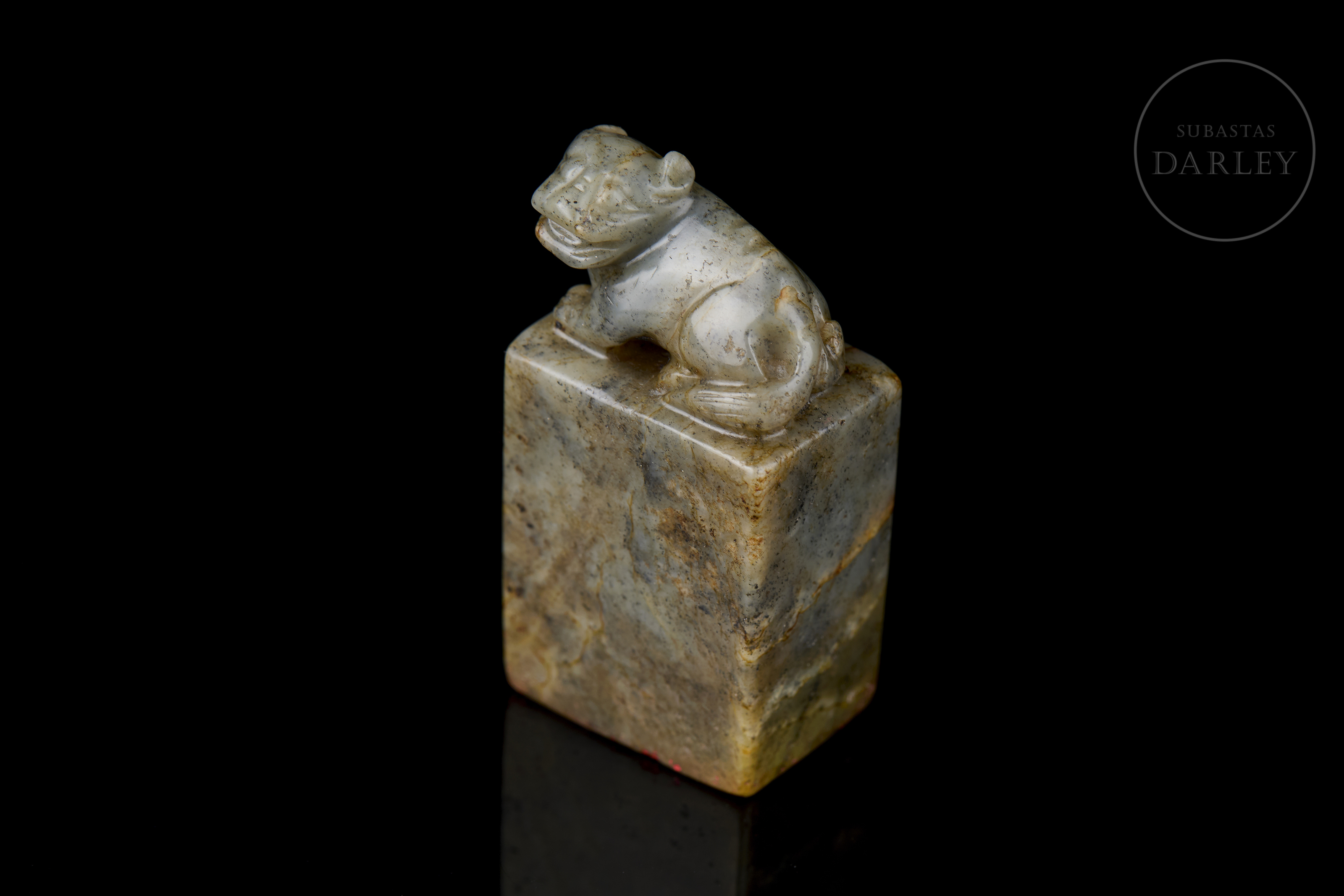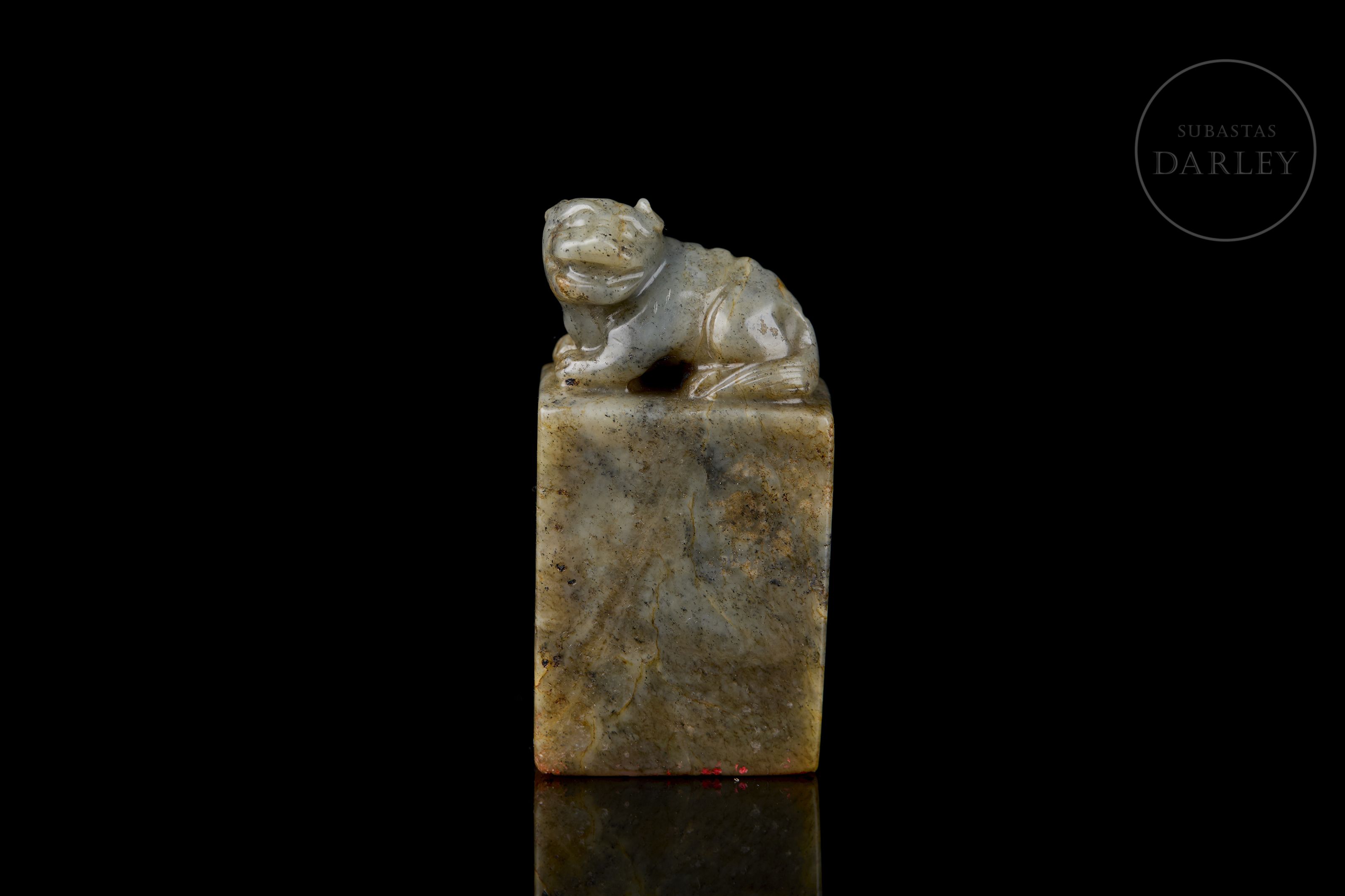 Rectangular jade seal, crowned by the carving of a seated dog with a compact body, erect ears and a serene expression. The stone has a natural patina with greyish and ochre-coloured veins. The base retains the incised seal with the characters ‘生平意有余’.