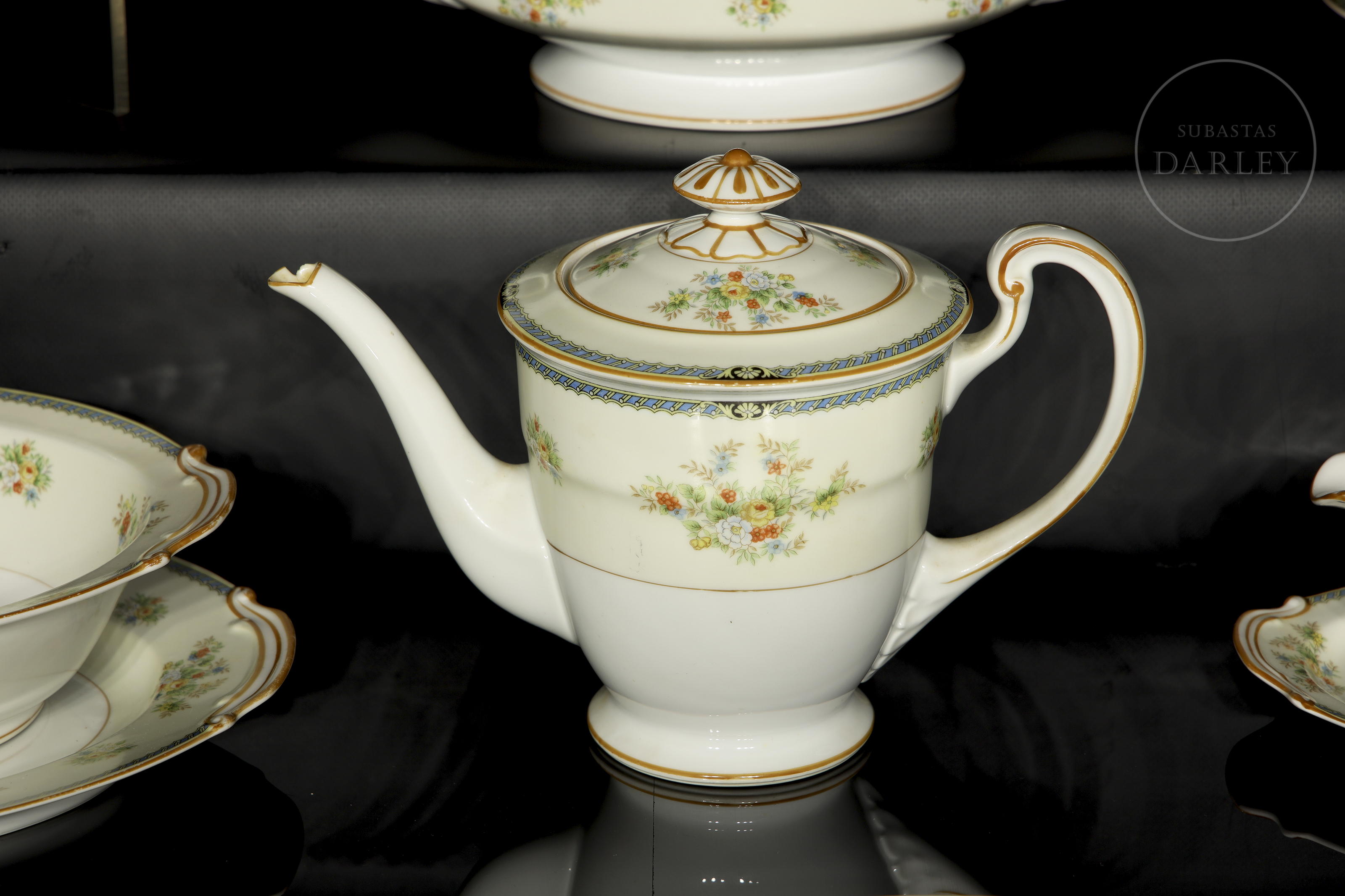 全套日本瓷器餐具(玫瑰瓷),含36只餐盘及各类盛器(水壶、汤盅、调味碟及托盘)。装饰以粉彩花束为主体,配以蓝色几何边框,边缘饰以金边。