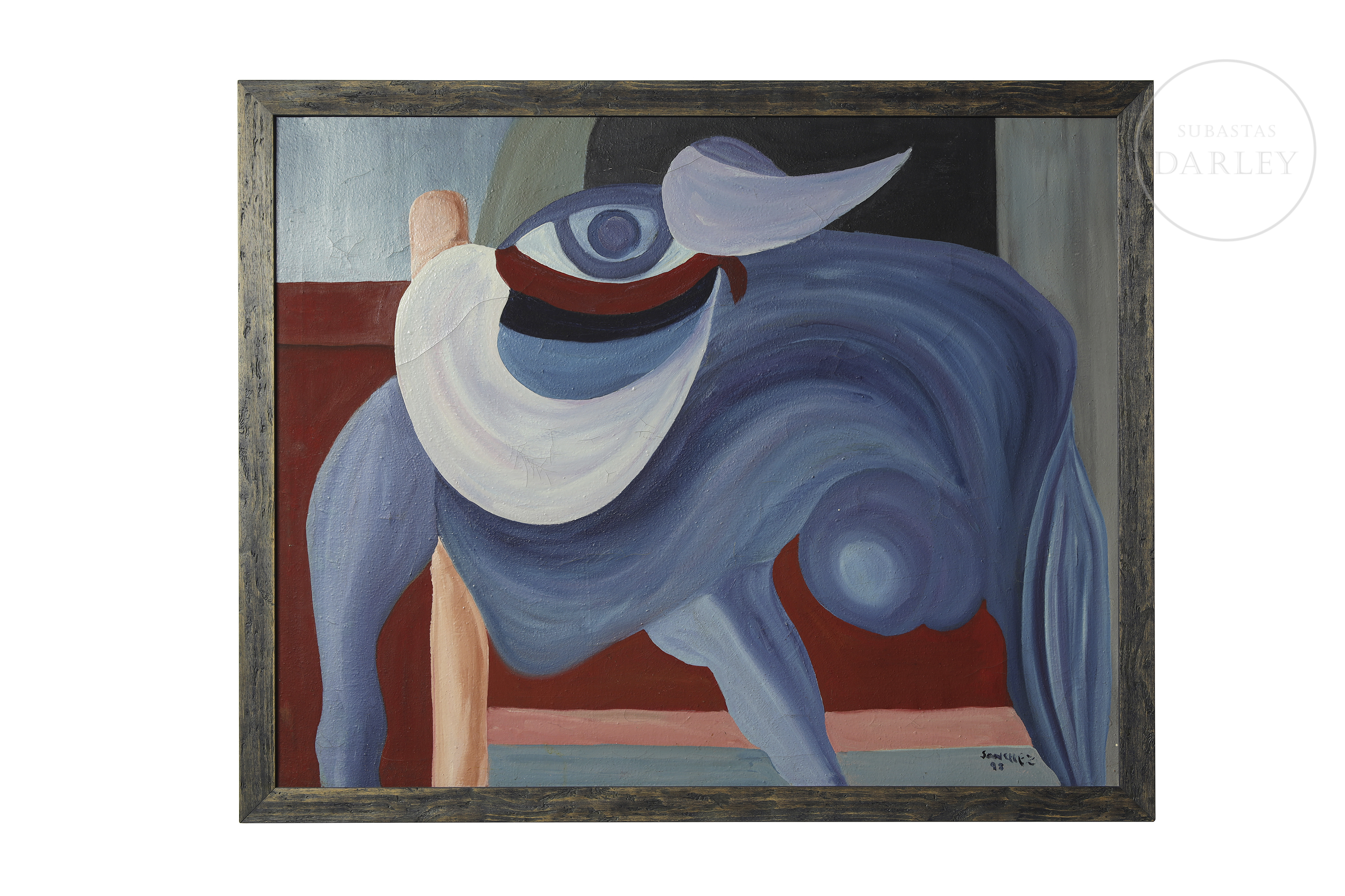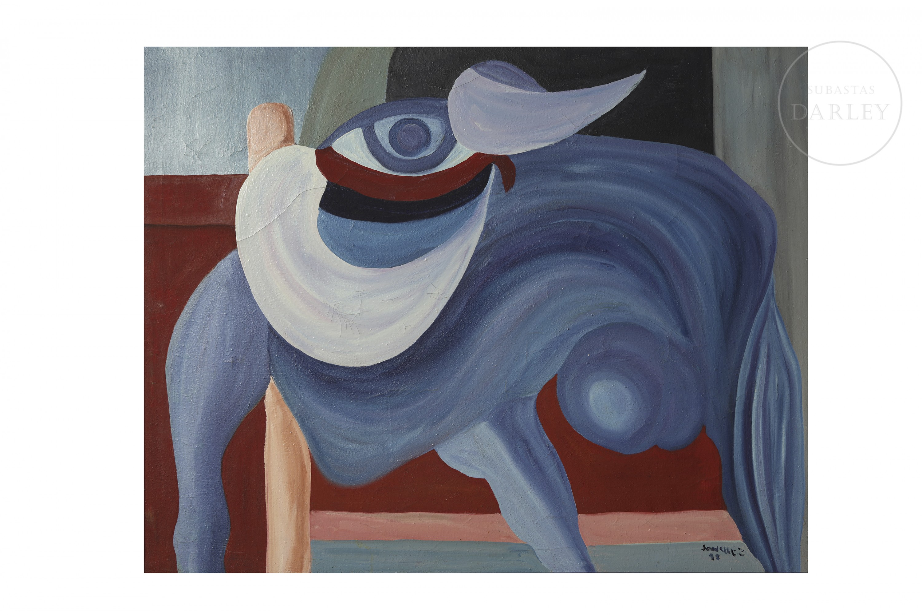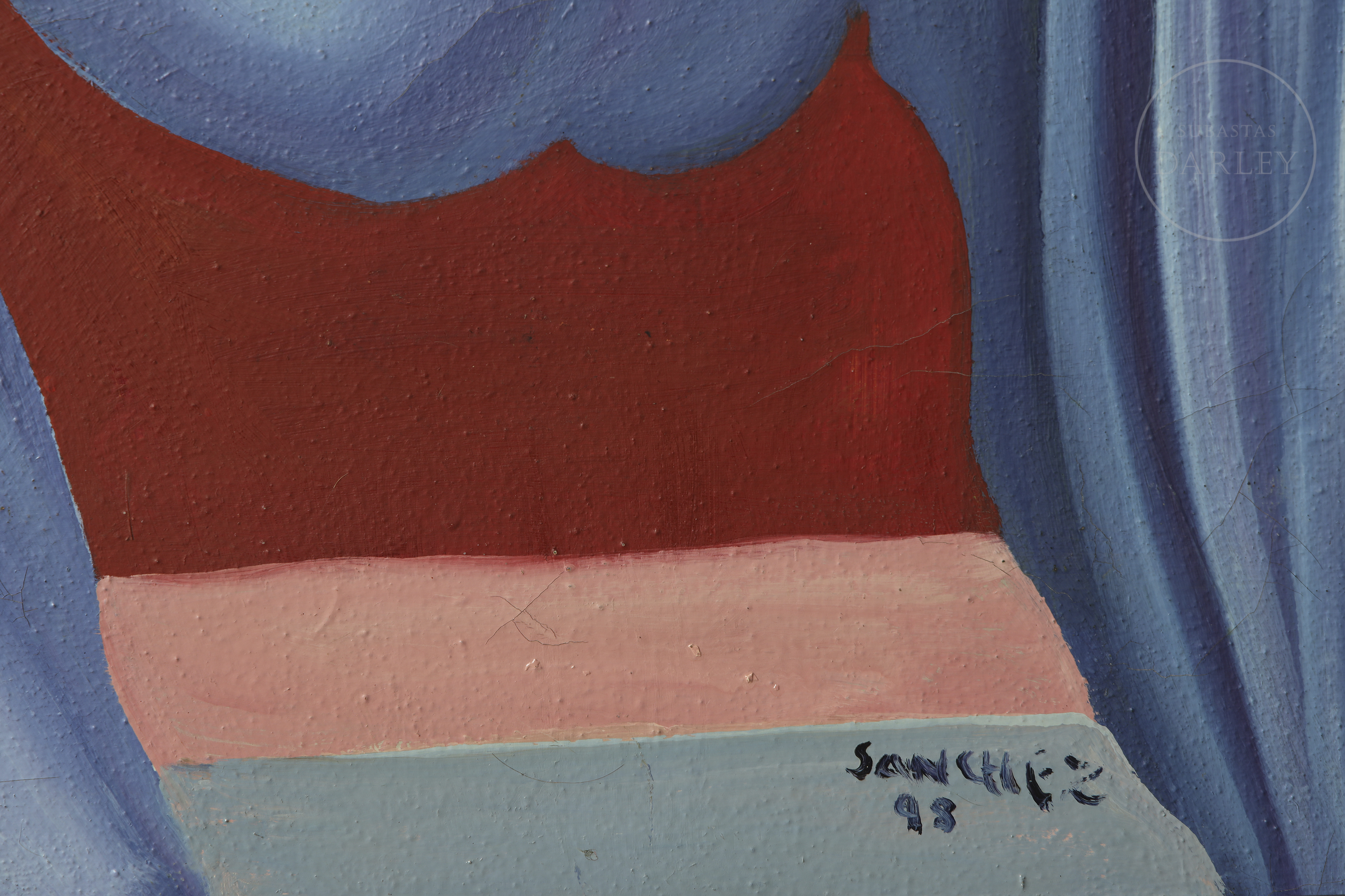 丙烯颜料布面油画。画面描绘一头公牛,其脸部与犄角经艺术化处理,置于红黑渐变的几何背景中。右下角签名并标注日期:“Sanchez/98”。