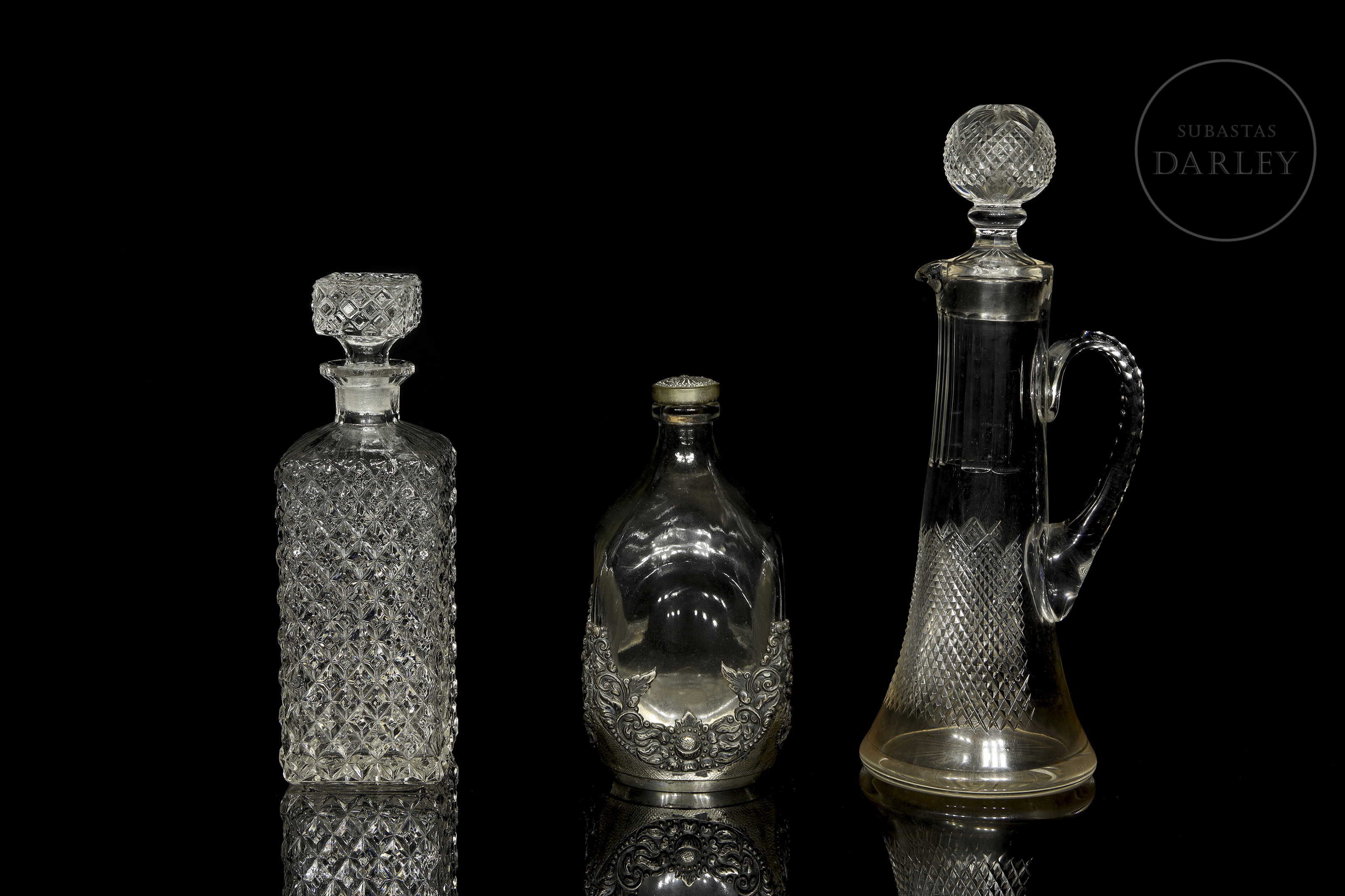 三件套玻璃瓶,设计各异。包含:带手柄与球形瓶盖的高脚酒瓶;饰有菱形雕花纹的方形瓶;以及瓶底饰有银色金属环的扁平瓶。