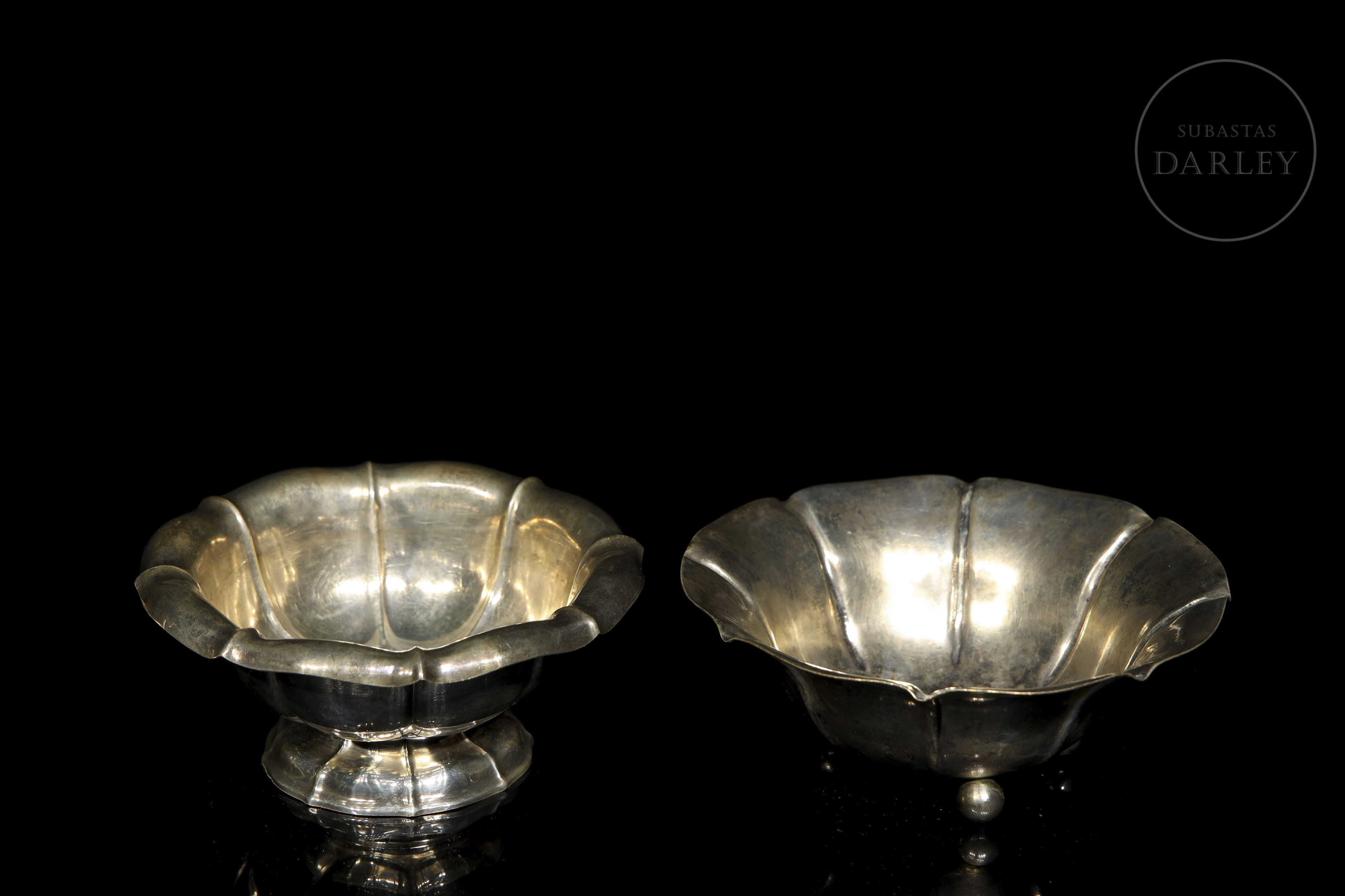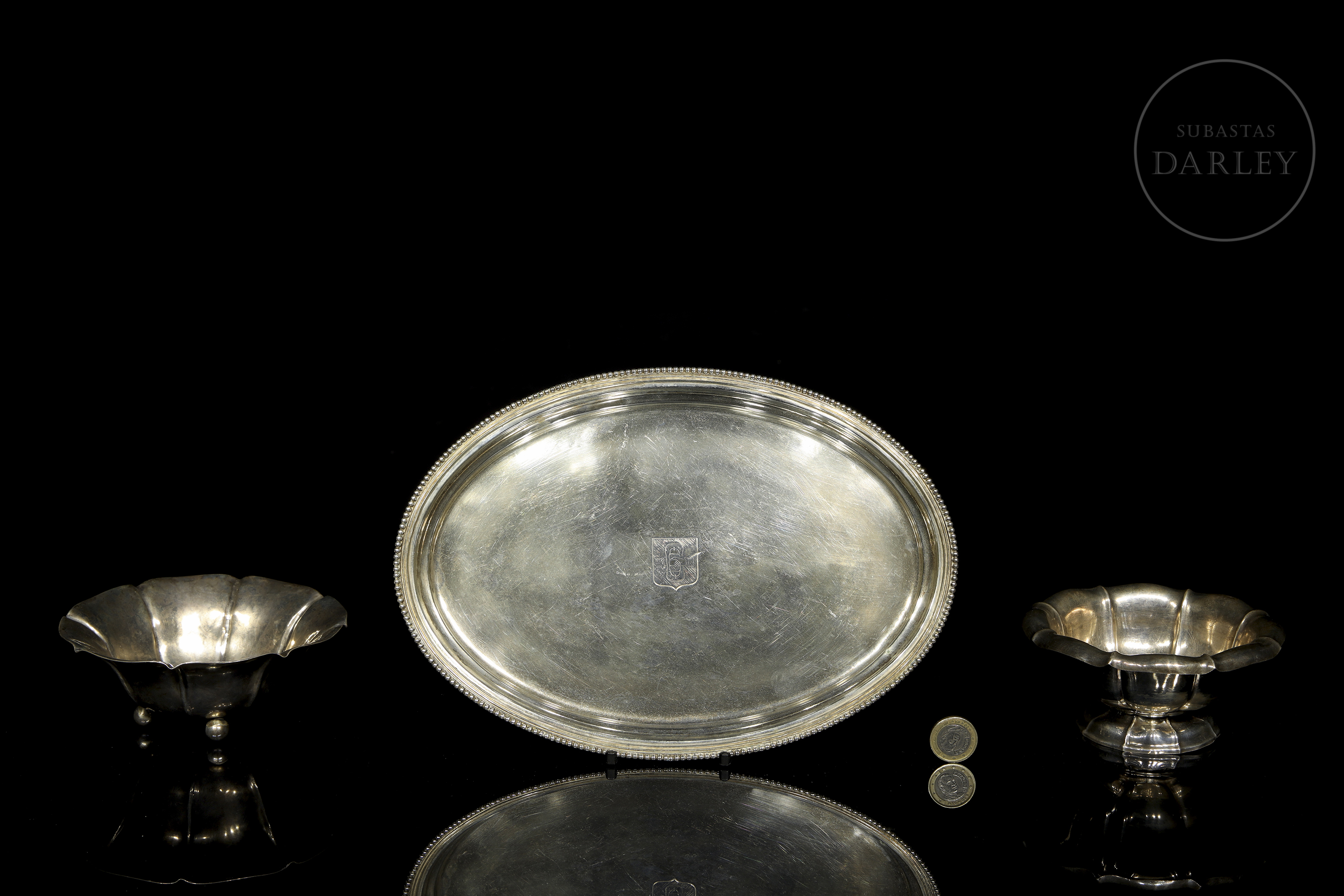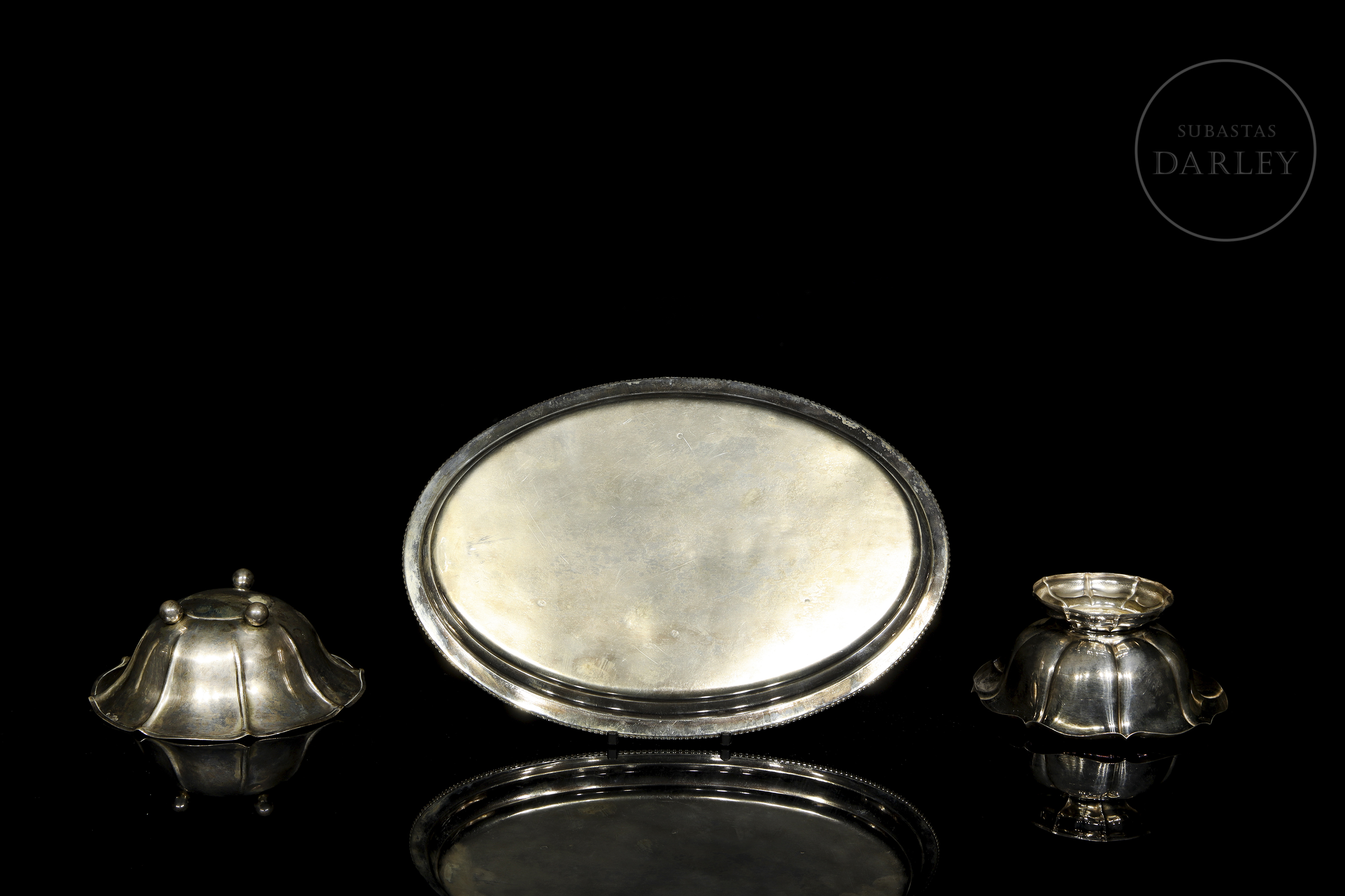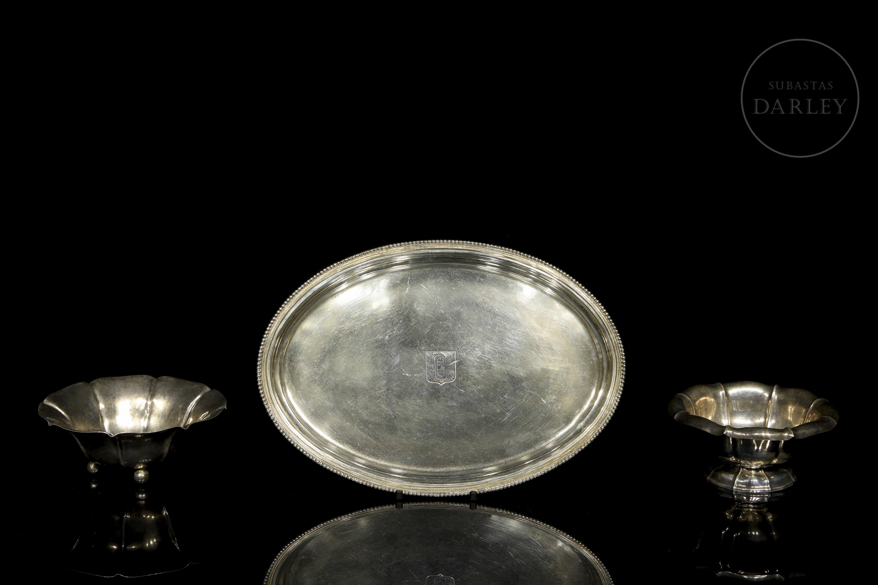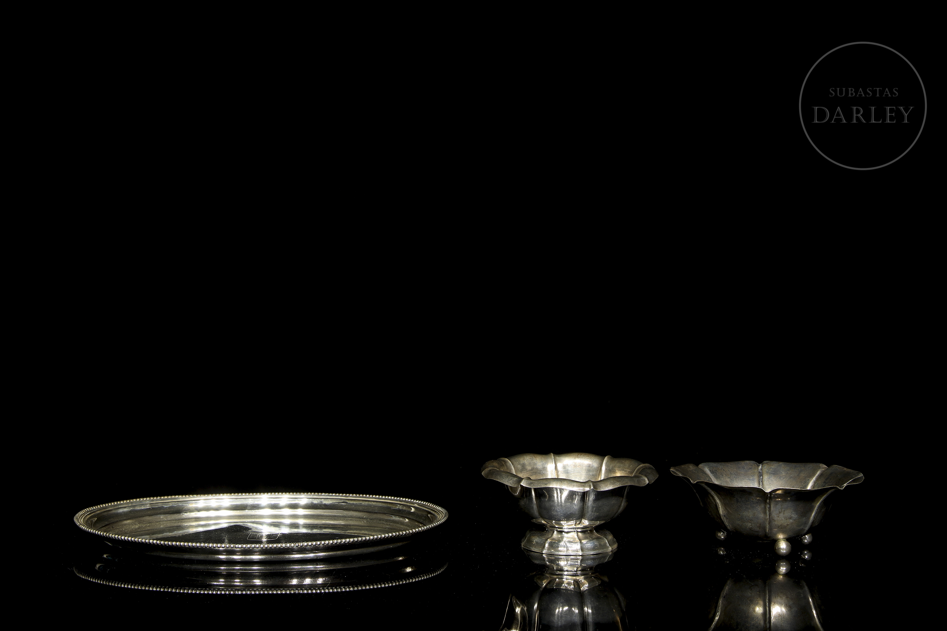 一套银器,包括一个椭圆形托盘和两个小碗。所有器皿底部均有银器标记。