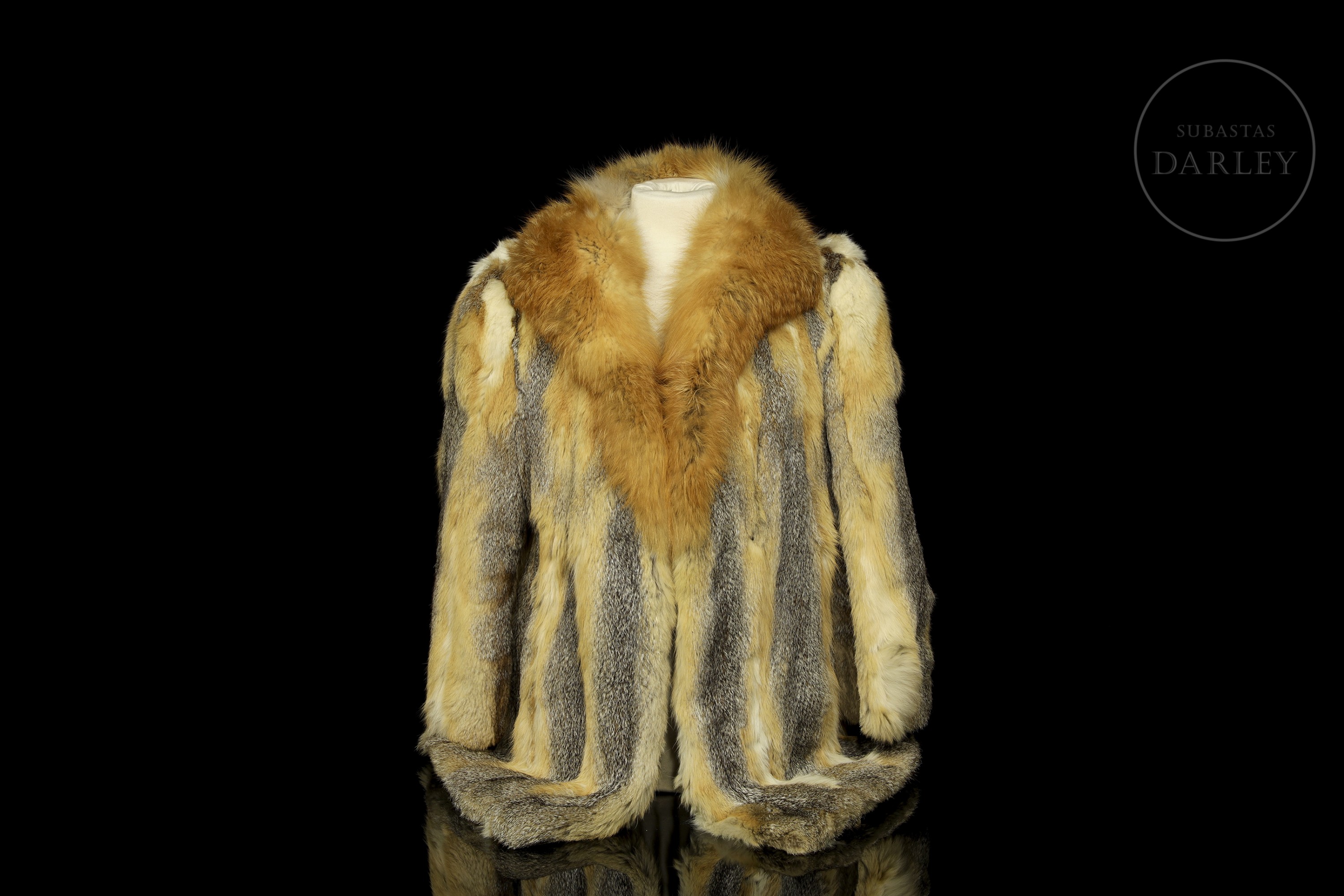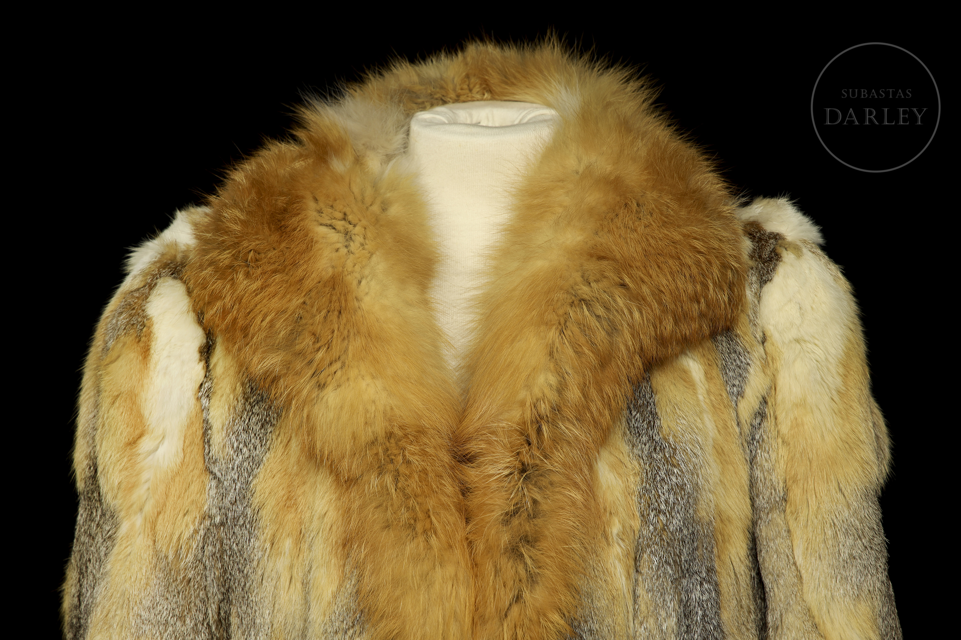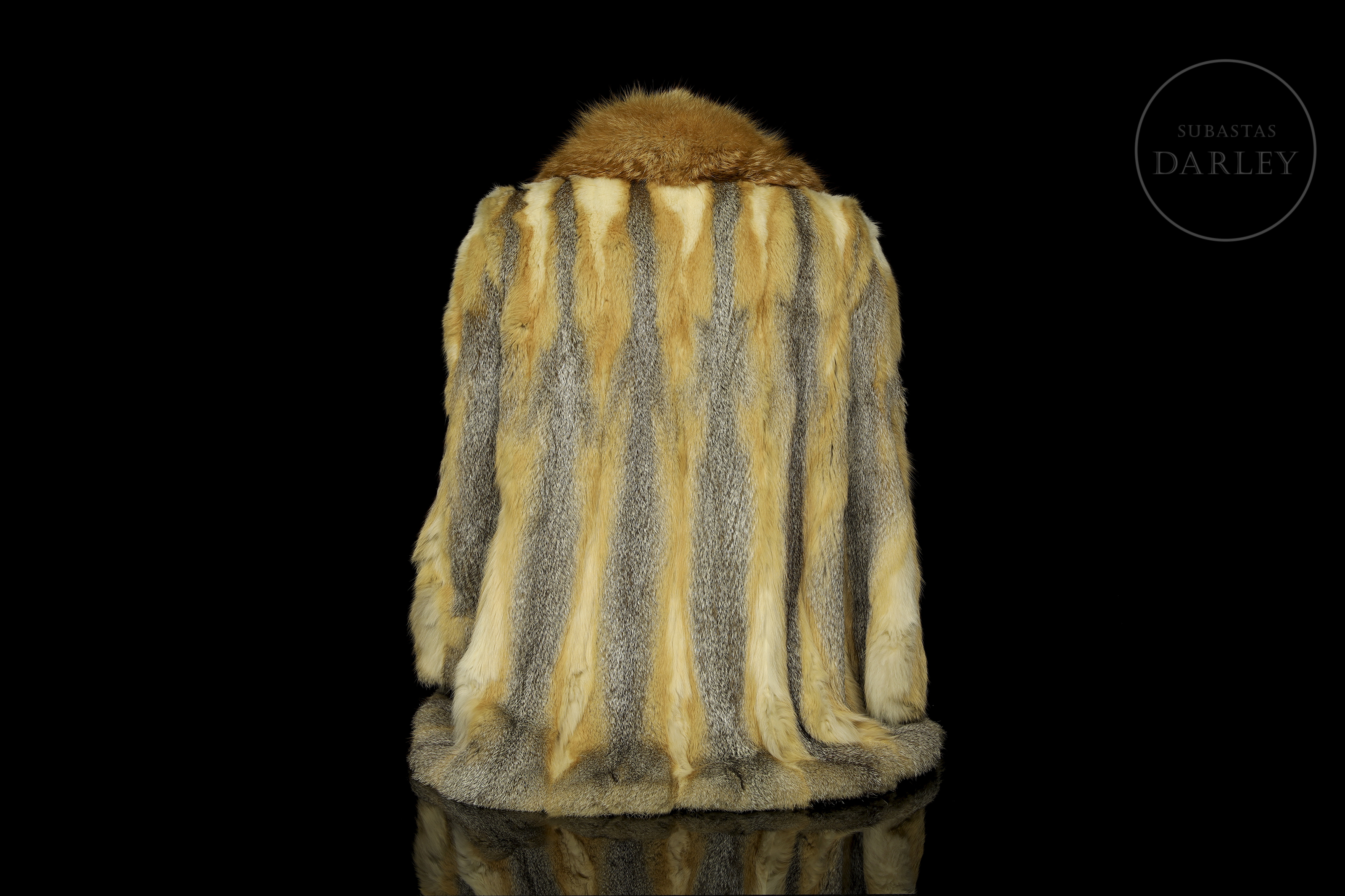 Short coat with collar. Features alternating reddish tones with silvered ridges.