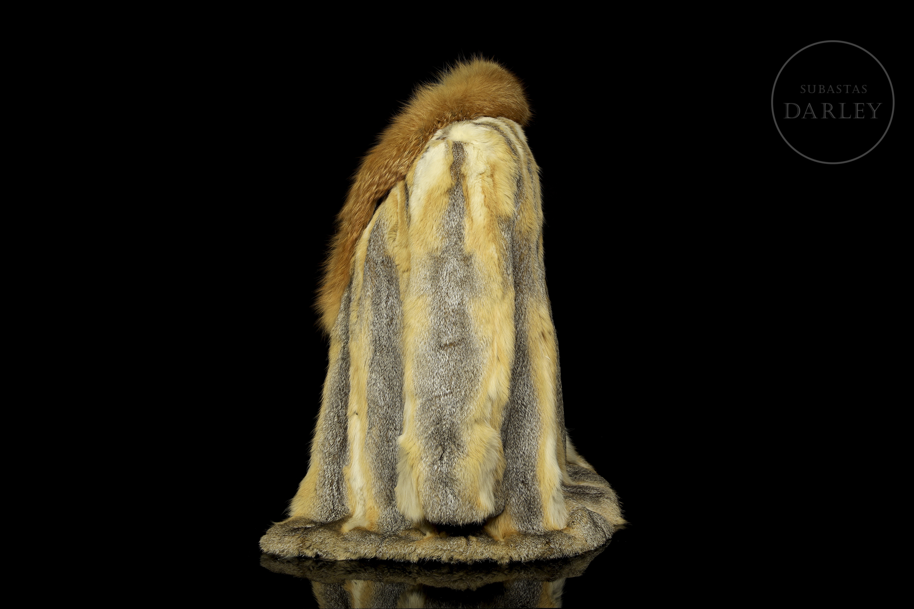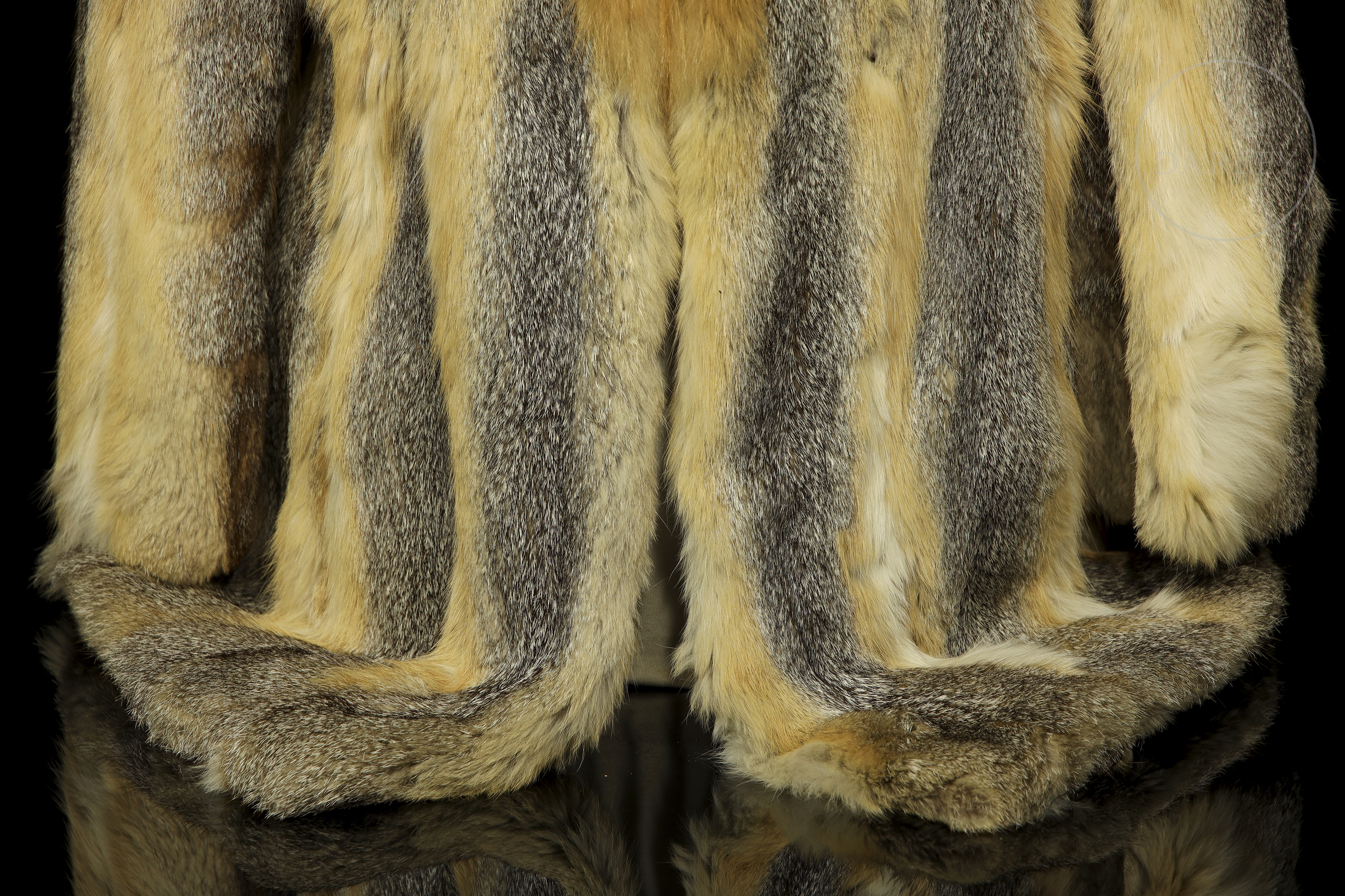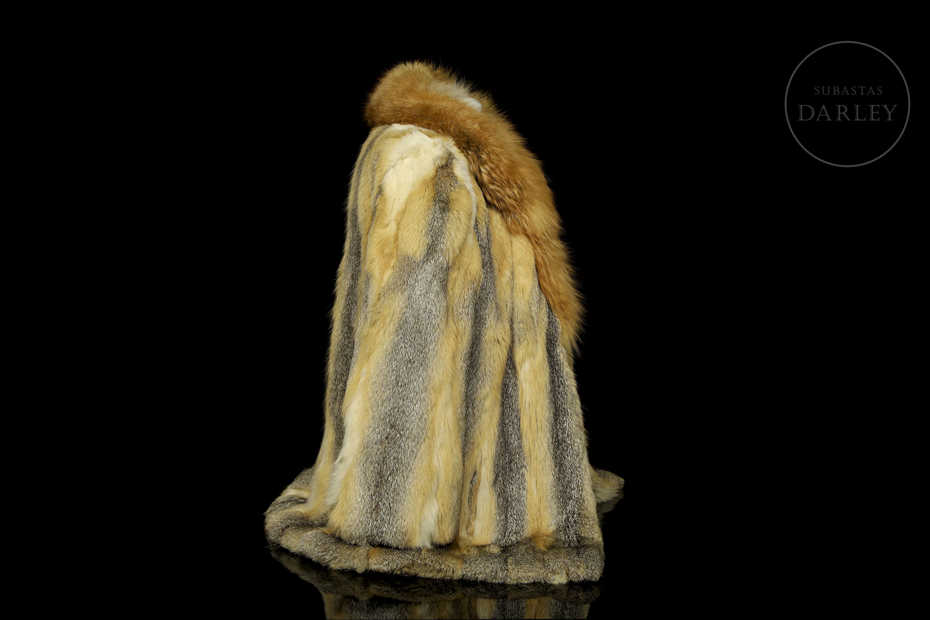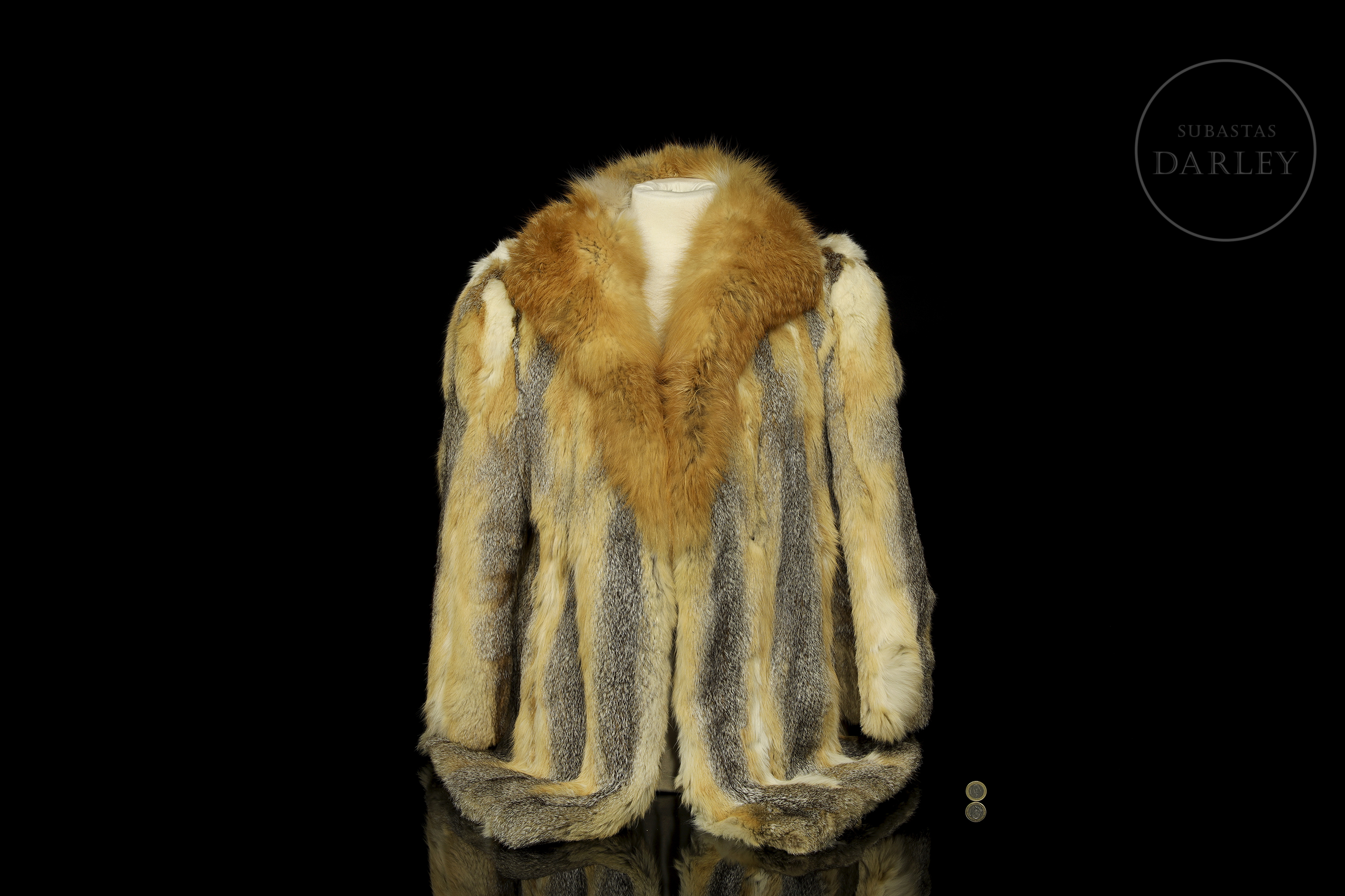 Short coat with collar. Features alternating reddish tones with silvered ridges.