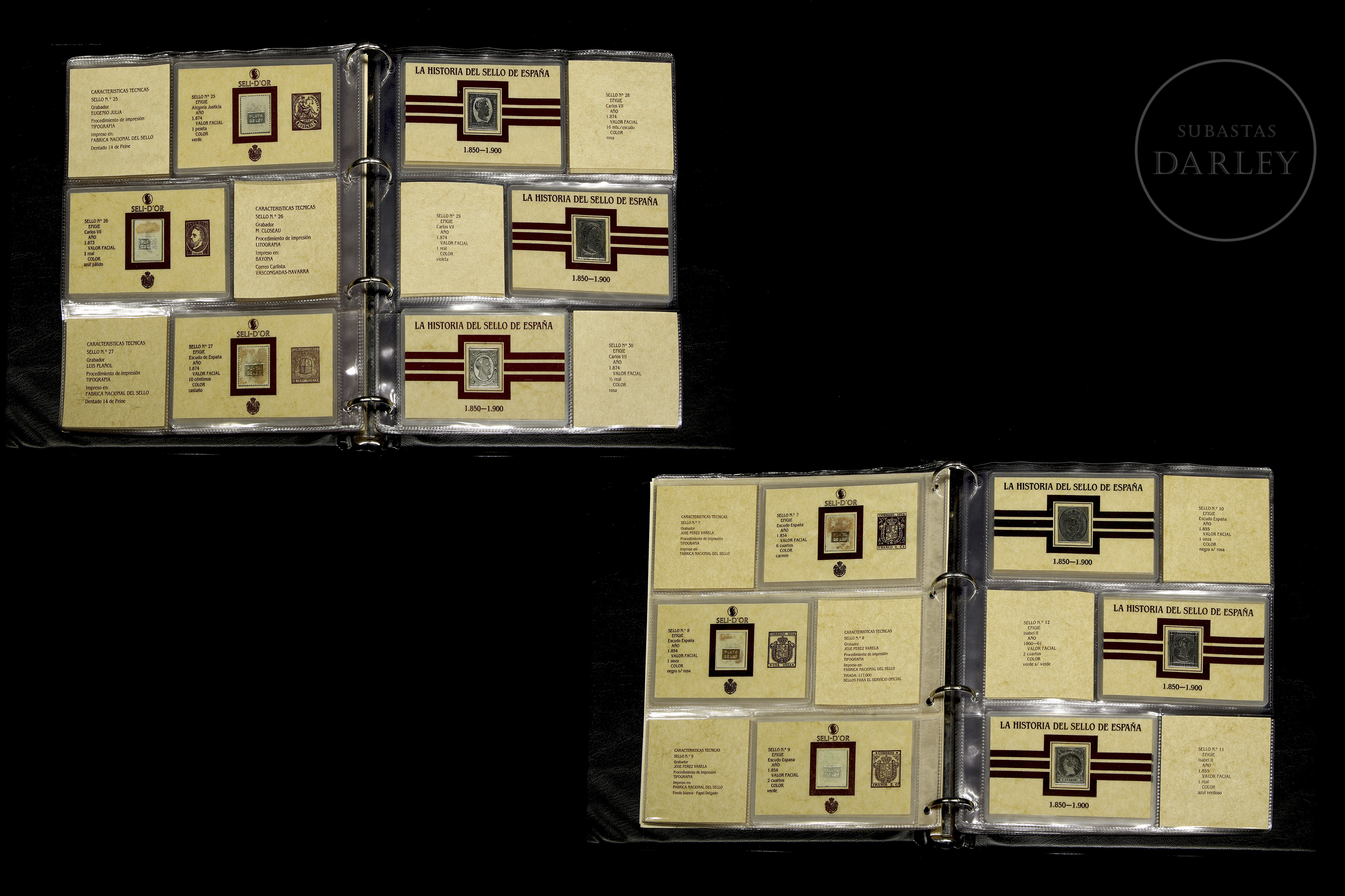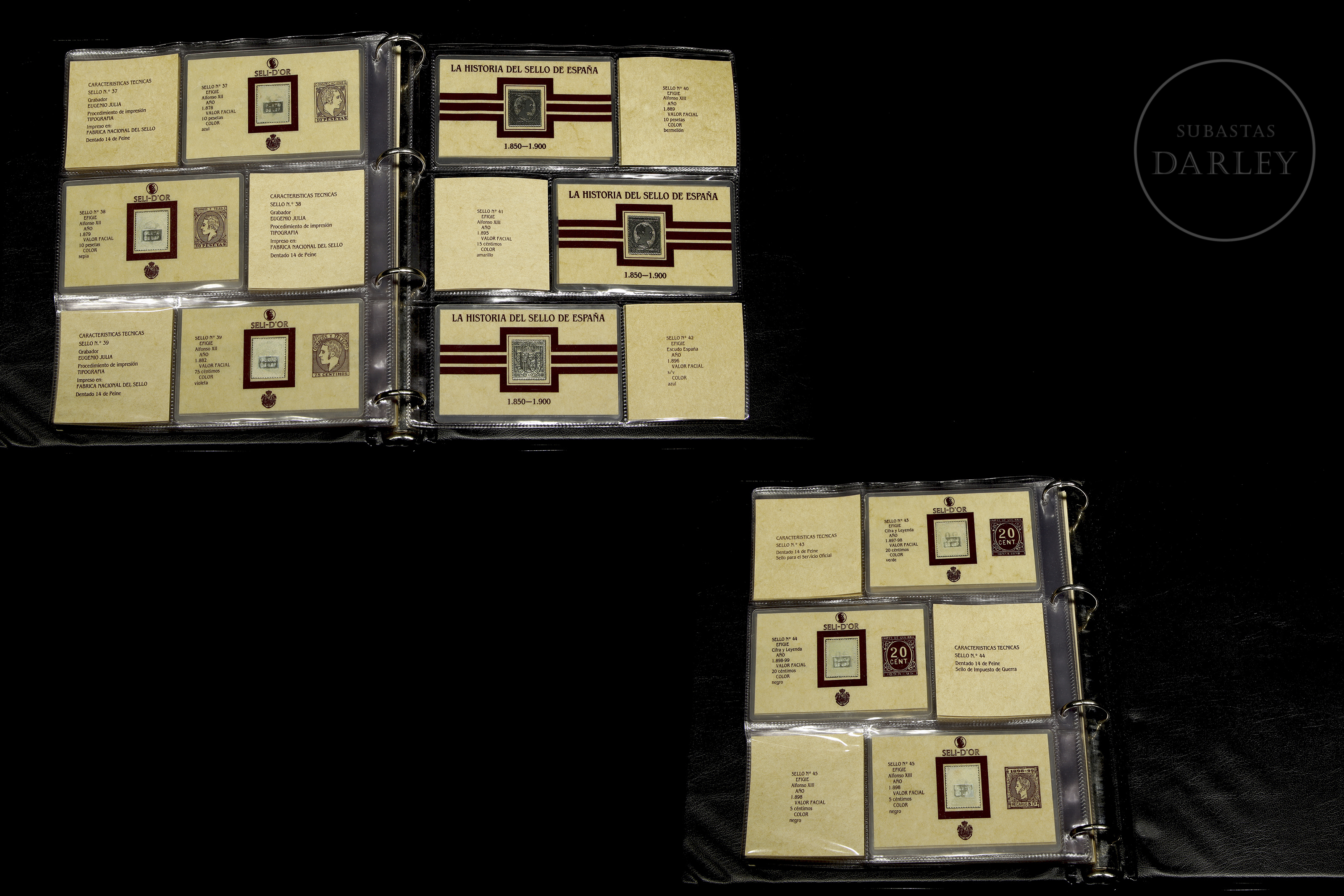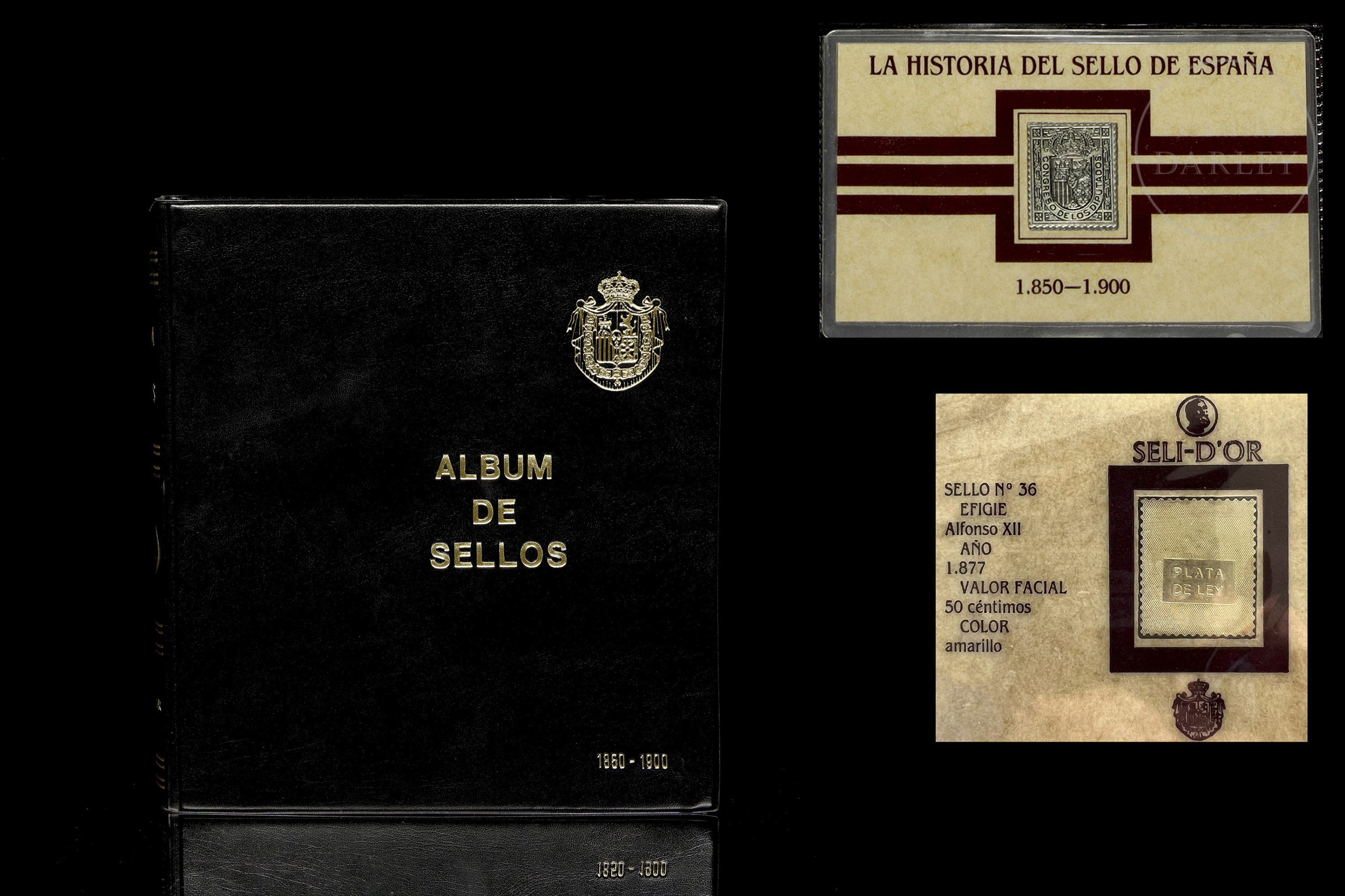 一套45枚西班牙历史邮票复刻品(1850-1900年),采用银质浮雕工艺。涵盖伊莎贝尔二世、阿马德奥一世、卡洛斯七世、阿方索十二世等时期。部分邮票因年代久远略有氧化。精装相册内含说明卡。