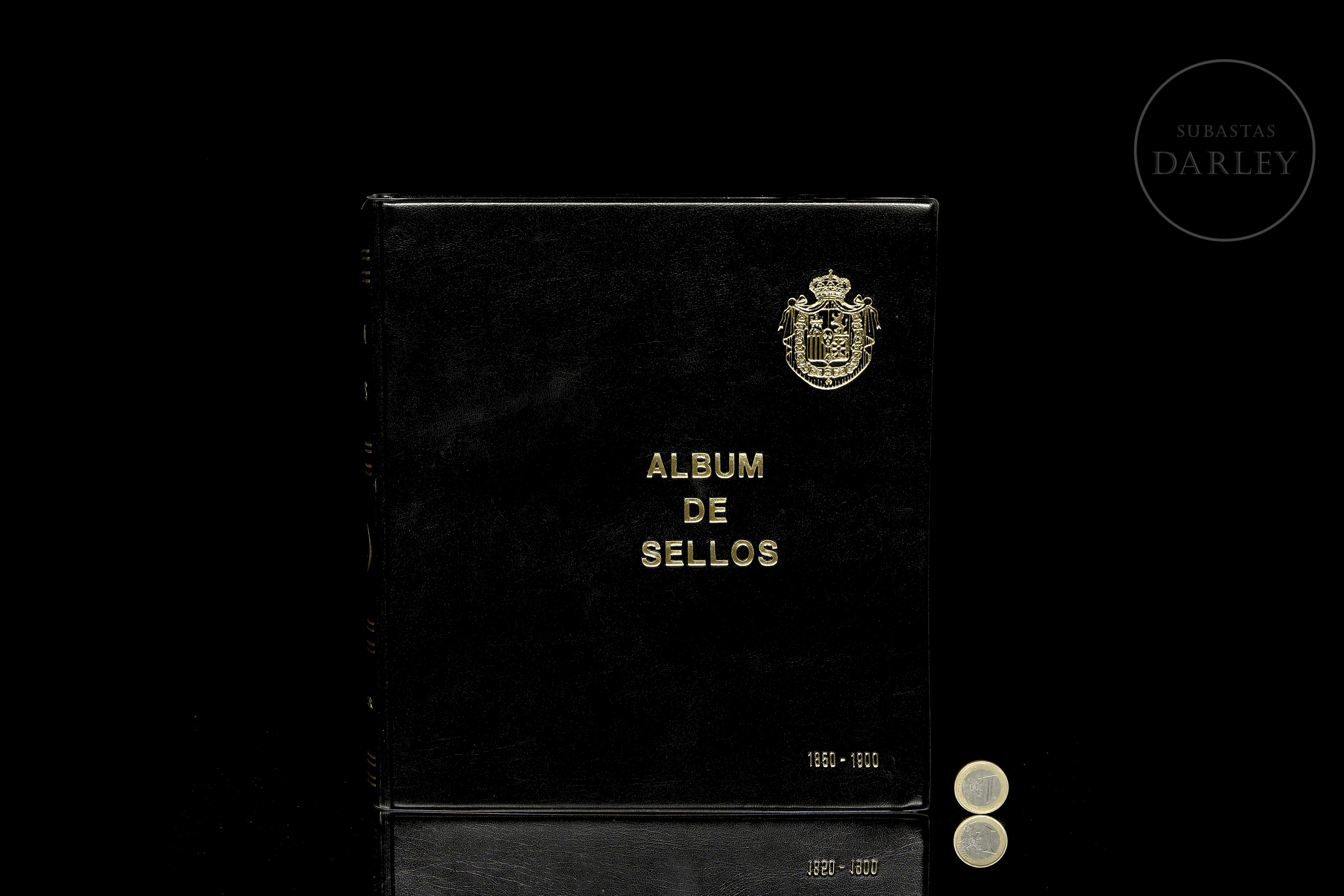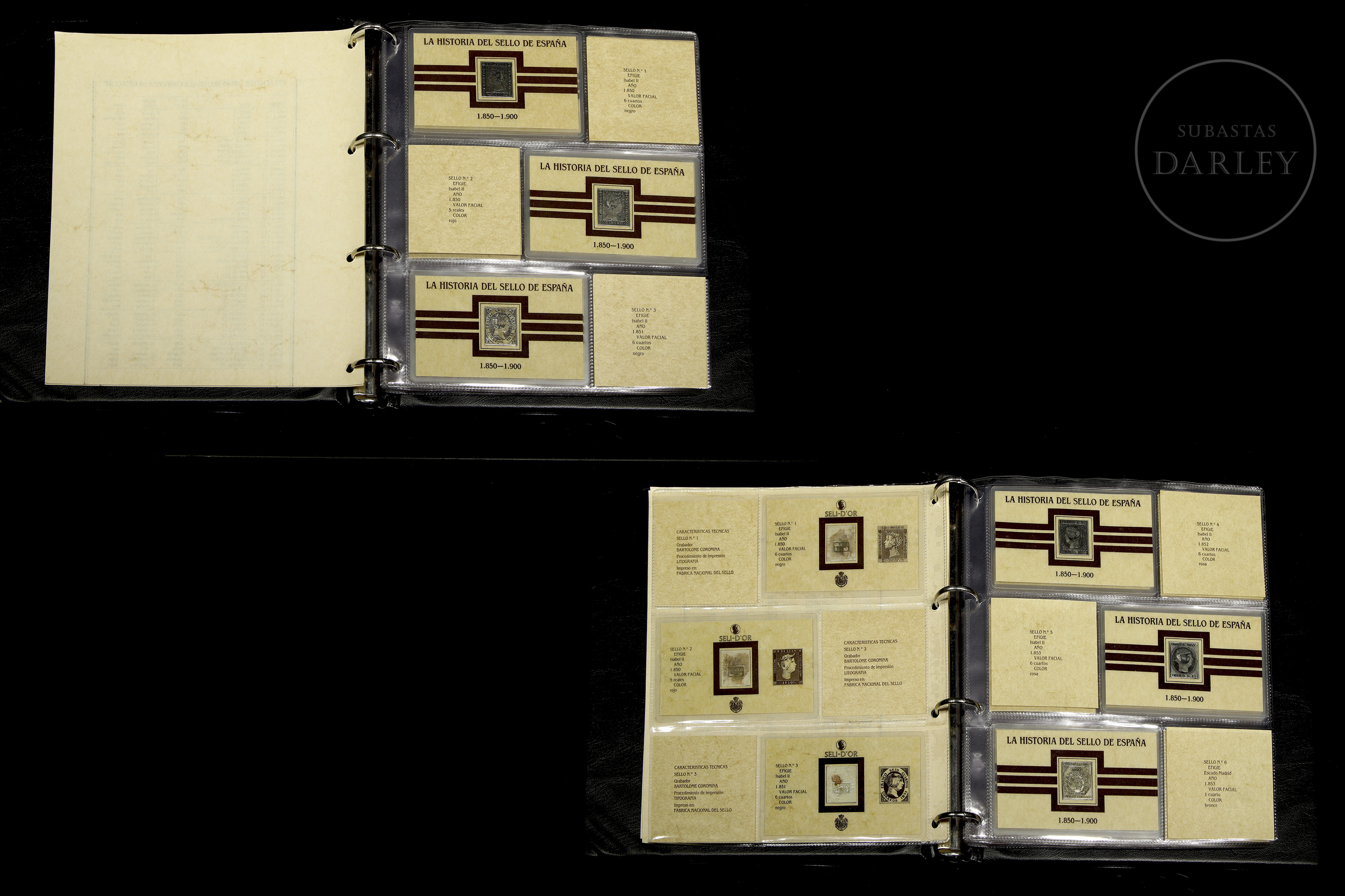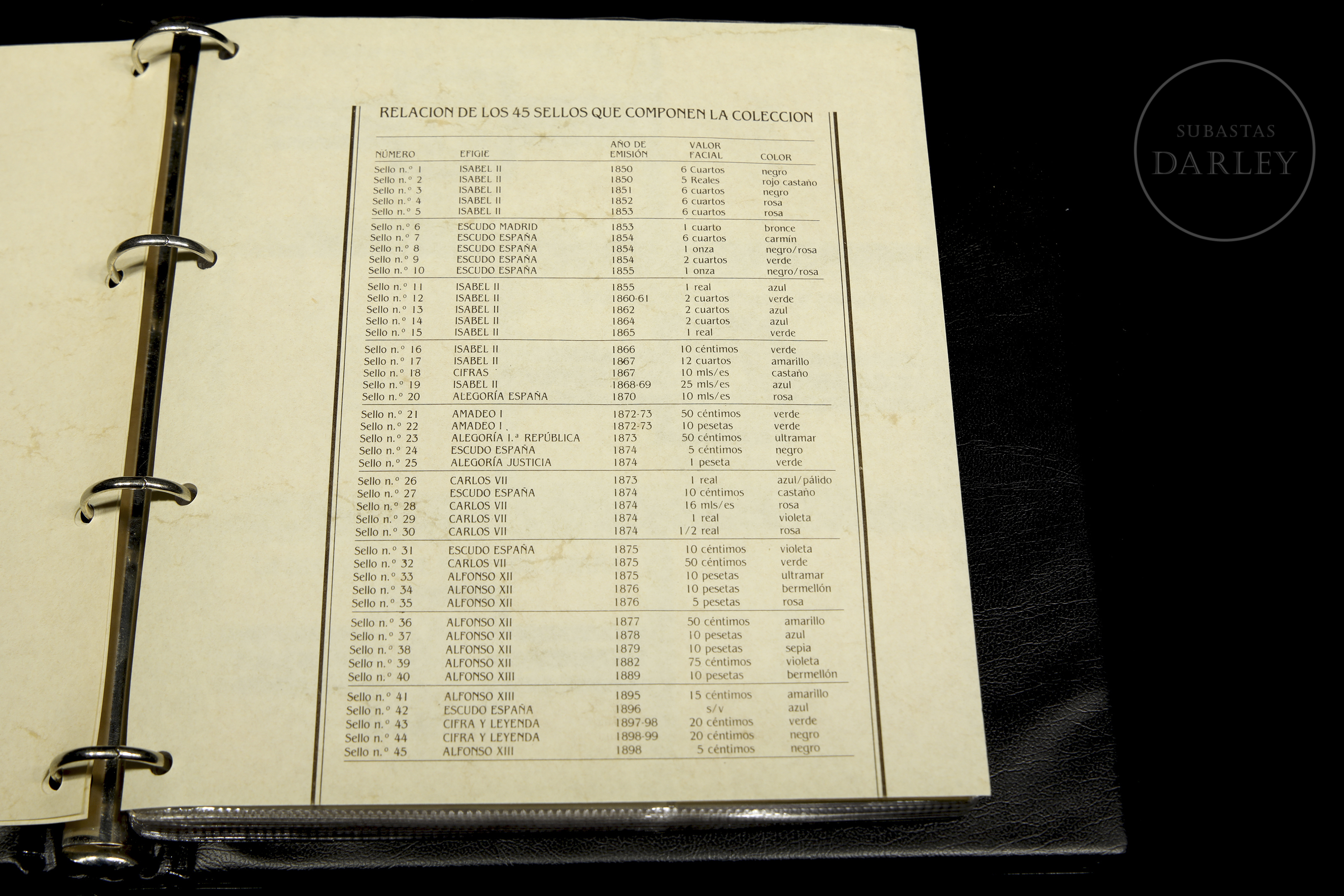 一套45枚西班牙历史邮票复刻品(1850-1900年),采用银质浮雕工艺。涵盖伊莎贝尔二世、阿马德奥一世、卡洛斯七世、阿方索十二世等时期。部分邮票因年代久远略有氧化。精装相册内含说明卡。