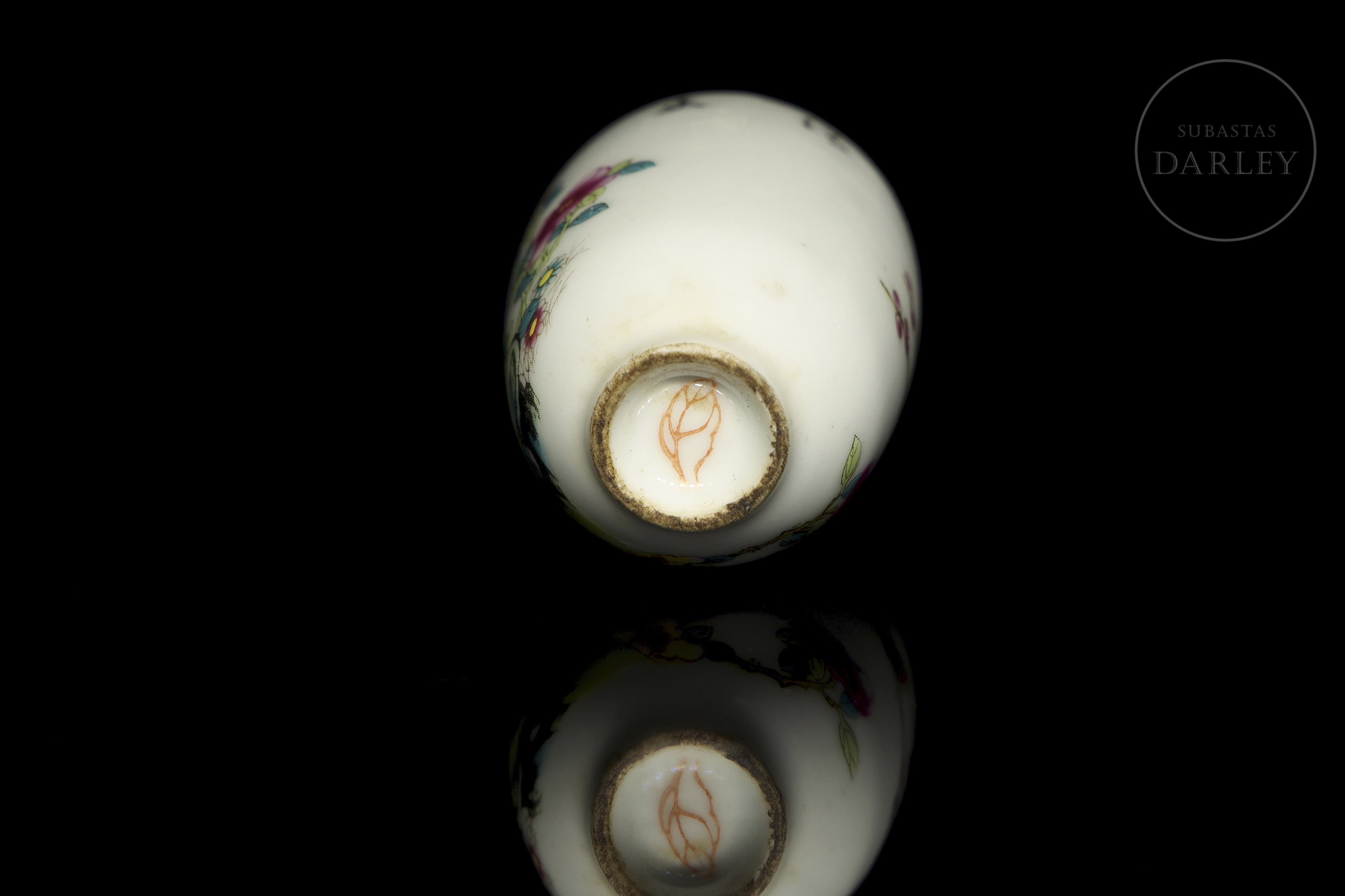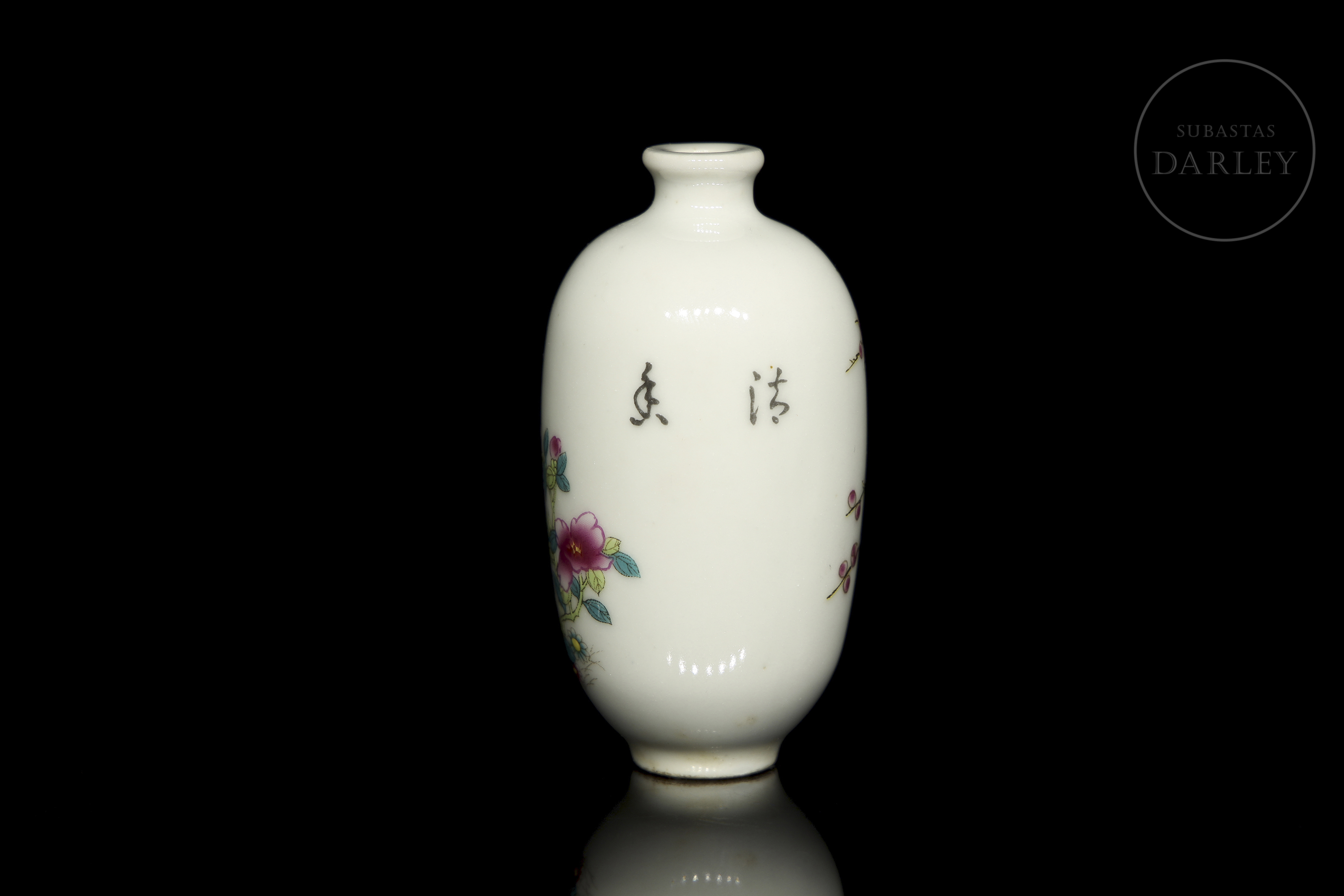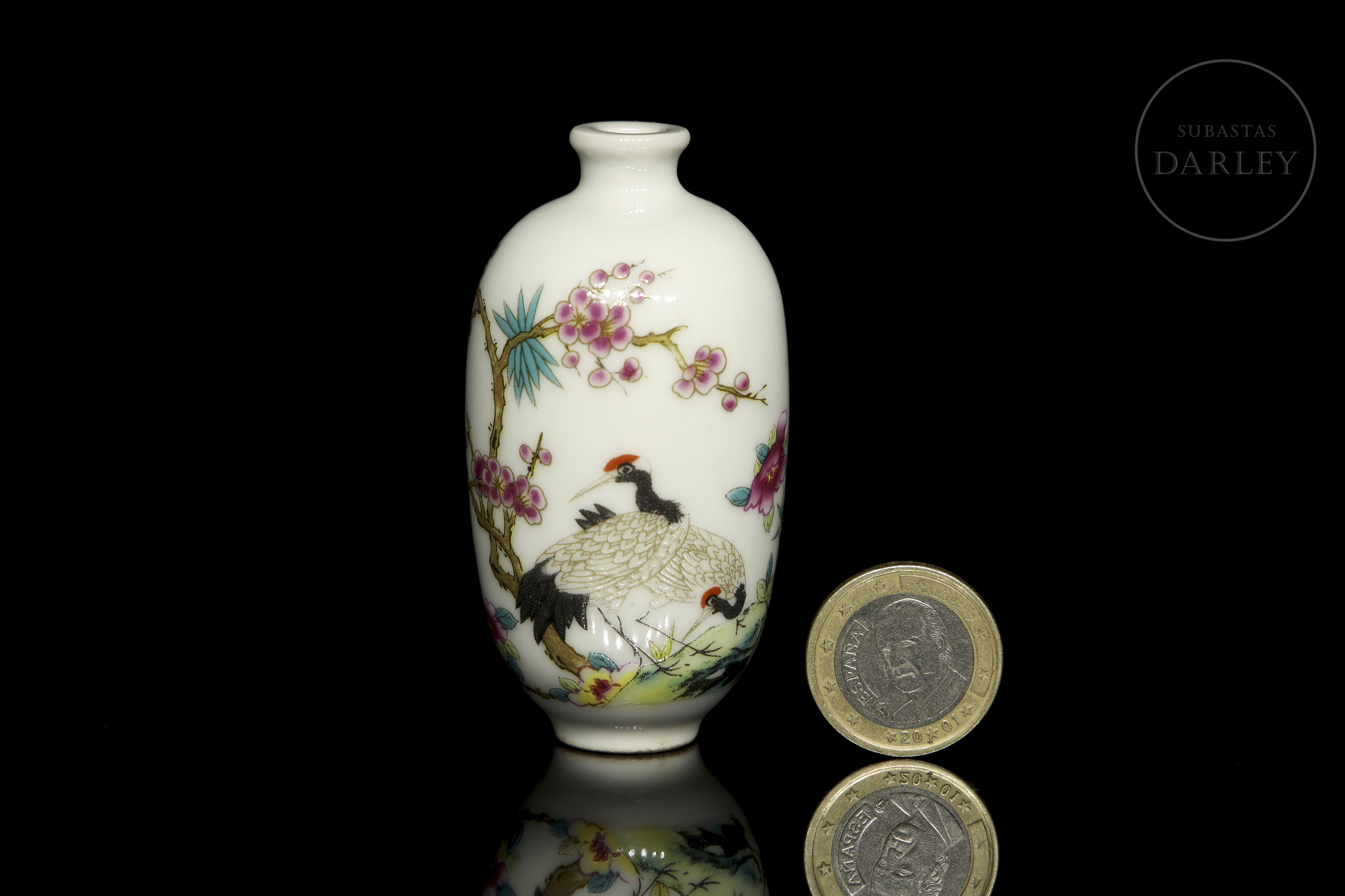 Small ovoid porcelain bottle with a short neck. It features a scene painted in polychrome enamel depicting cranes under a plum blossom tree, with peonies, bamboo and other plants. On the reverse side are two calligraphic characters. The base bears a red underglaze mark.