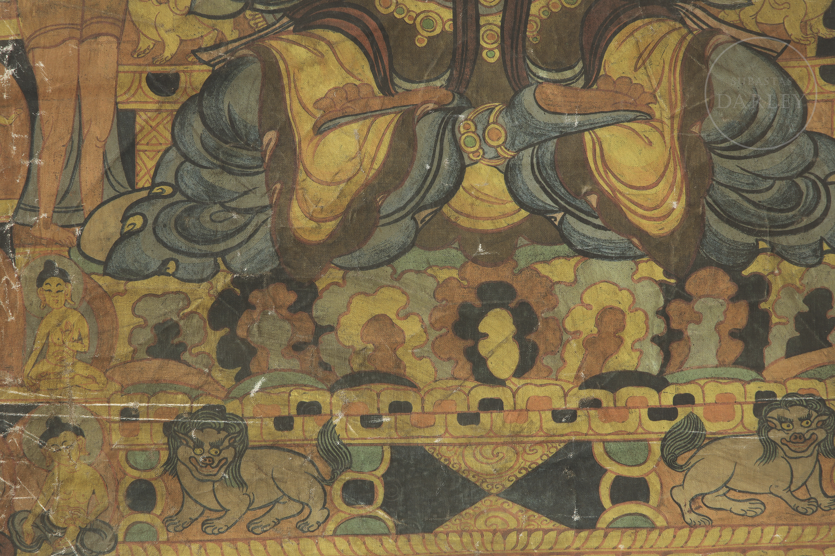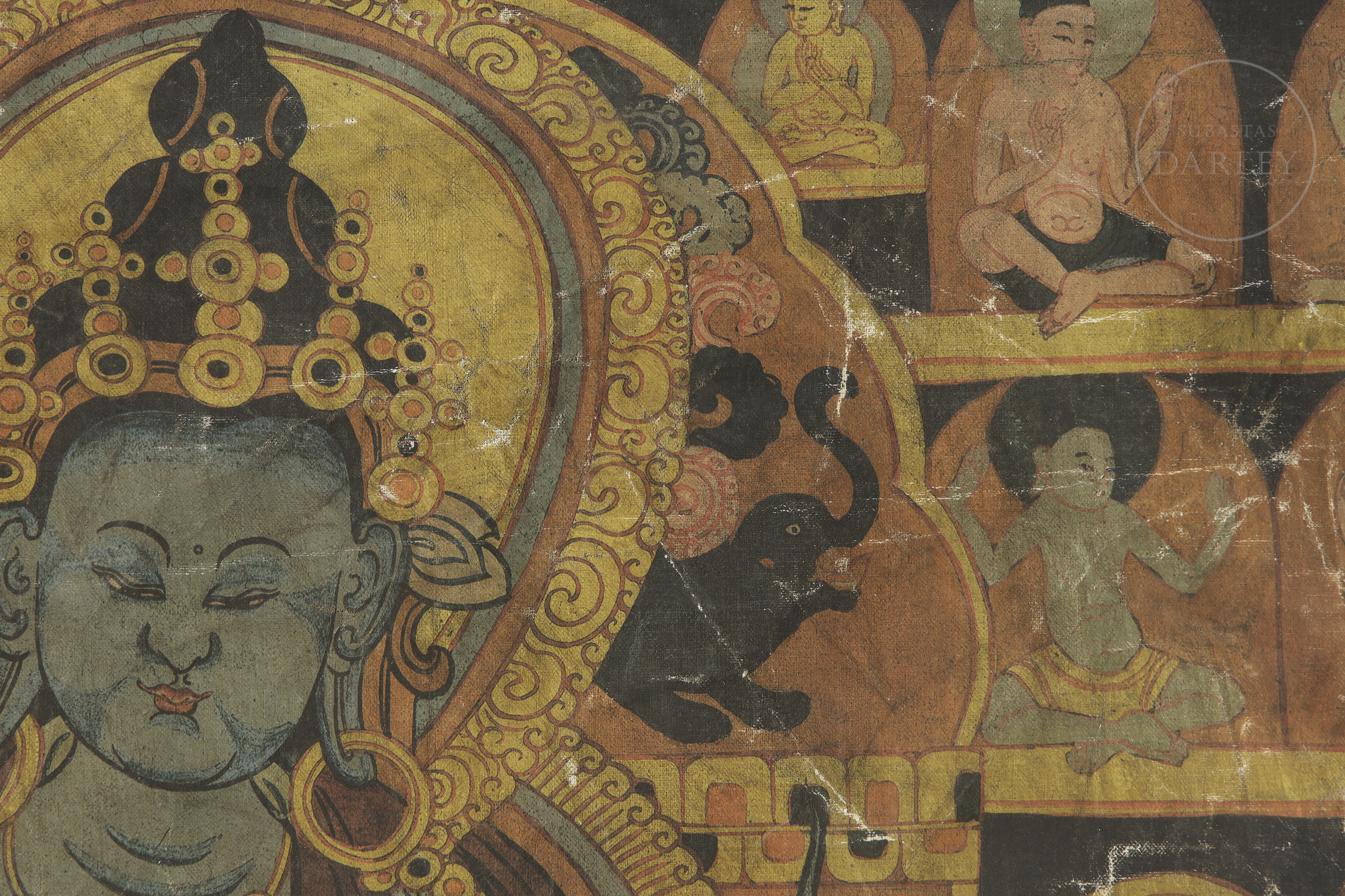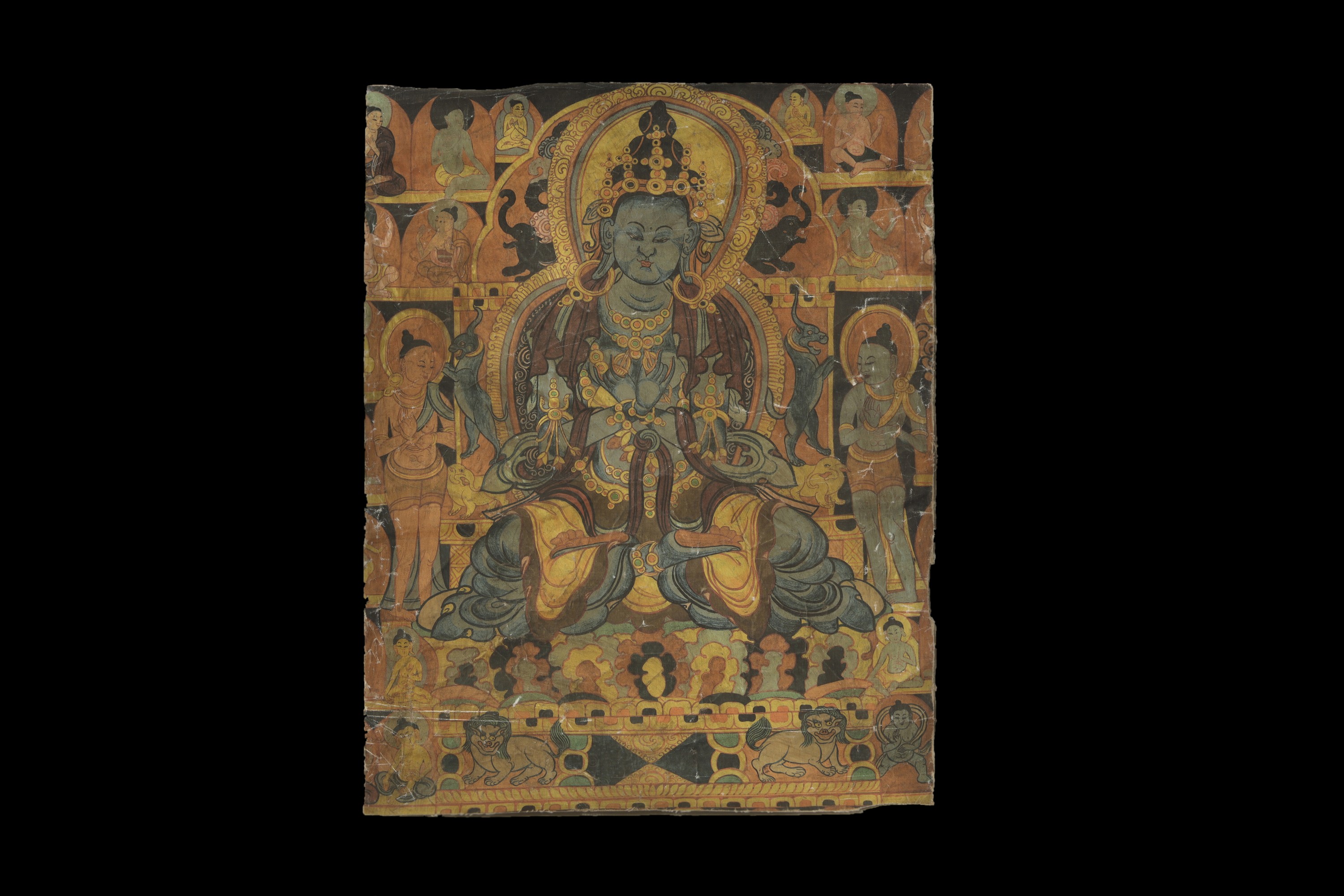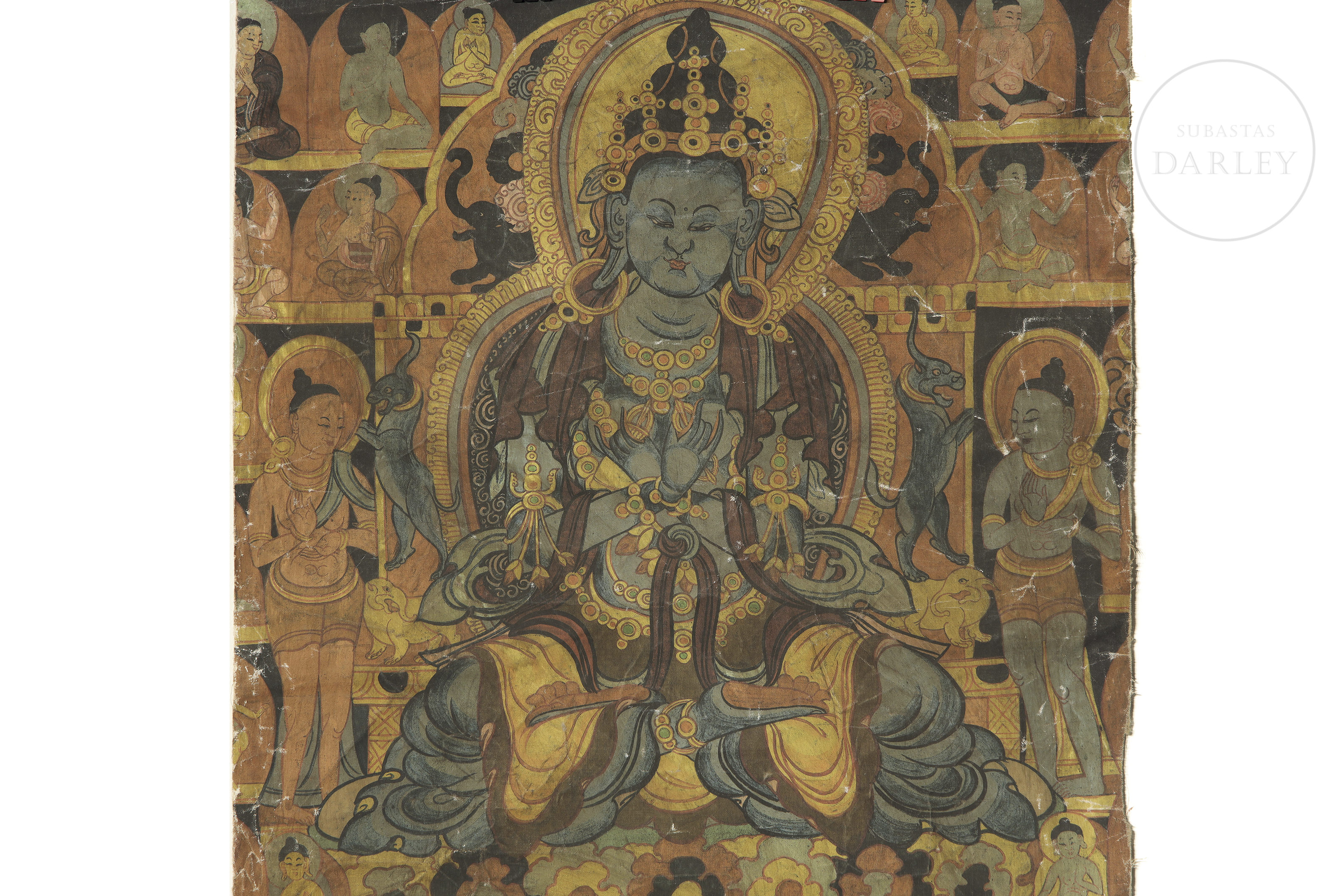 Painting on canvas depicting Vajradhara. The deity, with blue skin, appears seated in the lotus position on a throne of petals, surrounded by a richly decorated halo and nimbus. He wears a crown and jewels and holds a vajra and a ghanta bell, tantric attributes, in his crossed arms. He is accompanied by bodhisattvas, teachers and practitioners, along with animals.