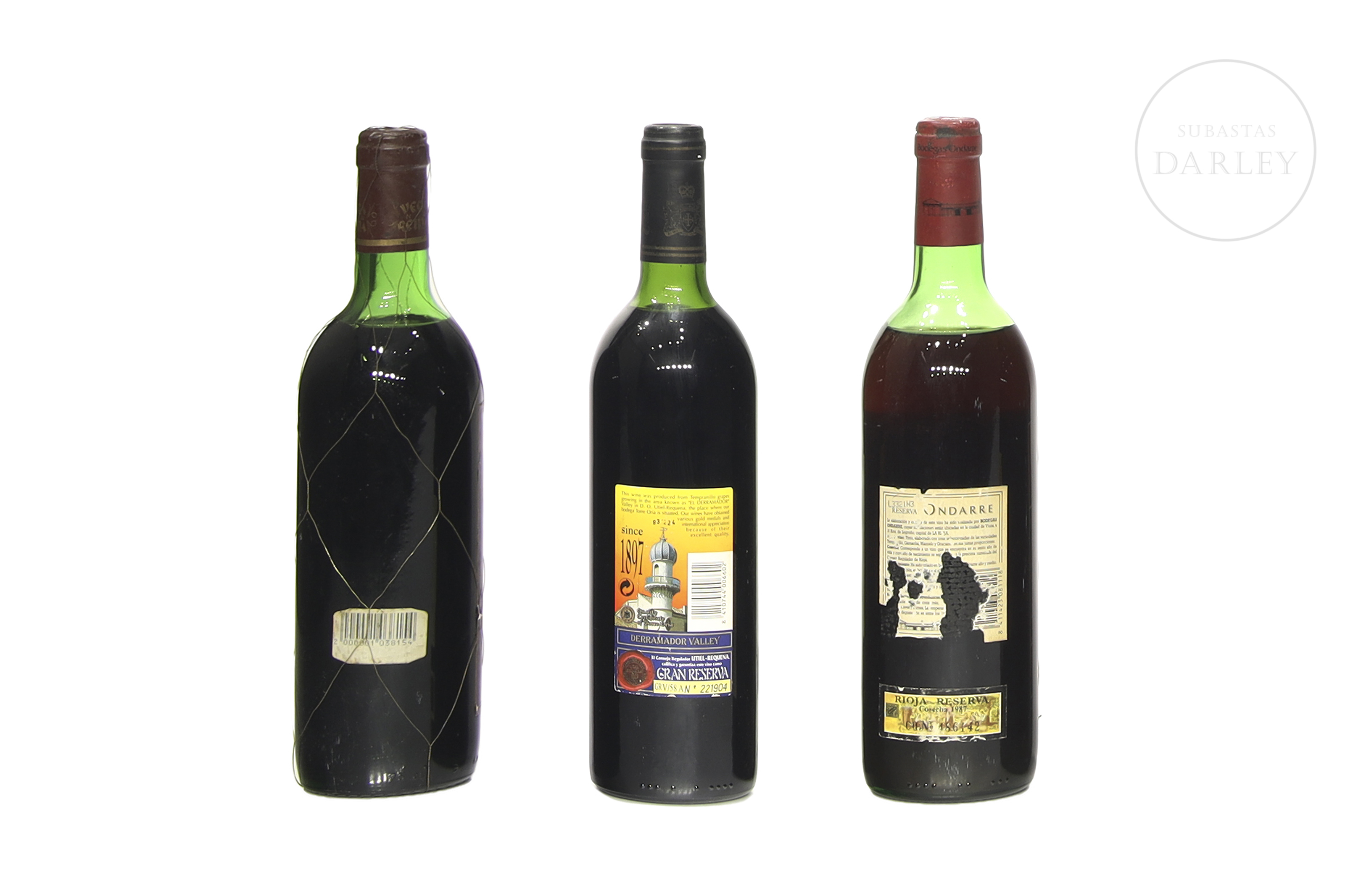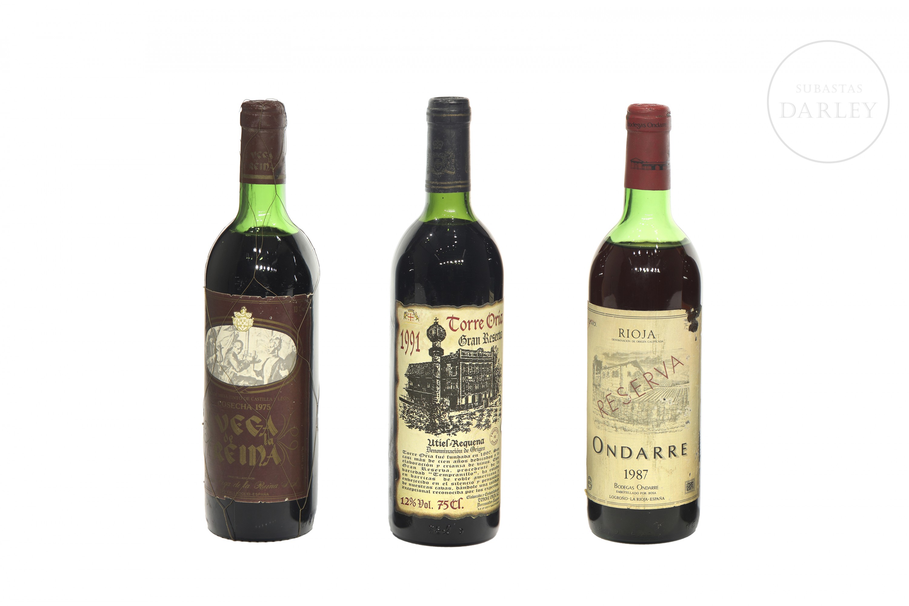 Lot consisting of three bottles of red wine from different appellations: Vega de Reina Verdejo 1975 (D.O. Rueda), Torre Oria Gran Reserva 1991 (D.O. Utiel-Requena), and Ondarre Reserva 1987 (D.O. Ca. Rioja).