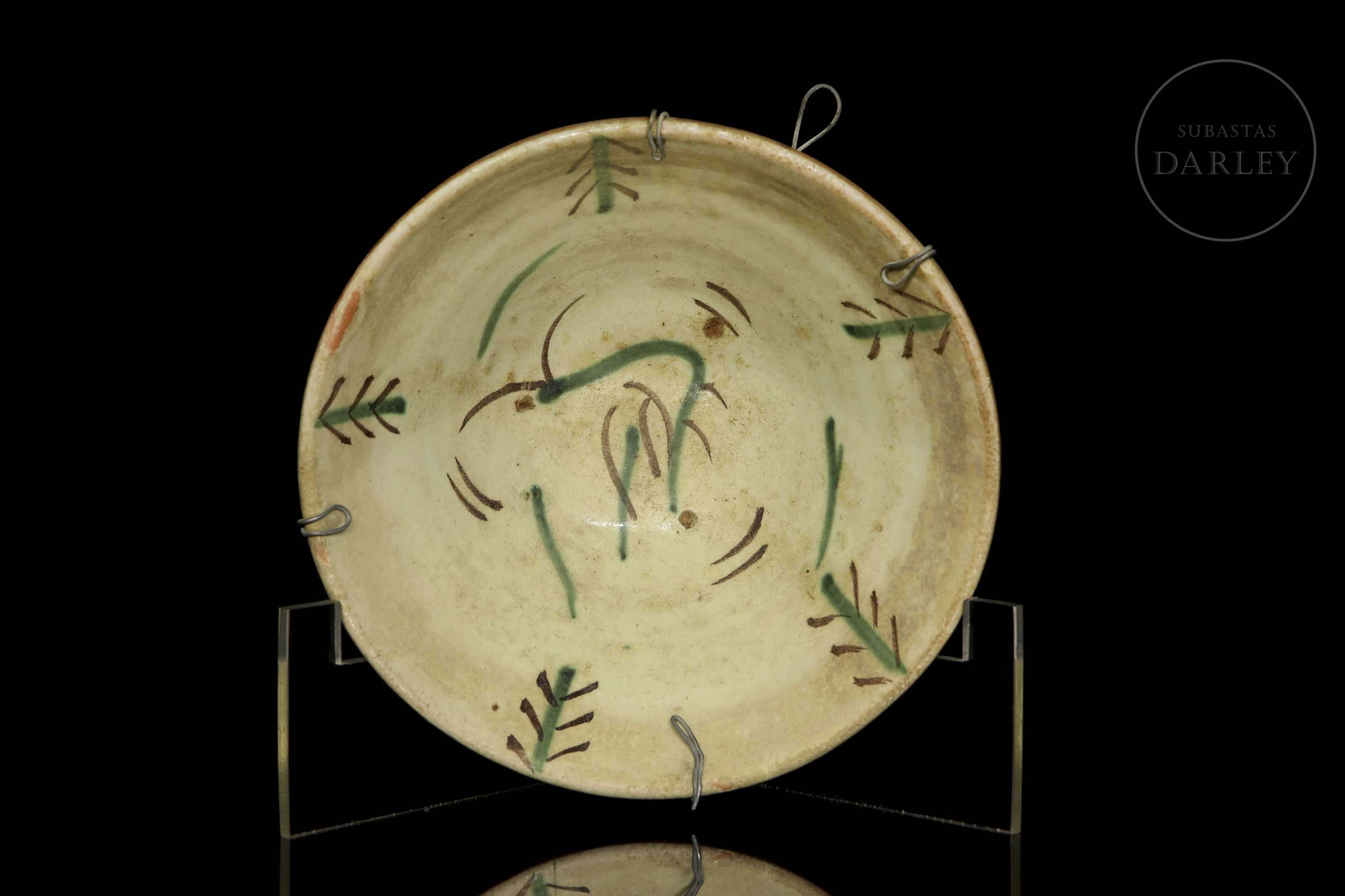 釉面陶瓷(马约利卡陶)。一套两件彩绘装饰盘及一件素面深碗。盘面饰以蓝、赭、绿三色,绘有鸟类纹样与几何网格图案。