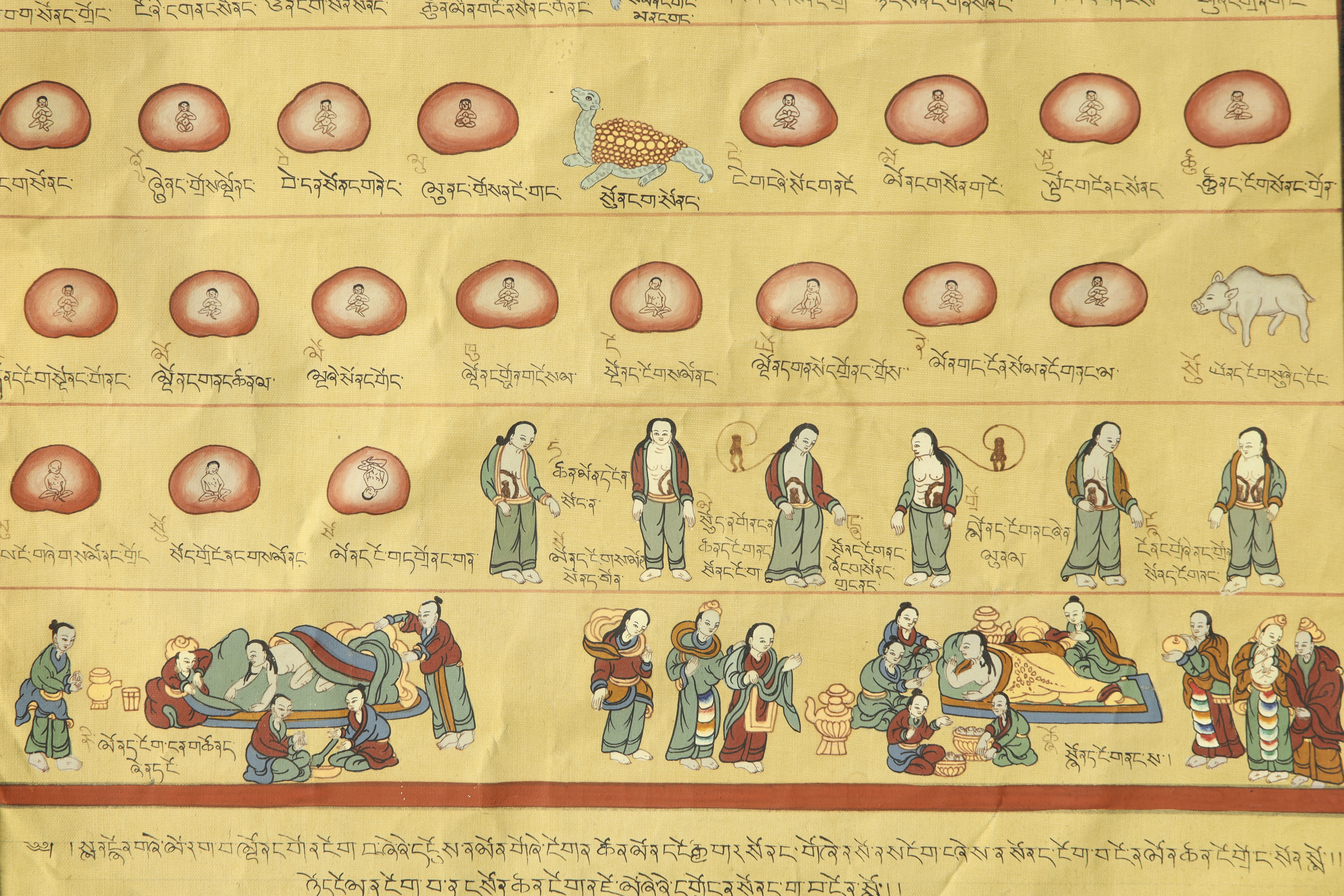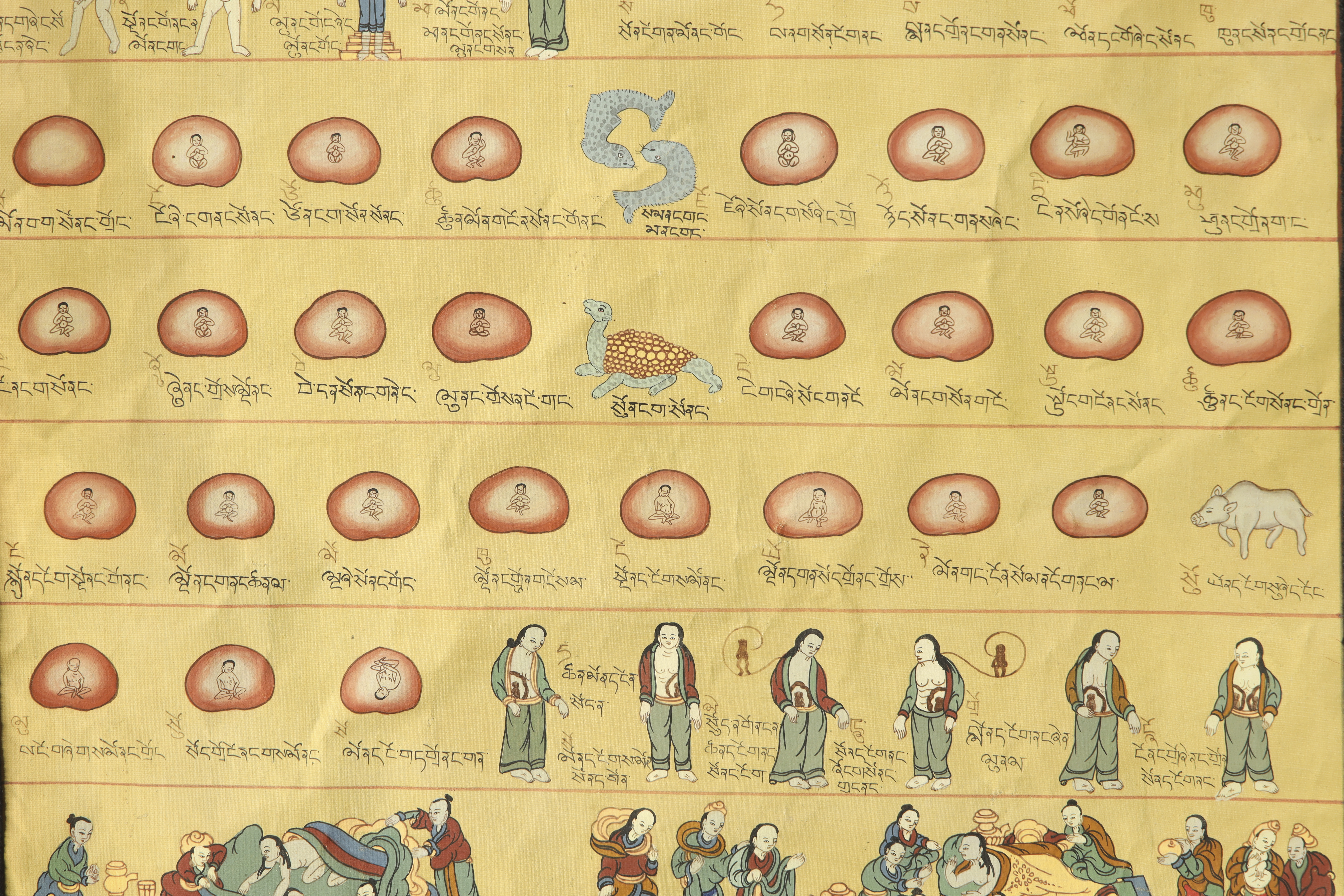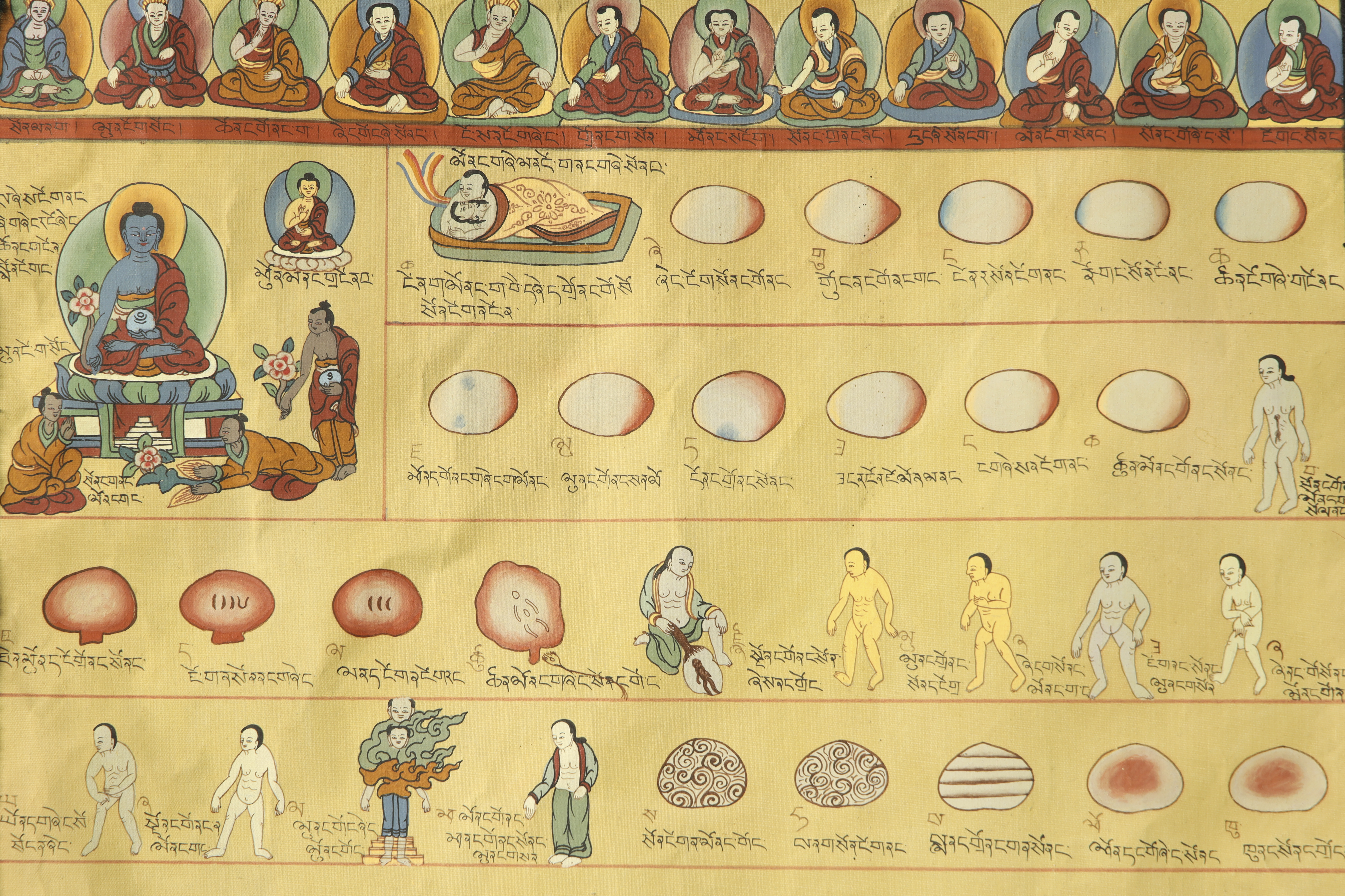 Painting made with mineral pigments on canvas, mounted on a brocade silk frame with a protective green fabric cover. The work depicts in a didactic manner the stages of conception, gestation and birth according to Tibetan medical tradition, in horizontal registers, accompanied by inscriptions and figures of teachers and protective deities at the top.