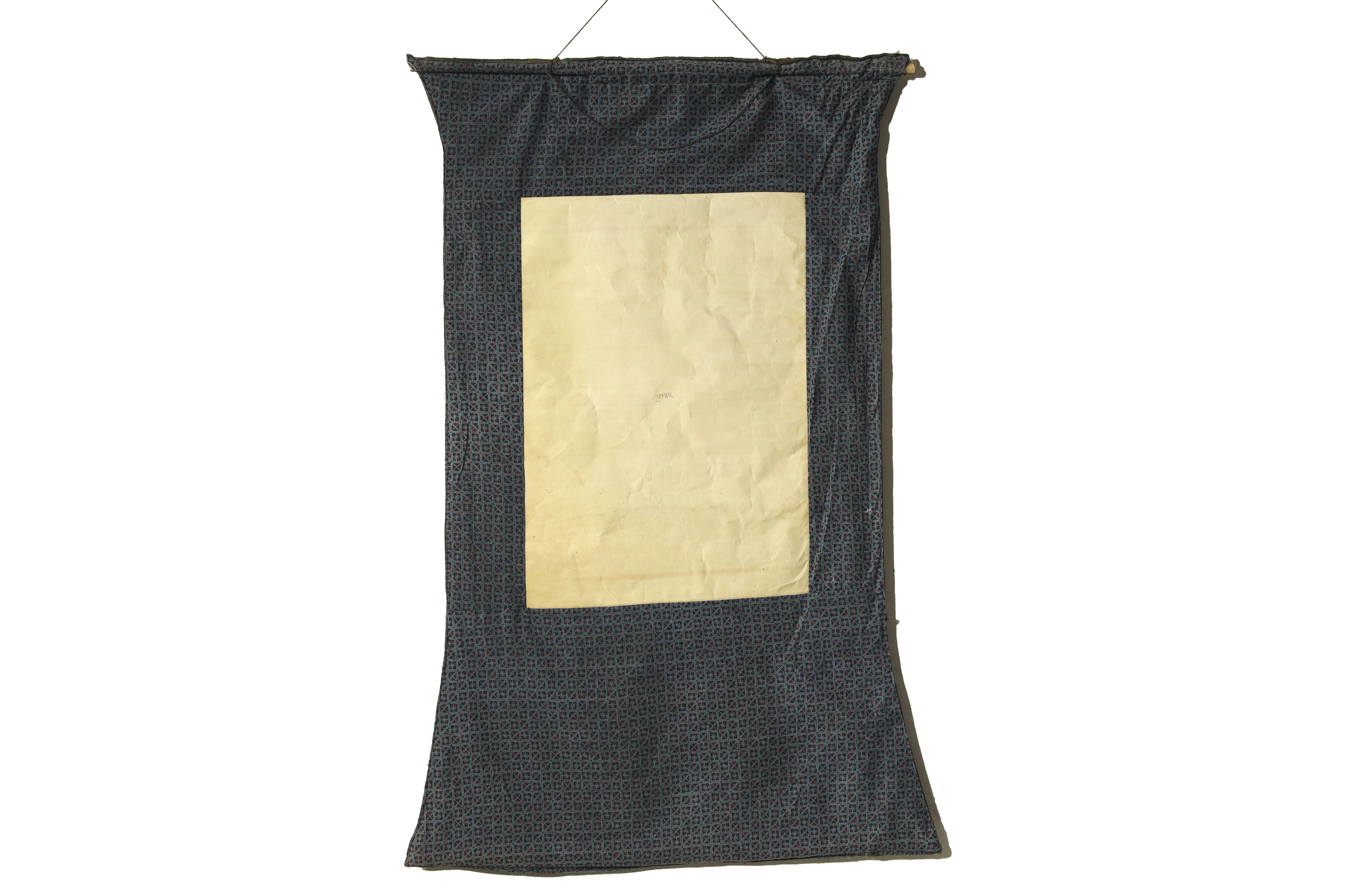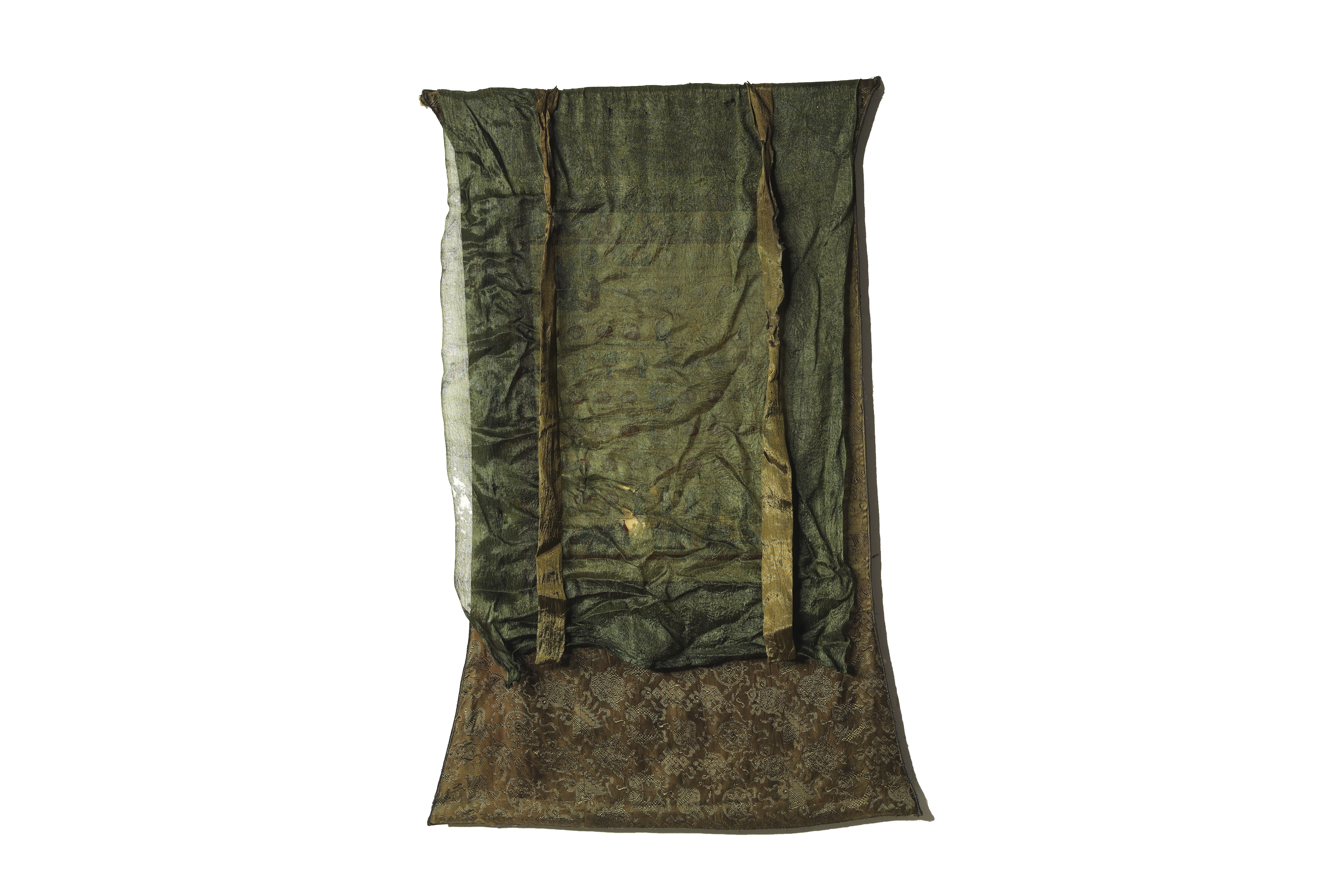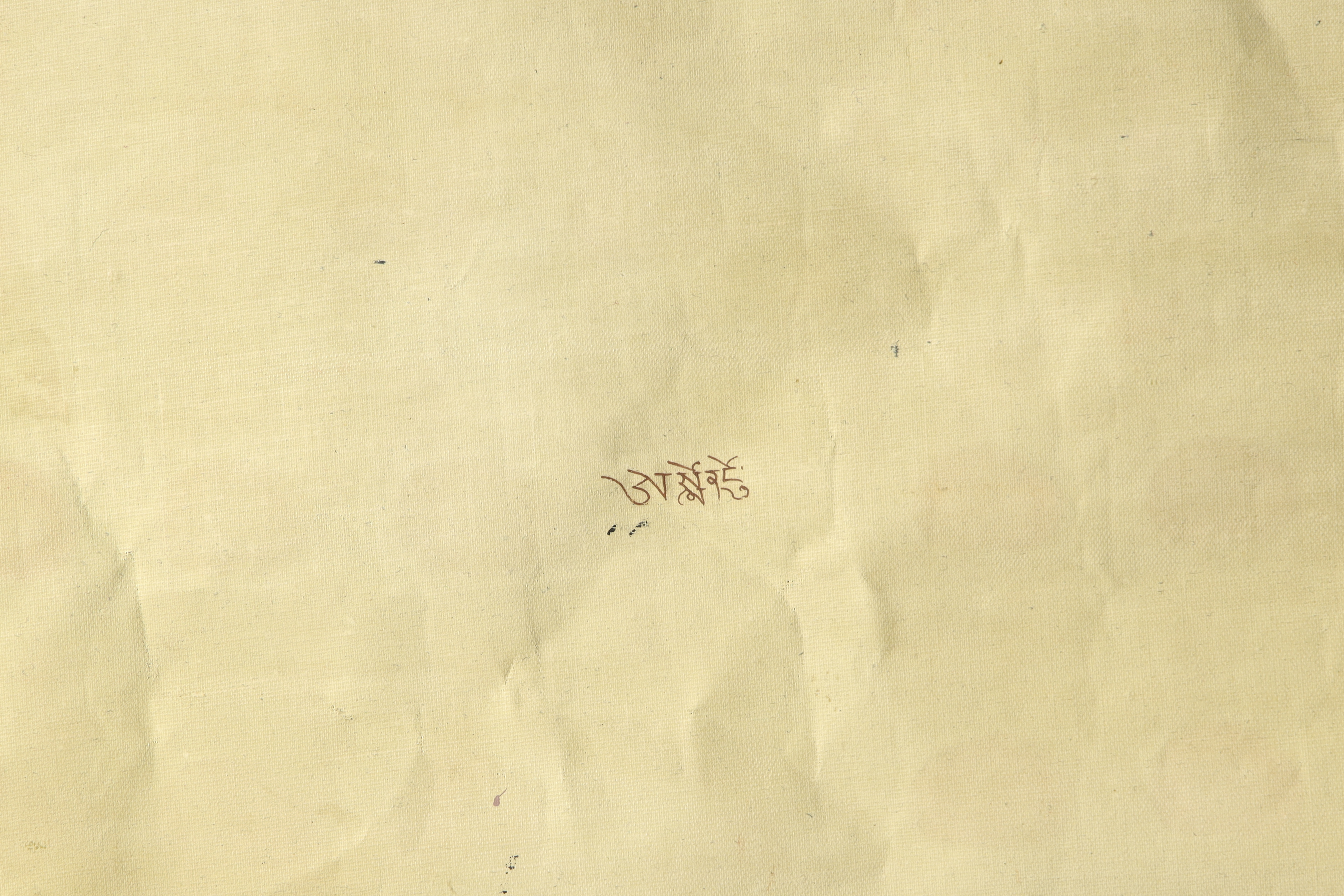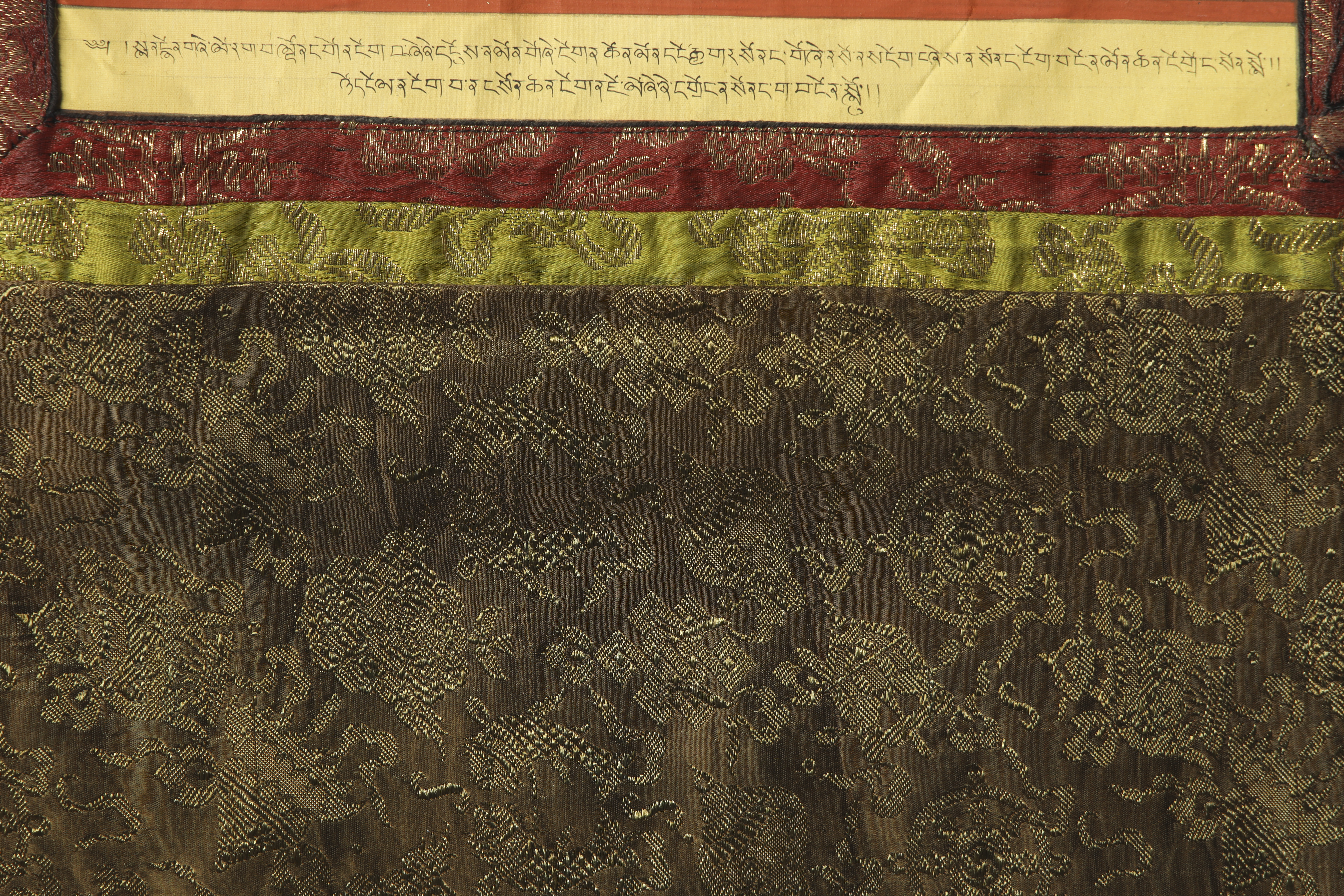 Painting made with mineral pigments on canvas, mounted on a brocade silk frame with a protective green fabric cover. The work depicts in a didactic manner the stages of conception, gestation and birth according to Tibetan medical tradition, in horizontal registers, accompanied by inscriptions and figures of teachers and protective deities at the top.