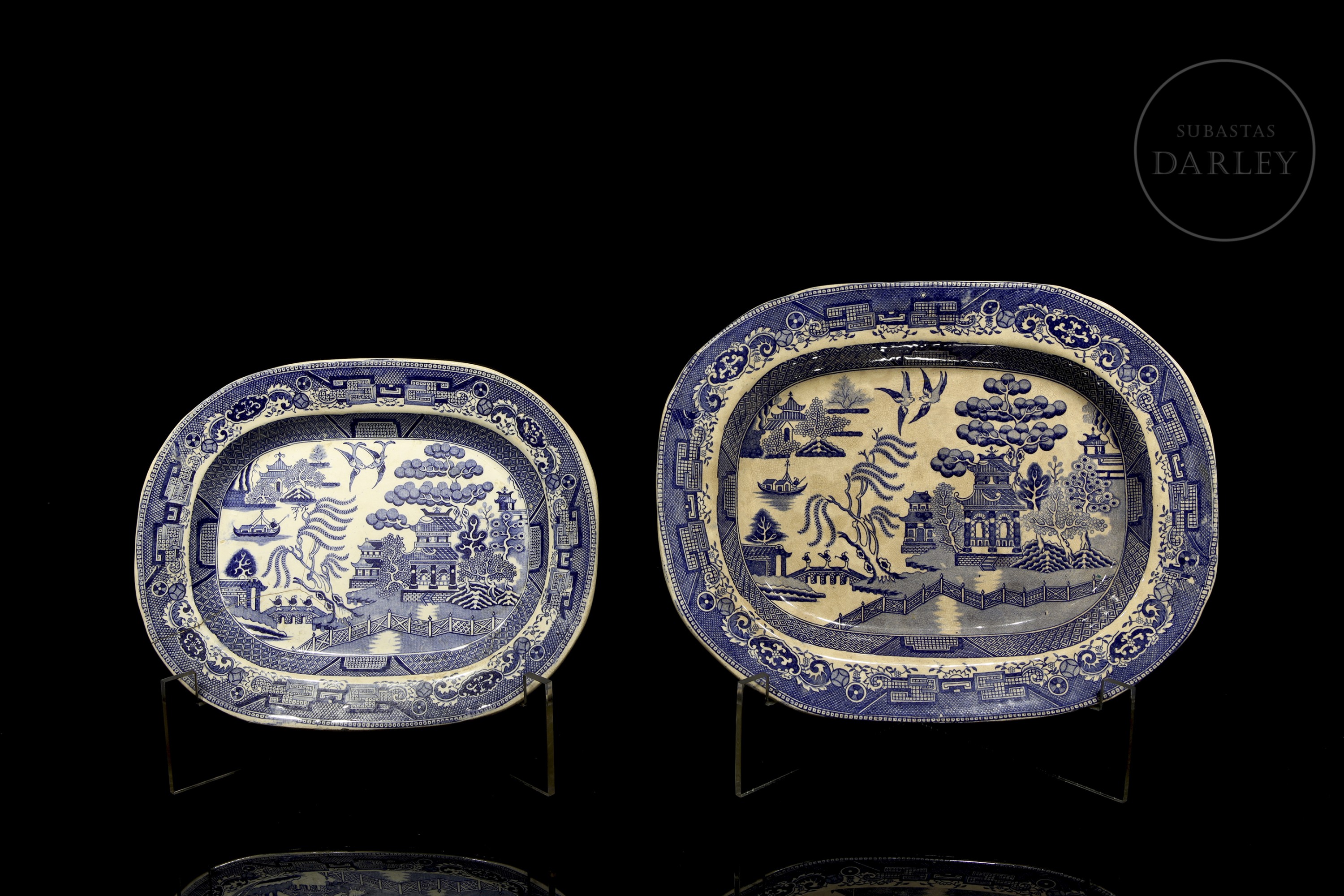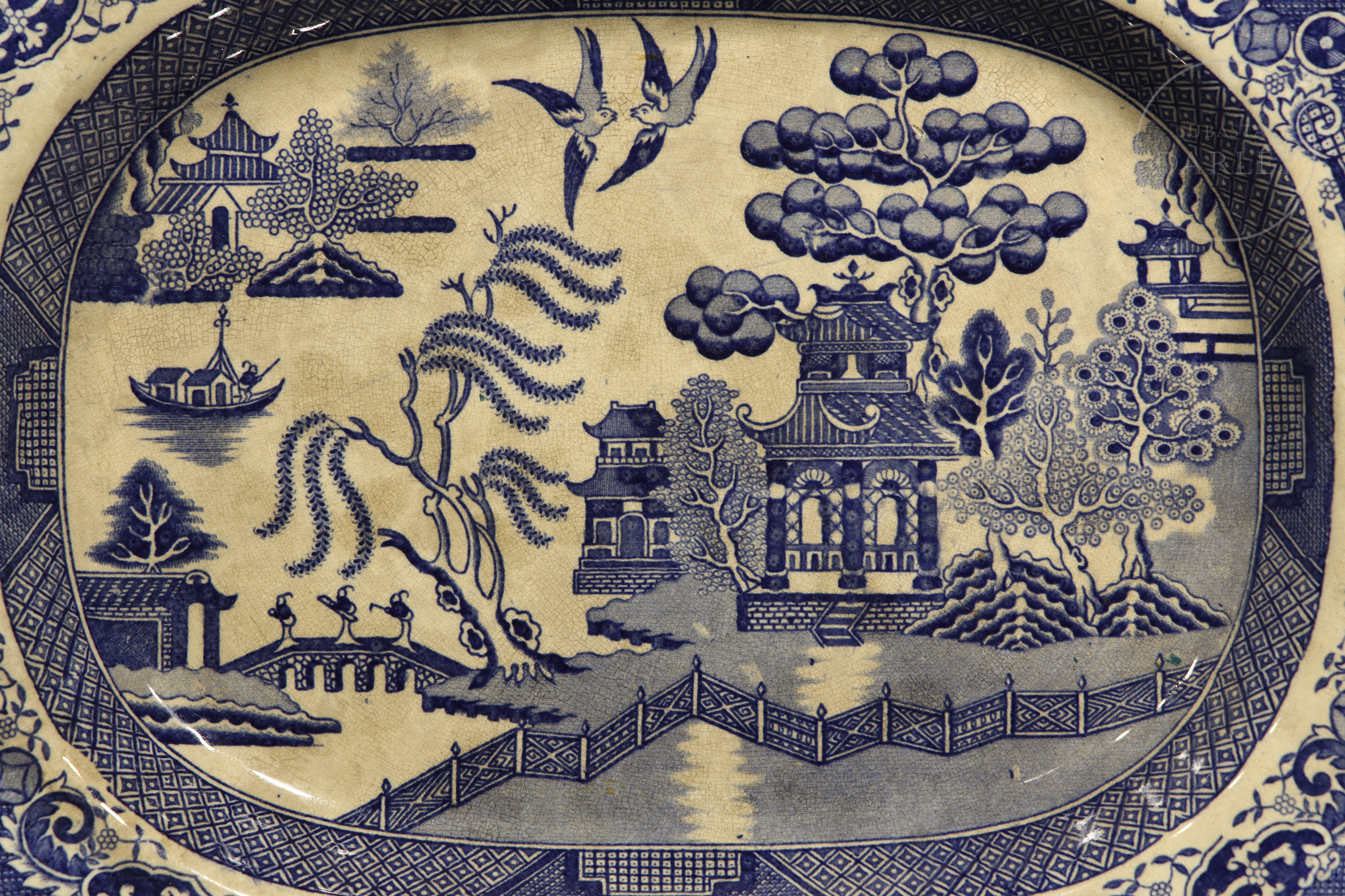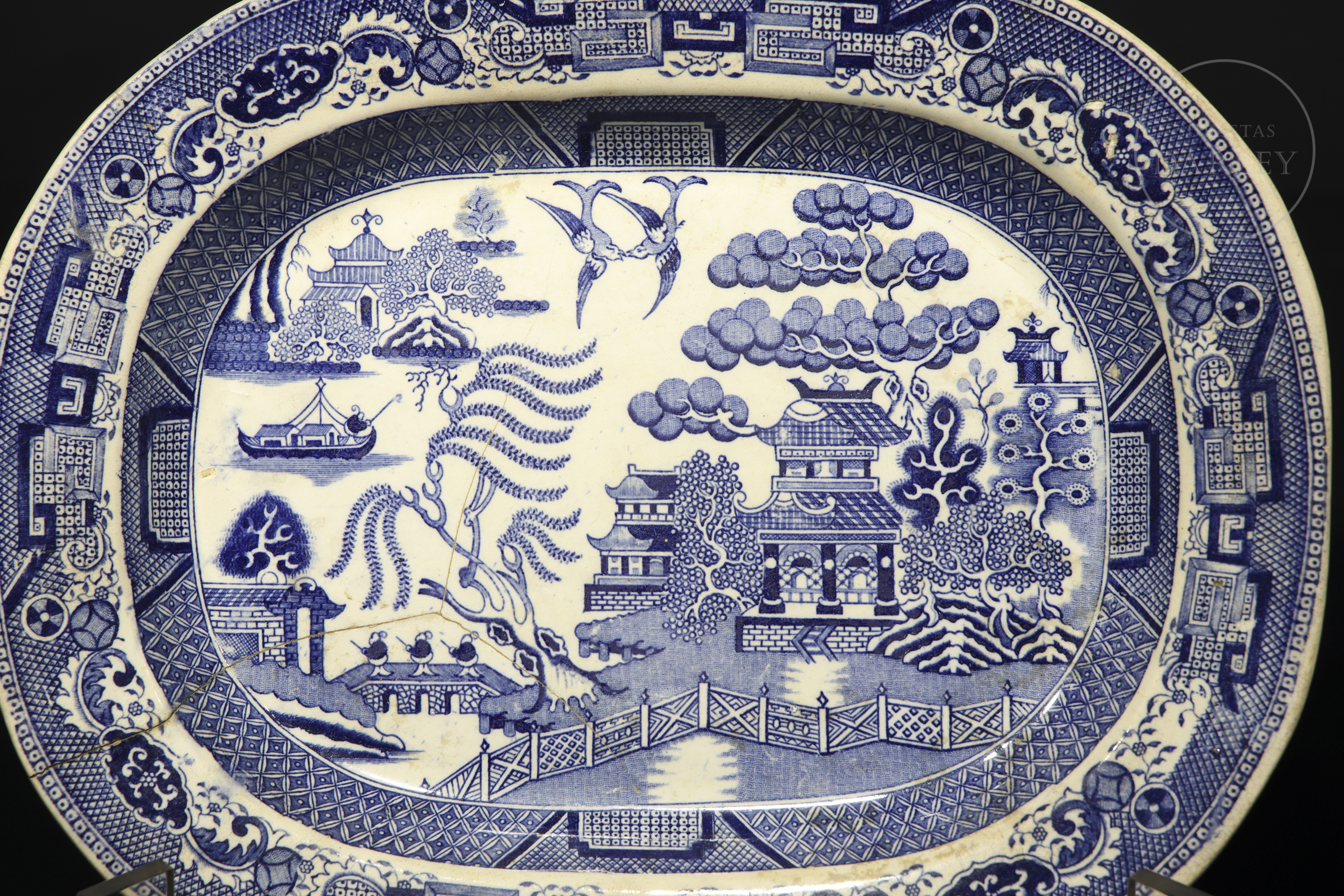两只柳叶纹陶瓷肉盘,饰有源自英国的柳叶纹图案。此设计虽受中国瓷器启发,却于18世纪末至19世纪初在英国发展成型。其中一只可见修复痕迹。
