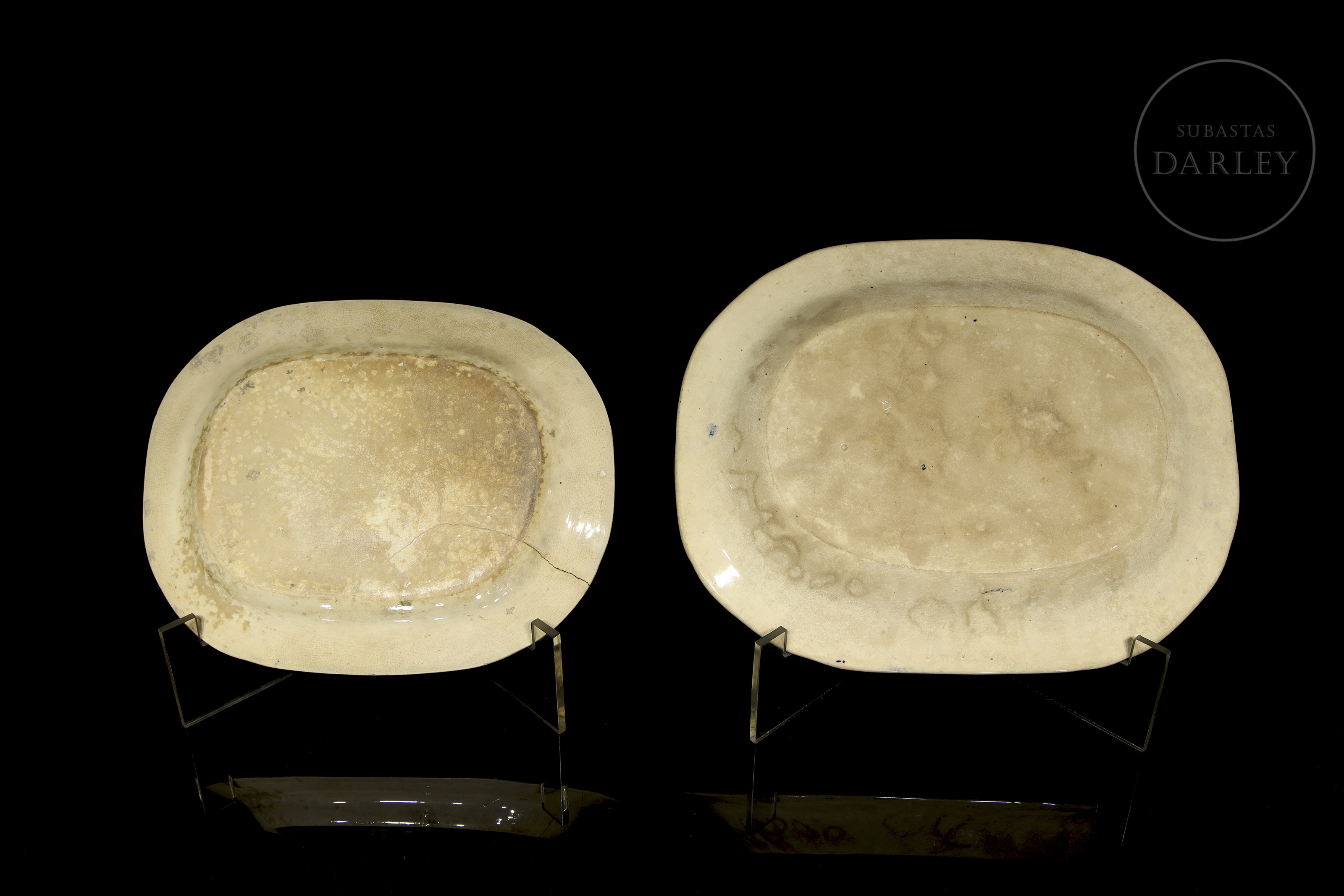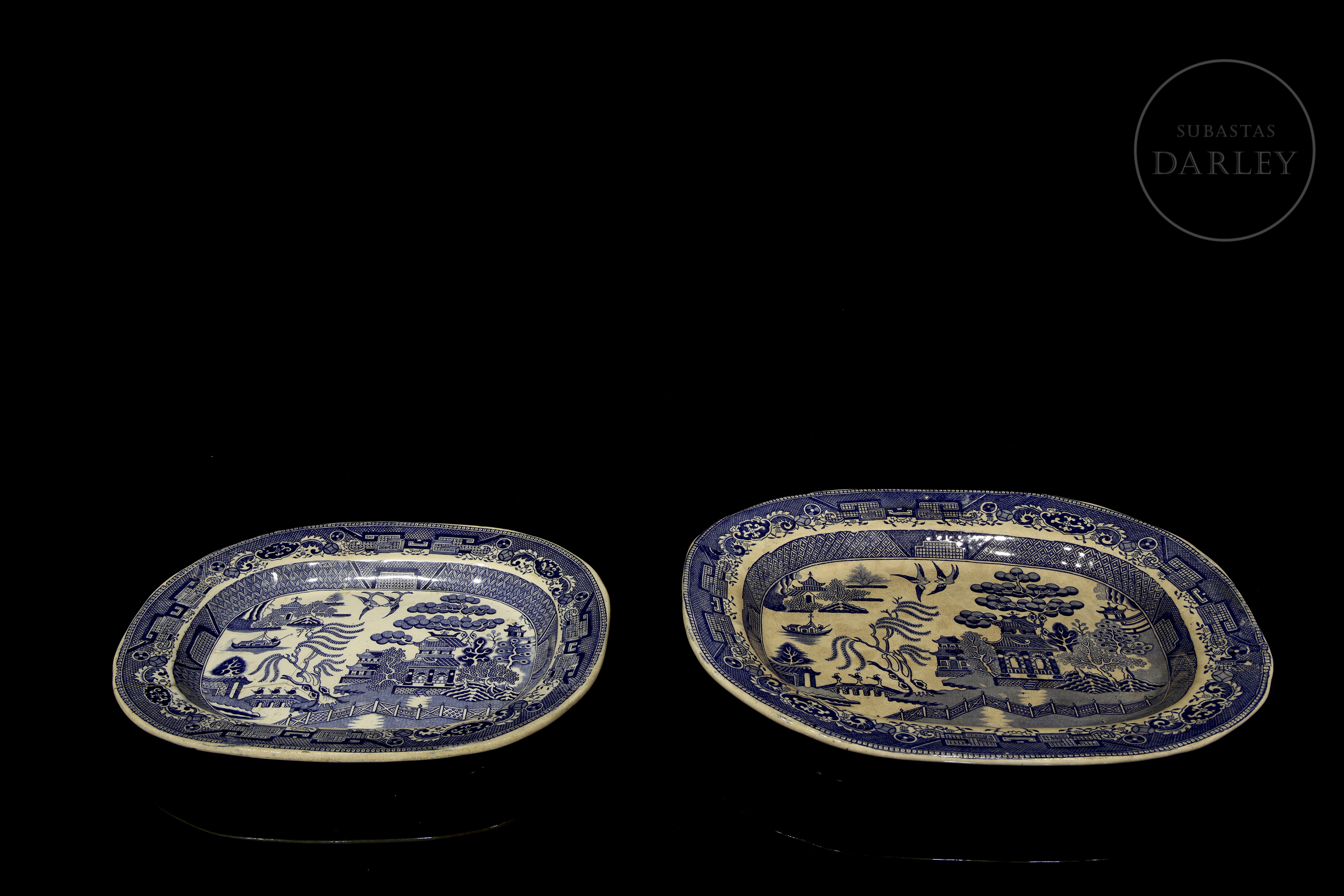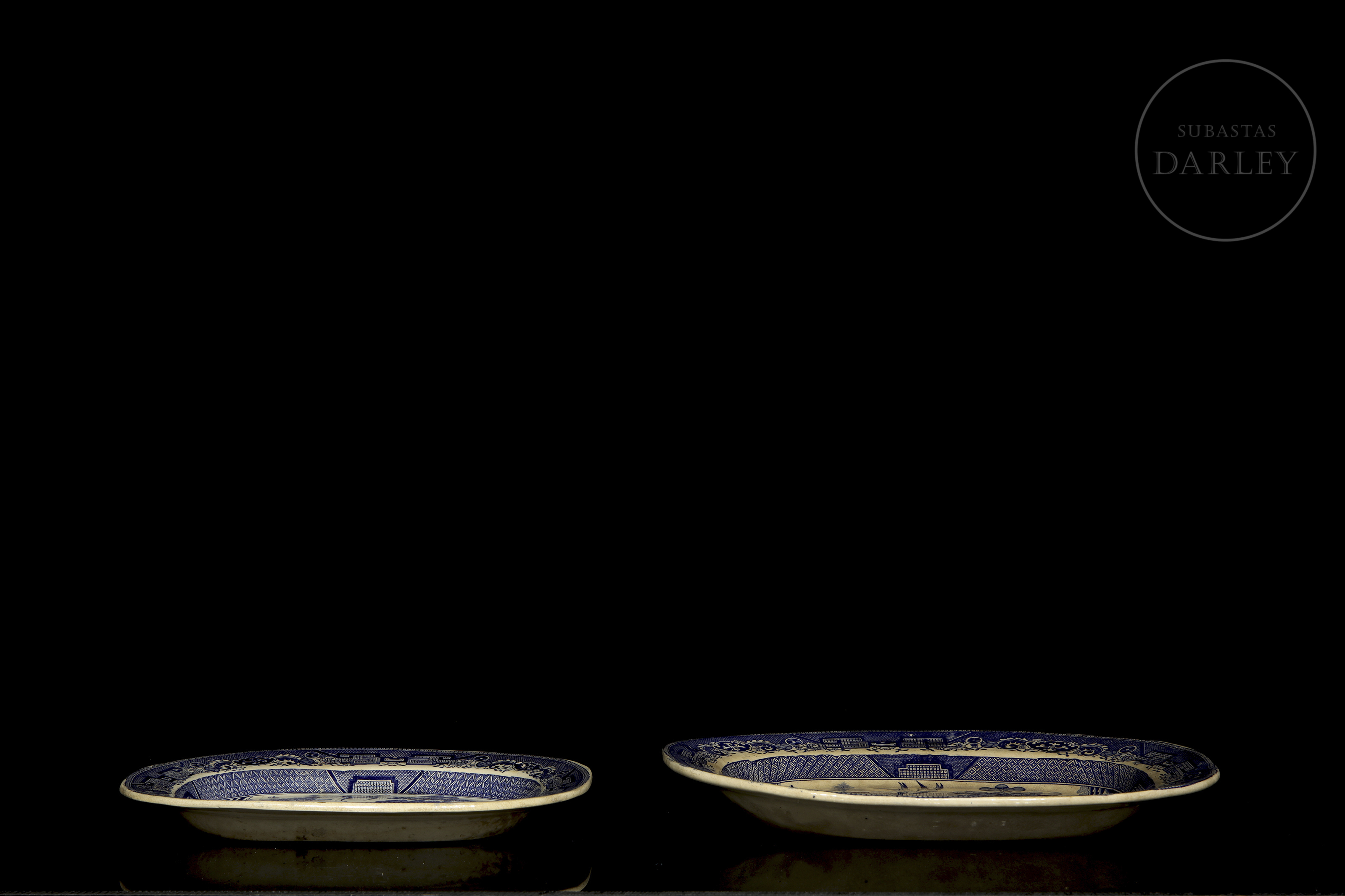 两只柳叶纹陶瓷肉盘,饰有源自英国的柳叶纹图案。此设计虽受中国瓷器启发,却于18世纪末至19世纪初在英国发展成型。其中一只可见修复痕迹。