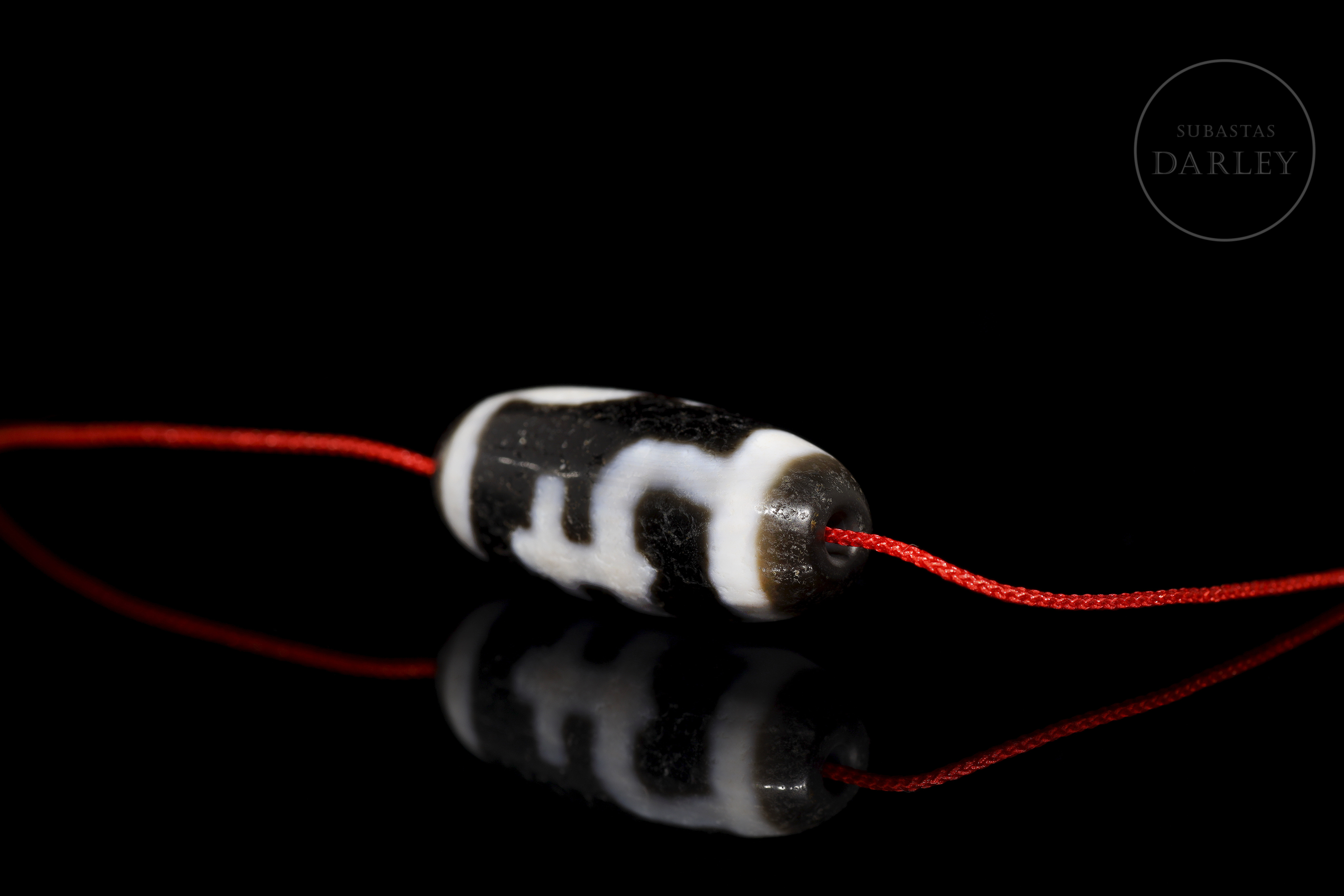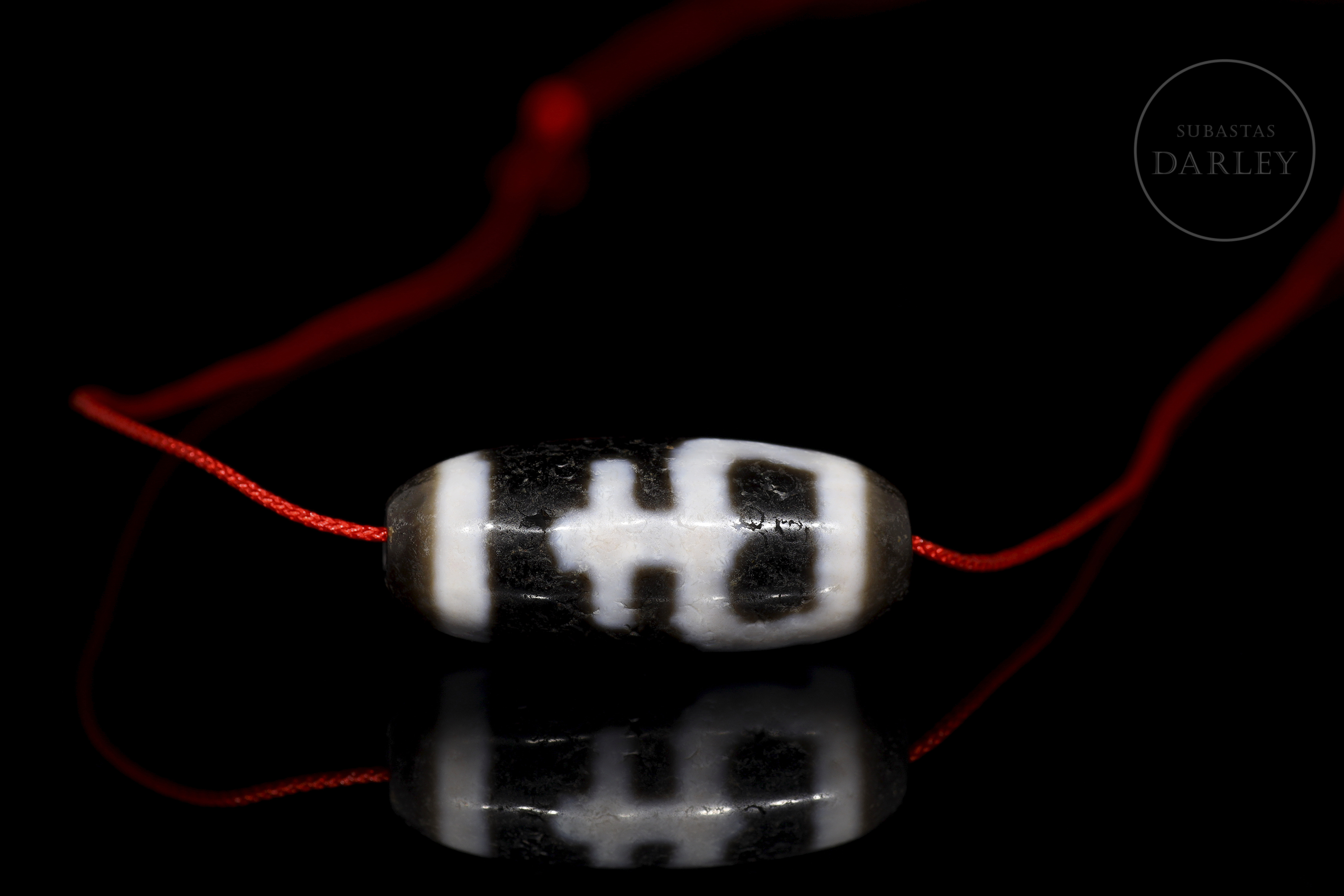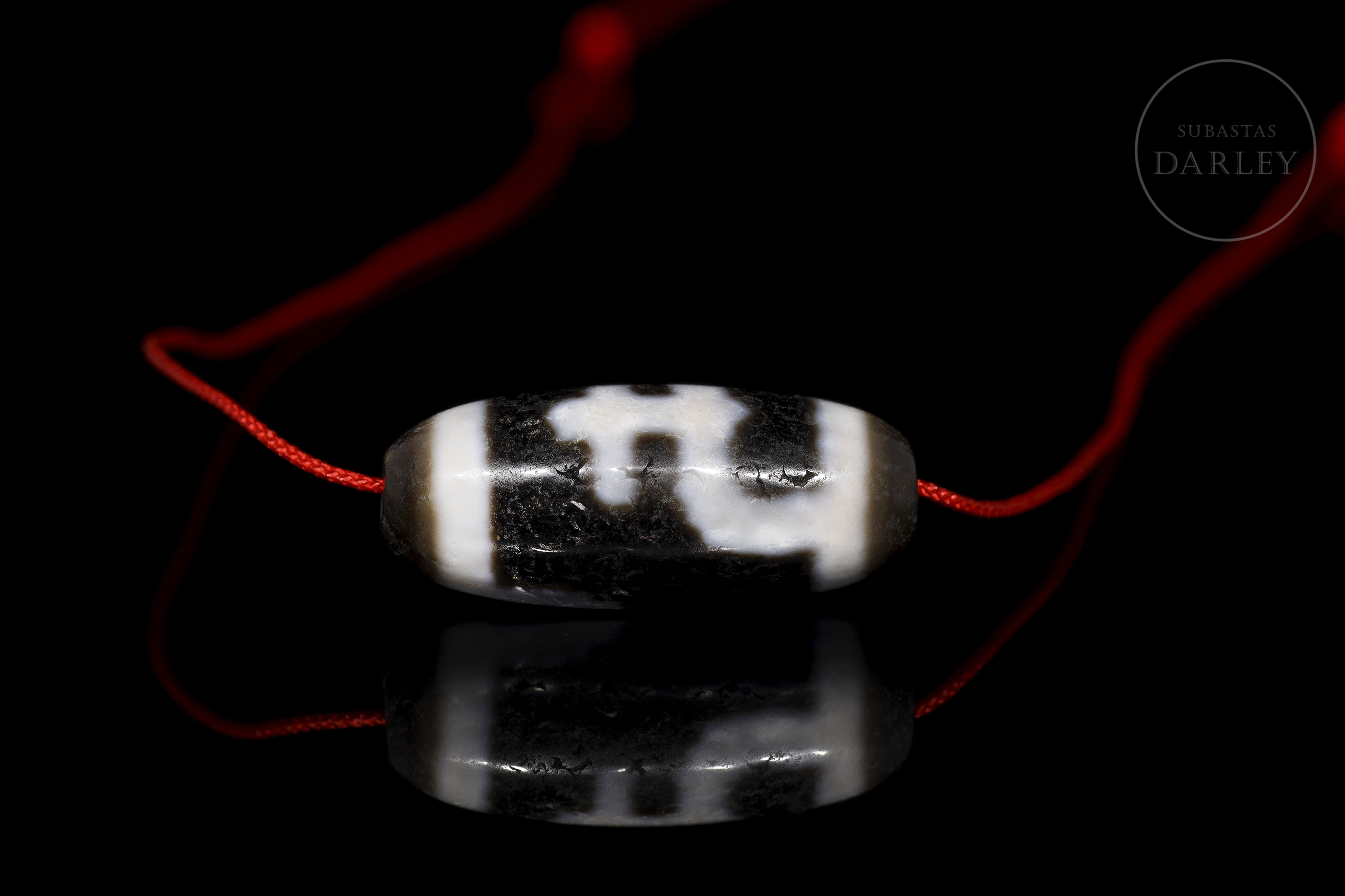 Barrel-shaped agate Dzi bead, engraved with white designs on a dark brown background. The main decorative motif of the piece is an emblem of good fortune in Buddhism, flanked by other geometric motifs.