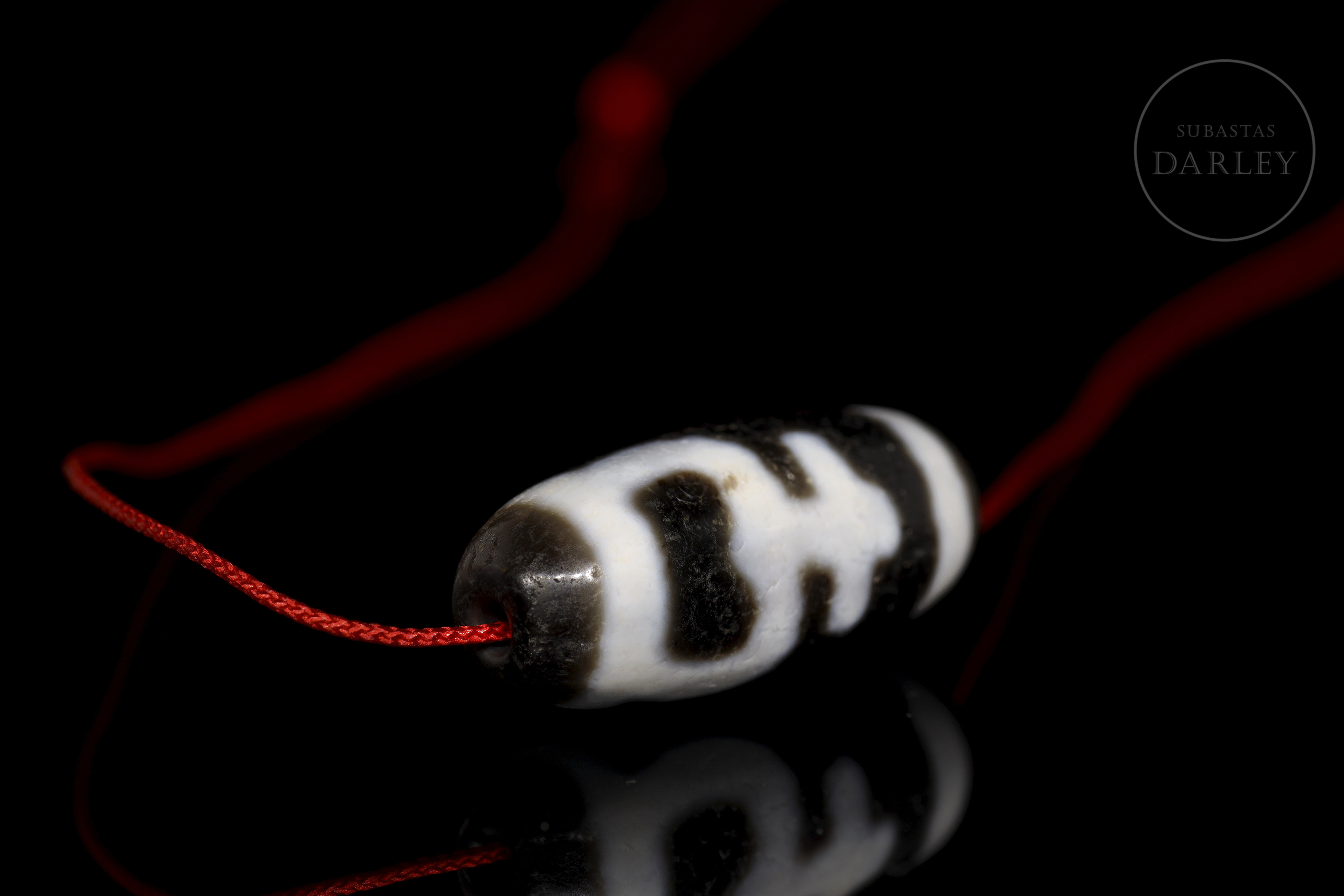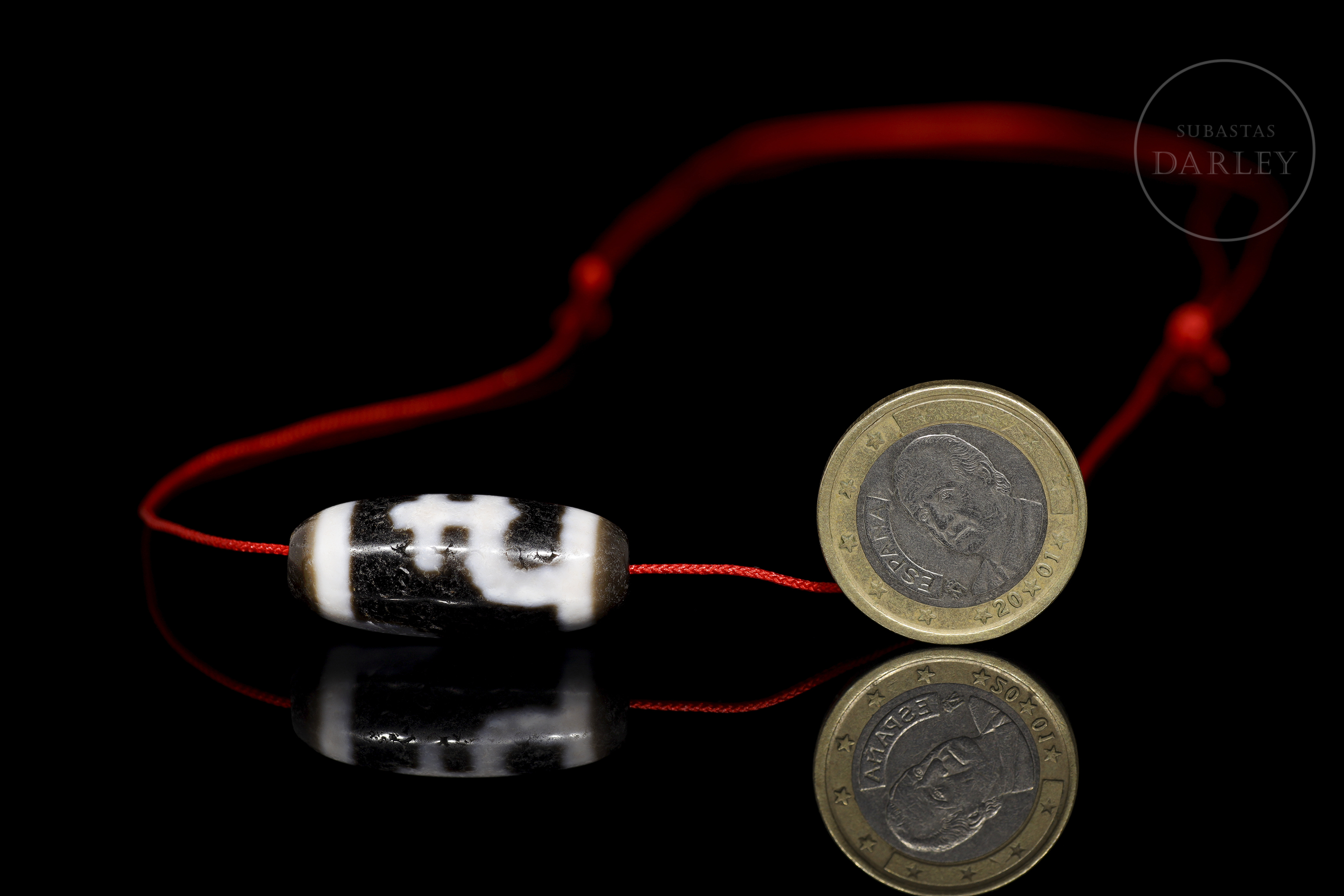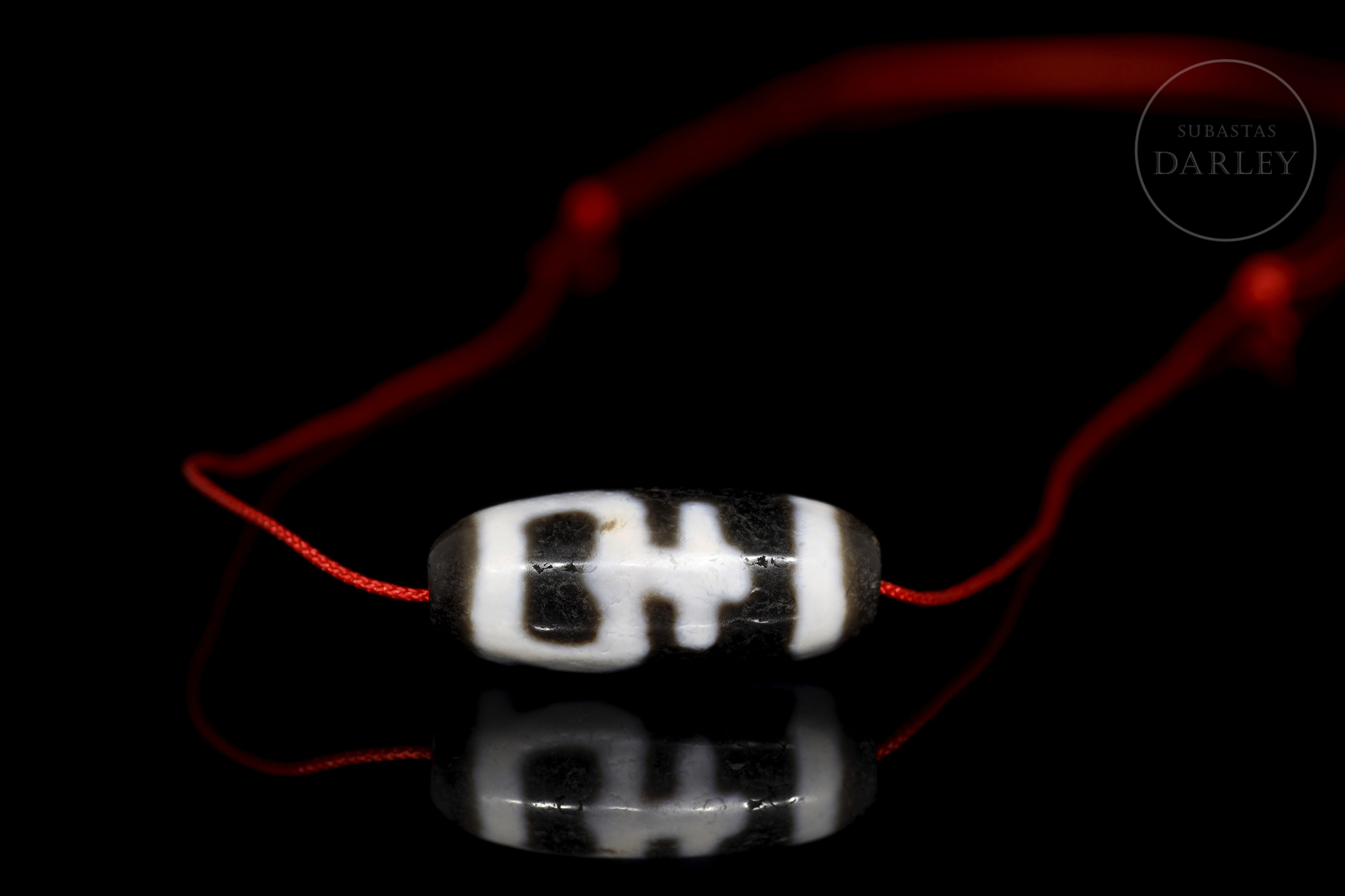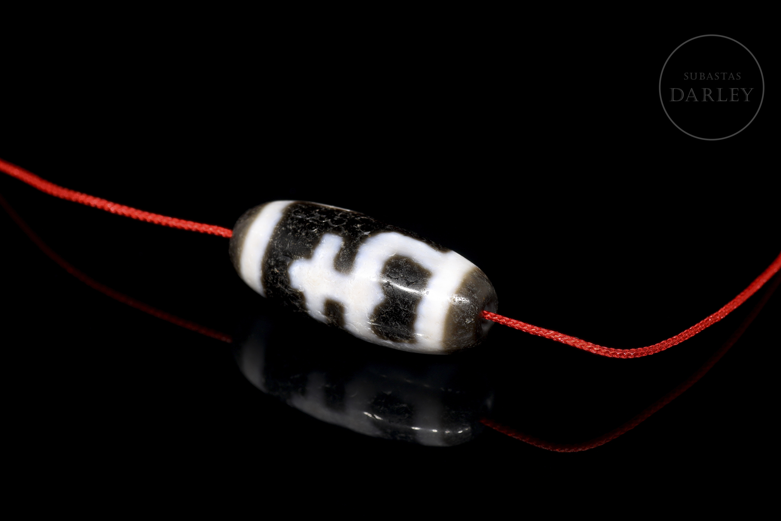 Barrel-shaped agate Dzi bead, engraved with white designs on a dark brown background. The main decorative motif of the piece is an emblem of good fortune in Buddhism, flanked by other geometric motifs.