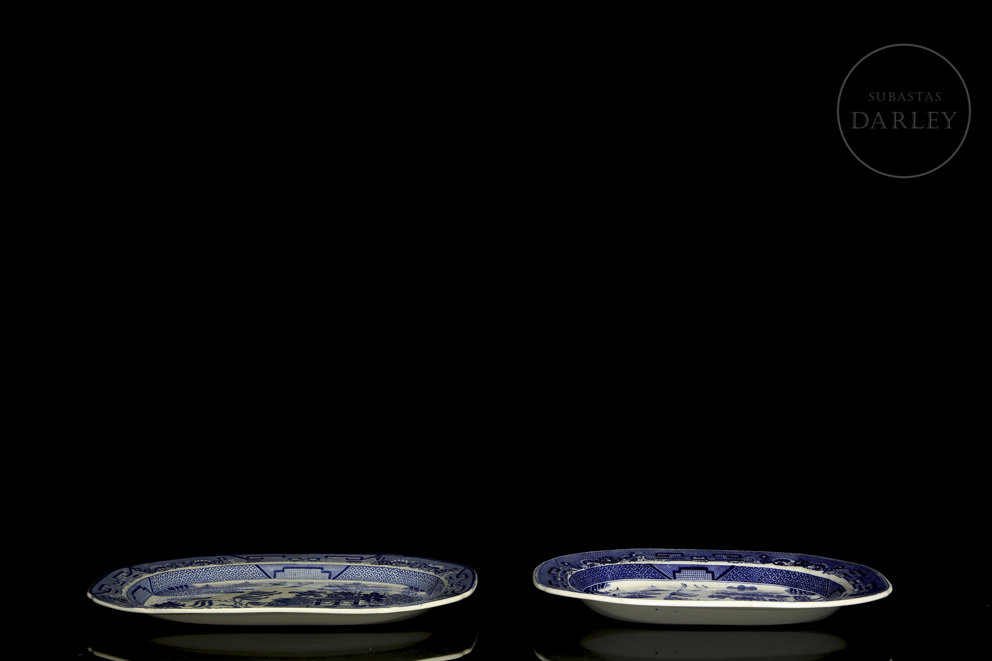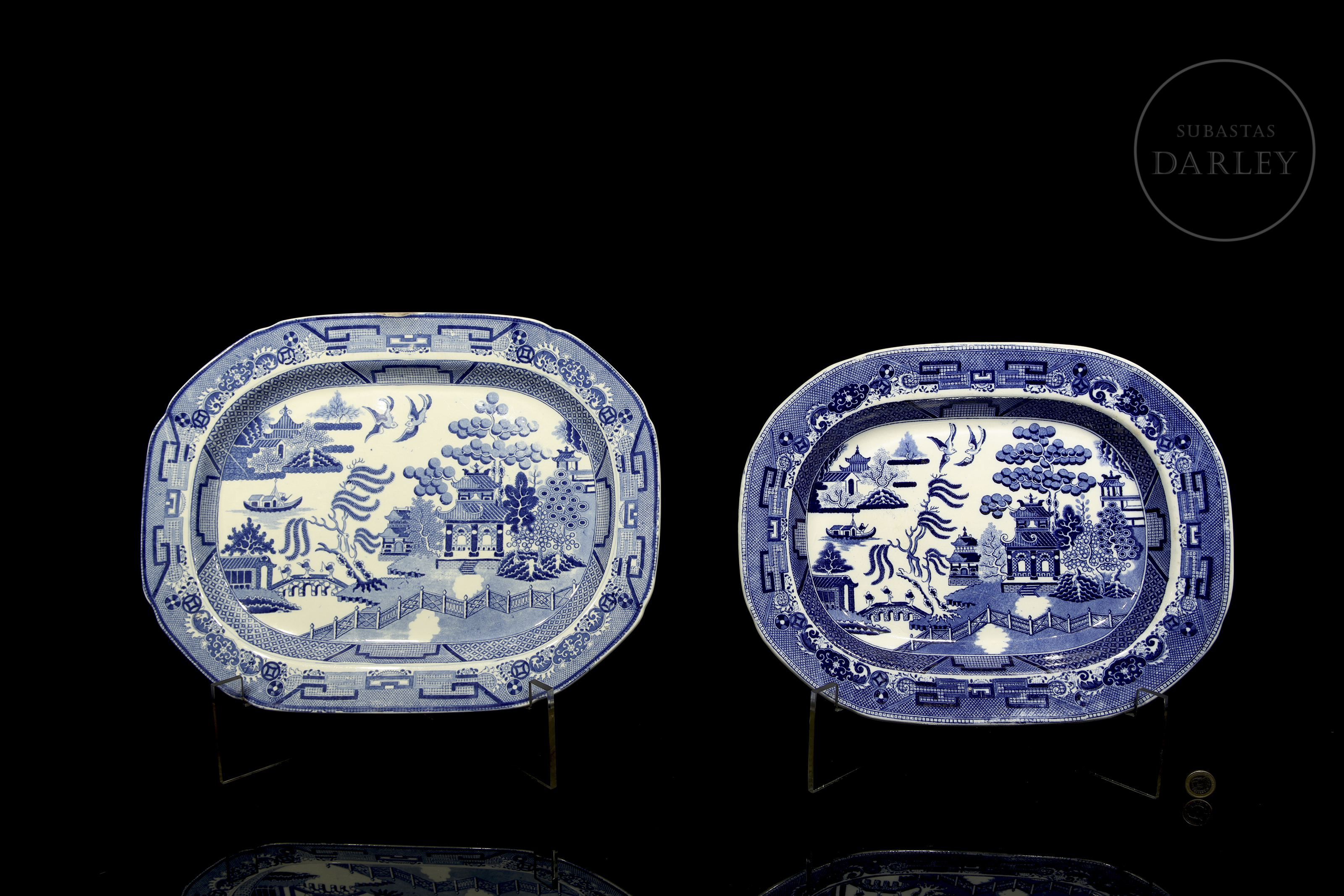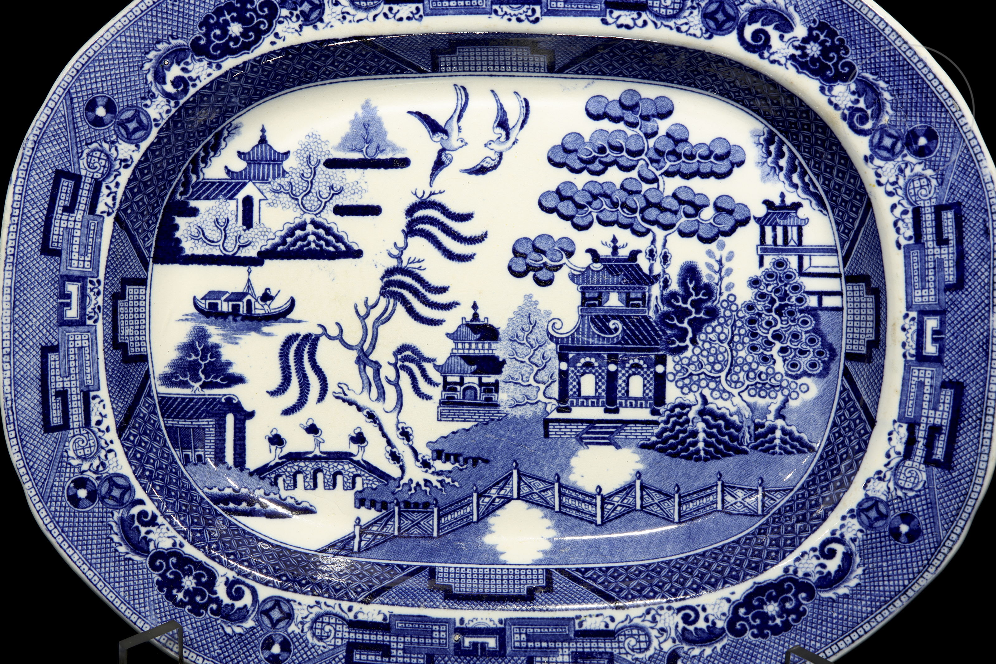 两件英式柳树纹托盘。这两件托盘采用广受欢迎的柳树纹图案,这种图案在18世纪末至19世纪的英国风靡一时。托盘采用转印工艺制作,在白色陶土上呈现出精美的钴蓝色图案。