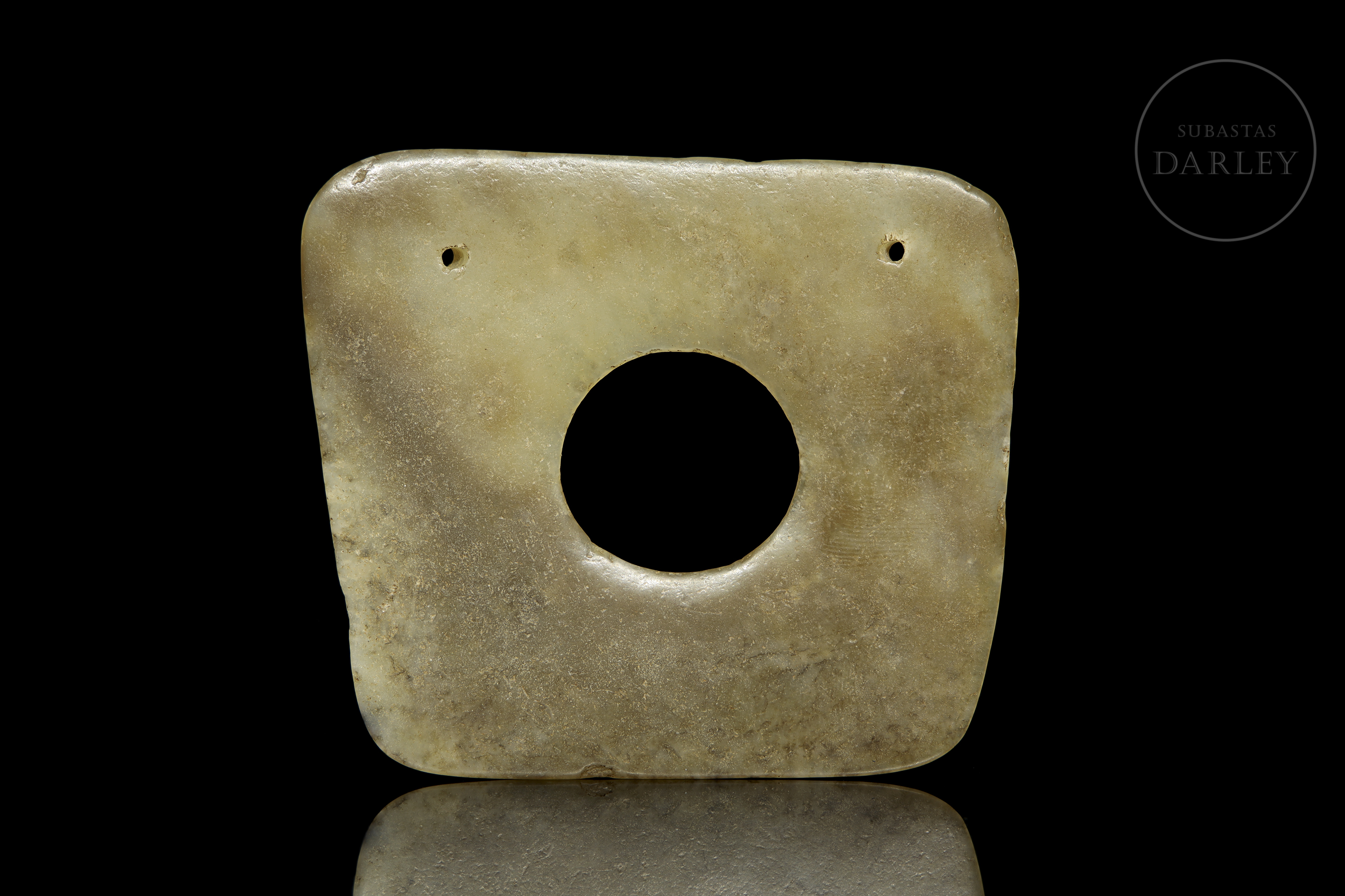 Set consisting of two greenish-brown jade pendants, one circular with a central hole, representing the traditional bi disc, and the other square with a similar hole in the centre. Both pieces have polished surfaces and natural veins that highlight the texture of the stone.