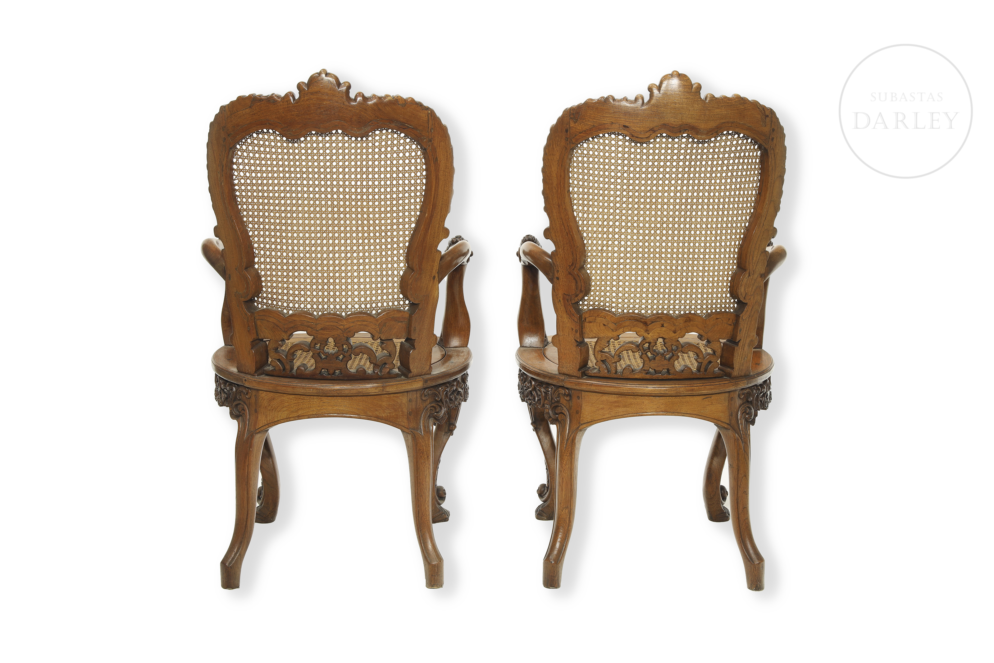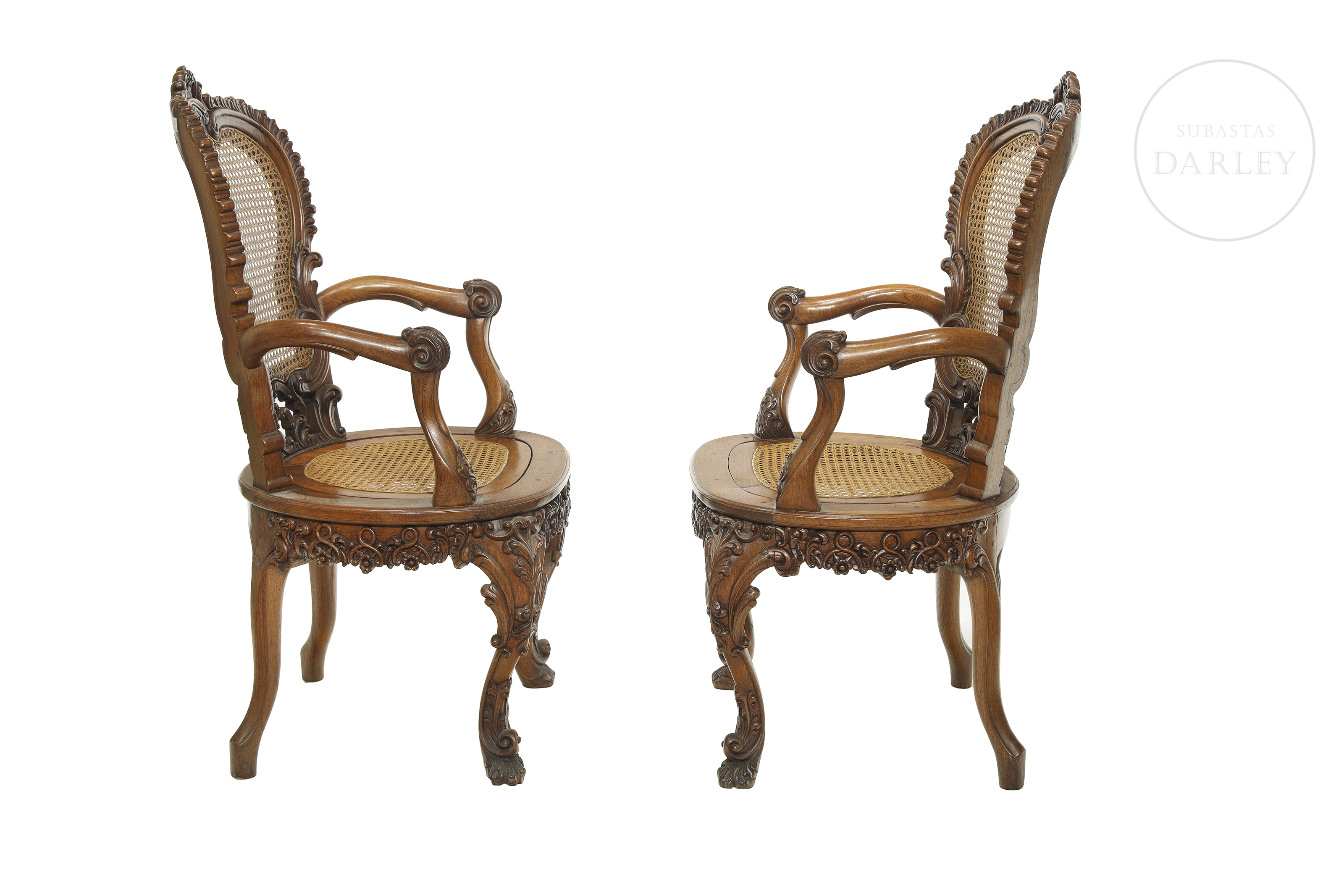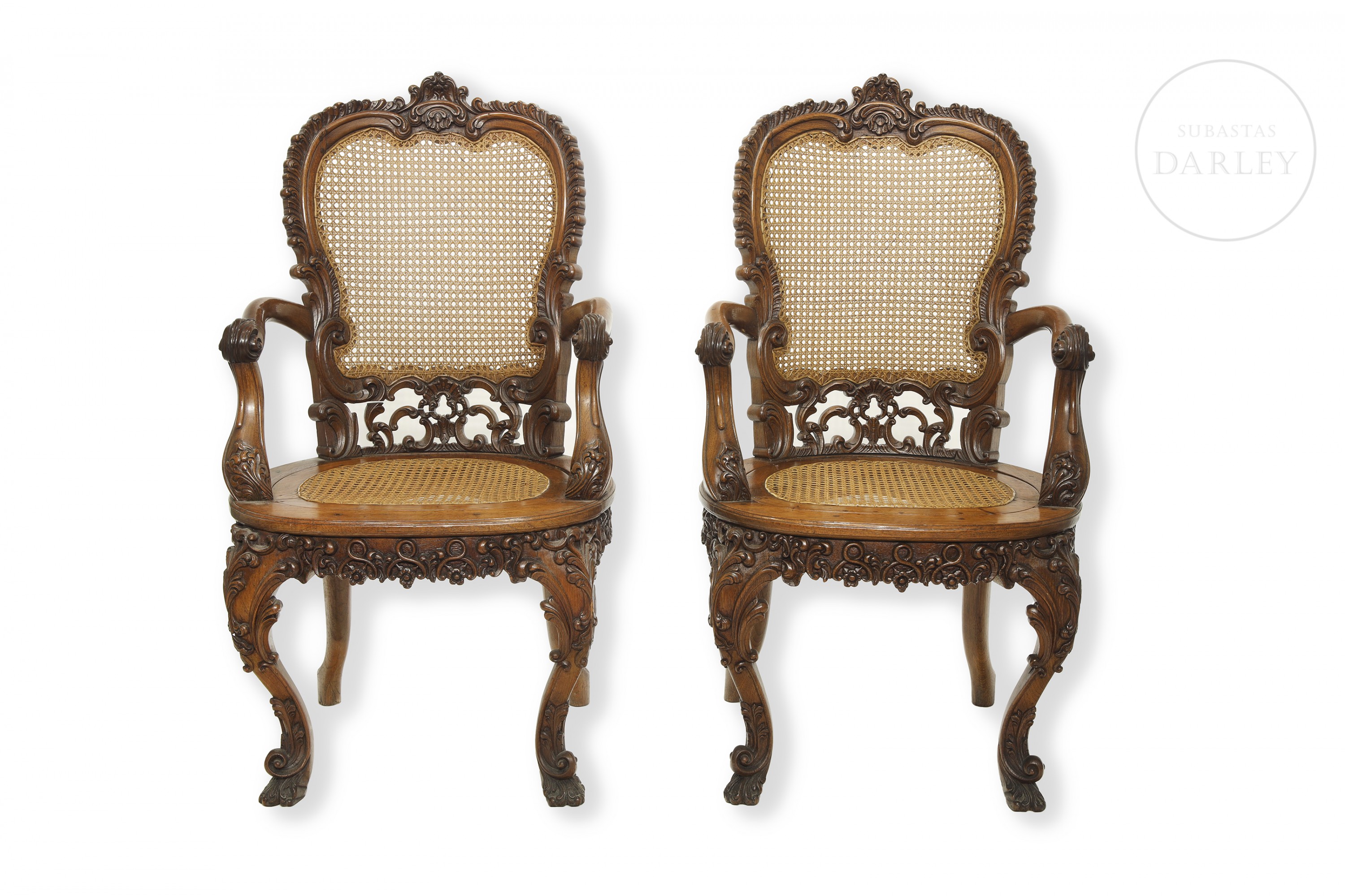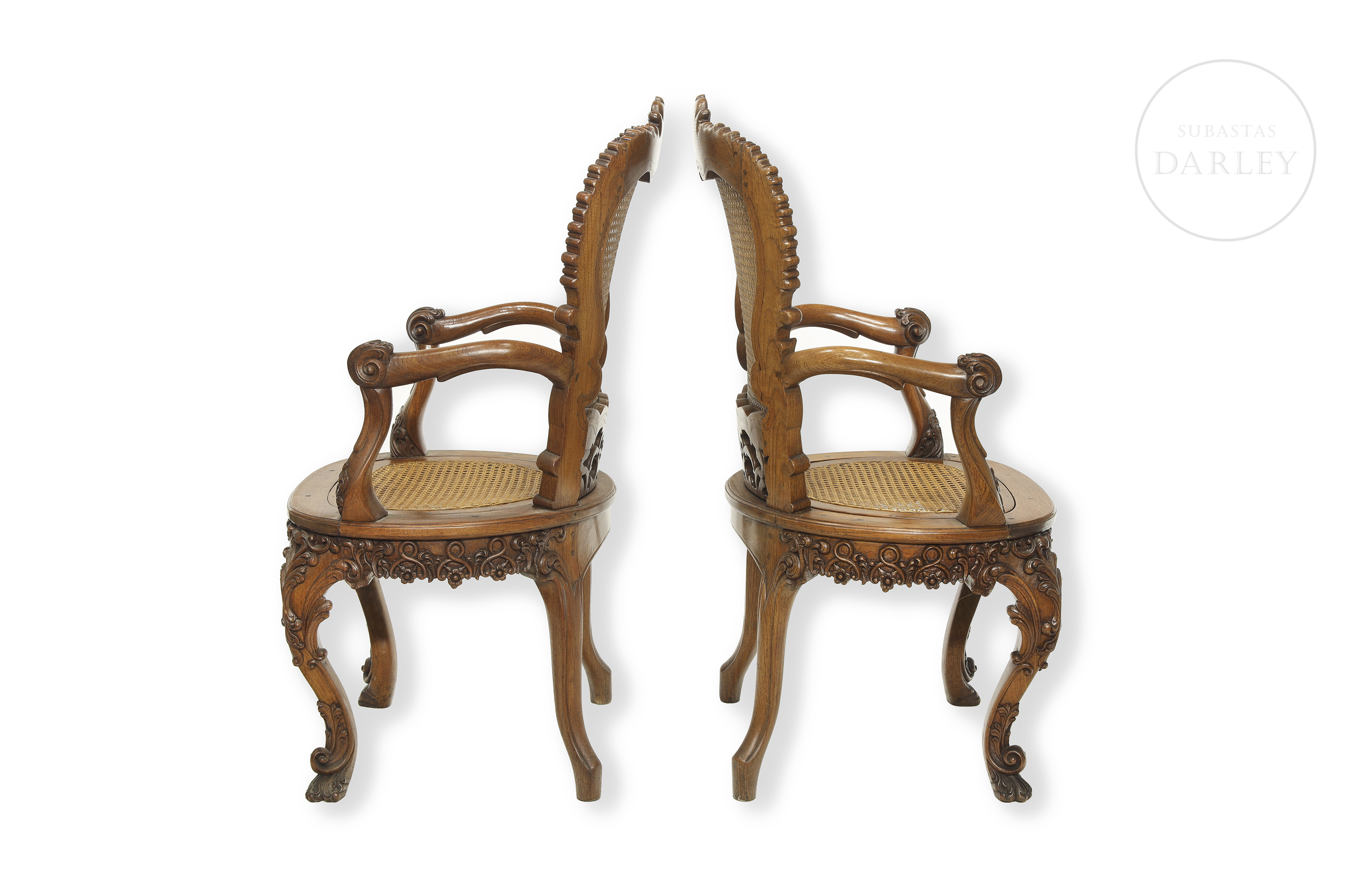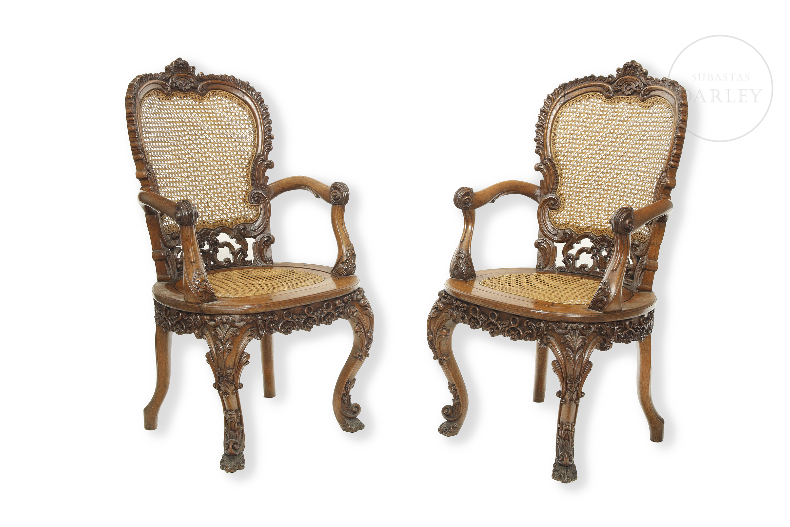 木雕扶手椅。靠背与座面饰以叶纹与花卉纹样,均配有格栅支撑结构,顶部饰以棕榈叶纹饰。卷曲形扶手与弯曲腿。