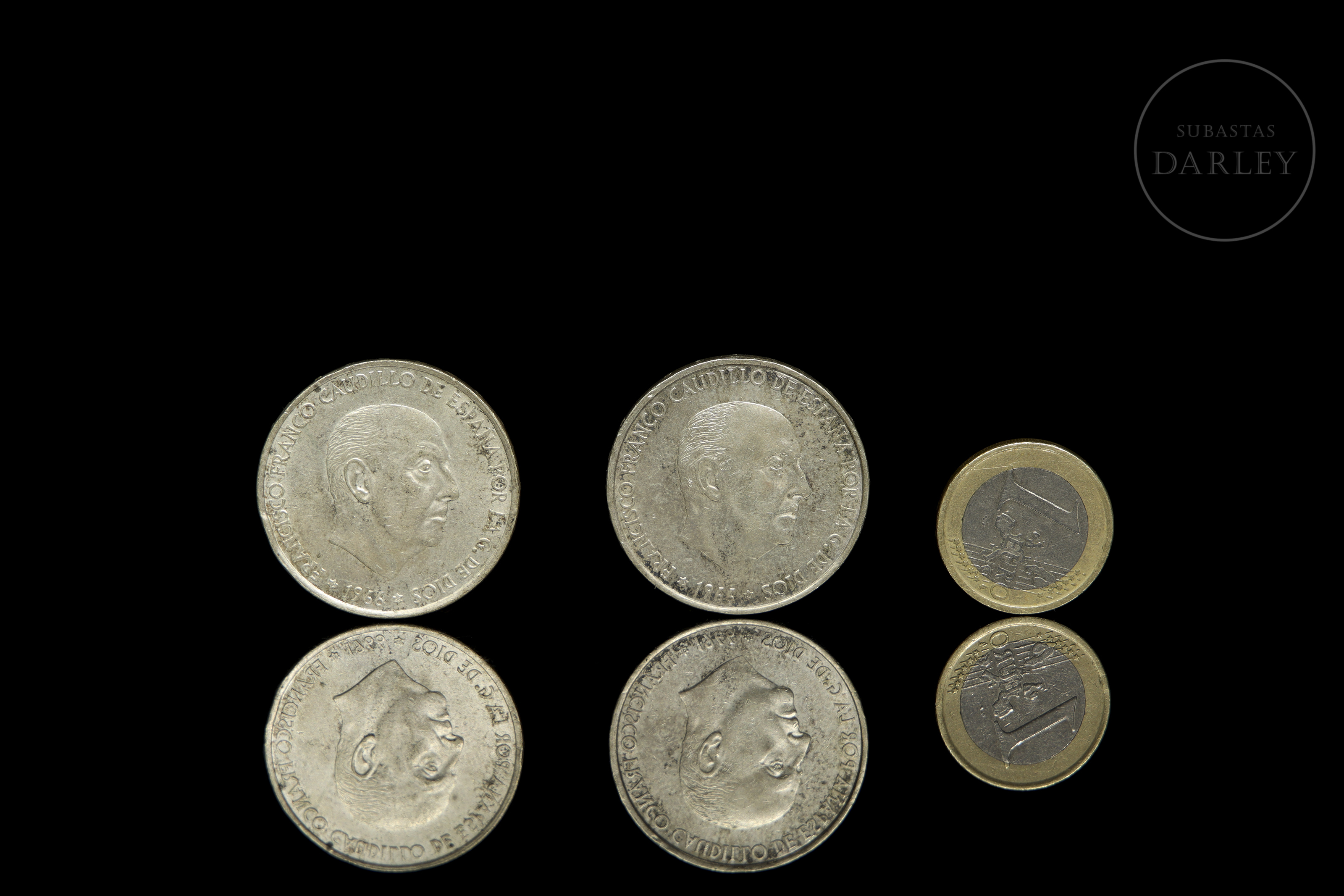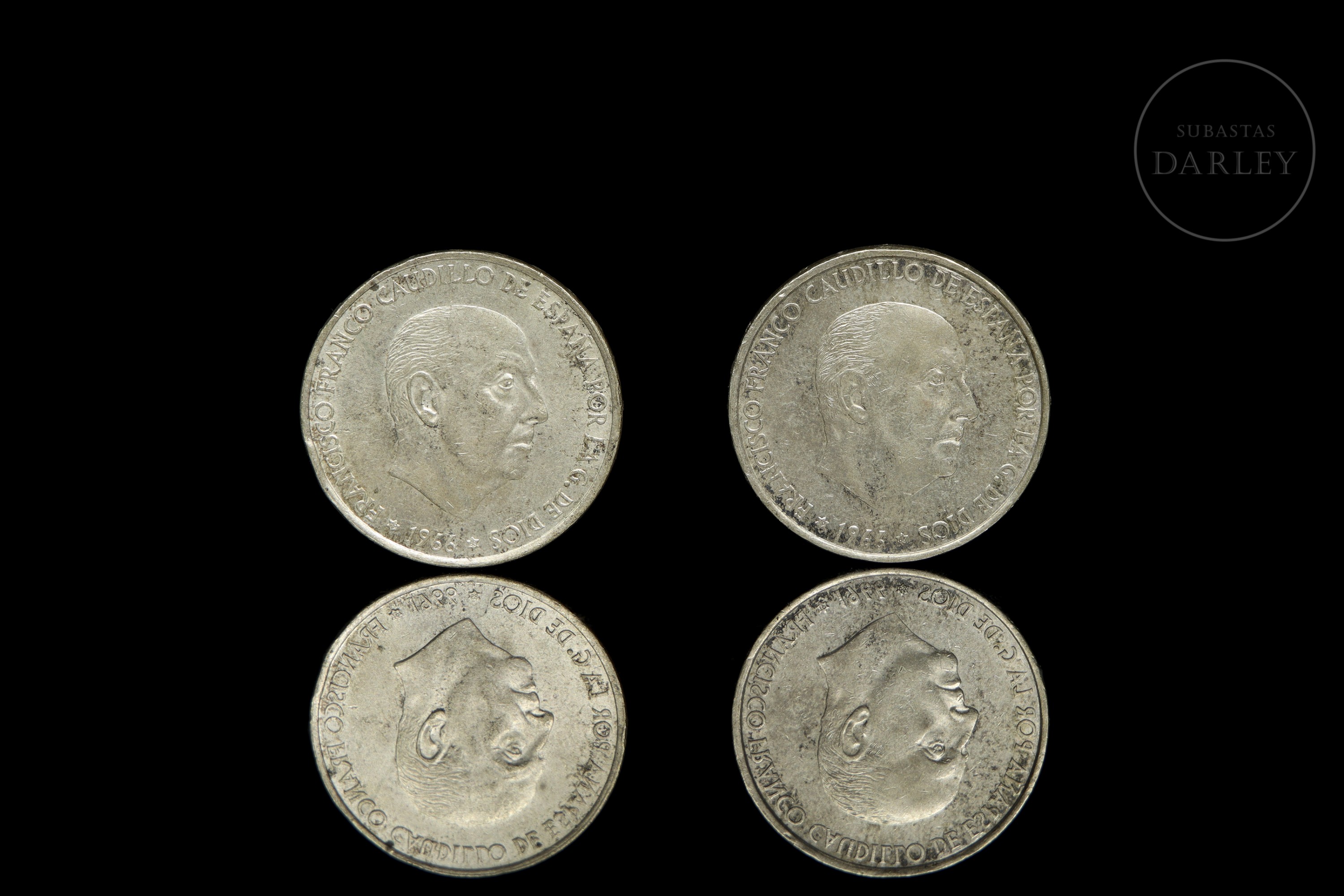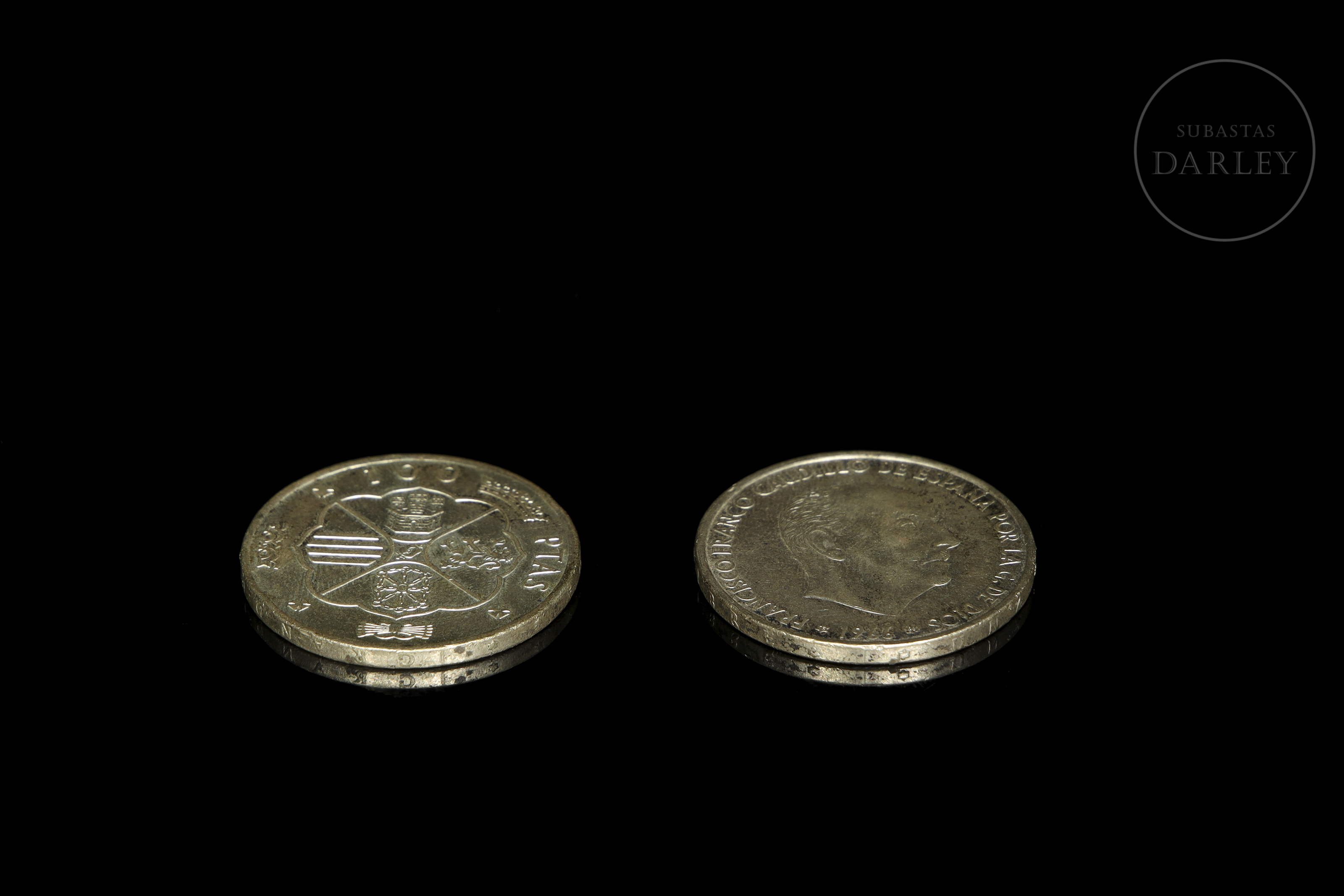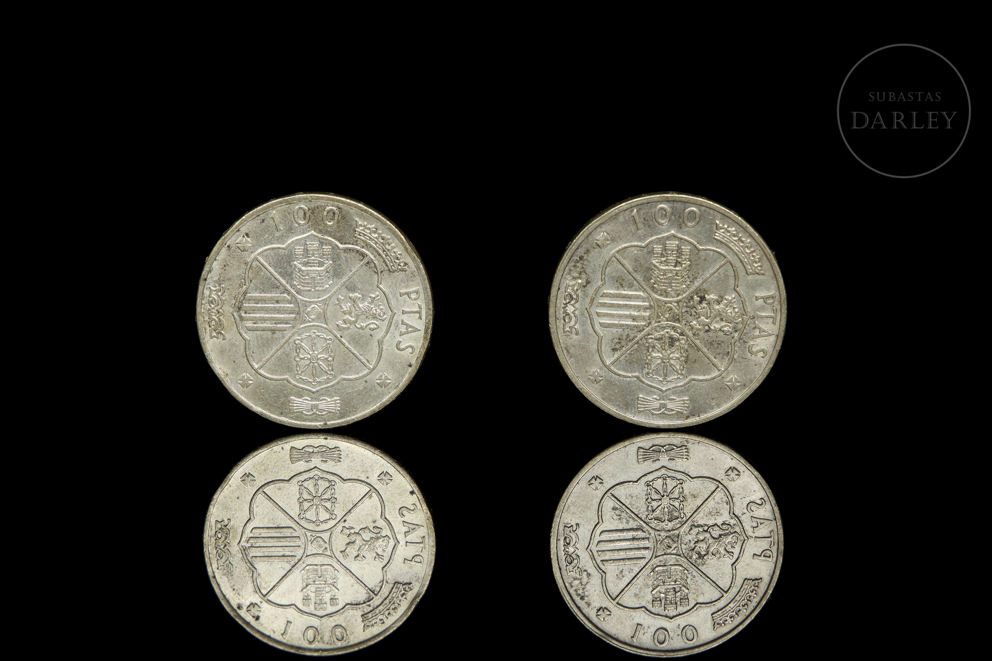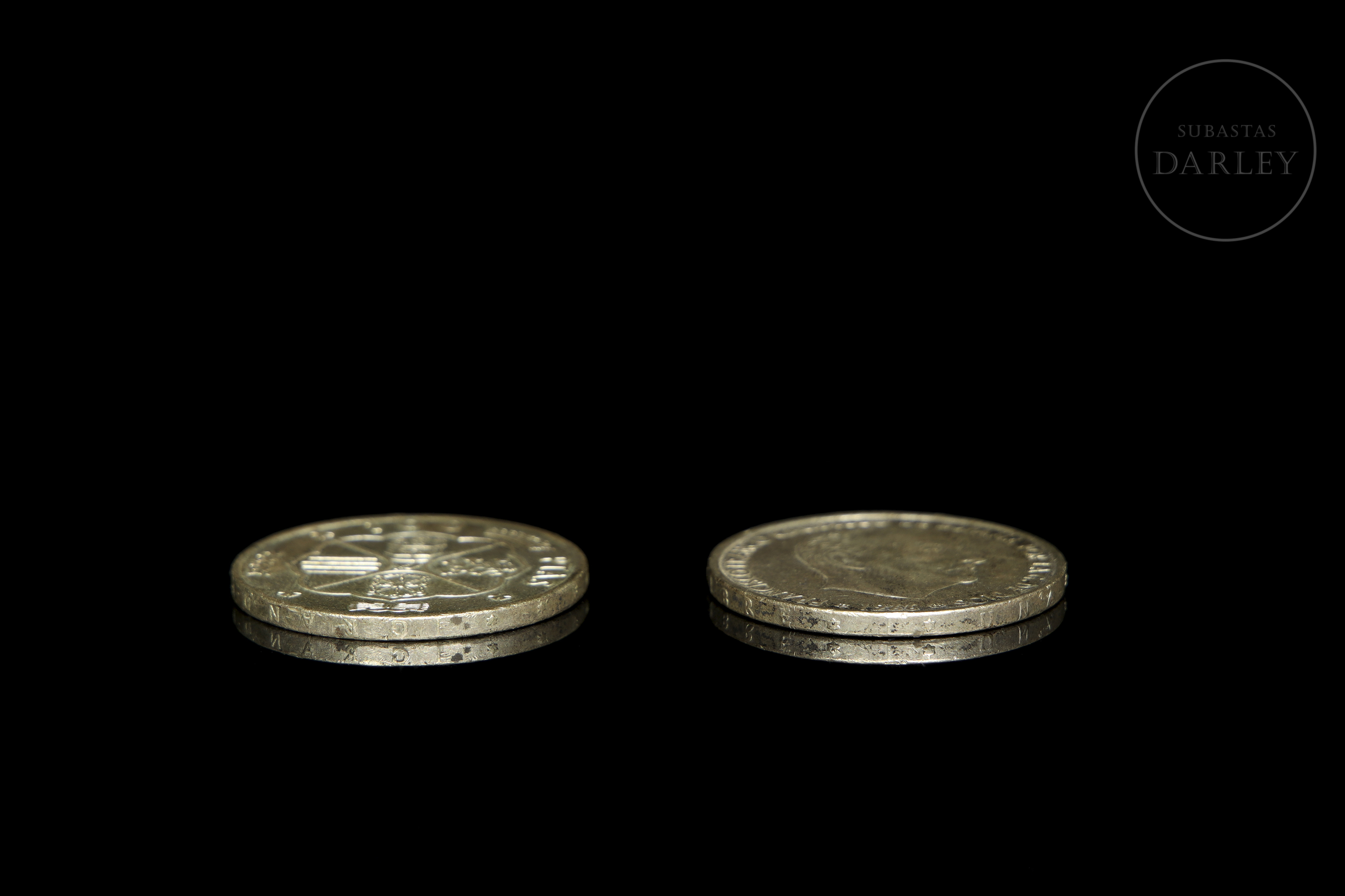 一套两枚1966年铸造的银质100比塞塔硬币。正面饰有弗朗西斯科·佛朗哥的侧面肖像,背面刻有西班牙国徽及面值100比塞塔字样。