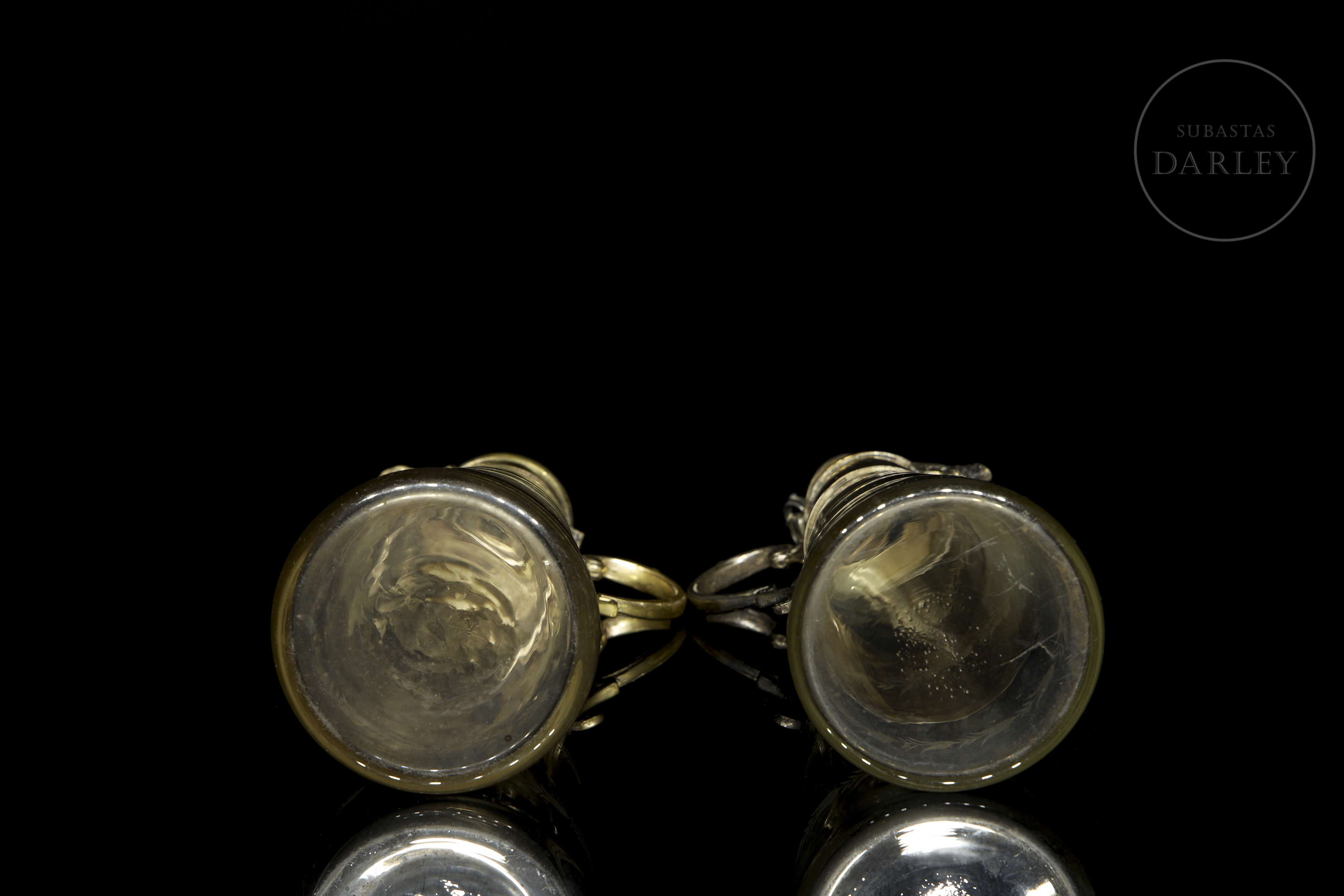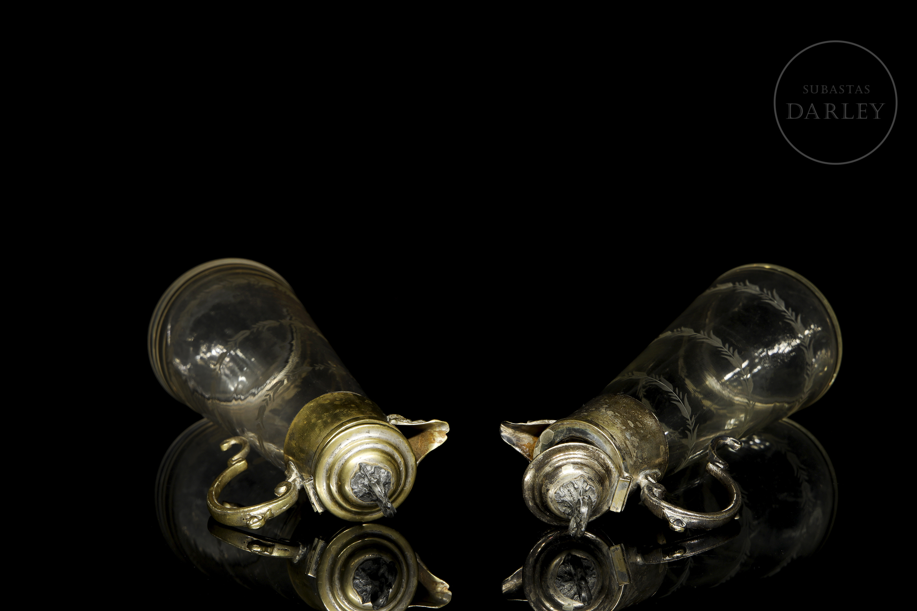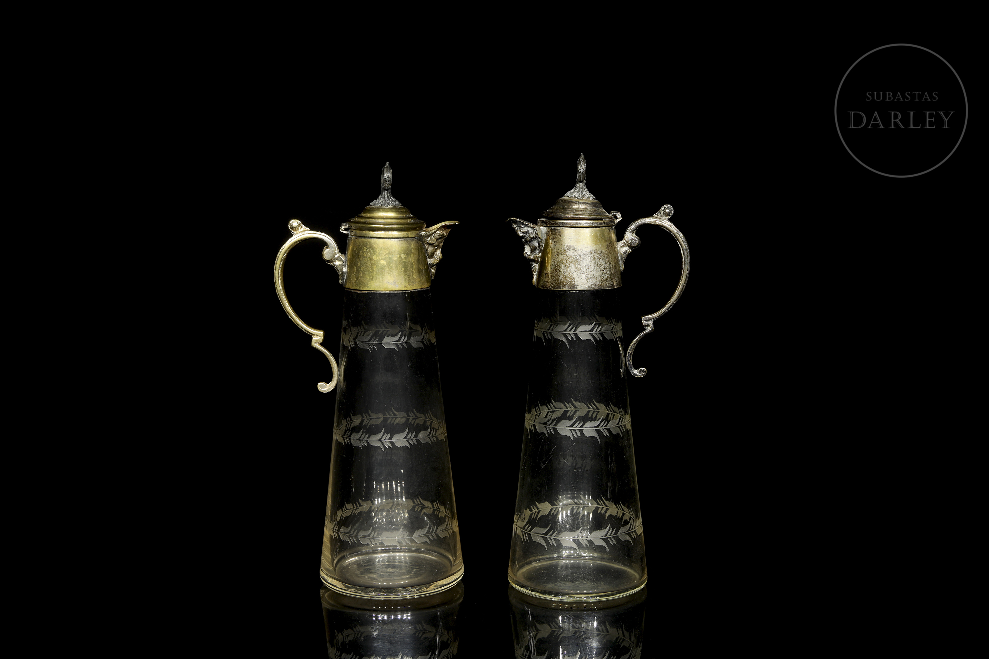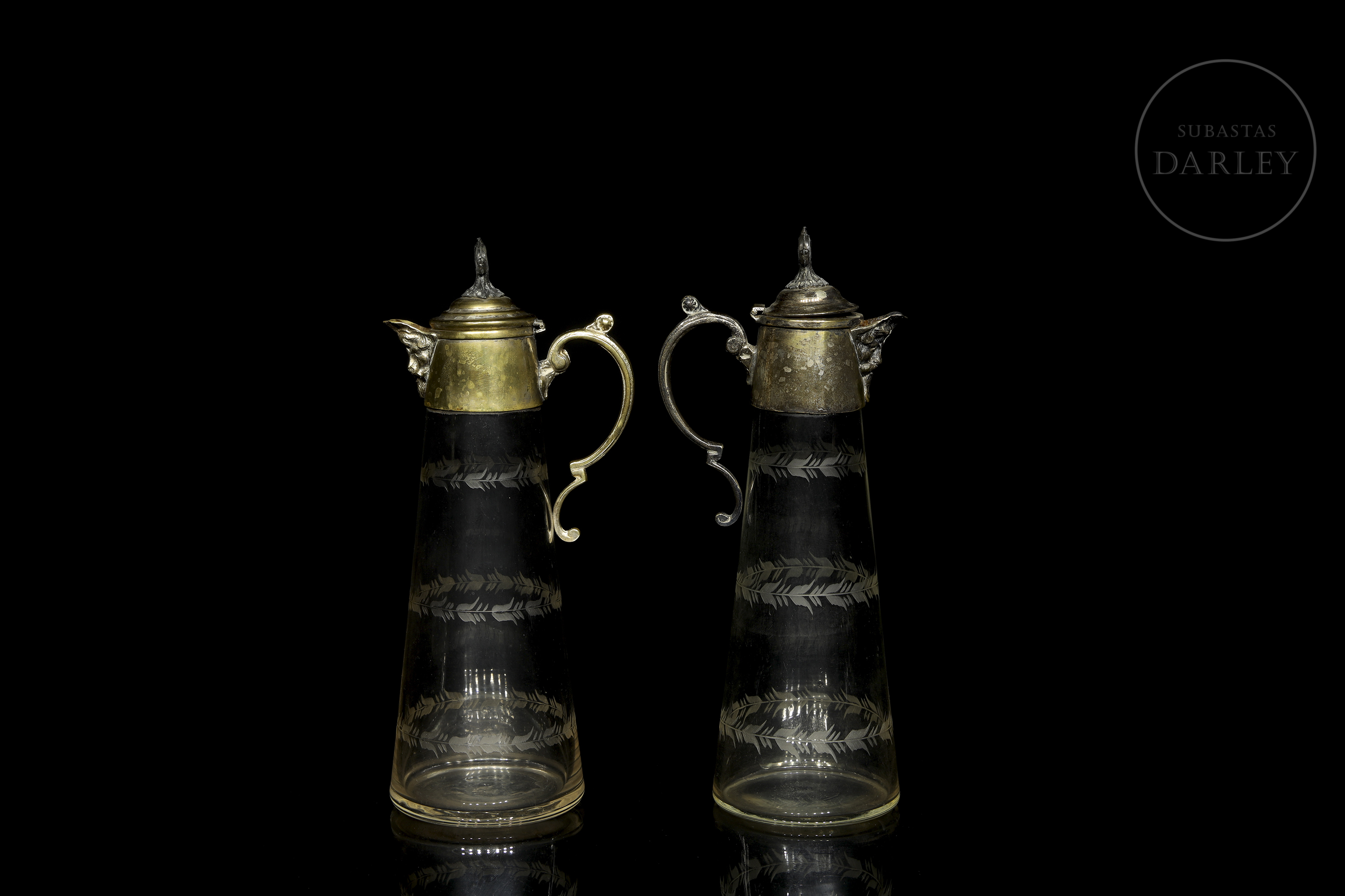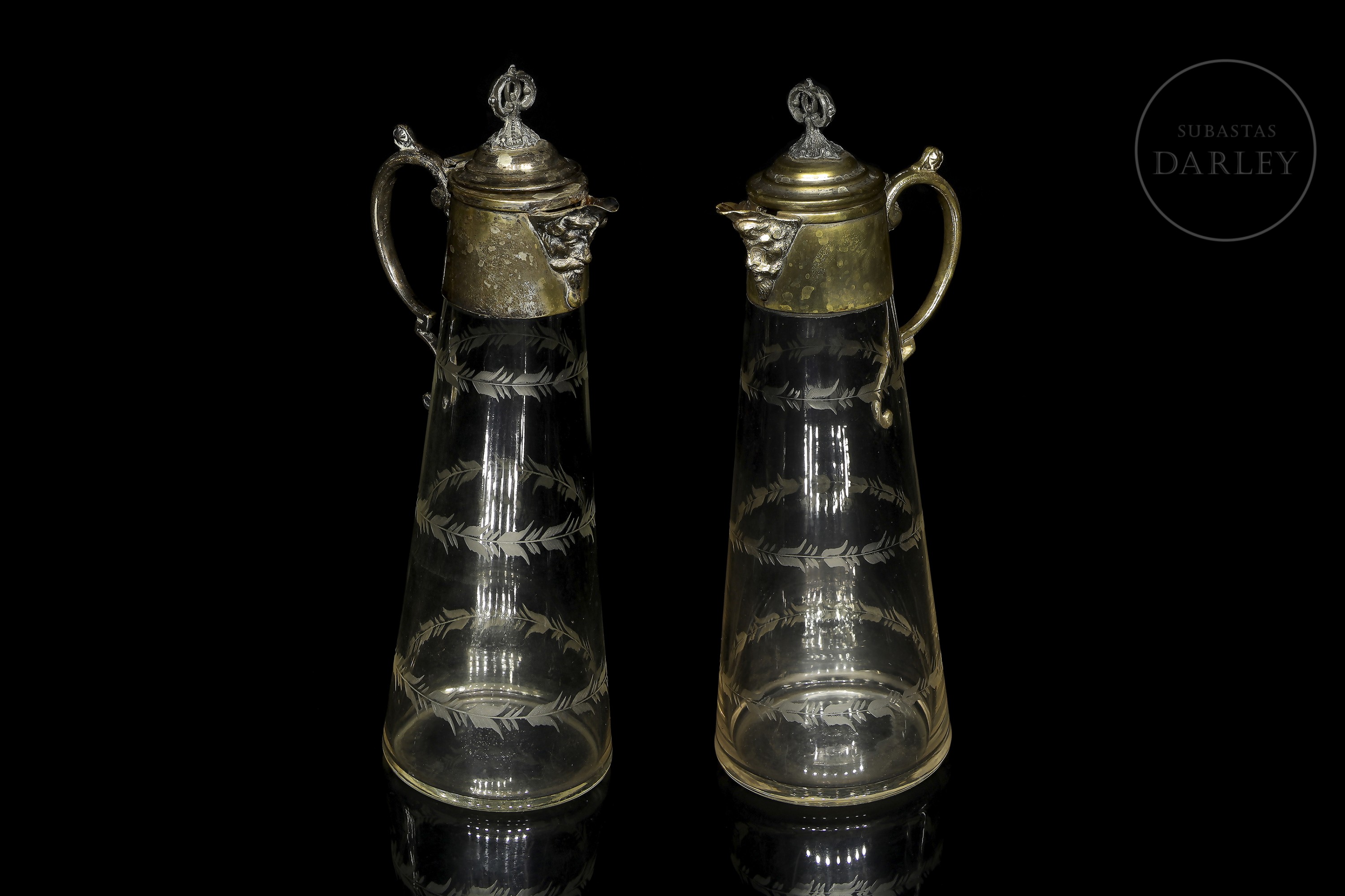 一对维多利亚时代的玻璃酒壶,壶身饰有雕刻精美的壶柄,壶口和壶柄均采用金属材质。壶嘴饰有巴洛克风格面具的浮雕图案。