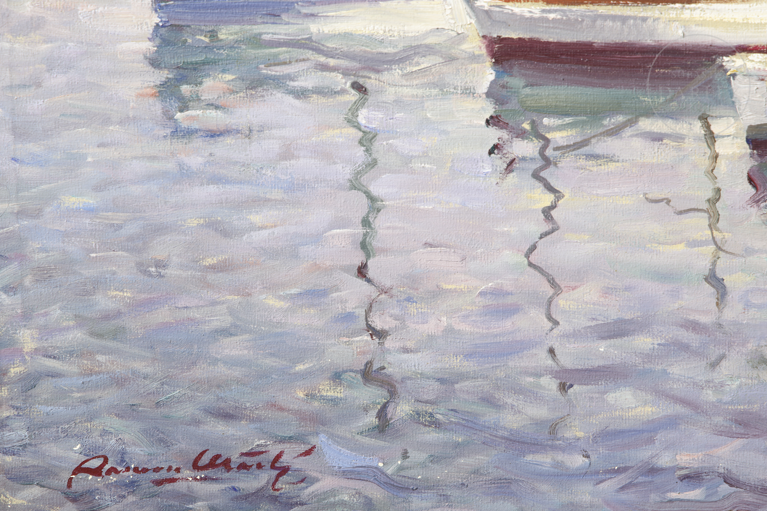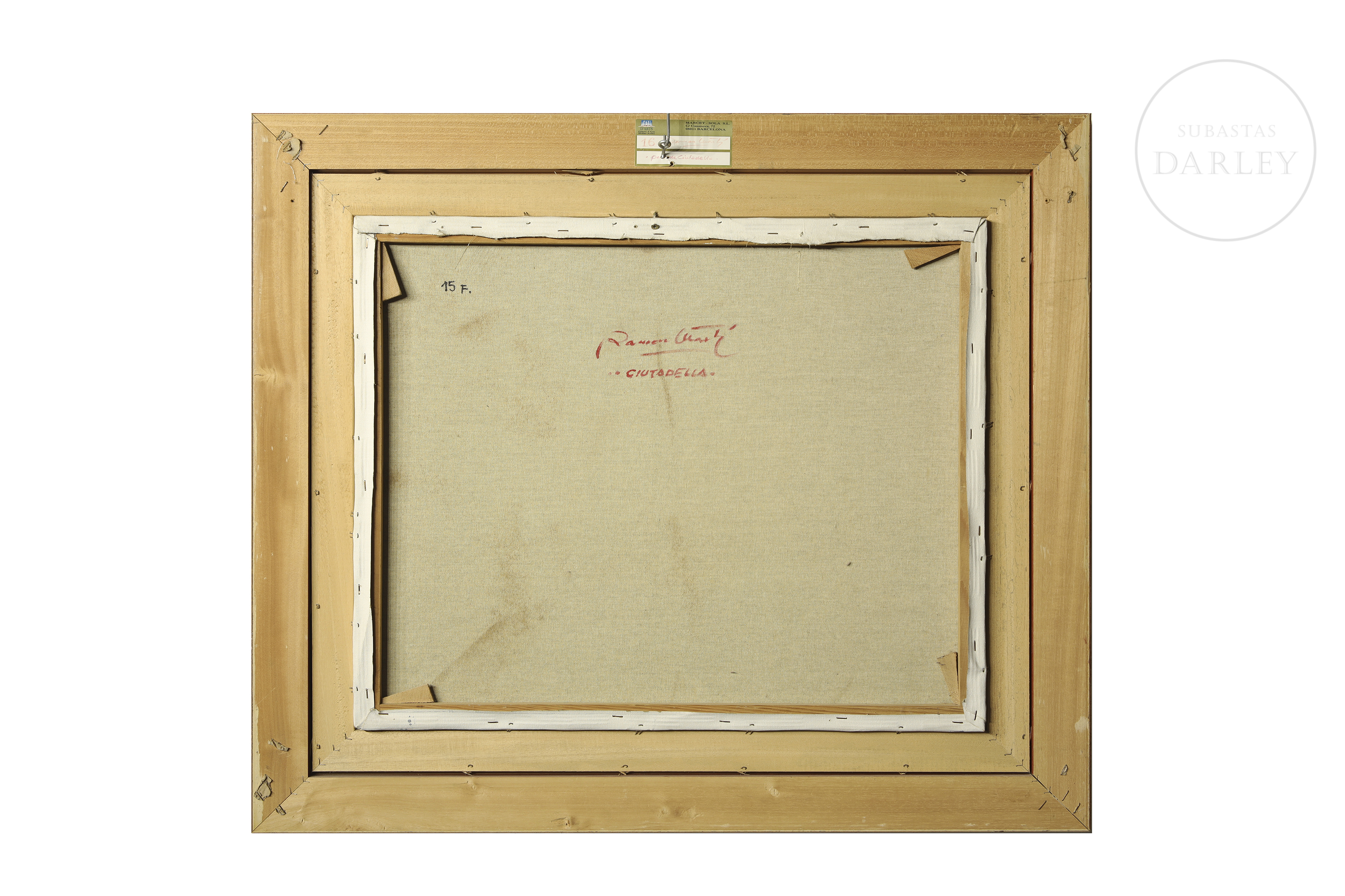 Oil on canvas. View of the port of Ciutadella (Menorca), with several traditional boats (‘llaüts’) moored alongside the quay. Signed ‘Ramón [...]’ in the lower left corner. Signed and titled on the reverse.