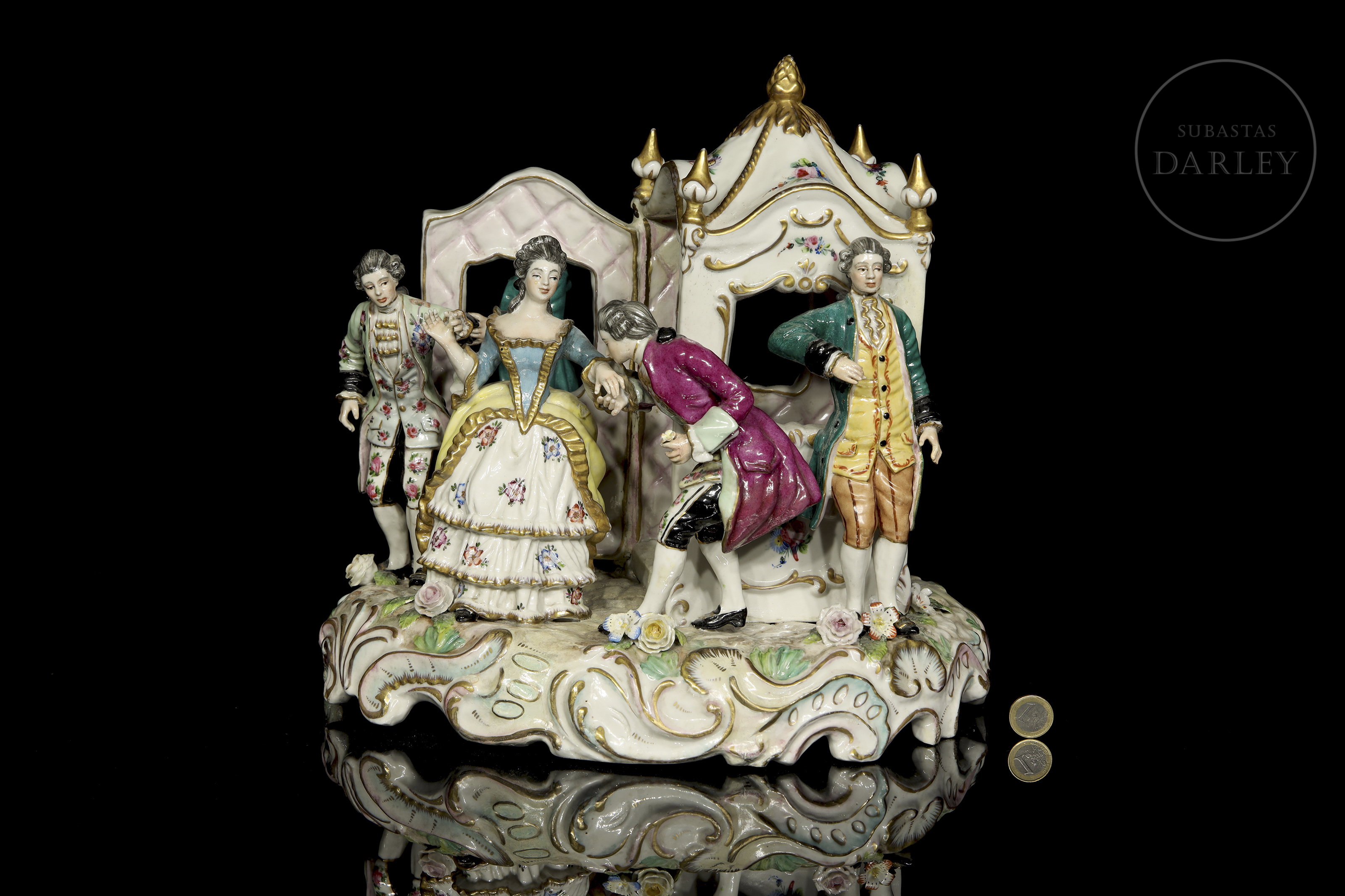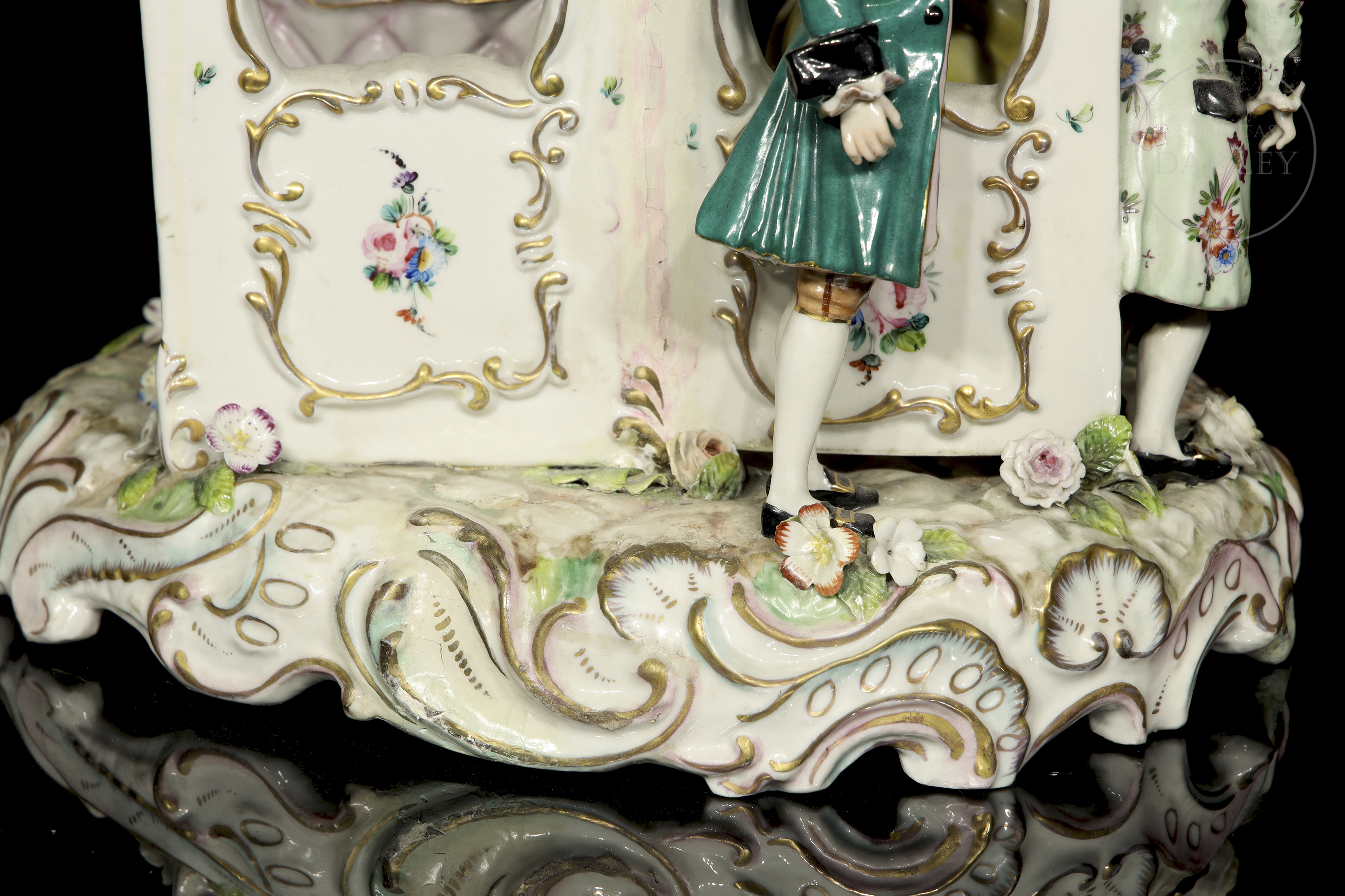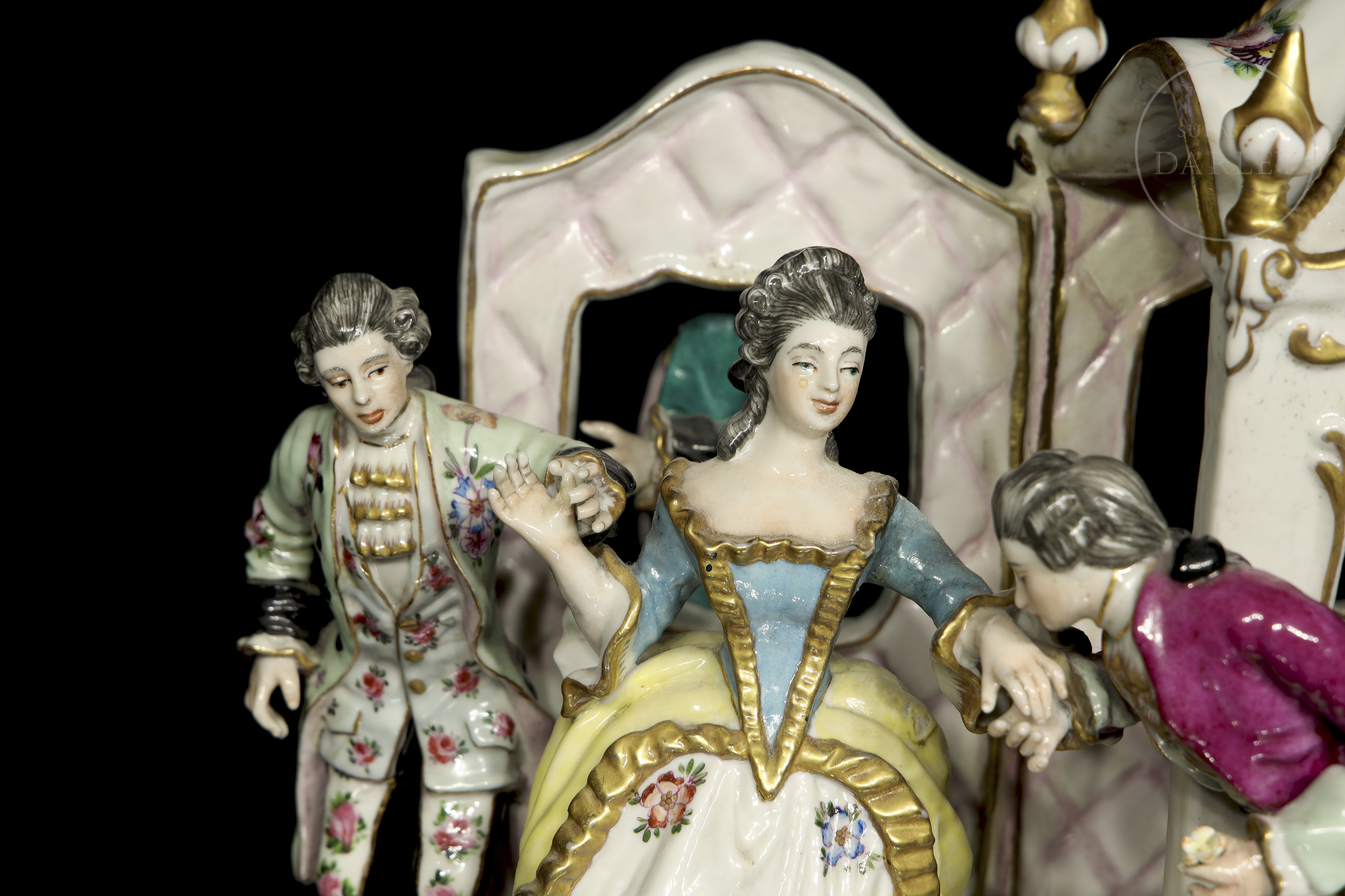 乌特韦斯巴赫瓷厂瓷雕组,描绘精巧的动物拉车,配有两位风度翩翩的人物——一位女士与一位绅士。彩绘作品,装饰繁复的洛可可细节。存在缺损及多次修复痕迹。